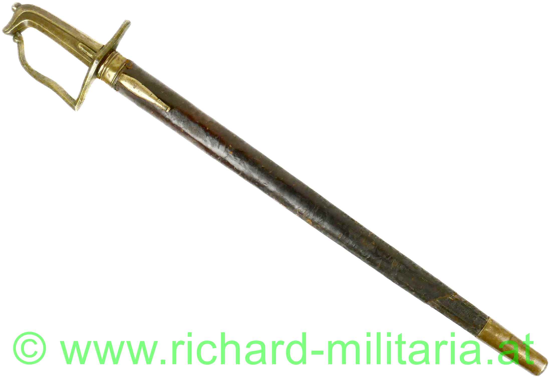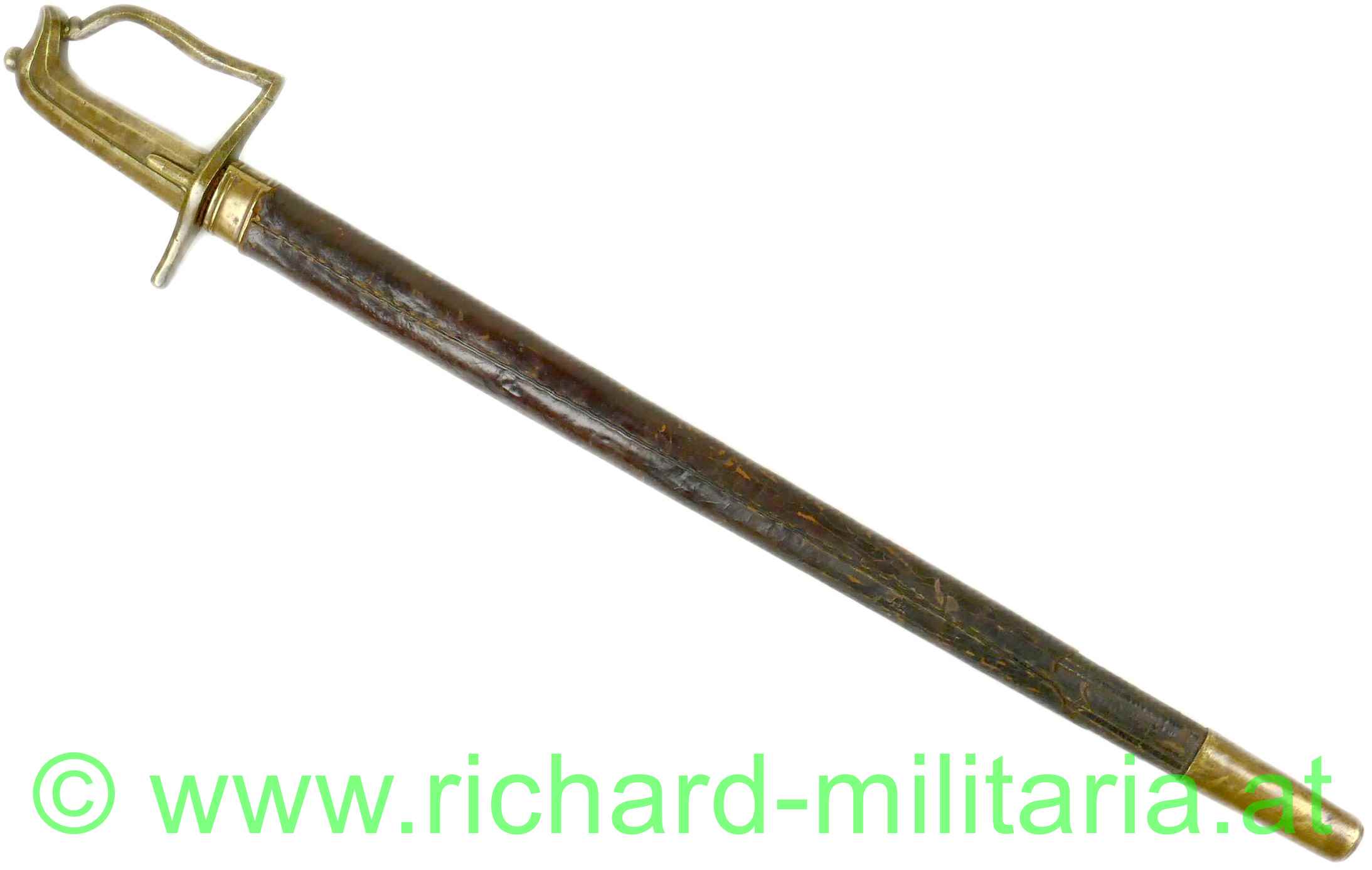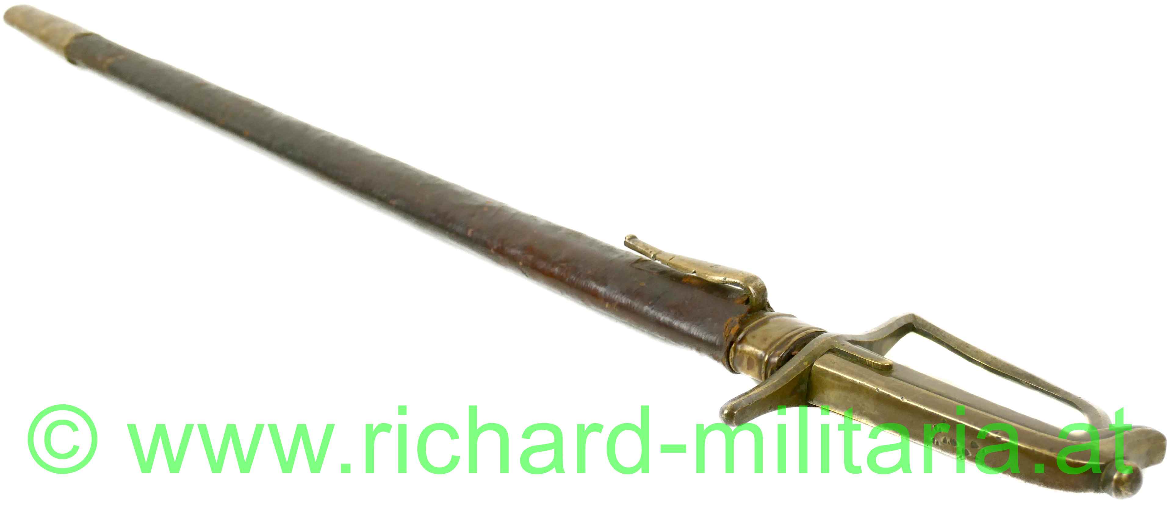 Preussen Artillerie - Säbel mit Messinggriff in stilisierter Taubenkopfform; um 1800; schwere unmarkierte Stahlklinge mit ovalem Querschnitt mit beidseitiger Schneide; runder Abschluss, fleckig; Klinge leicht wackelig; passende braune Lederscheide mit Messingbeschlägen. Über der eigentlichen schwarzen Lederscheide noch ein lederner brauner Schutzüberzug aus Leder;