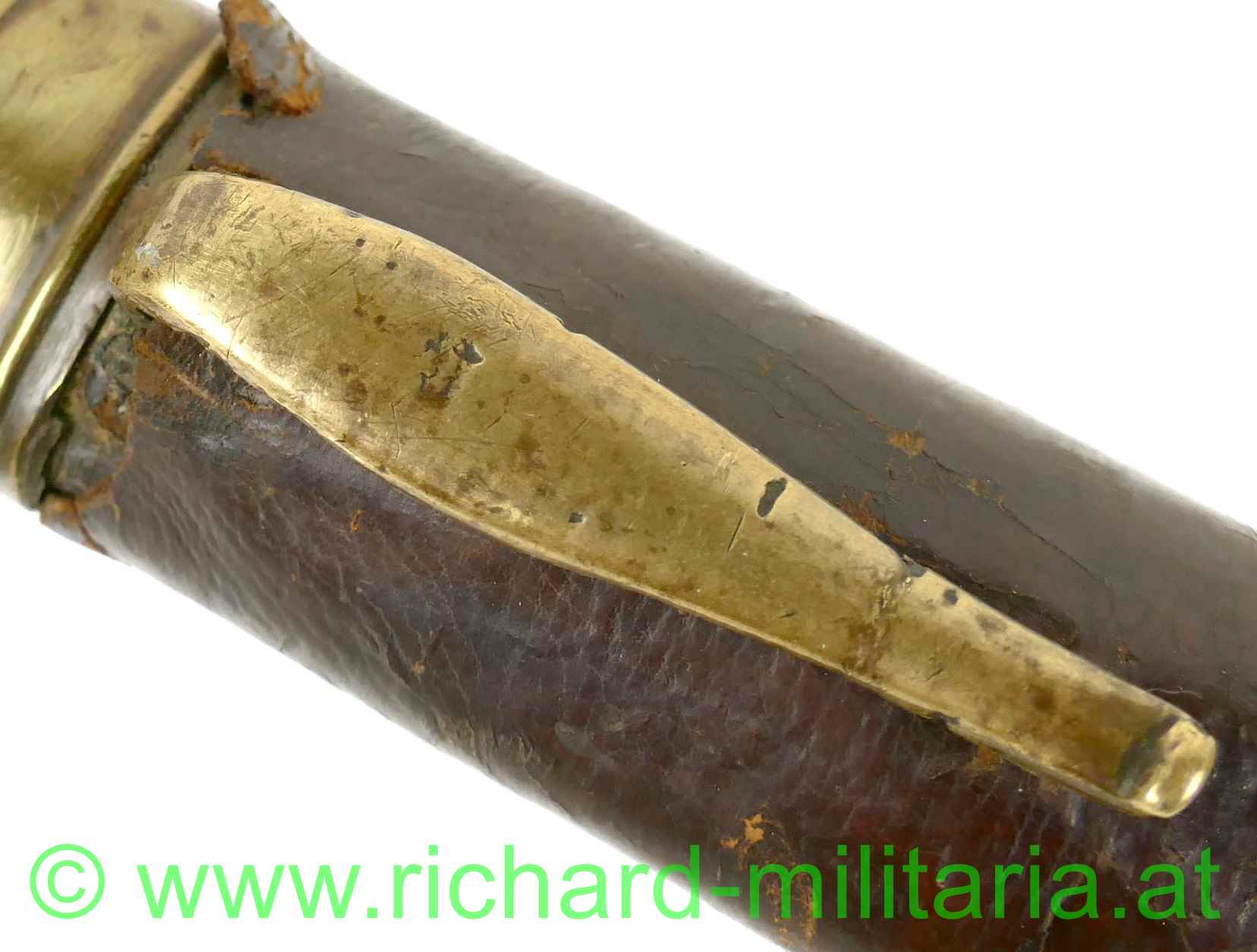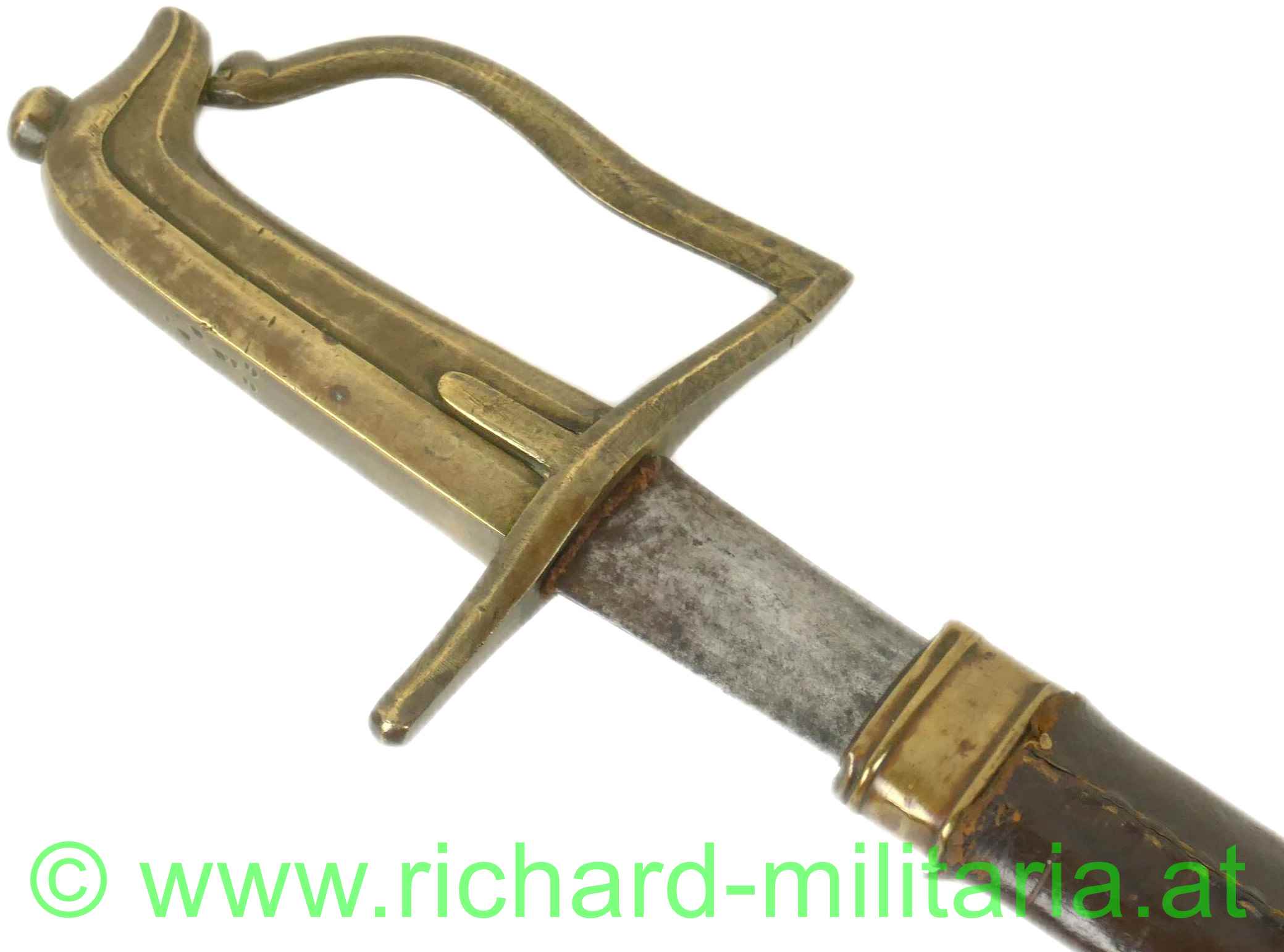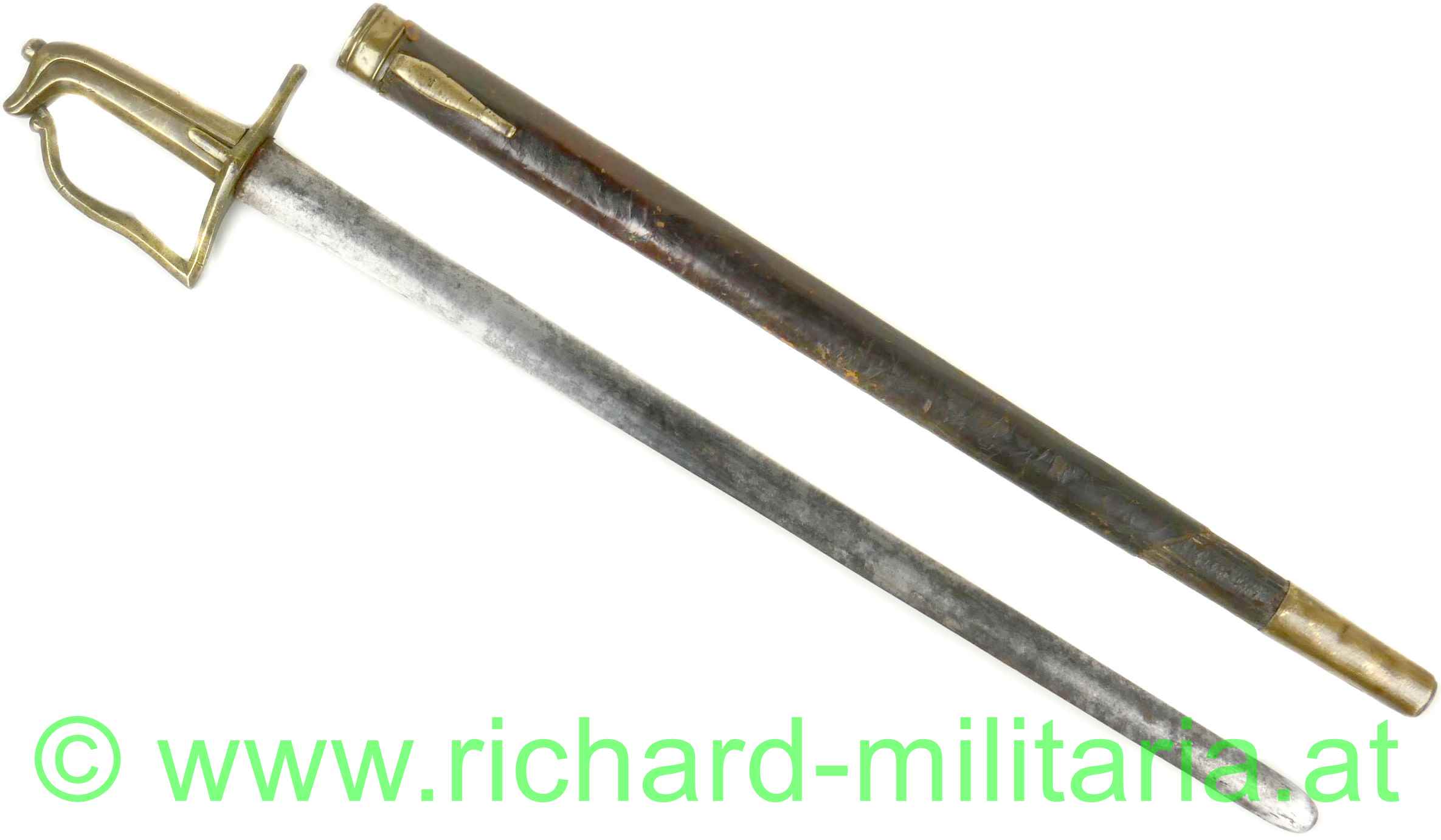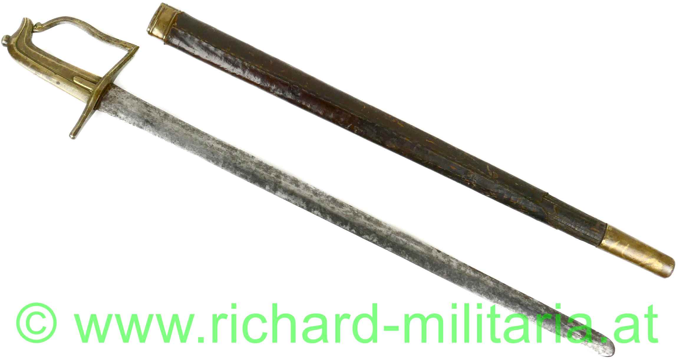 Preussen Artillerie - Säbel mit Messinggriff in stilisierter Taubenkopfform; um 1800; schwere unmarkierte Stahlklinge mit ovalem Querschnitt mit beidseitiger Schneide; runder Abschluss, fleckig; Klinge leicht wackelig; passende braune Lederscheide mit Messingbeschlägen. Über der eigentlichen schwarzen Lederscheide noch ein lederner brauner Schutzüberzug aus Leder;