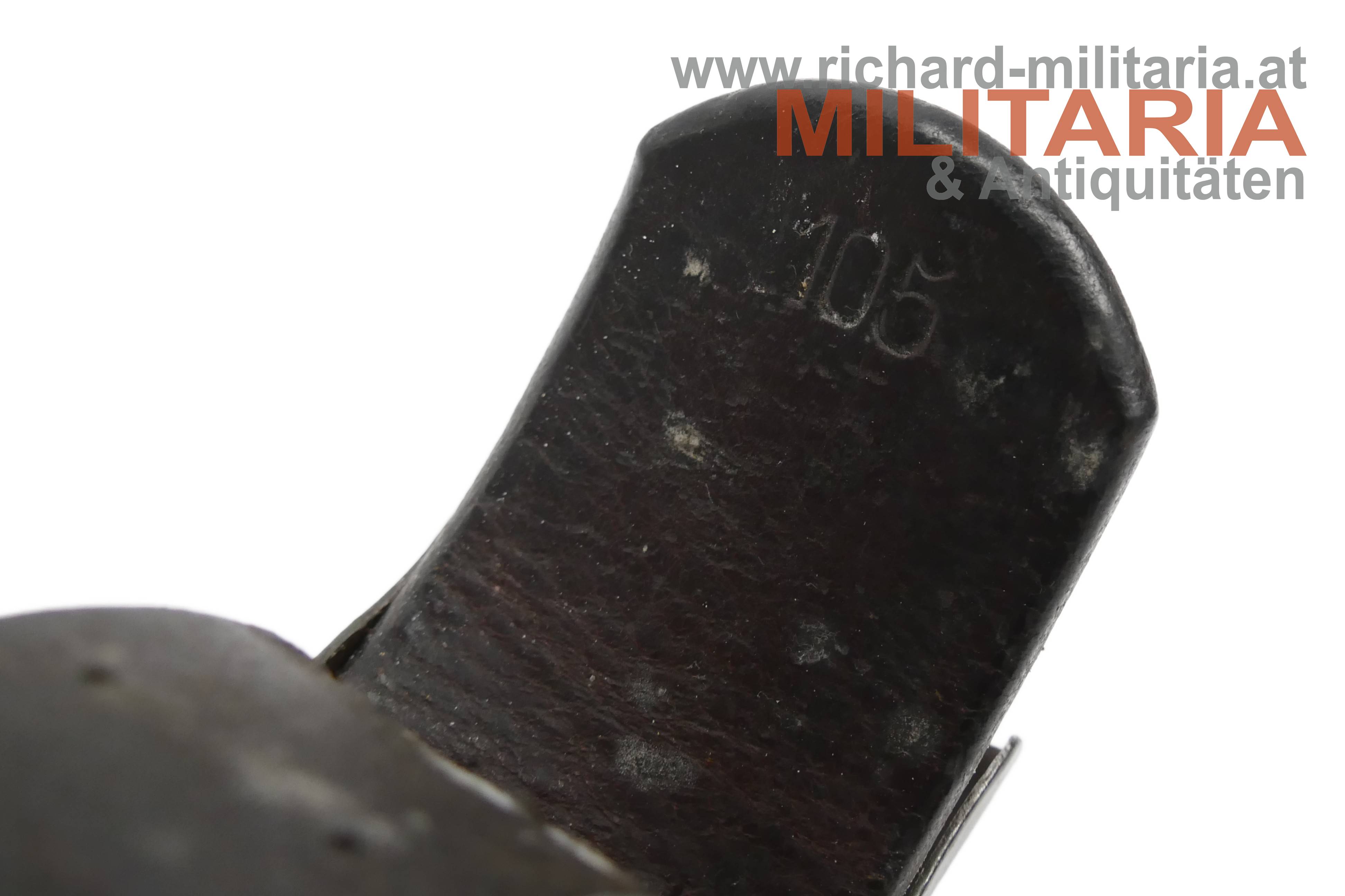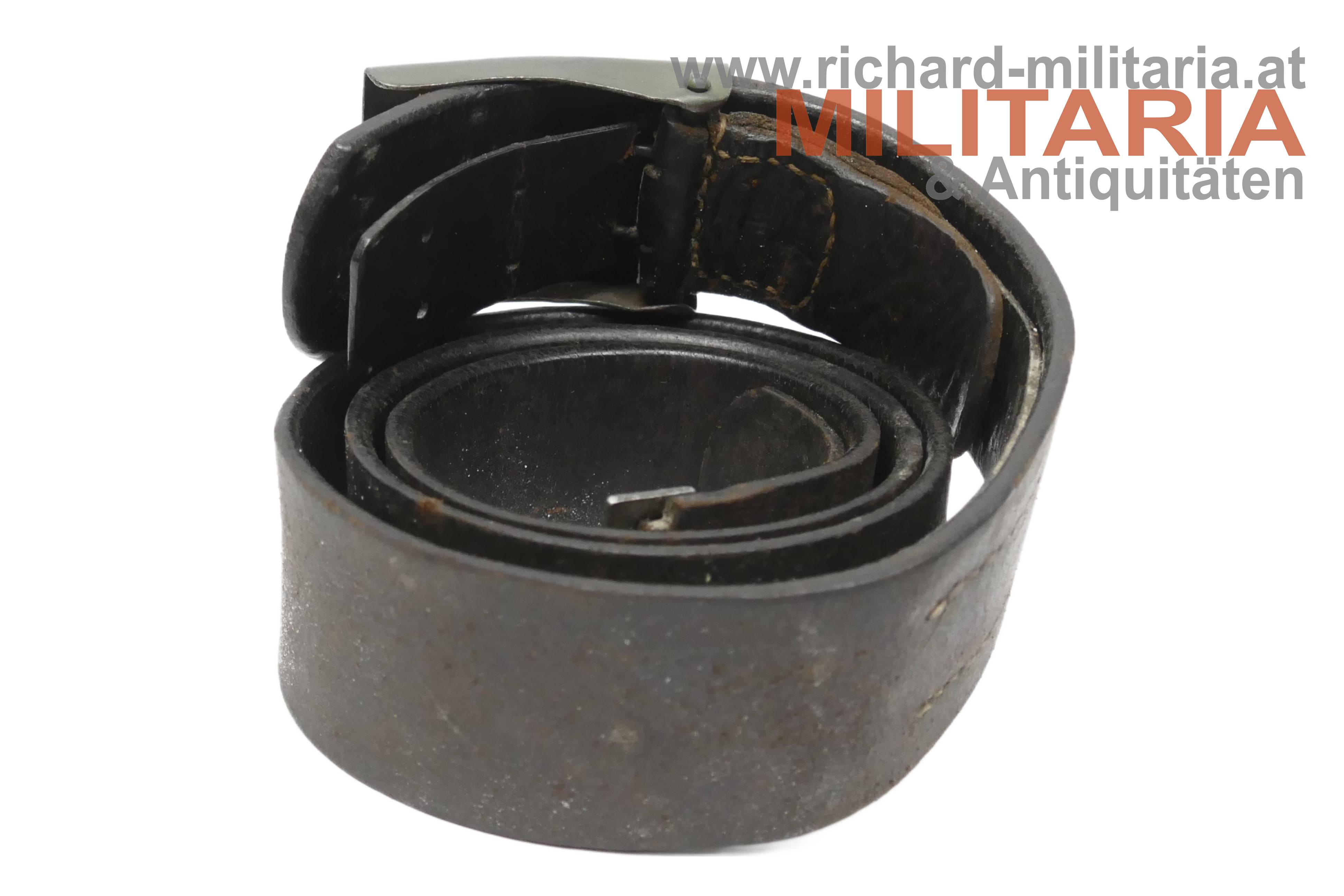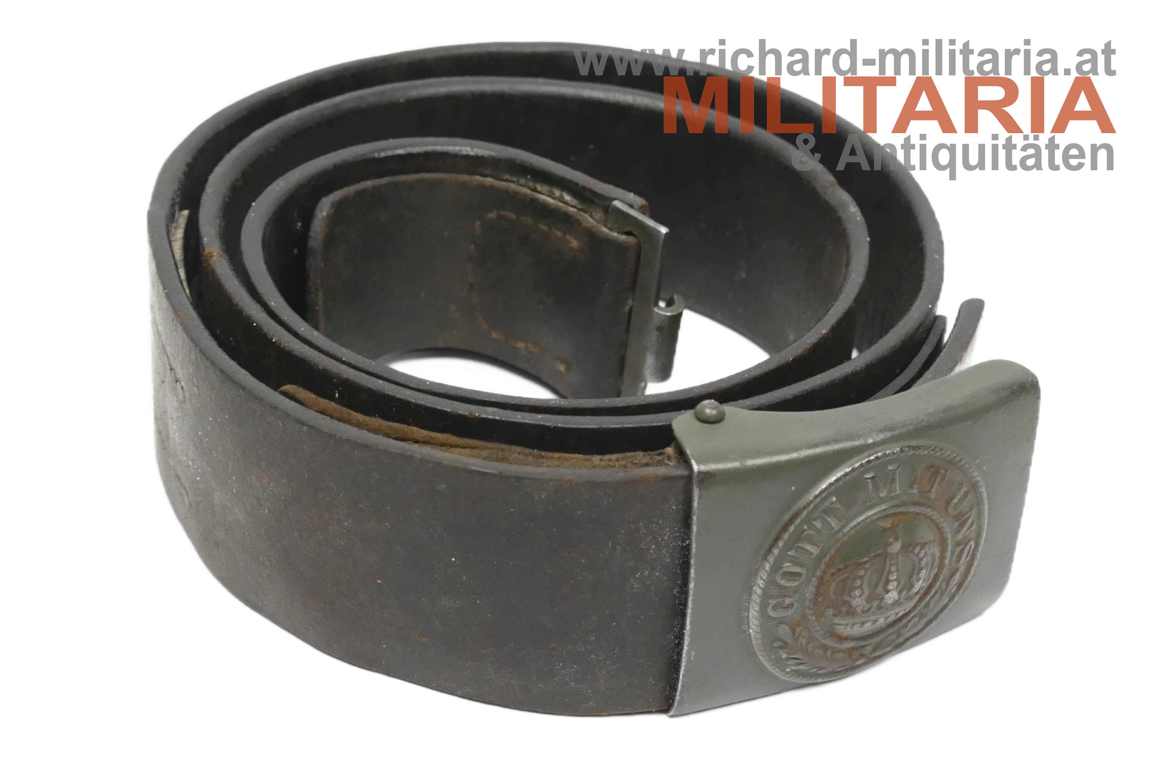 Preussen - Leibreimen mit Koppelschloss für Mannschaften und Unteroffiziere; schwarzer Lederleibriemen; Koppelschloss aus Eisen durchgeprägt und original feldgrau lackiert; Leibriemen gestempelt mit "105";