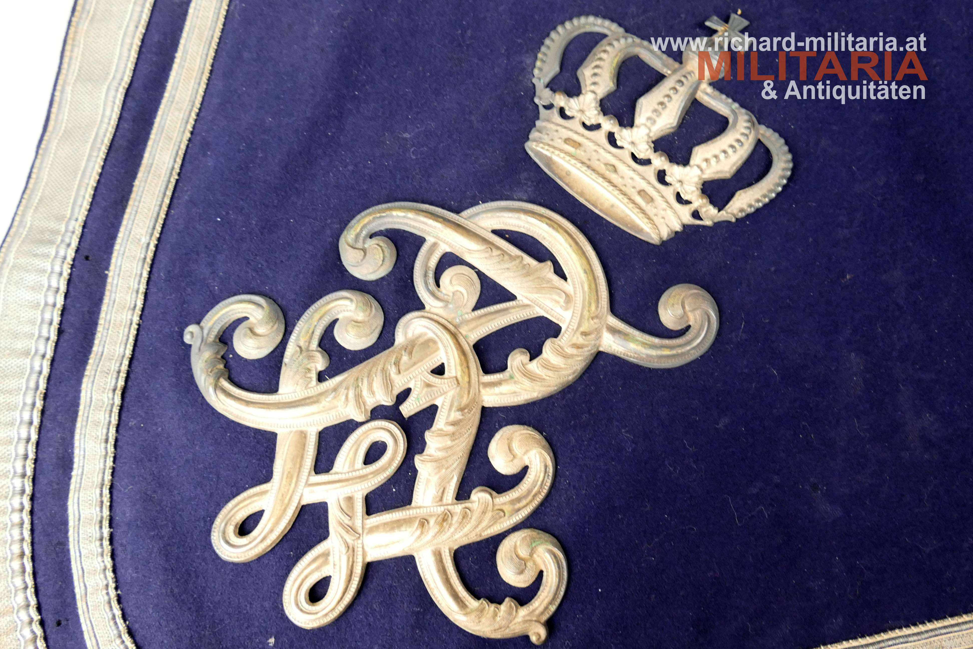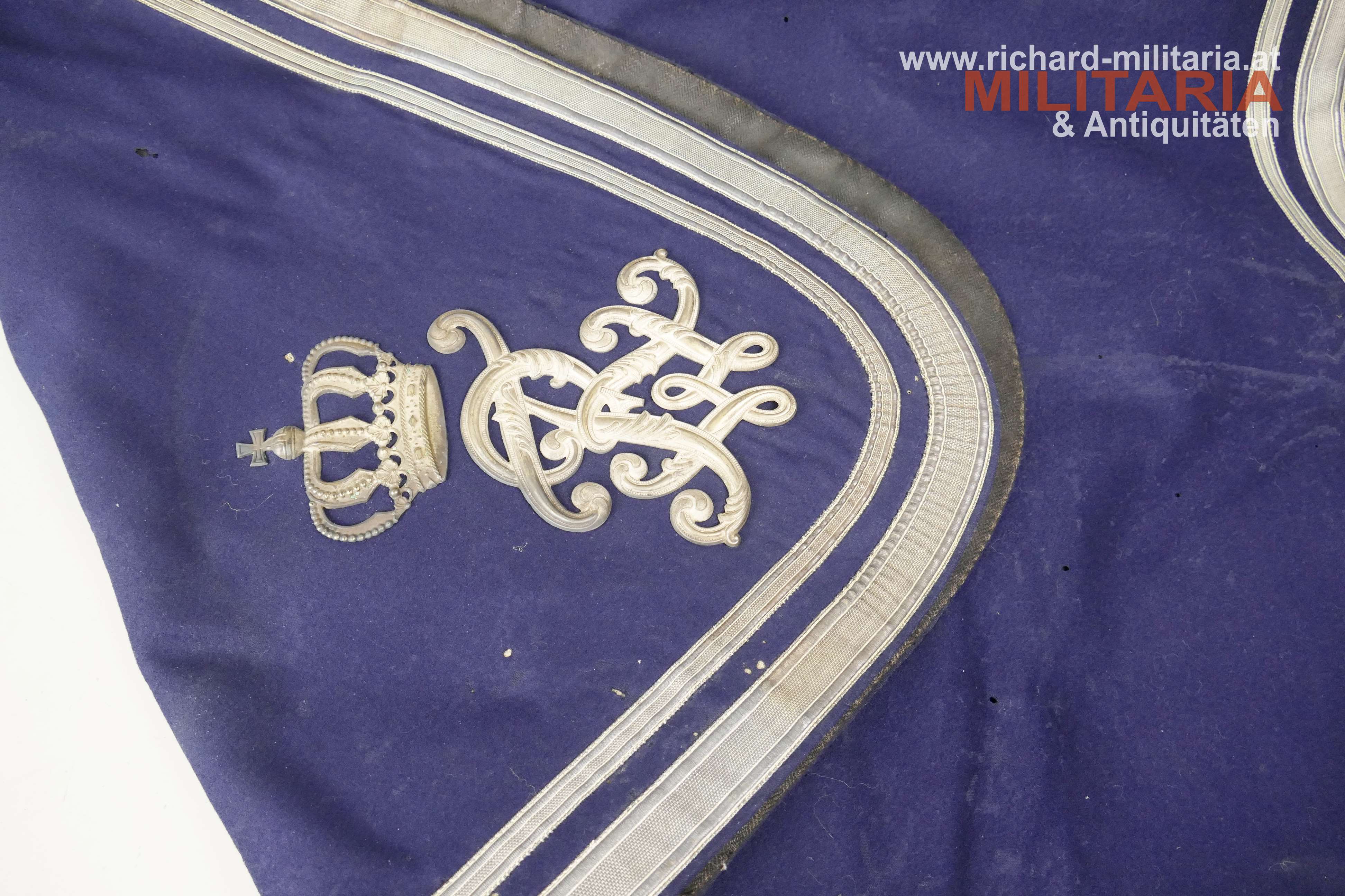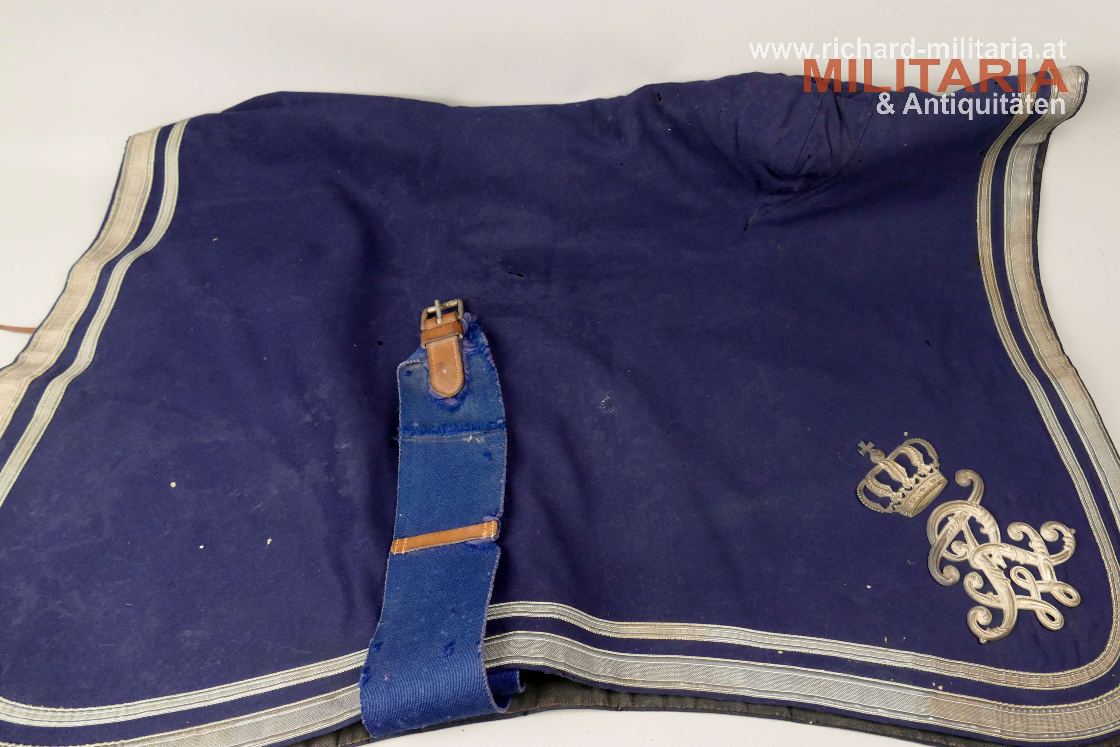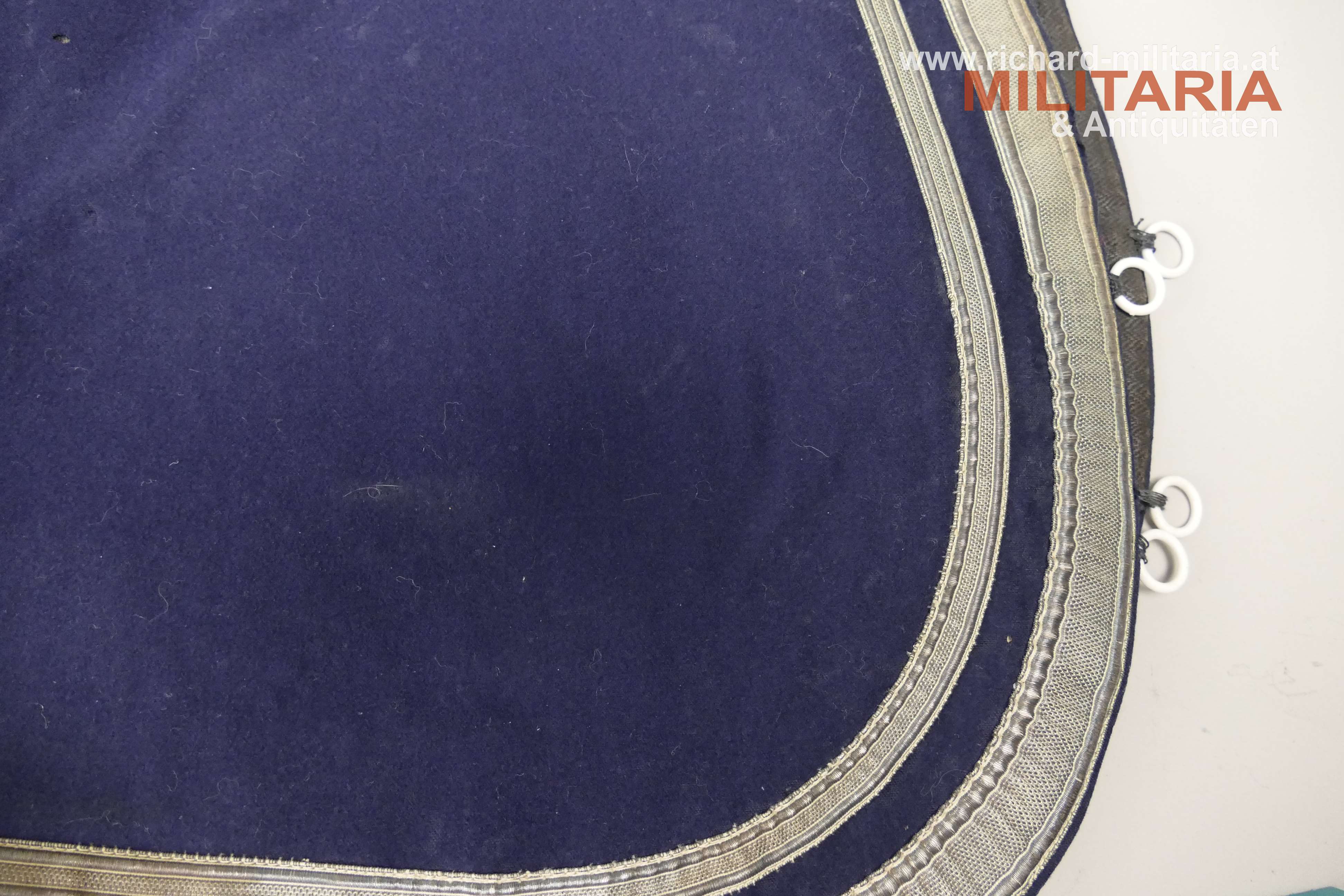 Preussen - Paradesatteldecke / Husaren-Schabrake; dunkelblaues feines Wolltuch mit Silberbortenumrandung; 2 große bekrönte und versilberte Monogramme "FWR" (Friedrich WIlhelm Rex) aus Metall in den Ecken aufgenäht; Lederverschnürungen vollständig vorhanden; Stoff mit einigen kleineren Mottenlöchern und Schabstellen; etwas angeschmutzt;
