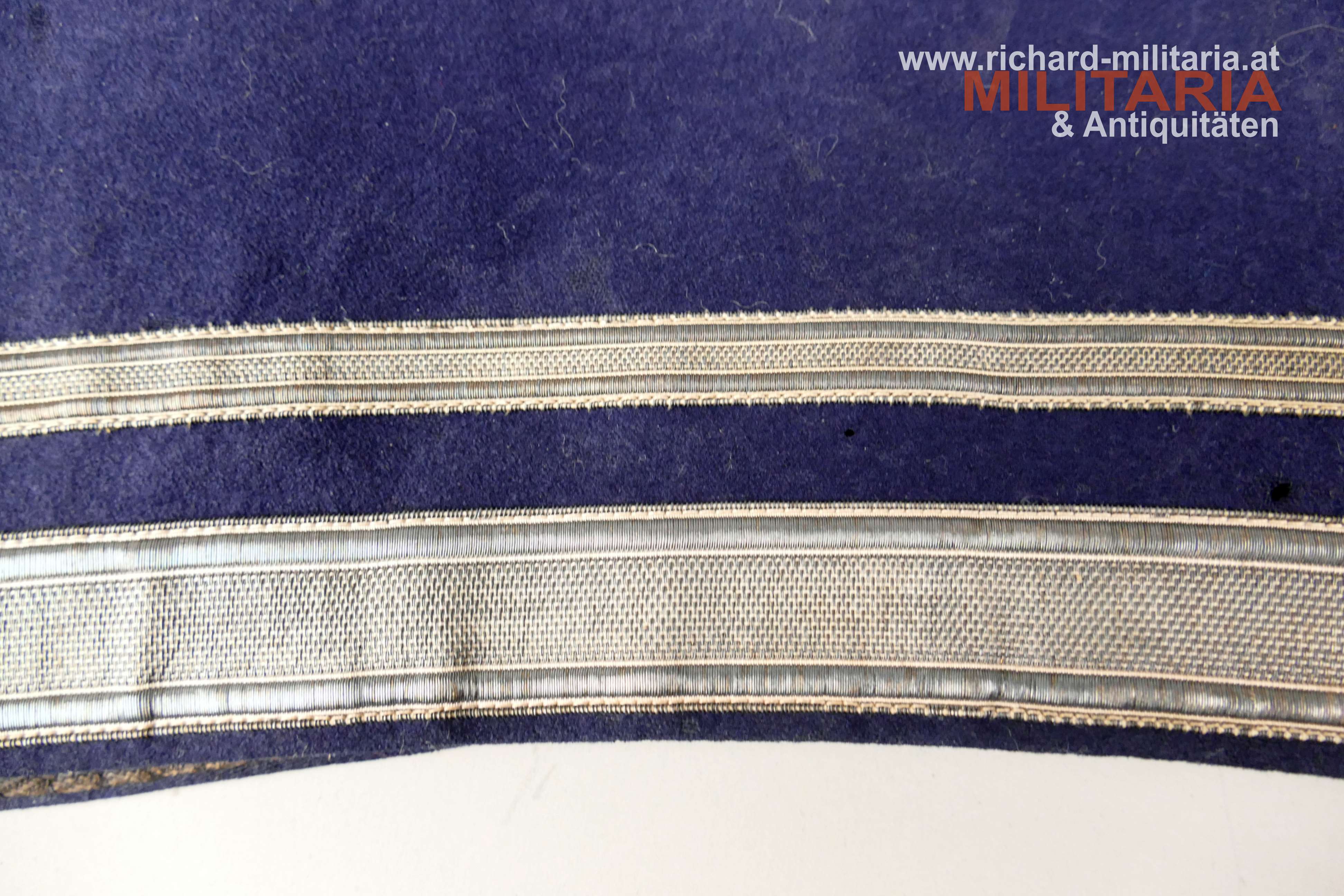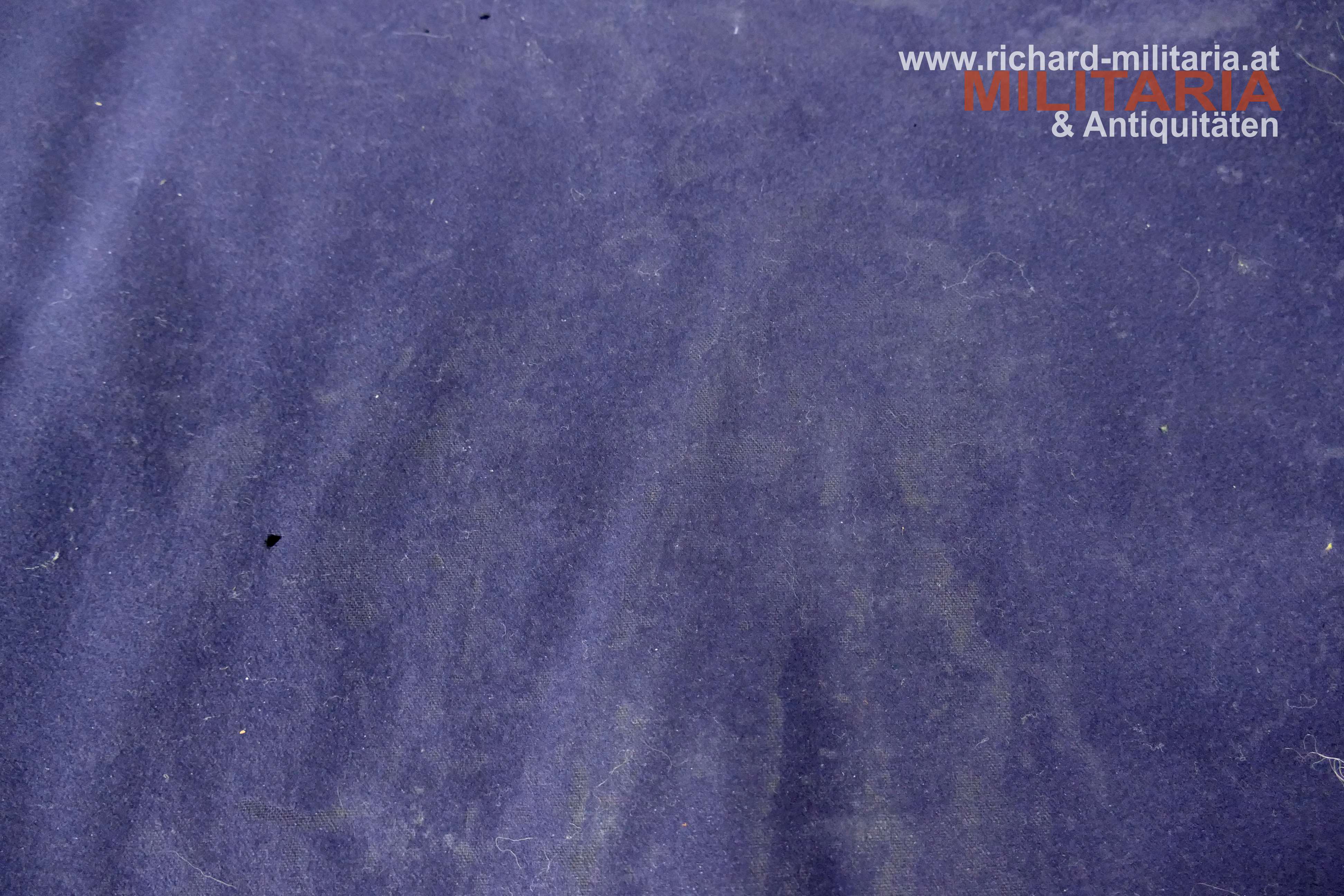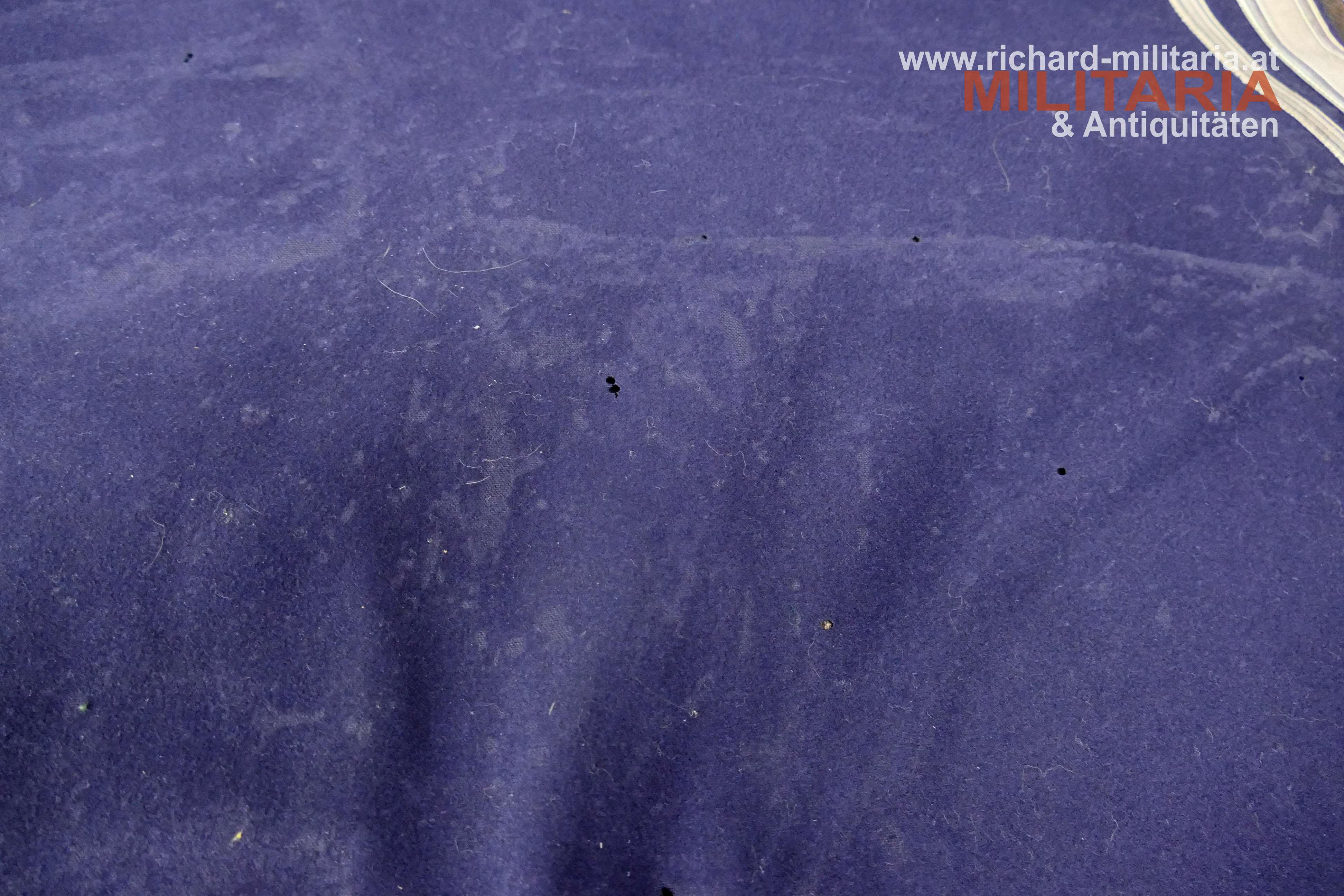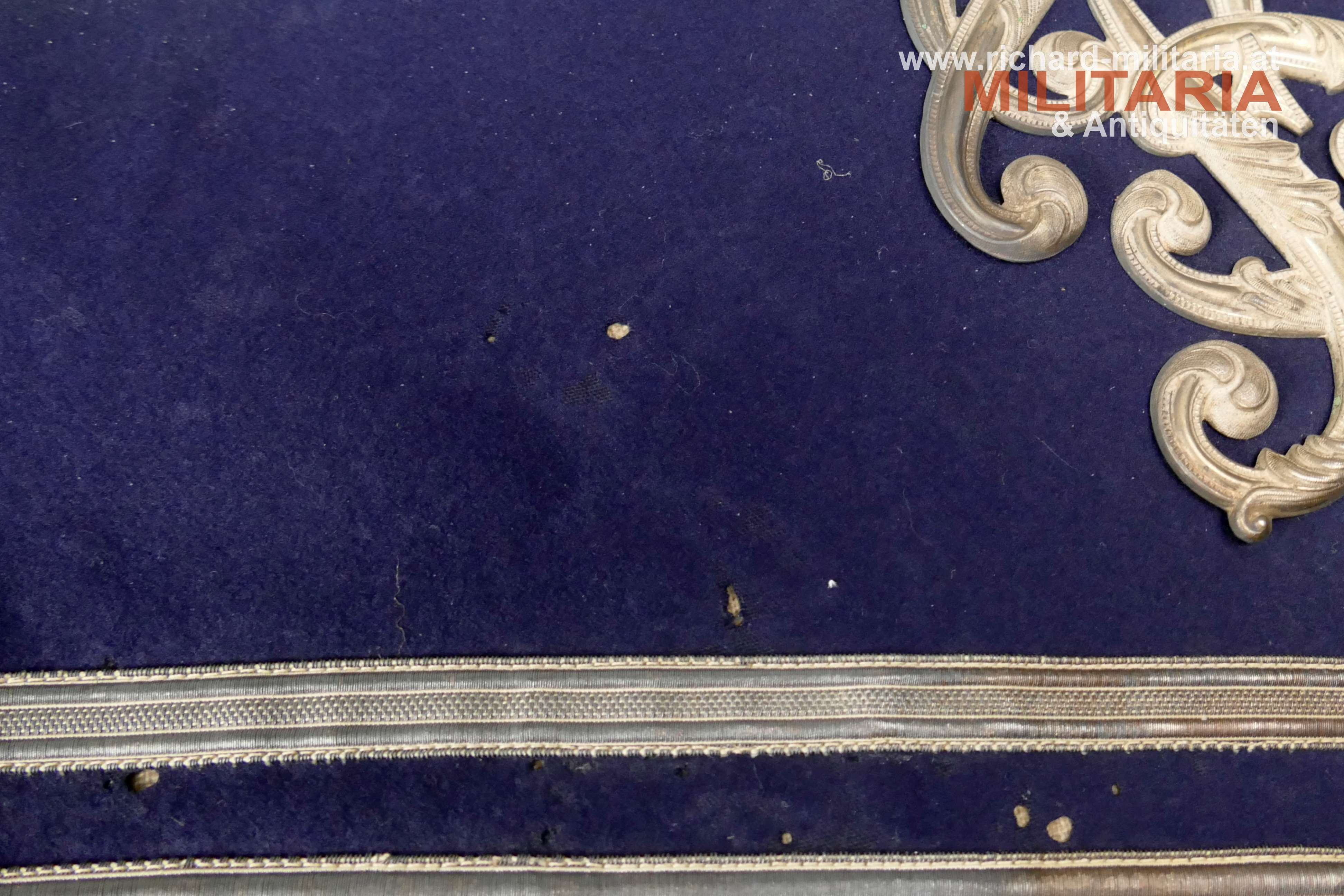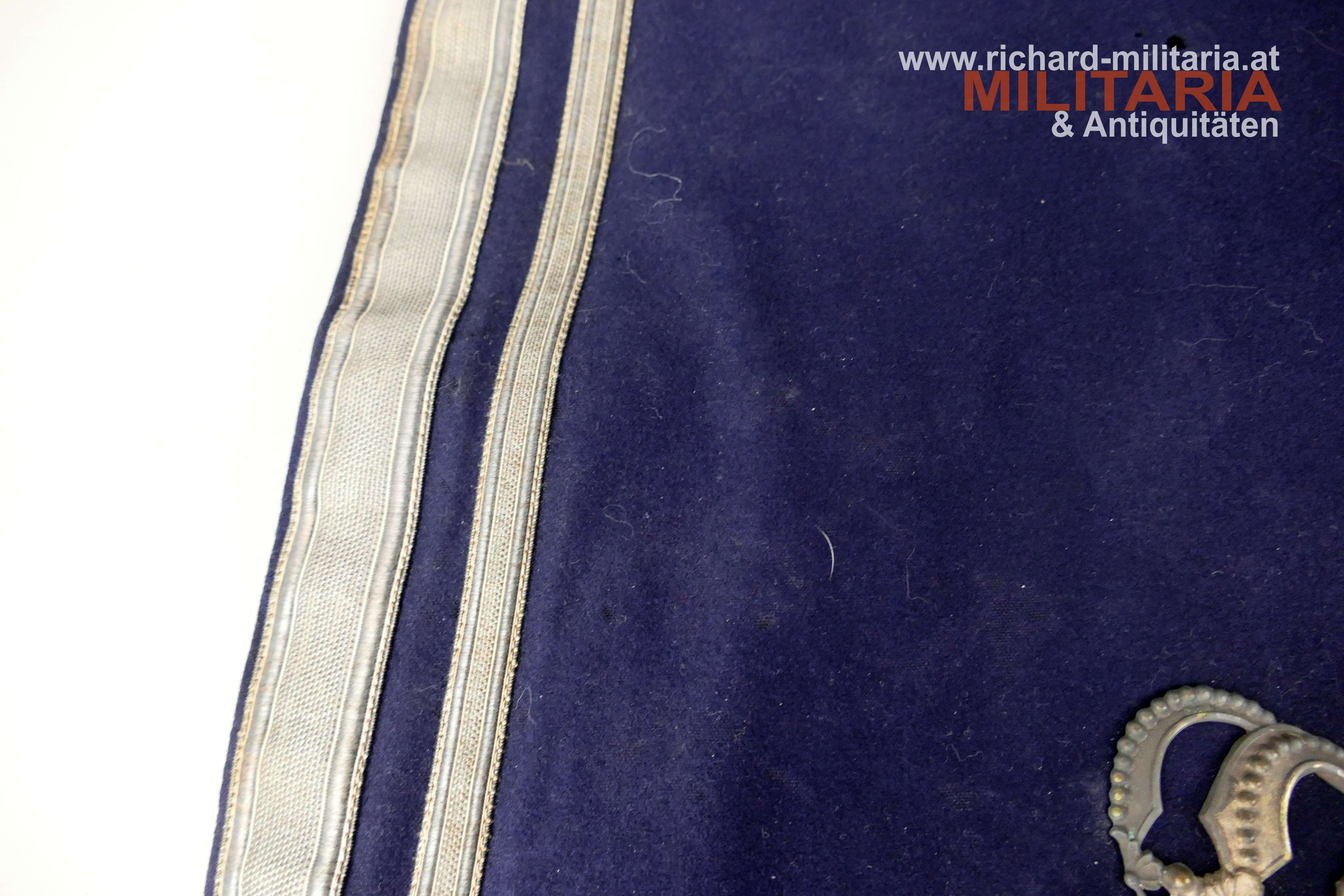 Preussen - Paradesatteldecke / Husaren-Schabrake; dunkelblaues feines Wolltuch mit Silberbortenumrandung; 2 große bekrönte und versilberte Monogramme "FWR" (Friedrich WIlhelm Rex) aus Metall in den Ecken aufgenäht; Lederverschnürungen vollständig vorhanden; Stoff mit einigen kleineren Mottenlöchern und Schabstellen; etwas angeschmutzt;