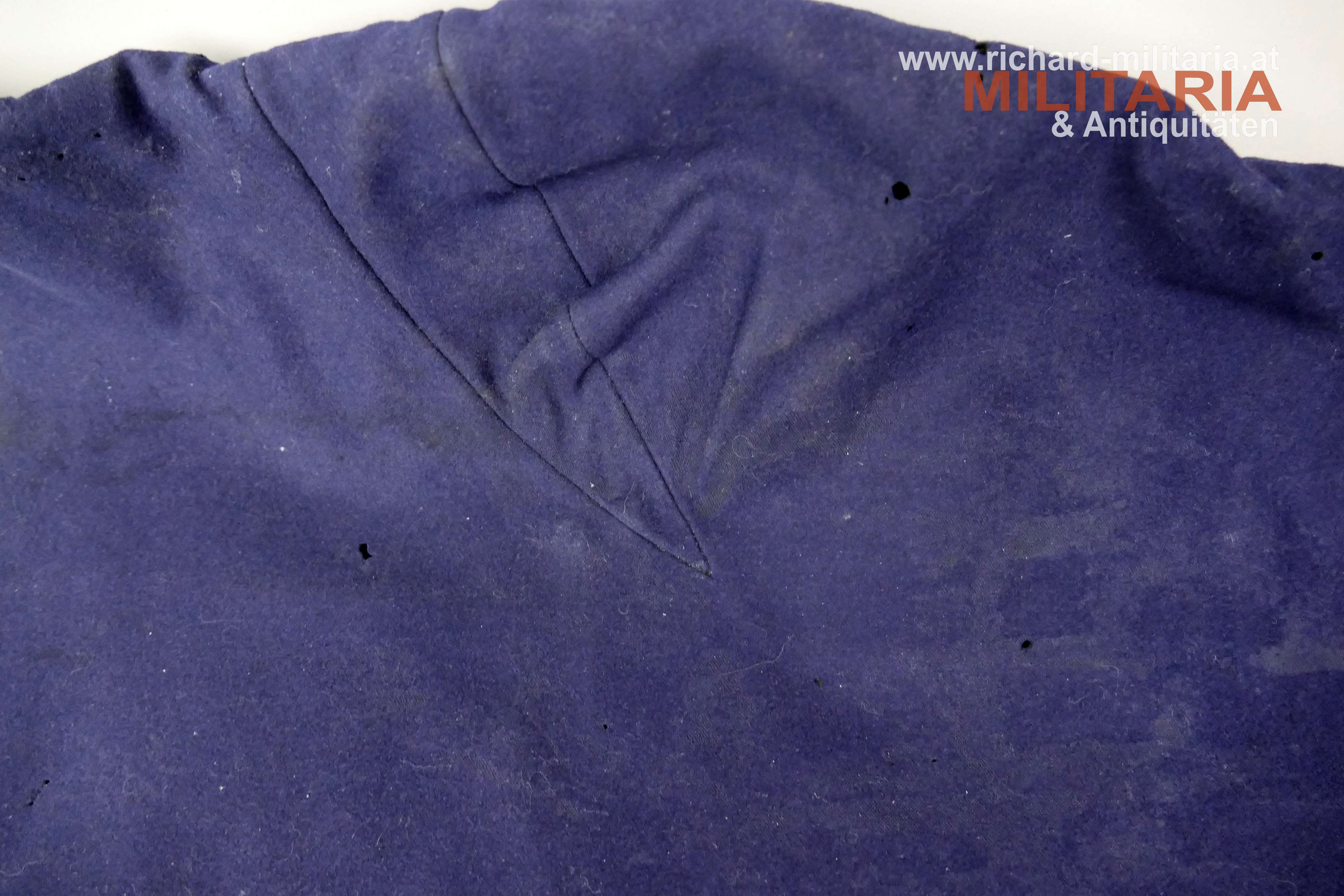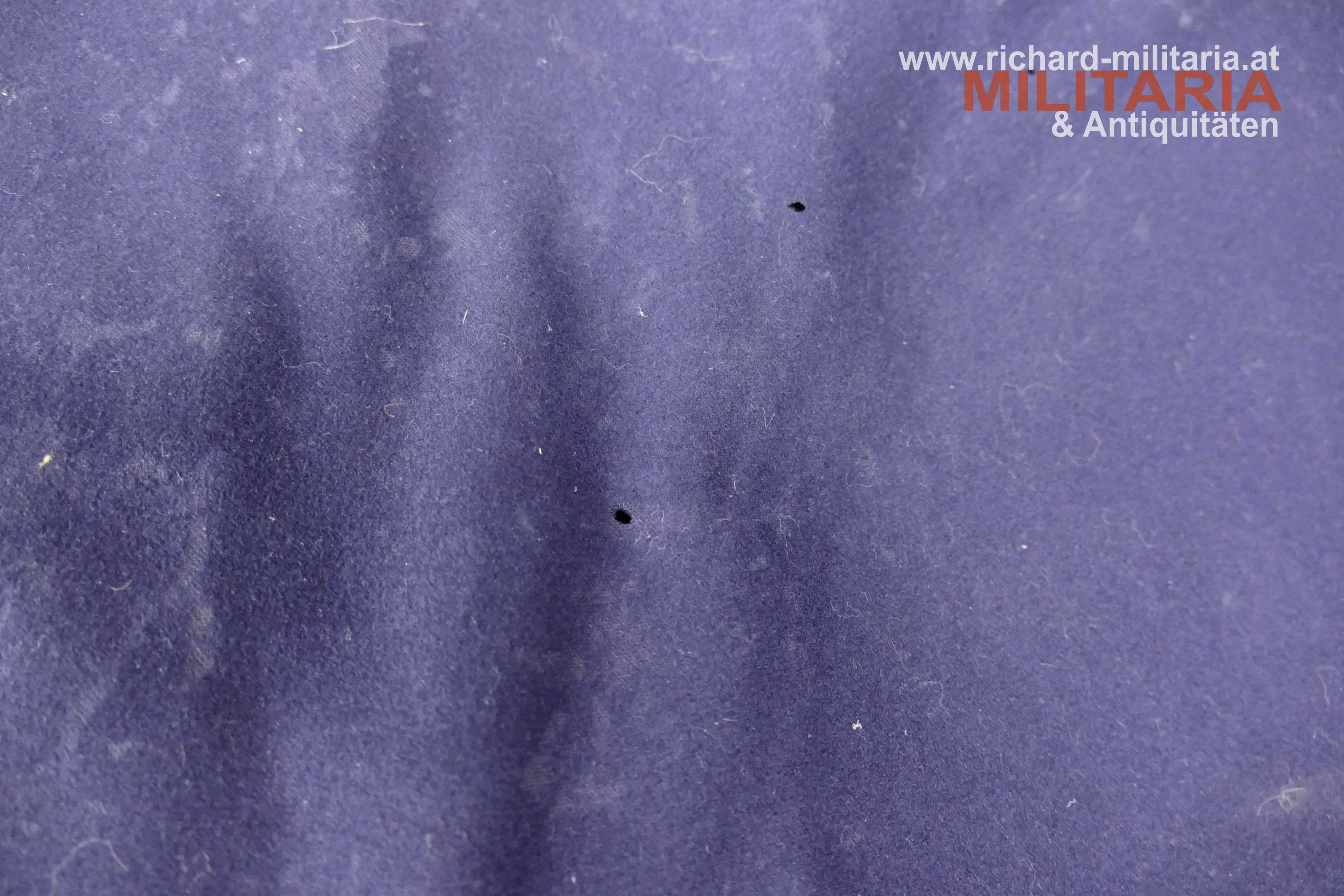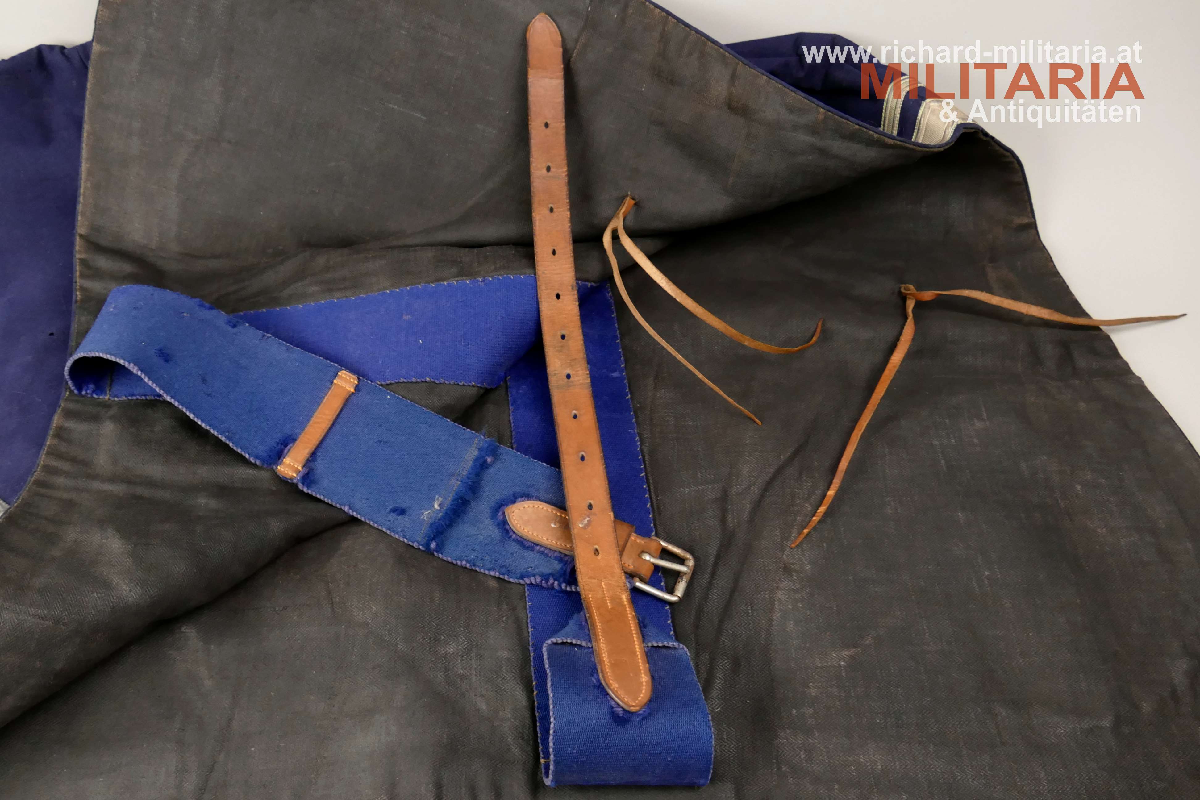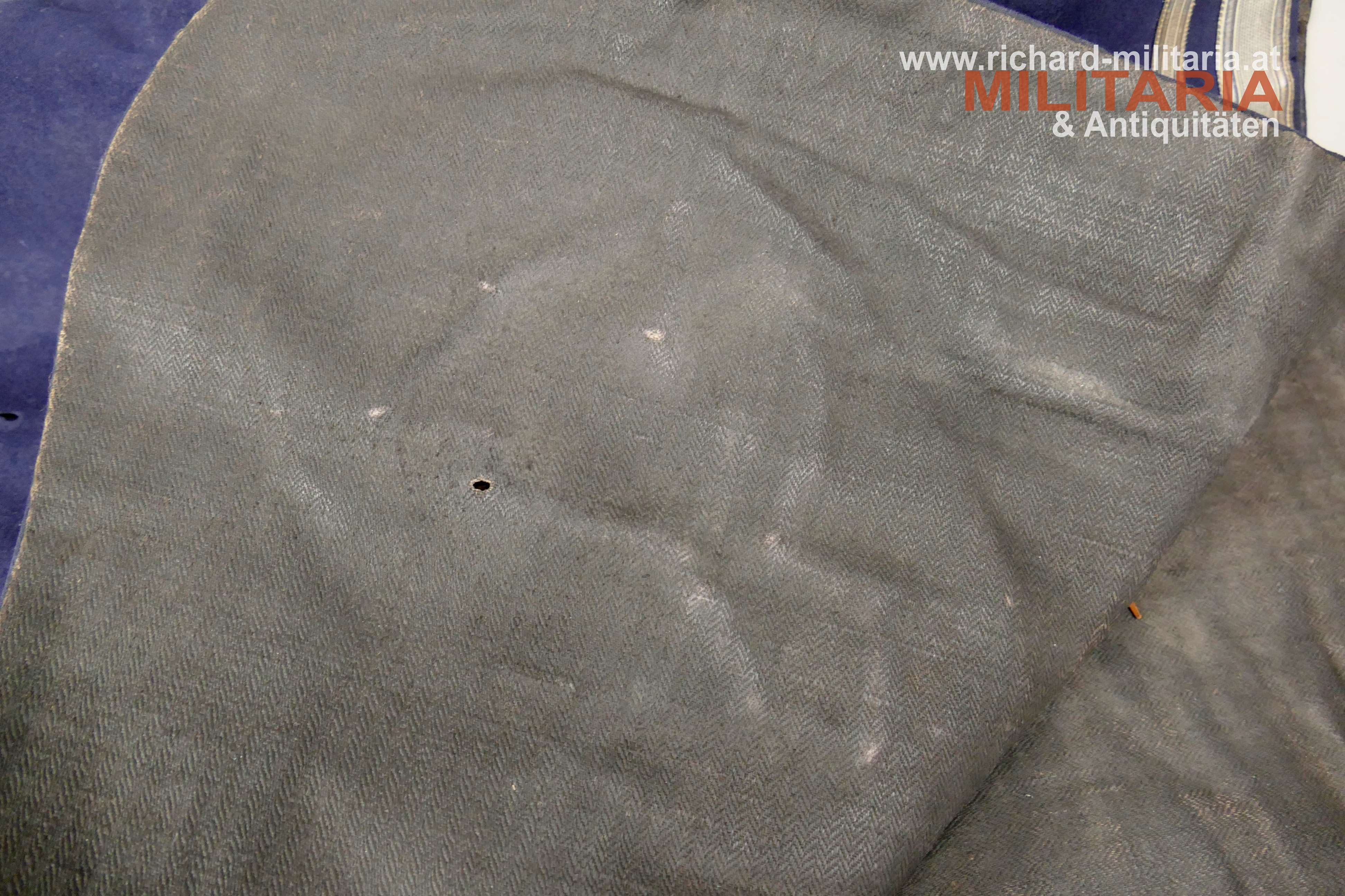 Preussen - Paradesatteldecke / Husaren-Schabrake; dunkelblaues feines Wolltuch mit Silberbortenumrandung; 2 große bekrönte und versilberte Monogramme "FWR" (Friedrich WIlhelm Rex) aus Metall in den Ecken aufgenäht; Lederverschnürungen vollständig vorhanden; Stoff mit einigen kleineren Mottenlöchern und Schabstellen; etwas angeschmutzt;