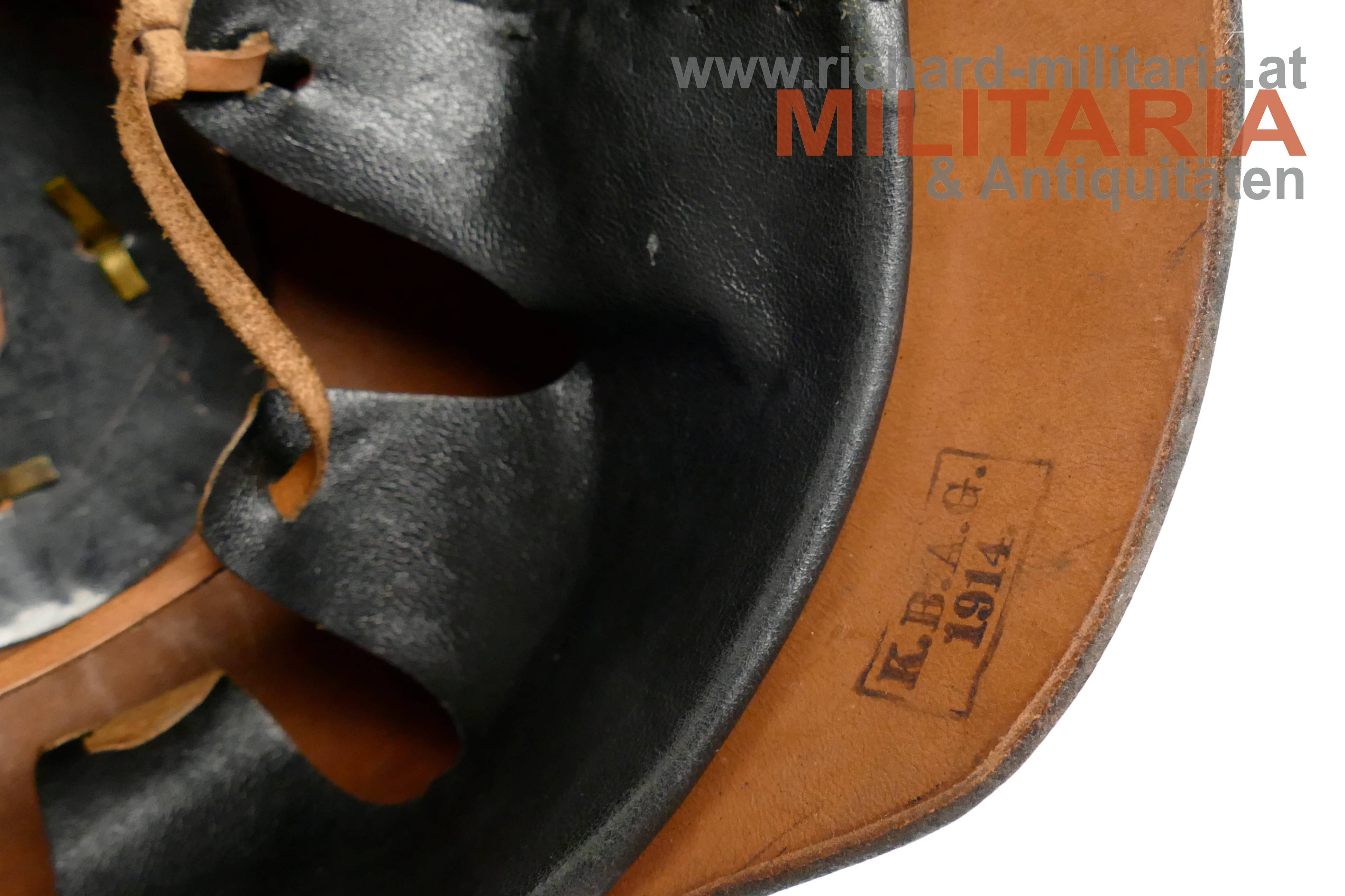 Preussen - Pickelhaube für Mannschaften der Garde-Infanterie; Lederkorpus mit leichteren Tragespuren in guter Erhaltung; vordere Halterungsniete für die Helmspitze am Deckel fehlt; preussische Mannschaftskokarde auf der linken Seite am Knopf91; Spitze nicht abnehmbar; ledernes Innenfutter; innen im Nackenbereich vom Kriegsbekleidungsamt Garde gestempelt "K.B.A.G. 1914";