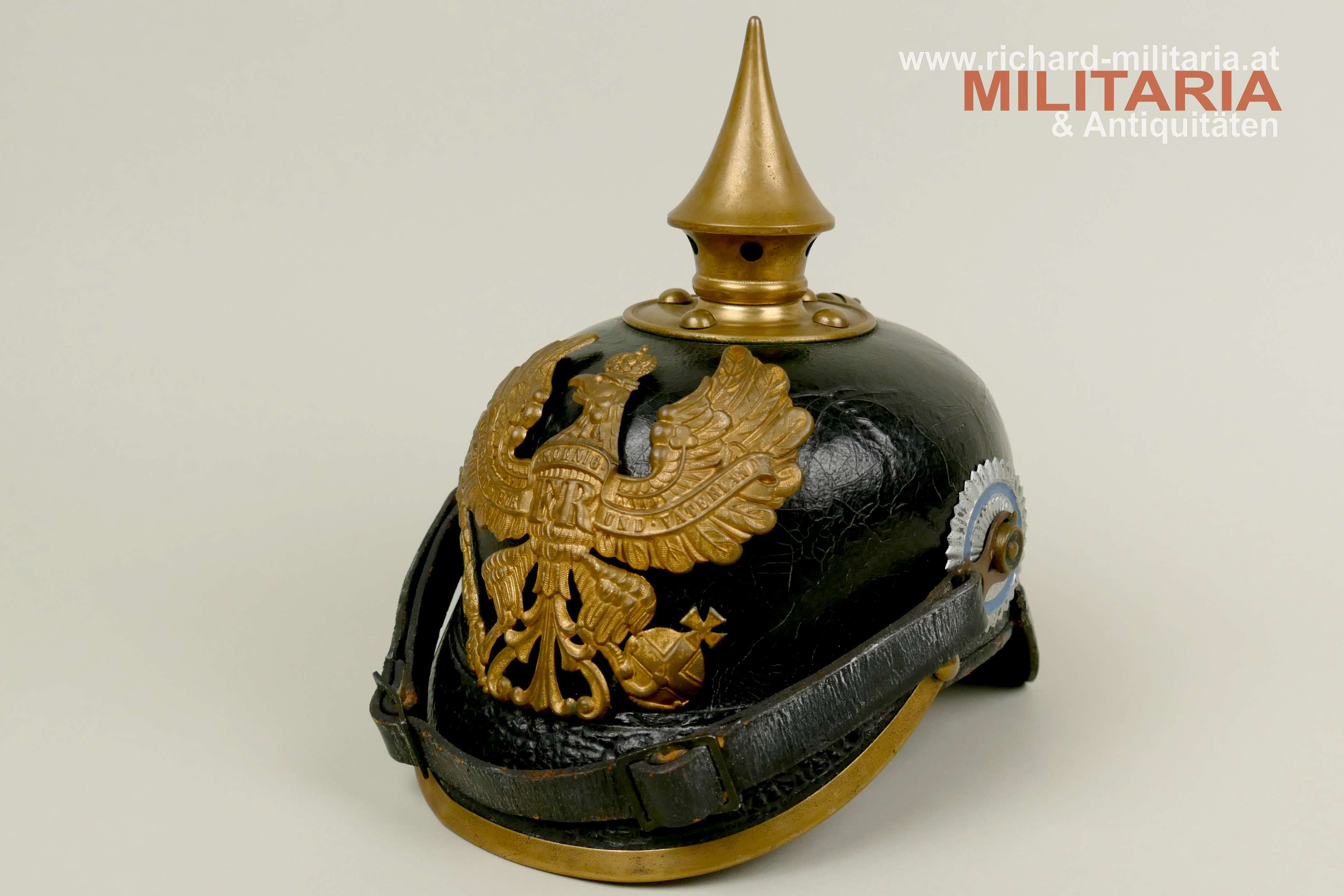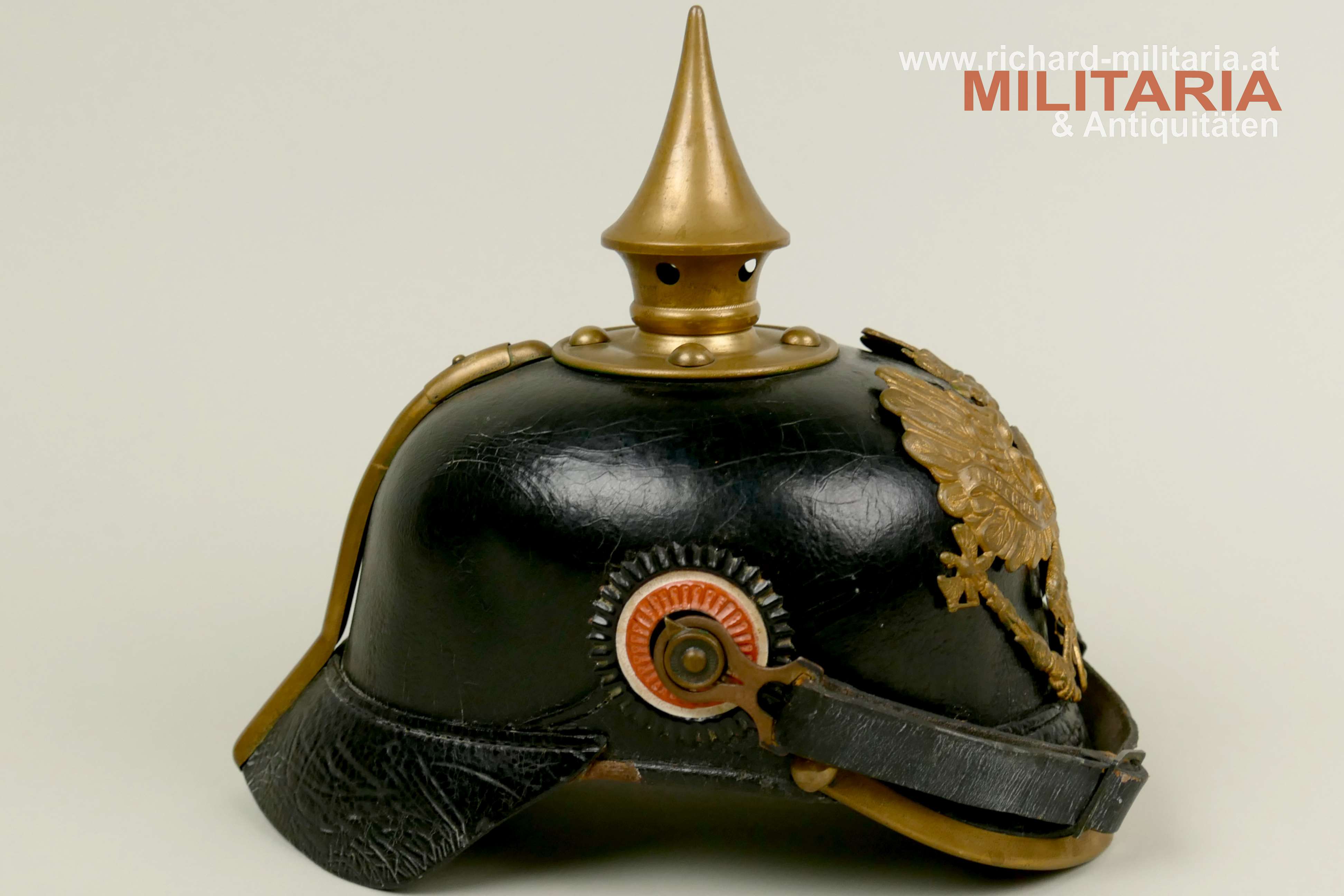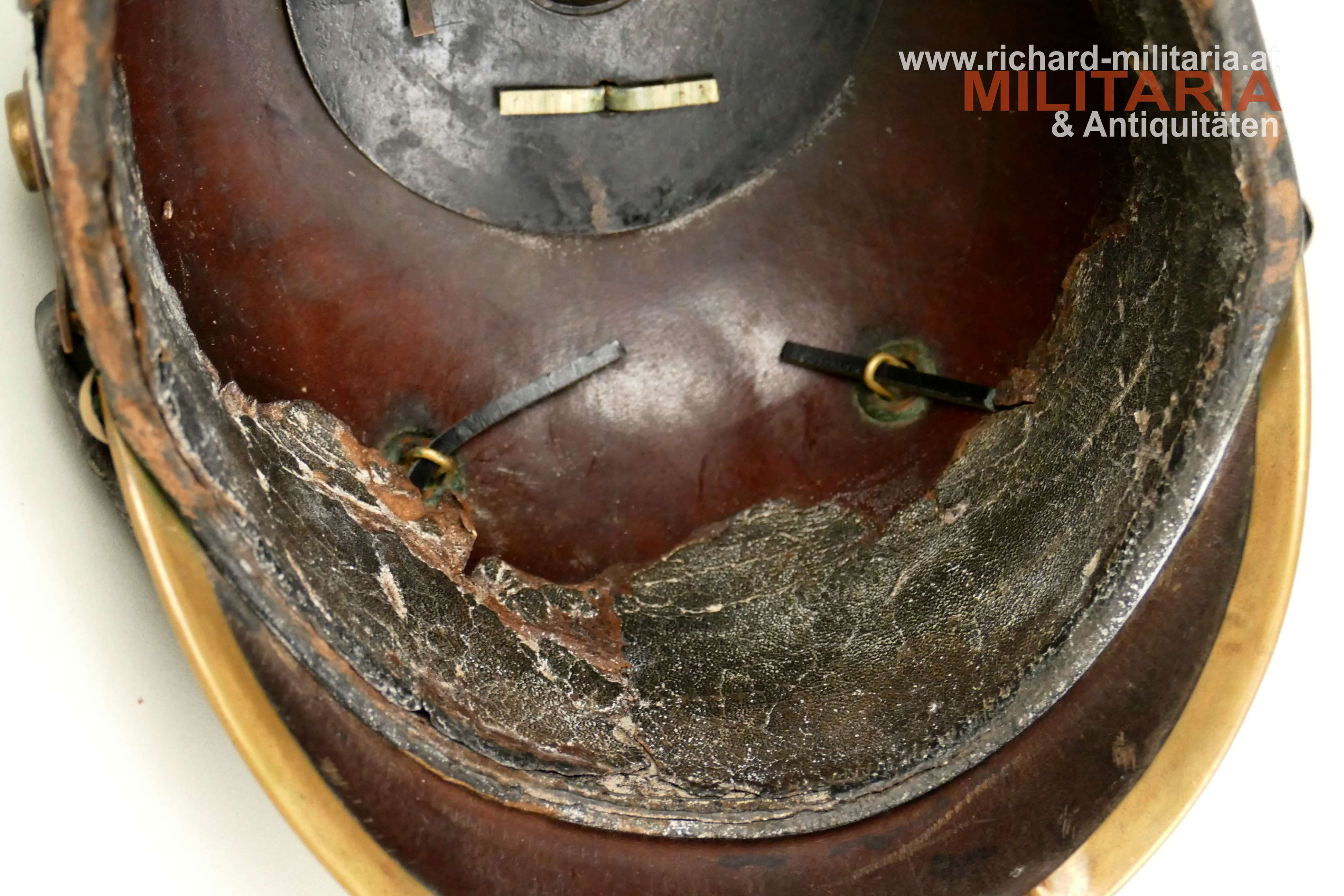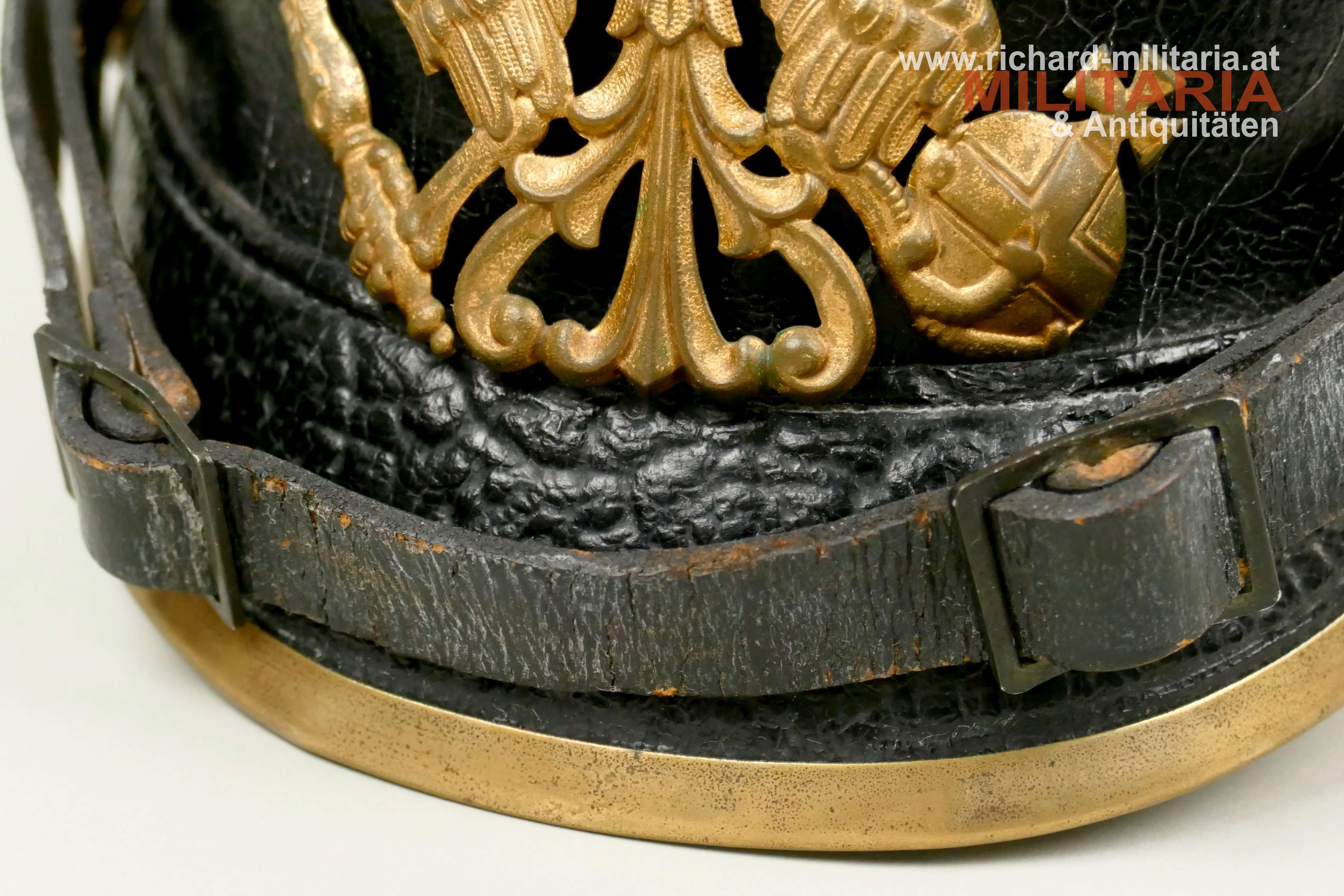 Preußen - Pickelhaube für Mannschaften der Linieninfanterie, gut erhaltener Lederhelm komplett mit allen Beschlägen, mit beiden Kokarden, Metallteile aus Tombak mit teilweiser erhaltener Restvergoldung, preußischer Adler ebenfalls aus Tombak mit Restvergoldung, schwarzer Sturmriemen, schwarzes Schweißleder dieses stärker beansprucht teilweise lose, im Nackenschirm schwer lesbarer Regimentsstempel und Herstellungsjahr : "I.R. 135 II - 1909?",