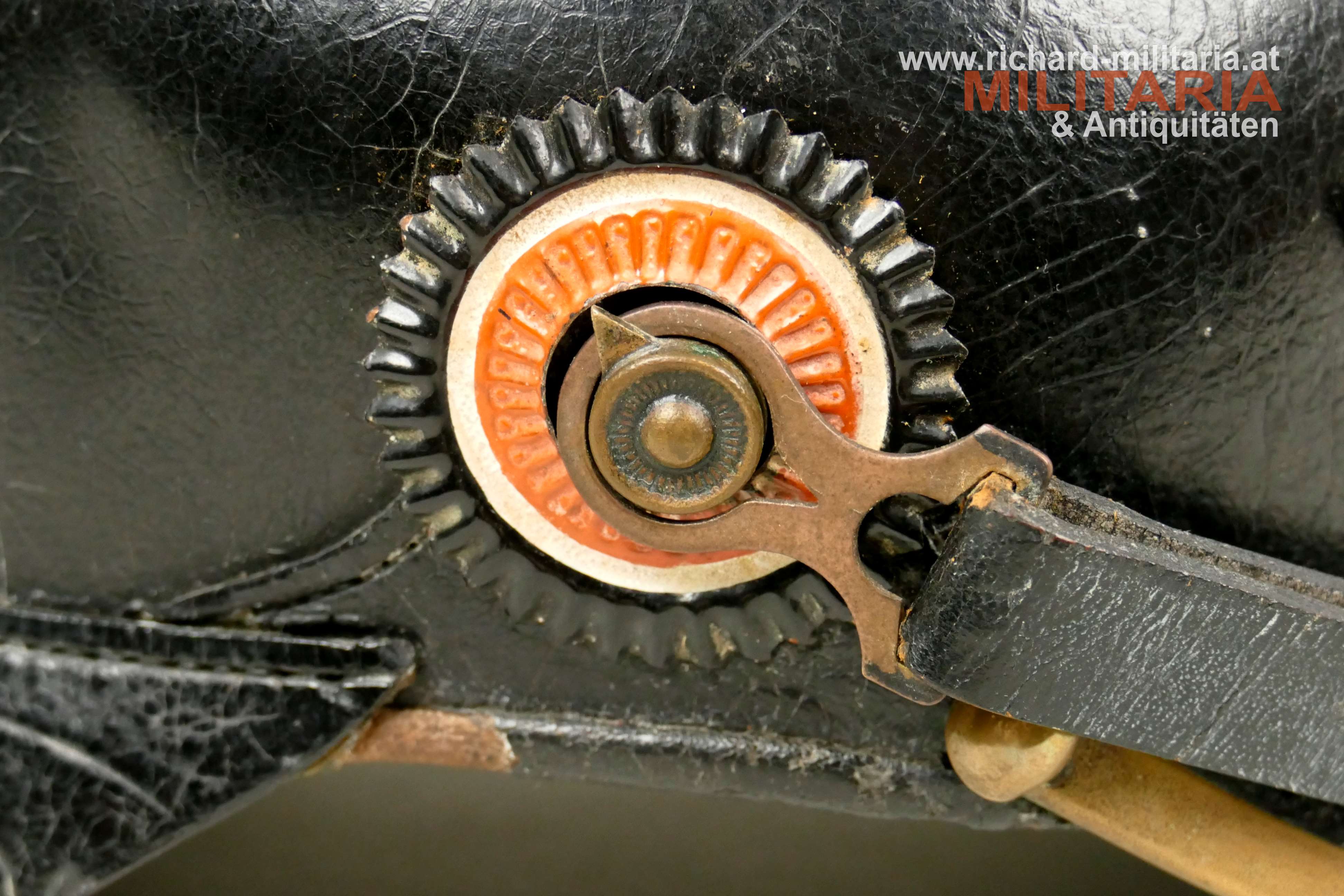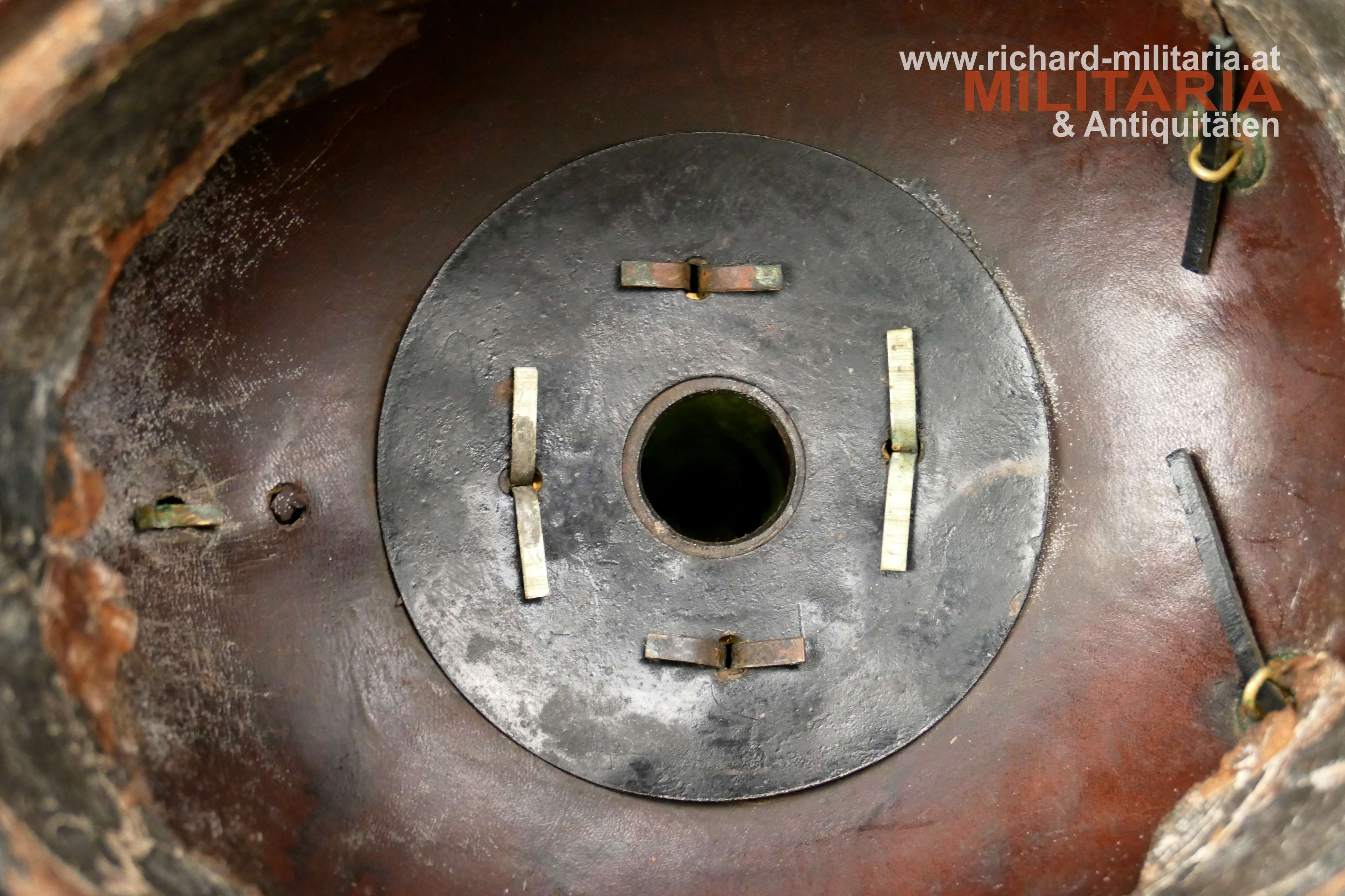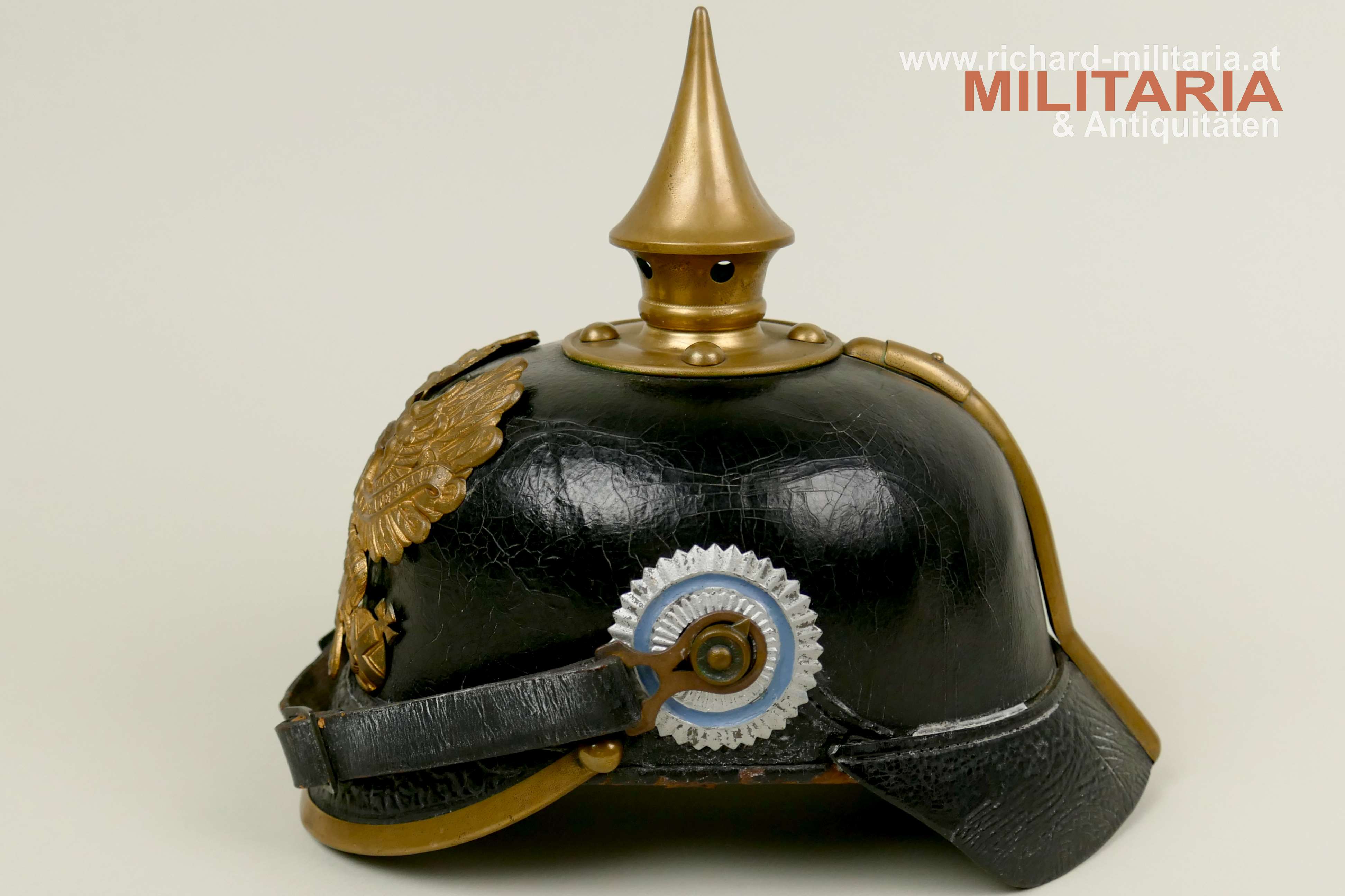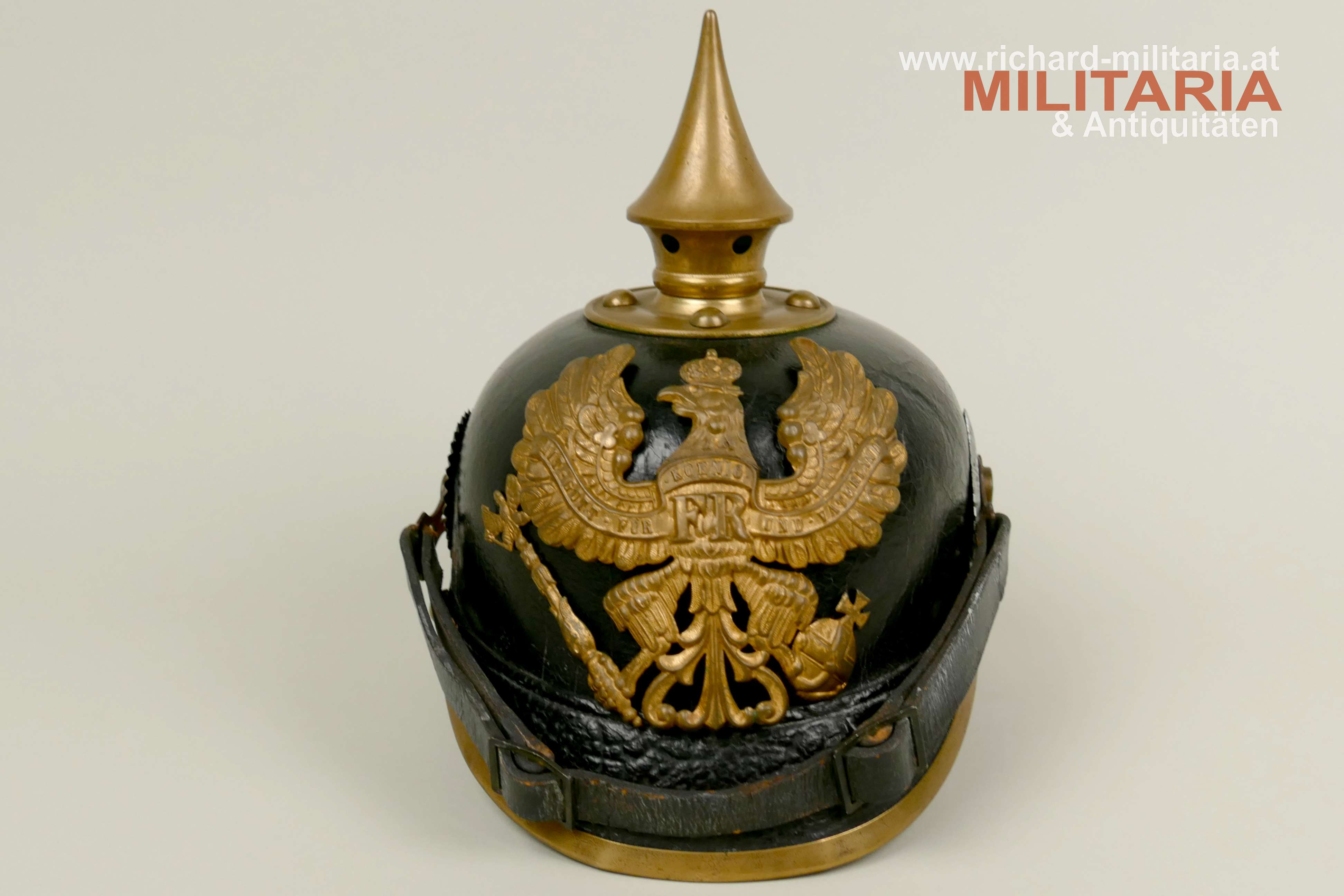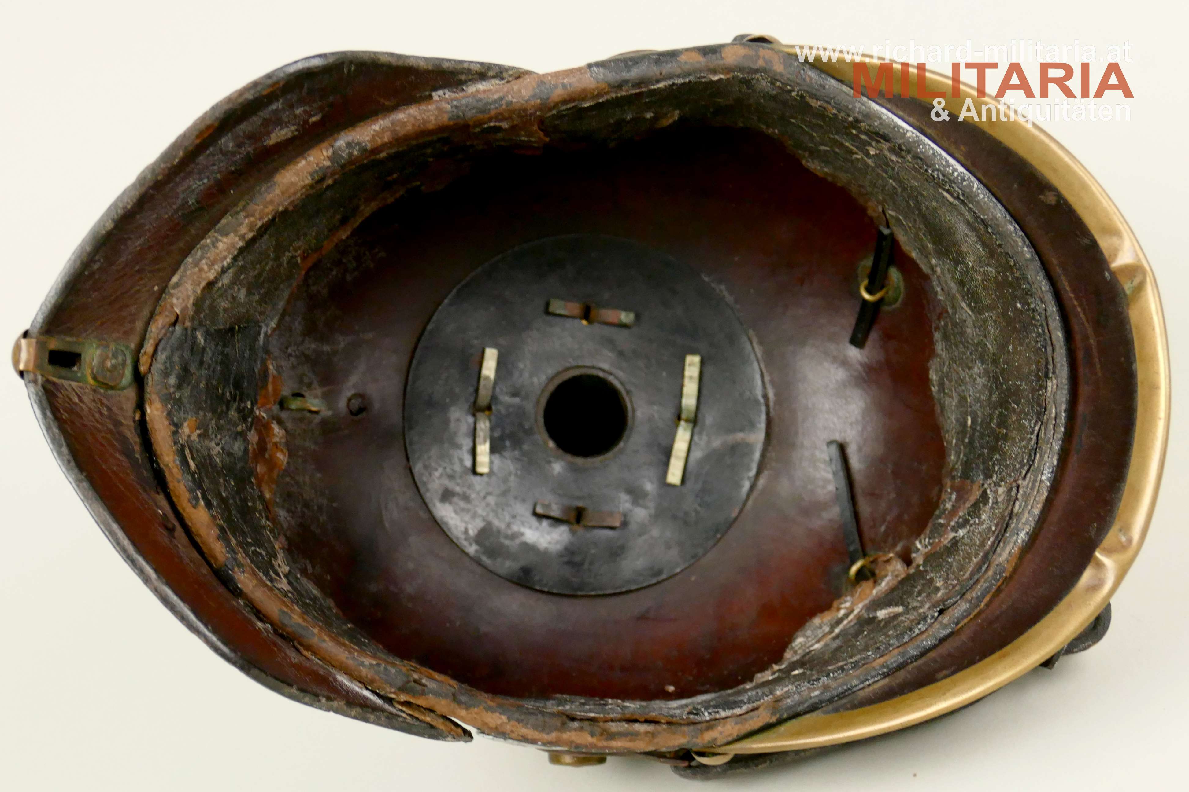 Preußen - Pickelhaube für Mannschaften der Linieninfanterie, gut erhaltener Lederhelm komplett mit allen Beschlägen, mit beiden Kokarden, Metallteile aus Tombak mit teilweiser erhaltener Restvergoldung, preußischer Adler ebenfalls aus Tombak mit Restvergoldung, schwarzer Sturmriemen, schwarzes Schweißleder dieses stärker beansprucht teilweise lose, im Nackenschirm schwer lesbarer Regimentsstempel und Herstellungsjahr : "I.R. 135 II - 1909?",