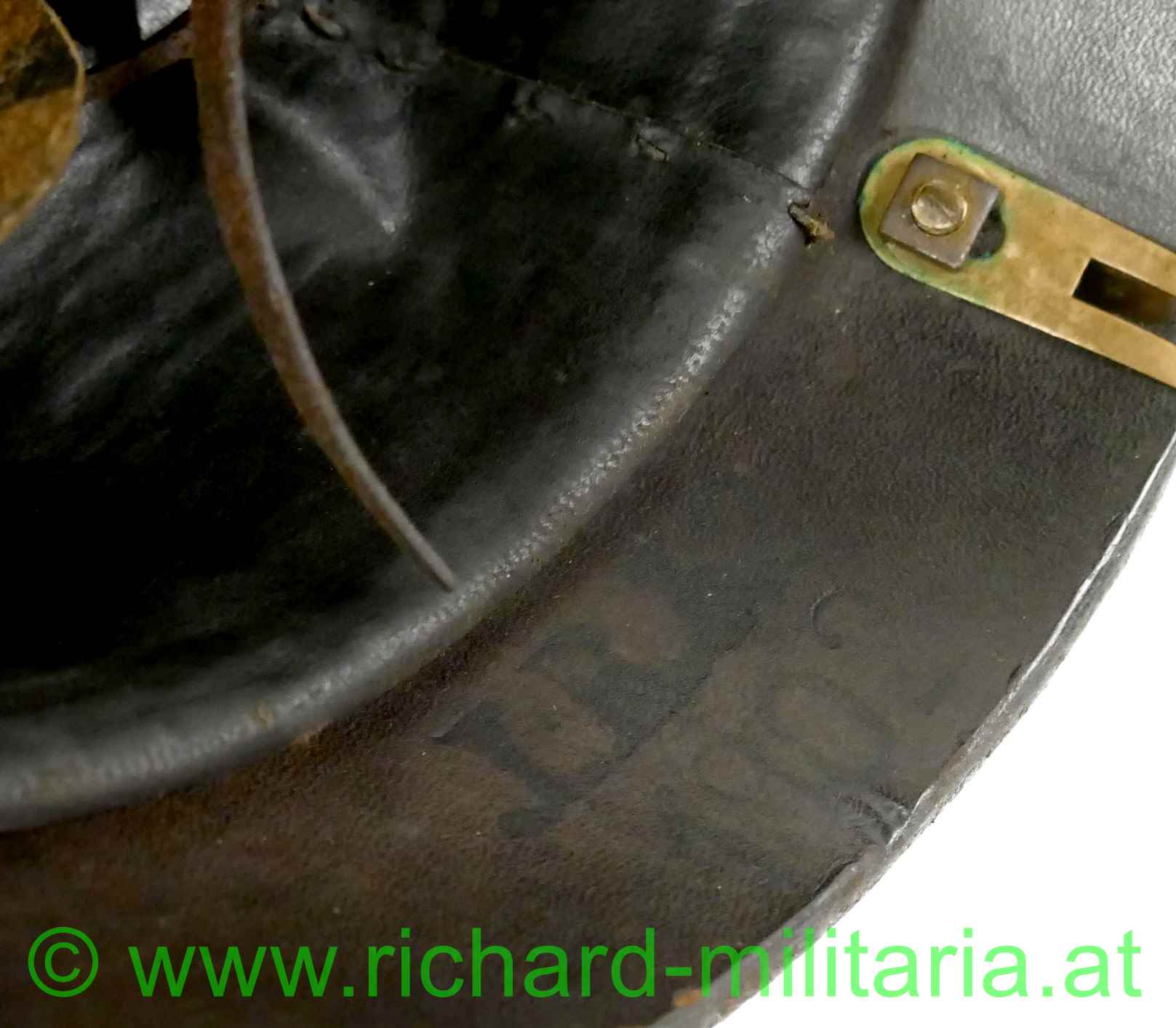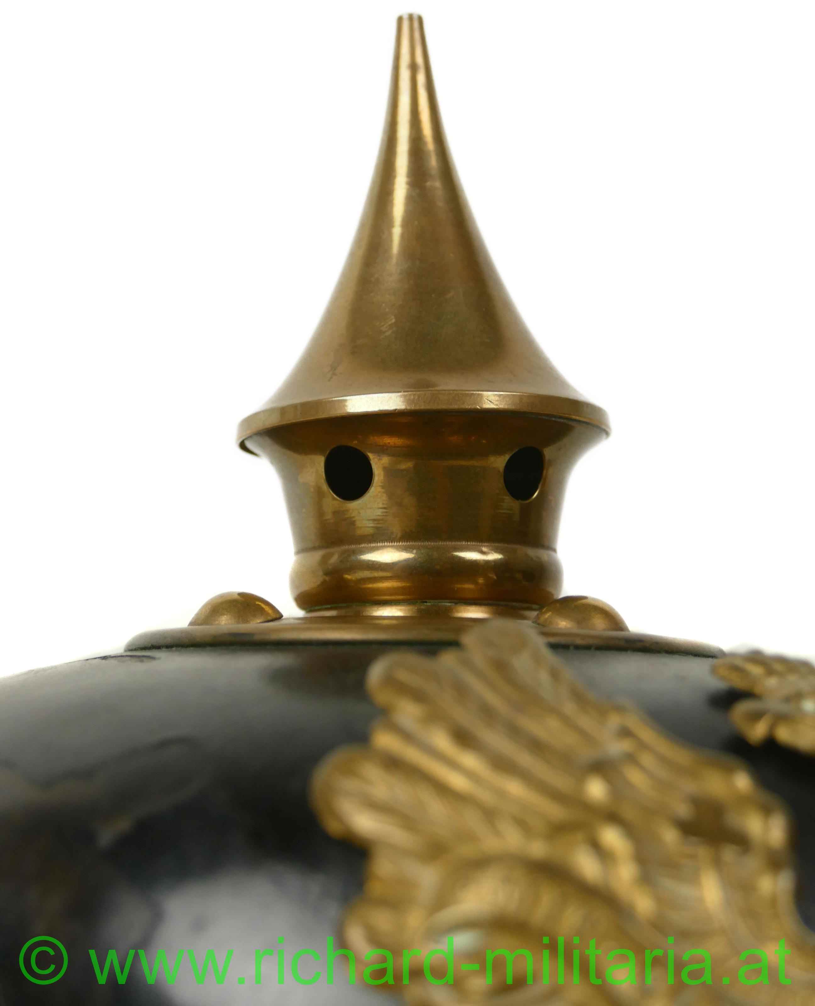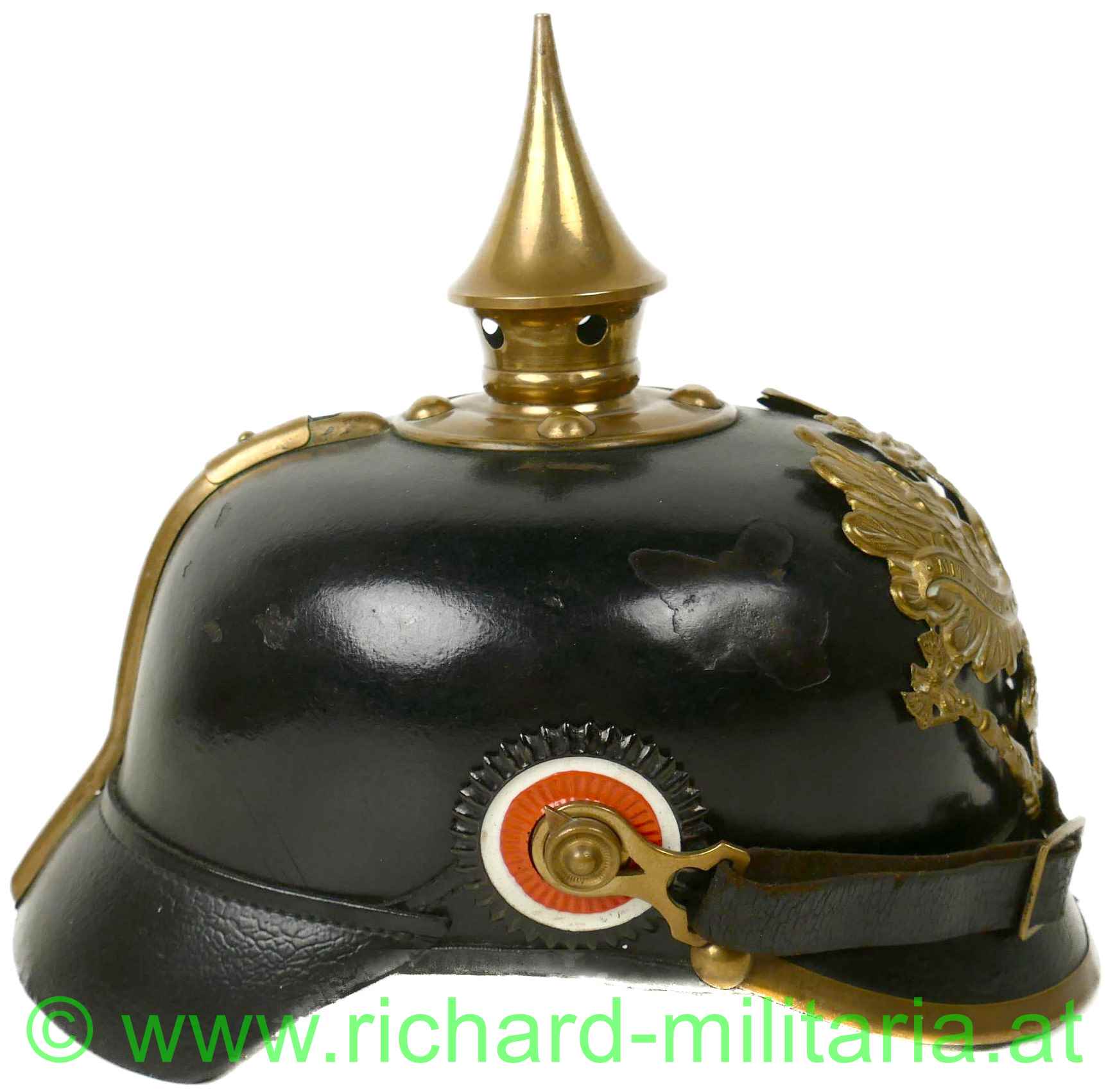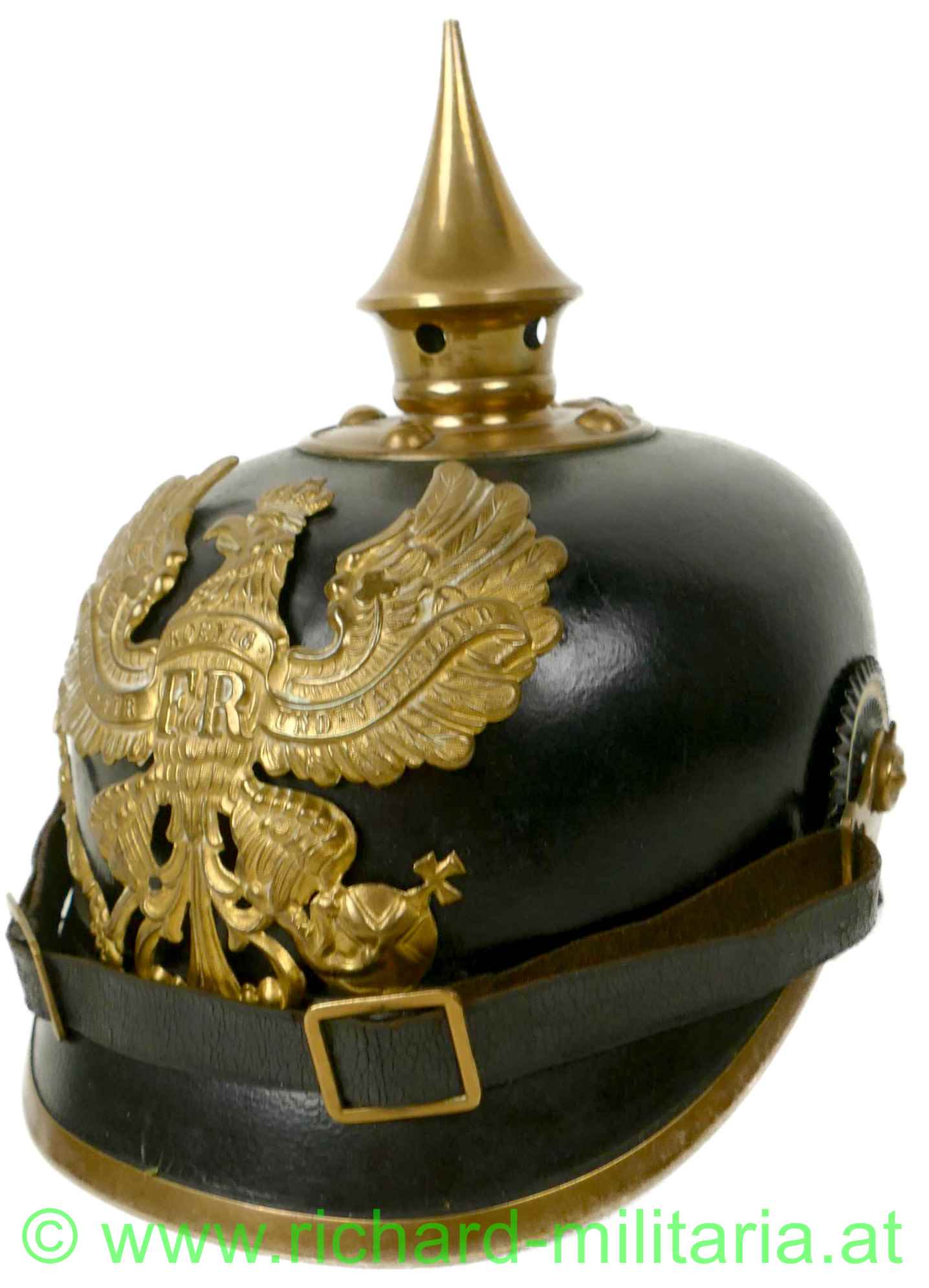 Preußen - Pickelhaube für Mannschaften der Linieninfanterie; 1892; sehr gut erhaltener Lederhelm komplett mit allen Beschlägen; mit beiden Kokarden; Metallteile aus Tombak - Vergoldung großteils verputzt; schwarzer Sturmriemen, schwarzes Schweißleder mit Lederzugband, im Nackenschirm Regimentsstempel und Herstellerjahr: "J.R. 32 - 1892"; Helmgröße ca.: "56"; auf der rechten Seite Lackabplatzer (siehe Fotos).