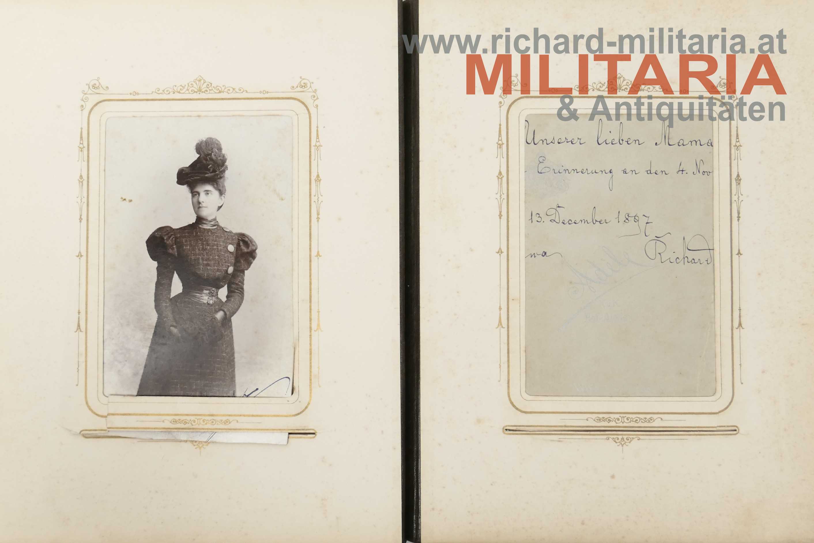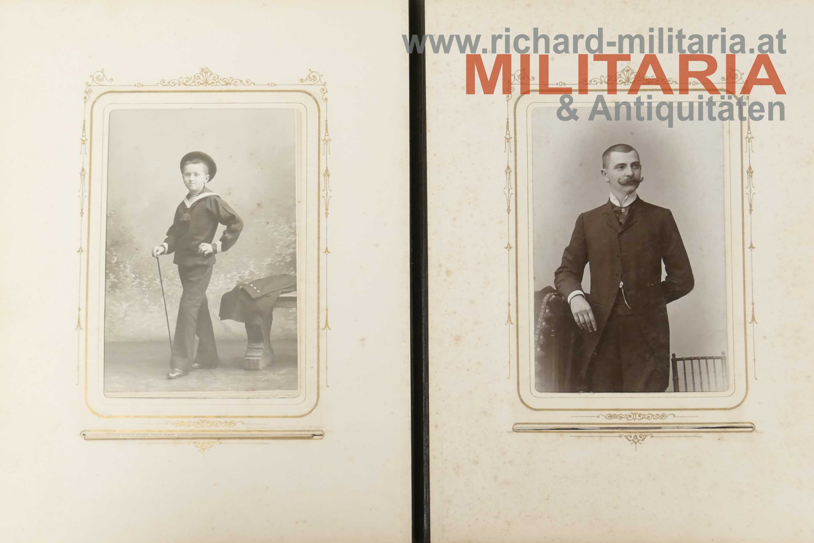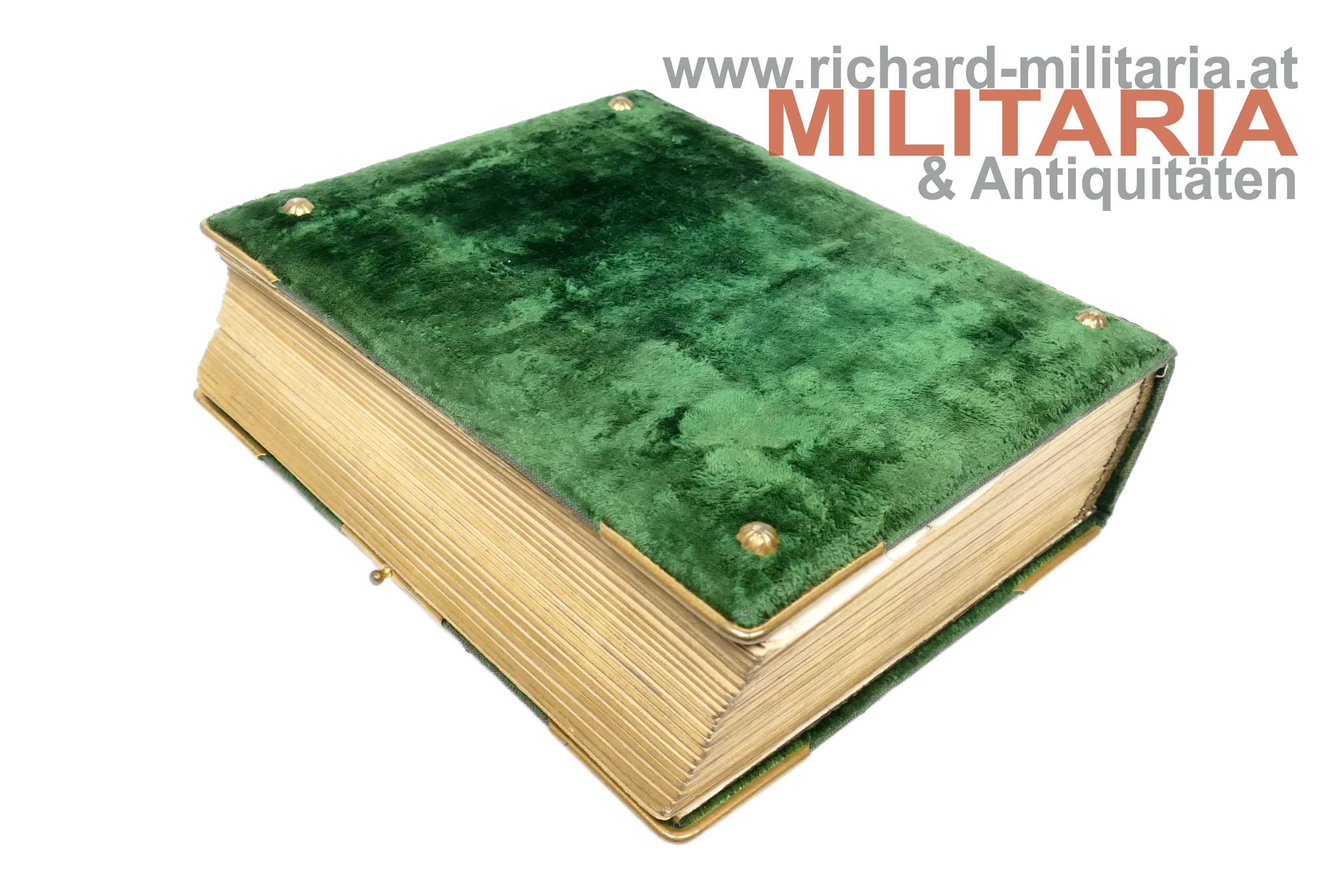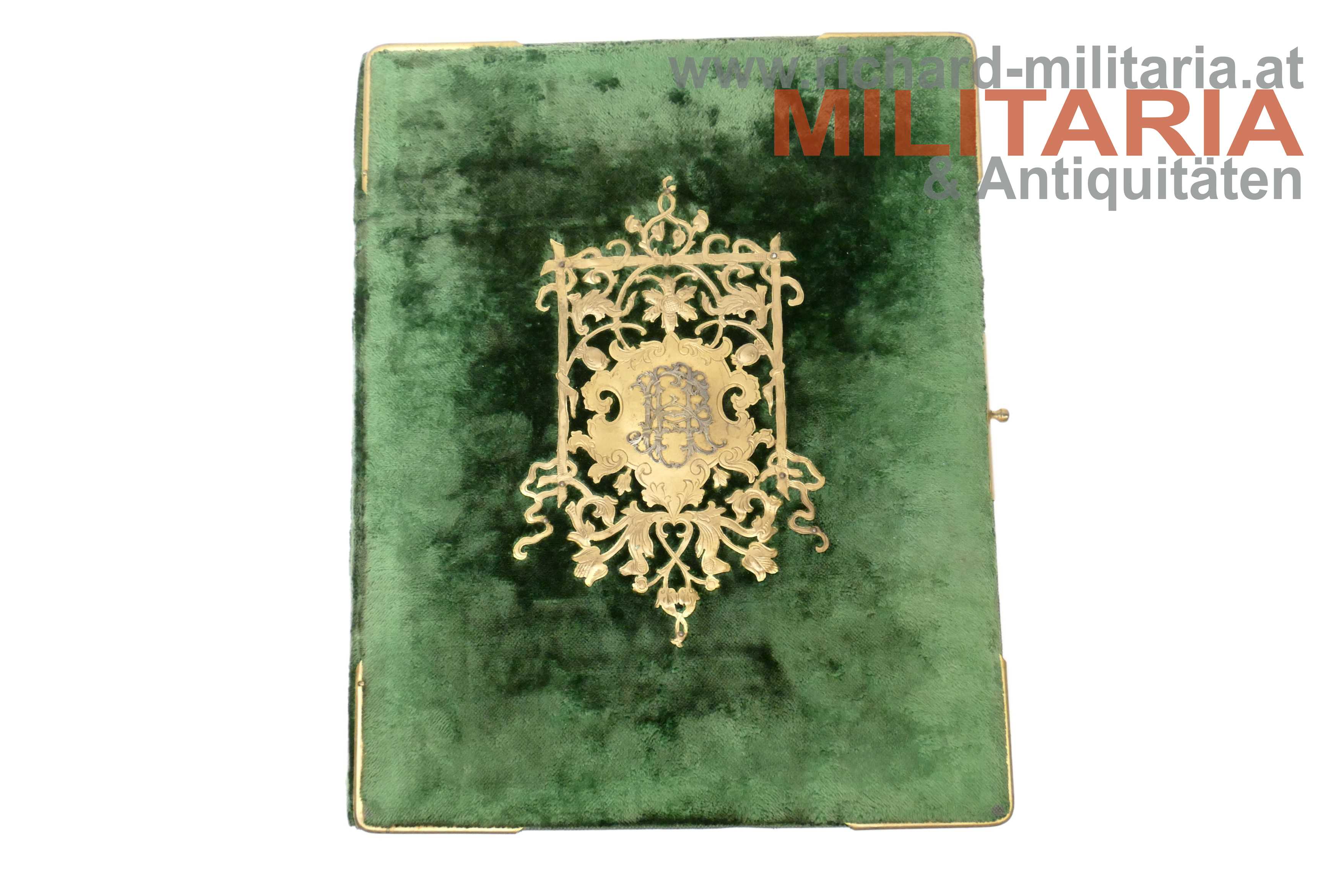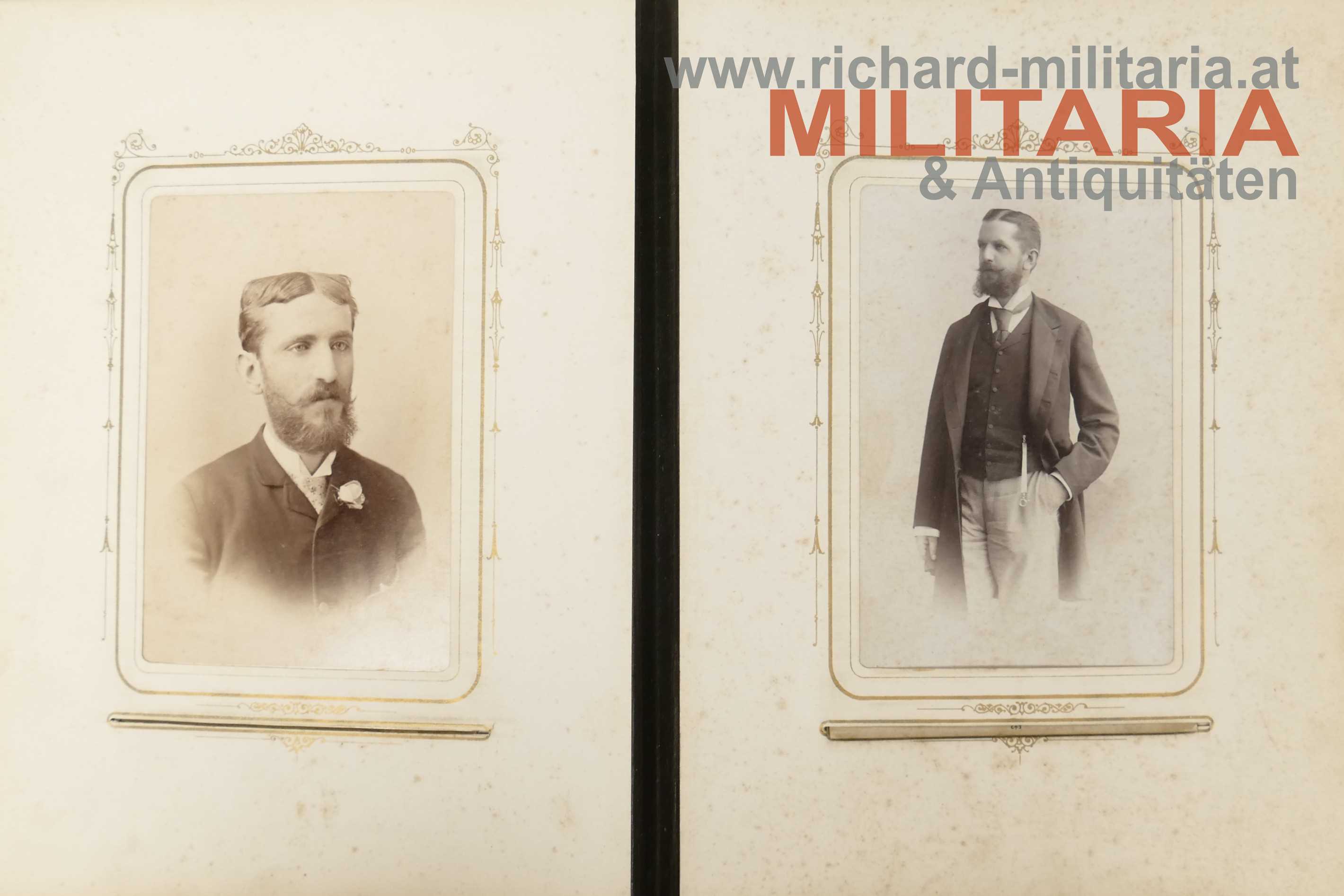 Prunkfamilienalbum - k.u.k. Generalkonsul 1. Klasse Richard Hickel; grüner dicker Samteinband mit Messingbeschlägen; frontseitig am Einband eine Auflage mit dem Monogramm "RH" (Richard Hickel); alle Seiten mit Goldschnitt; insgesamt 39 Hartkartonfotos; darunter ein Foto eines hohen Marine-Beamten mit Comtur des Gregorius-Orden; Orden der Eisernen Krone 3. Klasse; Franz-Joseph-Orden-Ritterkreuz, ... und Marine-Säbel; zwei weitere Hartkartonfotos einer hochdekorierten Persönlichkeit - vermutlich ebenfalls aus der Familie; abgebildet unter anderem mit einem kaiserlich österreichischen Leopold-Orden Ritterkreuz und einen Franz Josef-Orden Komtur sowie Comtur des Takovo-Orden; beiliegend ein Schreiben über die Rückstellung des Ordens der Eisernen Krone 3. Klasse vom 20. April 1911; am 22. Jänner 1911 wurde Generalkonsul Hickel mit gleichzeitiger Verleihung des Ordens der Eisernen Krone 2. Klasse in den bleibenden Ruhestand versetzt;
