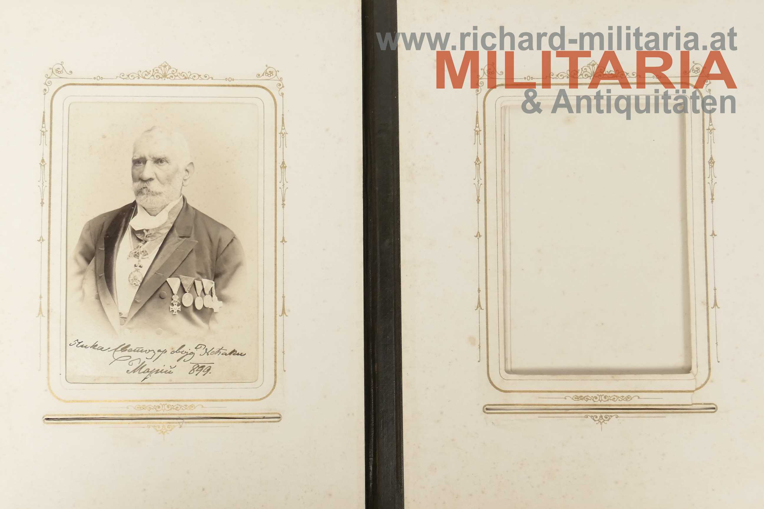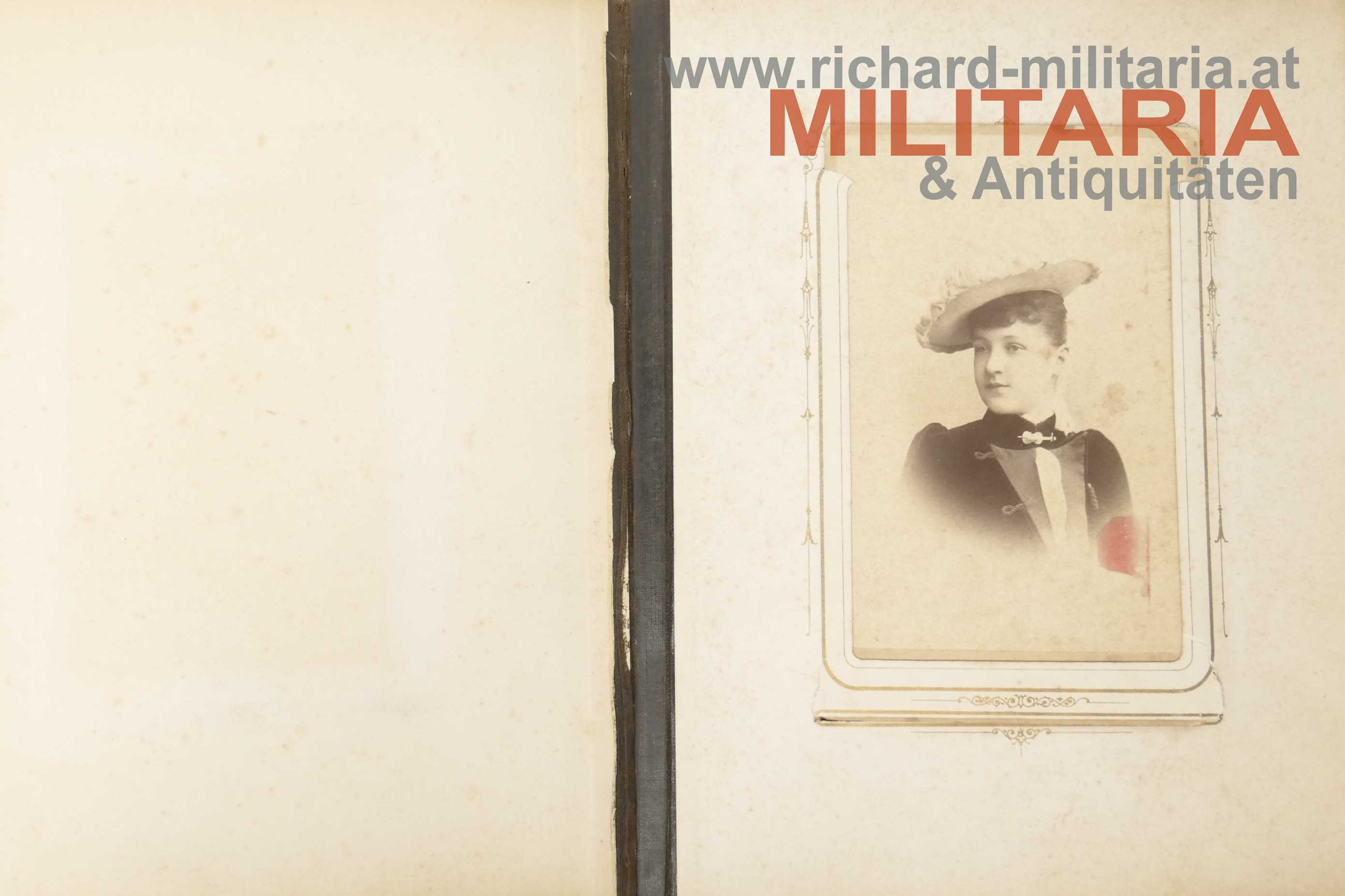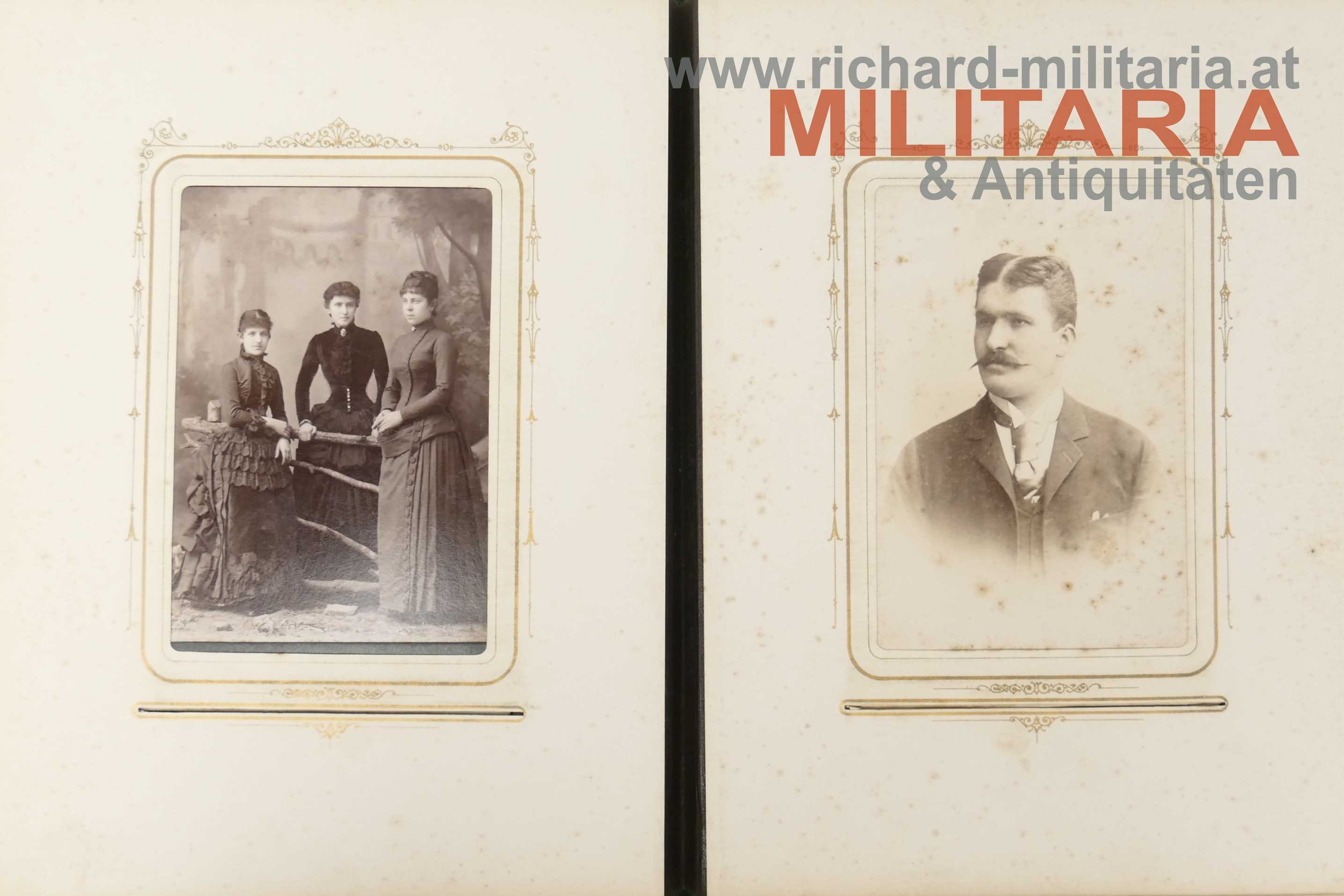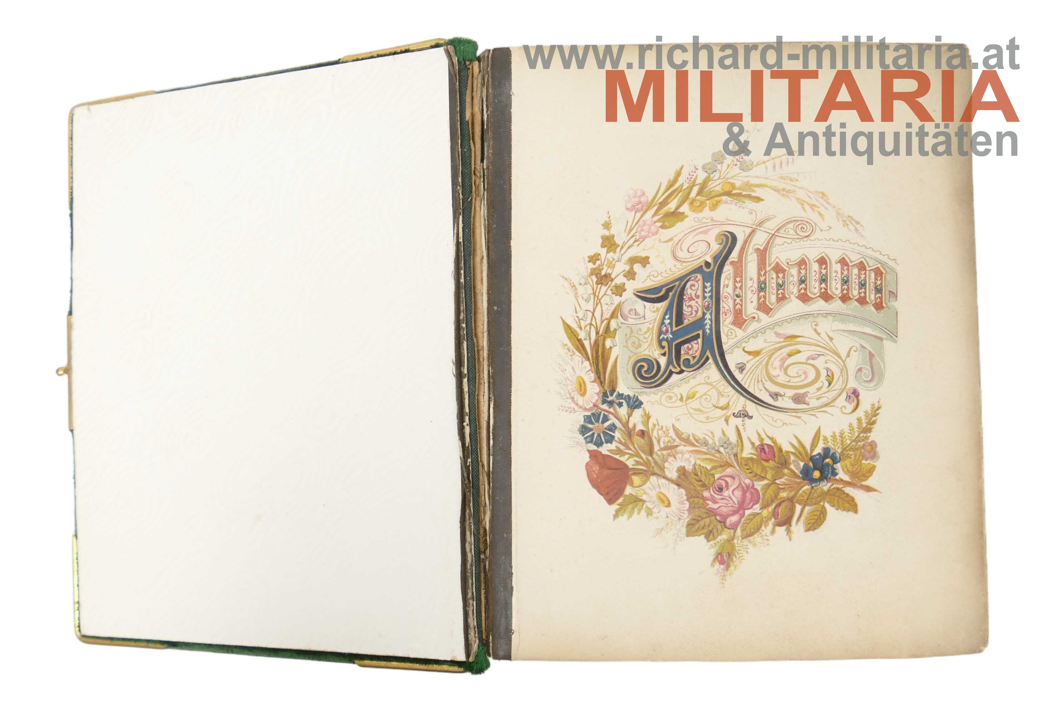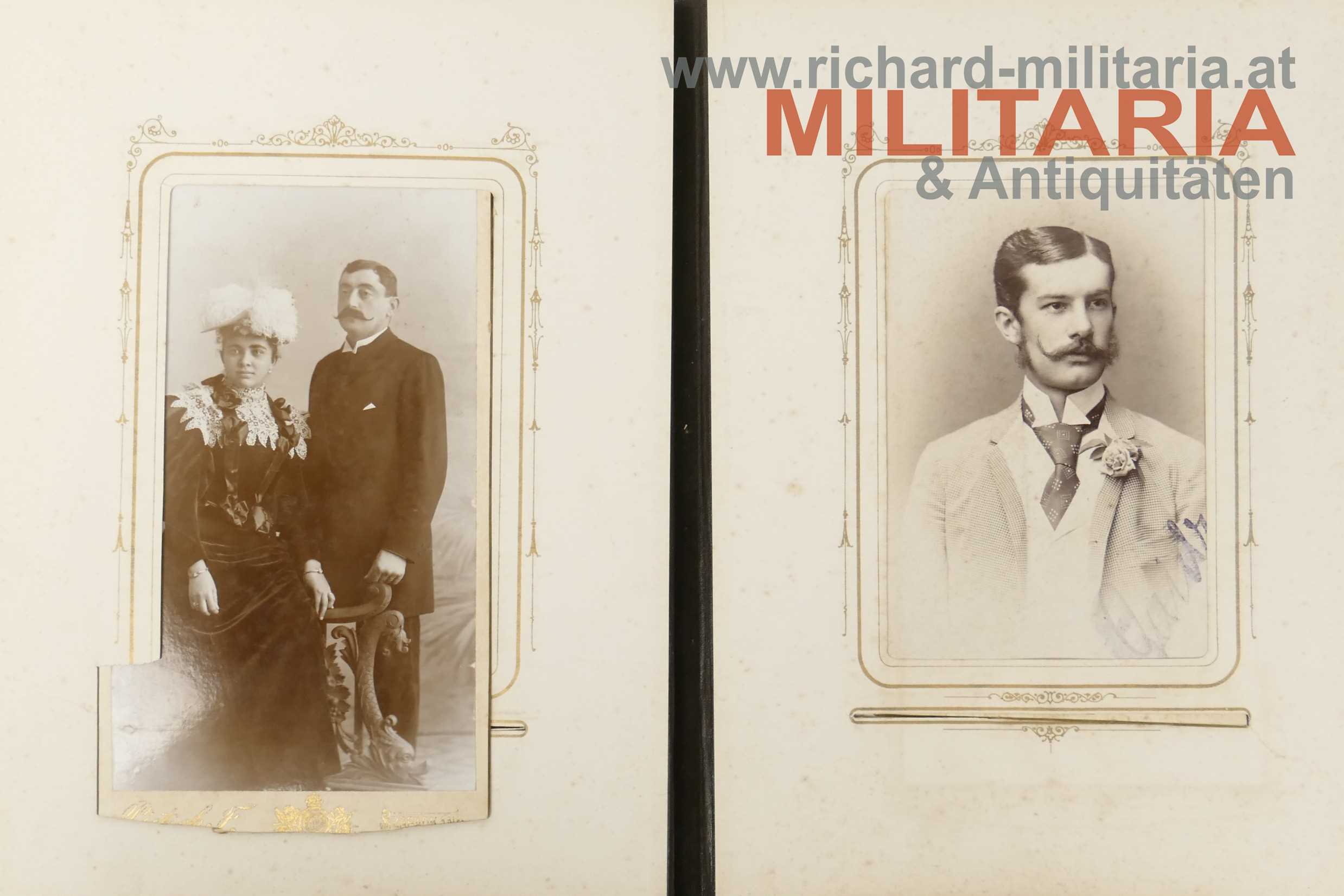 Prunkfamilienalbum - k.u.k. Generalkonsul 1. Klasse Richard Hickel; grüner dicker Samteinband mit Messingbeschlägen; frontseitig am Einband eine Auflage mit dem Monogramm "RH" (Richard Hickel); alle Seiten mit Goldschnitt; insgesamt 39 Hartkartonfotos; darunter ein Foto eines hohen Marine-Beamten mit Comtur des Gregorius-Orden; Orden der Eisernen Krone 3. Klasse; Franz-Joseph-Orden-Ritterkreuz, ... und Marine-Säbel; zwei weitere Hartkartonfotos einer hochdekorierten Persönlichkeit - vermutlich ebenfalls aus der Familie; abgebildet unter anderem mit einem kaiserlich österreichischen Leopold-Orden Ritterkreuz und einen Franz Josef-Orden Komtur sowie Comtur des Takovo-Orden; beiliegend ein Schreiben über die Rückstellung des Ordens der Eisernen Krone 3. Klasse vom 20. April 1911; am 22. Jänner 1911 wurde Generalkonsul Hickel mit gleichzeitiger Verleihung des Ordens der Eisernen Krone 2. Klasse in den bleibenden Ruhestand versetzt;