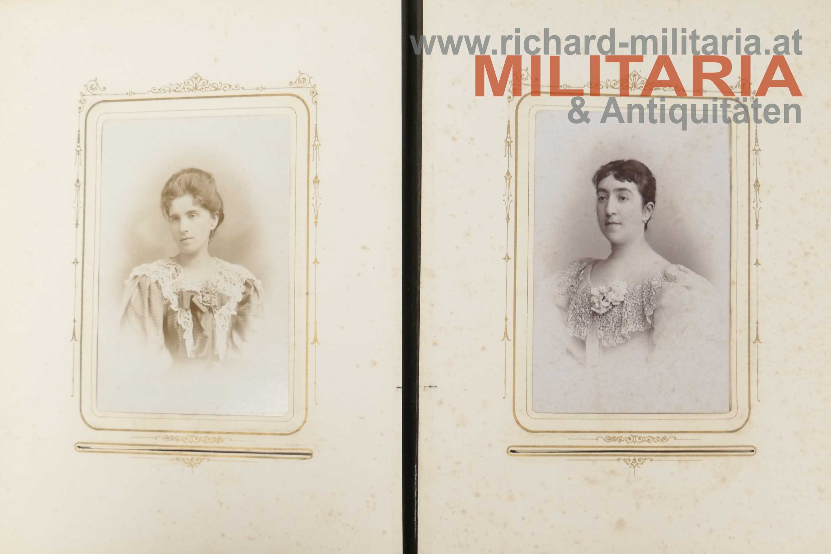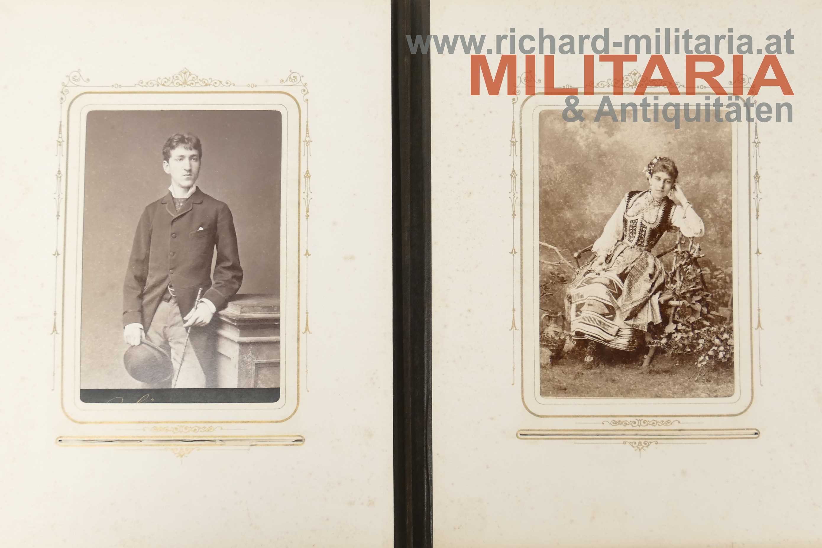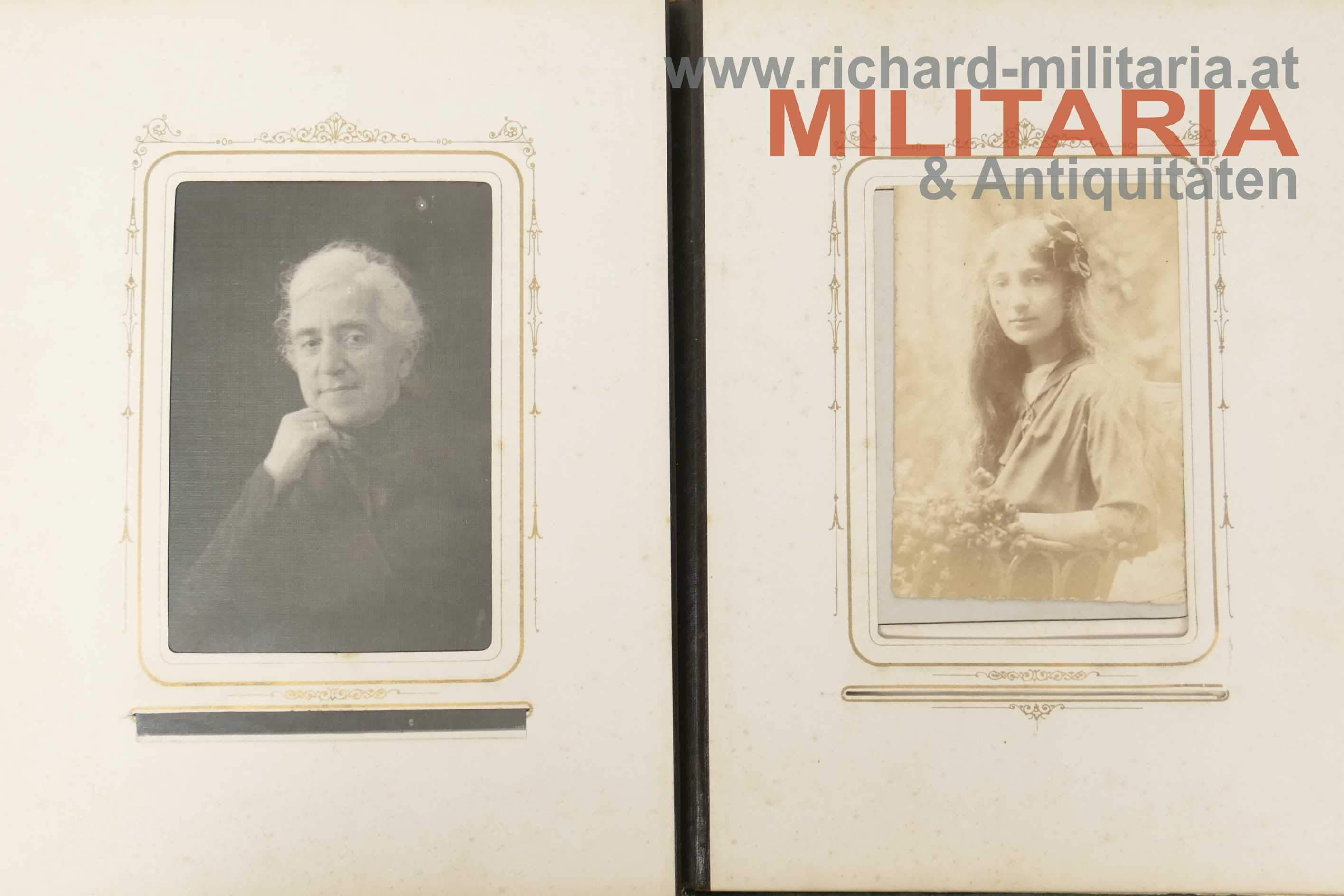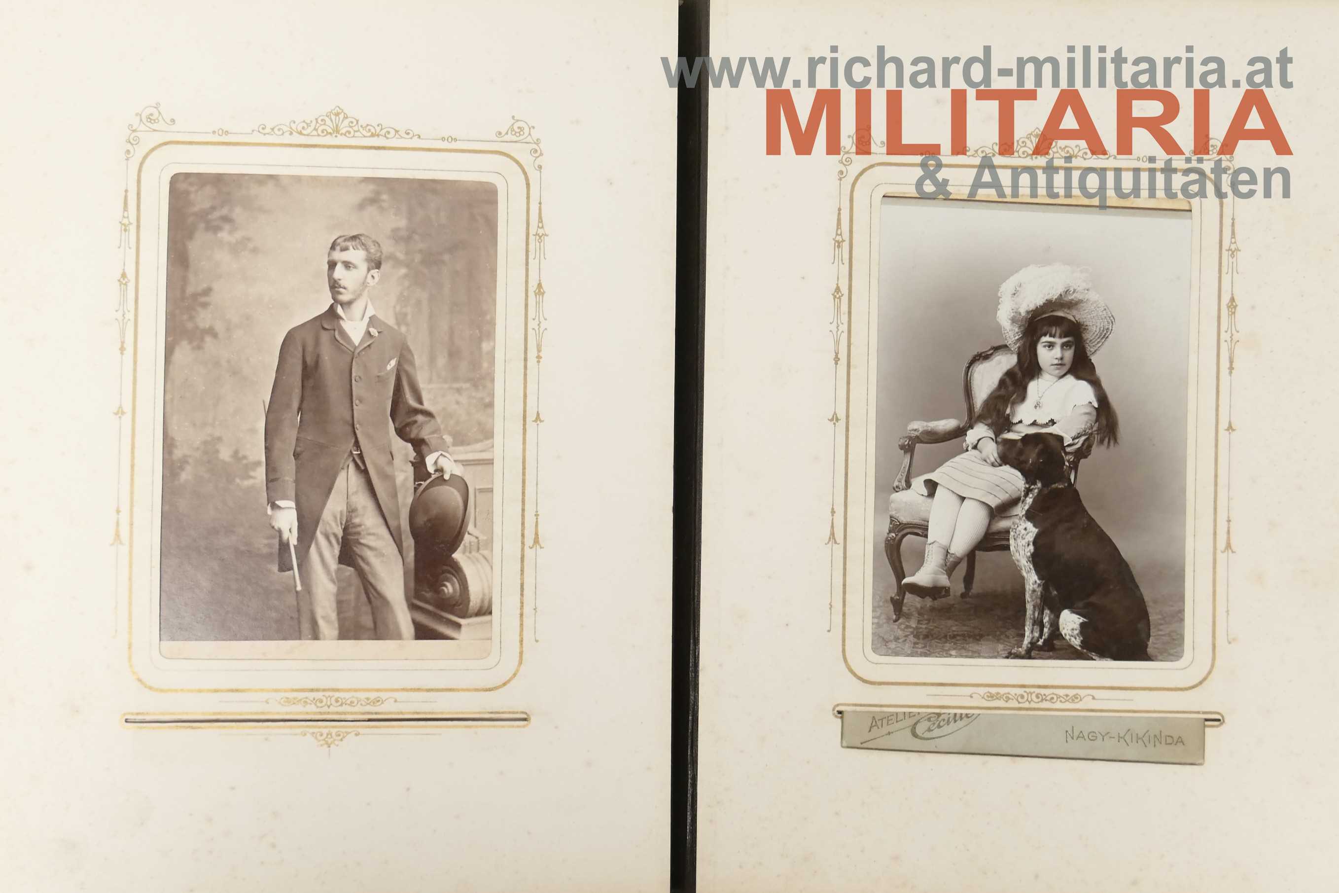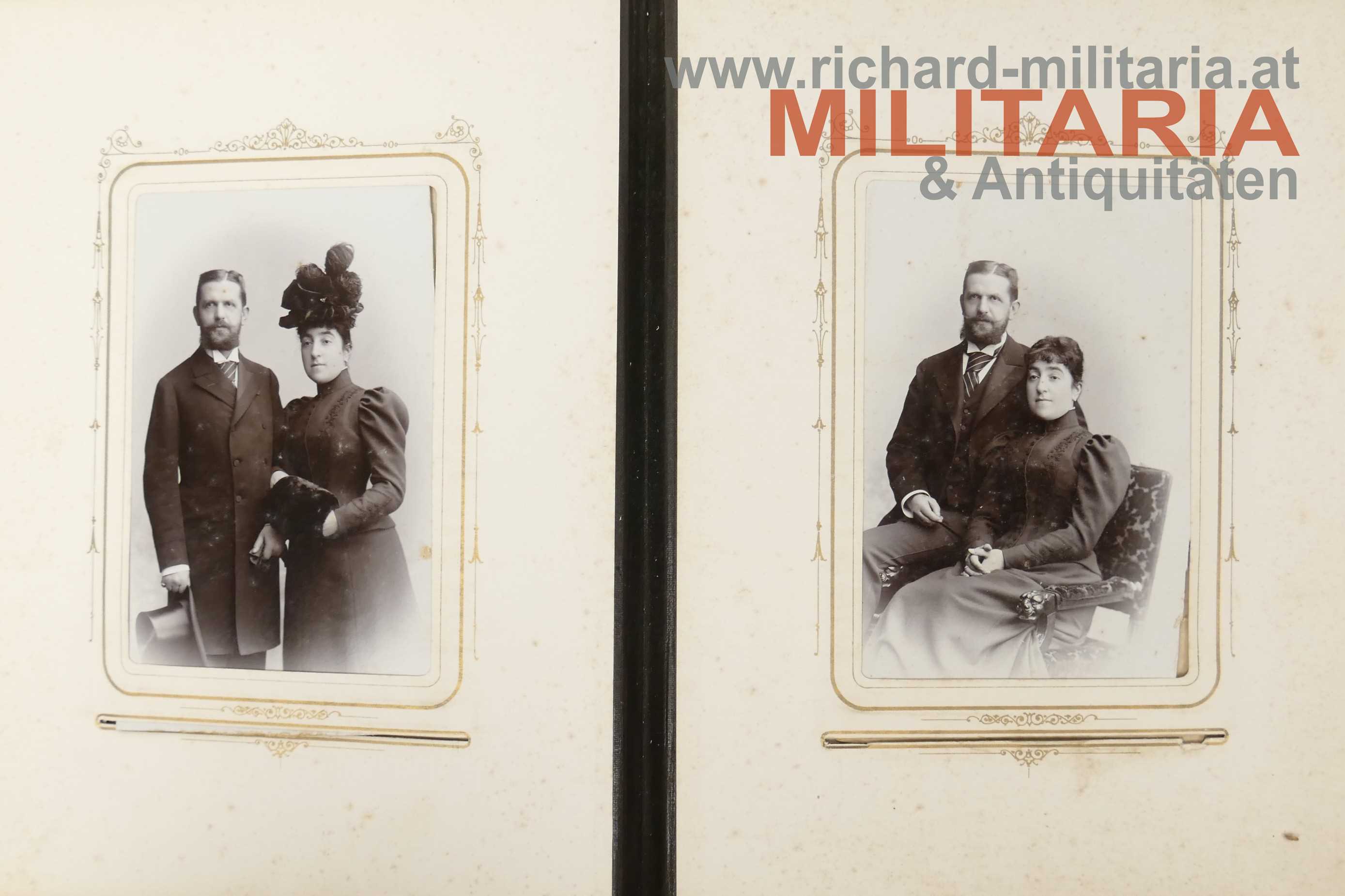 Prunkfamilienalbum - k.u.k. Generalkonsul 1. Klasse Richard Hickel; grüner dicker Samteinband mit Messingbeschlägen; frontseitig am Einband eine Auflage mit dem Monogramm "RH" (Richard Hickel); alle Seiten mit Goldschnitt; insgesamt 39 Hartkartonfotos; darunter ein Foto eines hohen Marine-Beamten mit Comtur des Gregorius-Orden; Orden der Eisernen Krone 3. Klasse; Franz-Joseph-Orden-Ritterkreuz, ... und Marine-Säbel; zwei weitere Hartkartonfotos einer hochdekorierten Persönlichkeit - vermutlich ebenfalls aus der Familie; abgebildet unter anderem mit einem kaiserlich österreichischen Leopold-Orden Ritterkreuz und einen Franz Josef-Orden Komtur sowie Comtur des Takovo-Orden; beiliegend ein Schreiben über die Rückstellung des Ordens der Eisernen Krone 3. Klasse vom 20. April 1911; am 22. Jänner 1911 wurde Generalkonsul Hickel mit gleichzeitiger Verleihung des Ordens der Eisernen Krone 2. Klasse in den bleibenden Ruhestand versetzt;