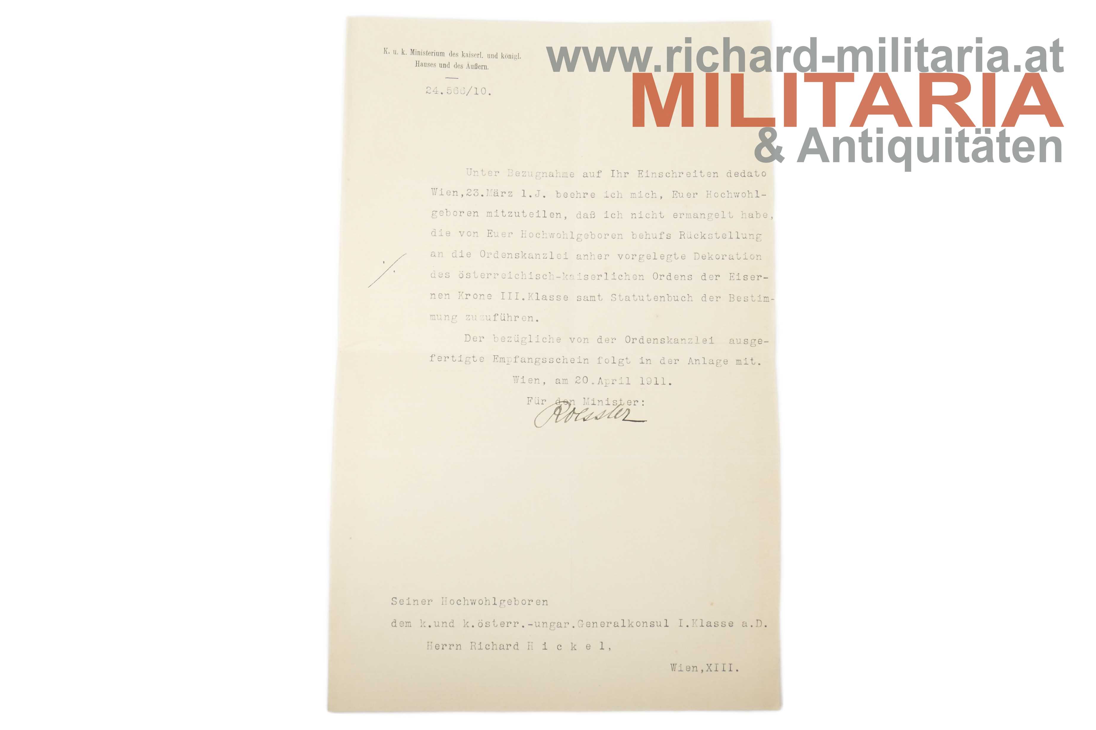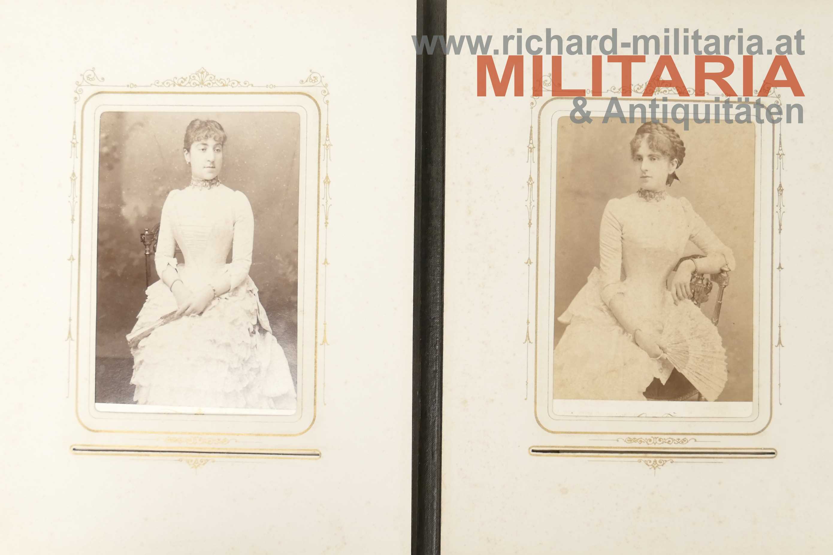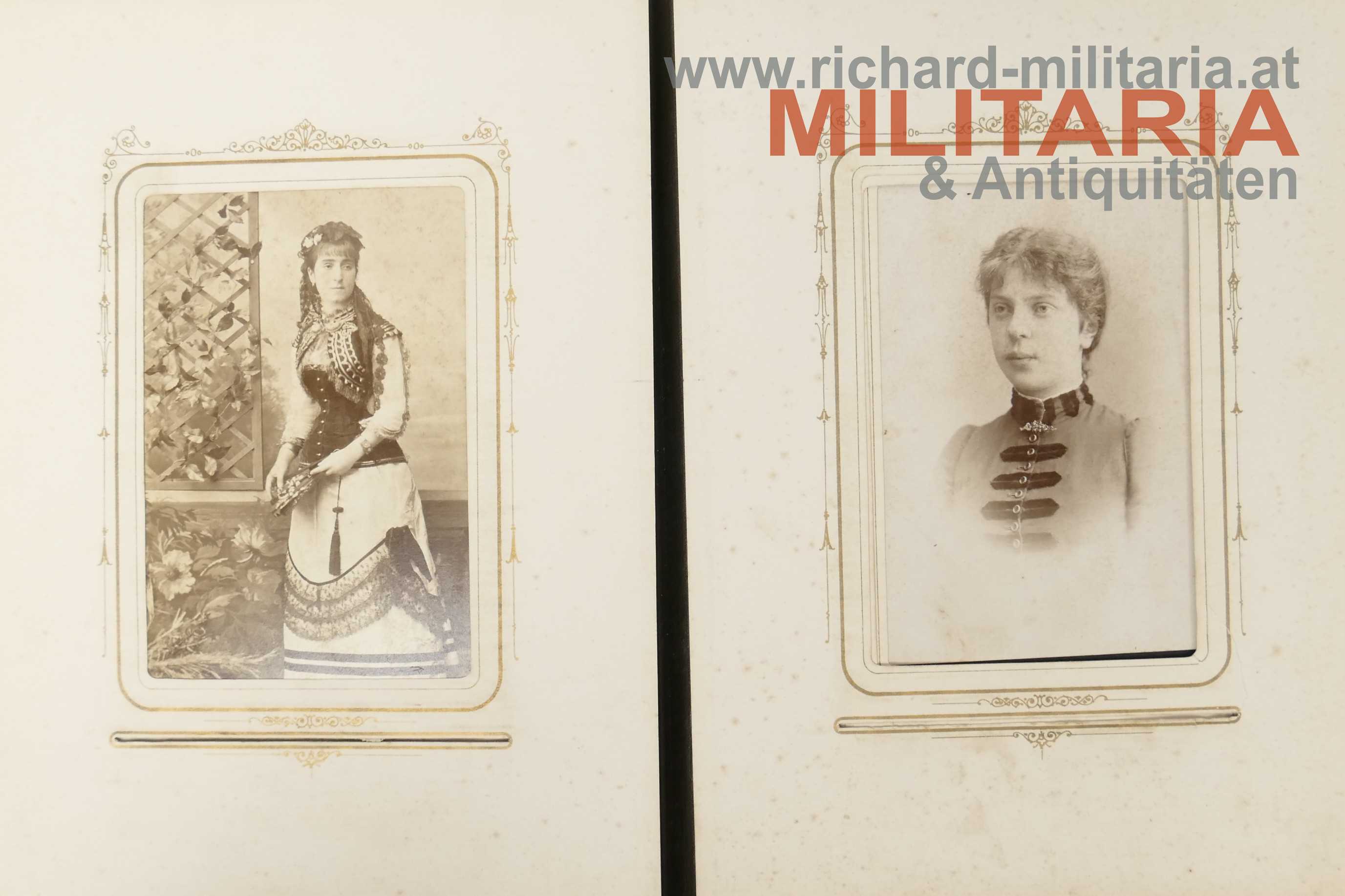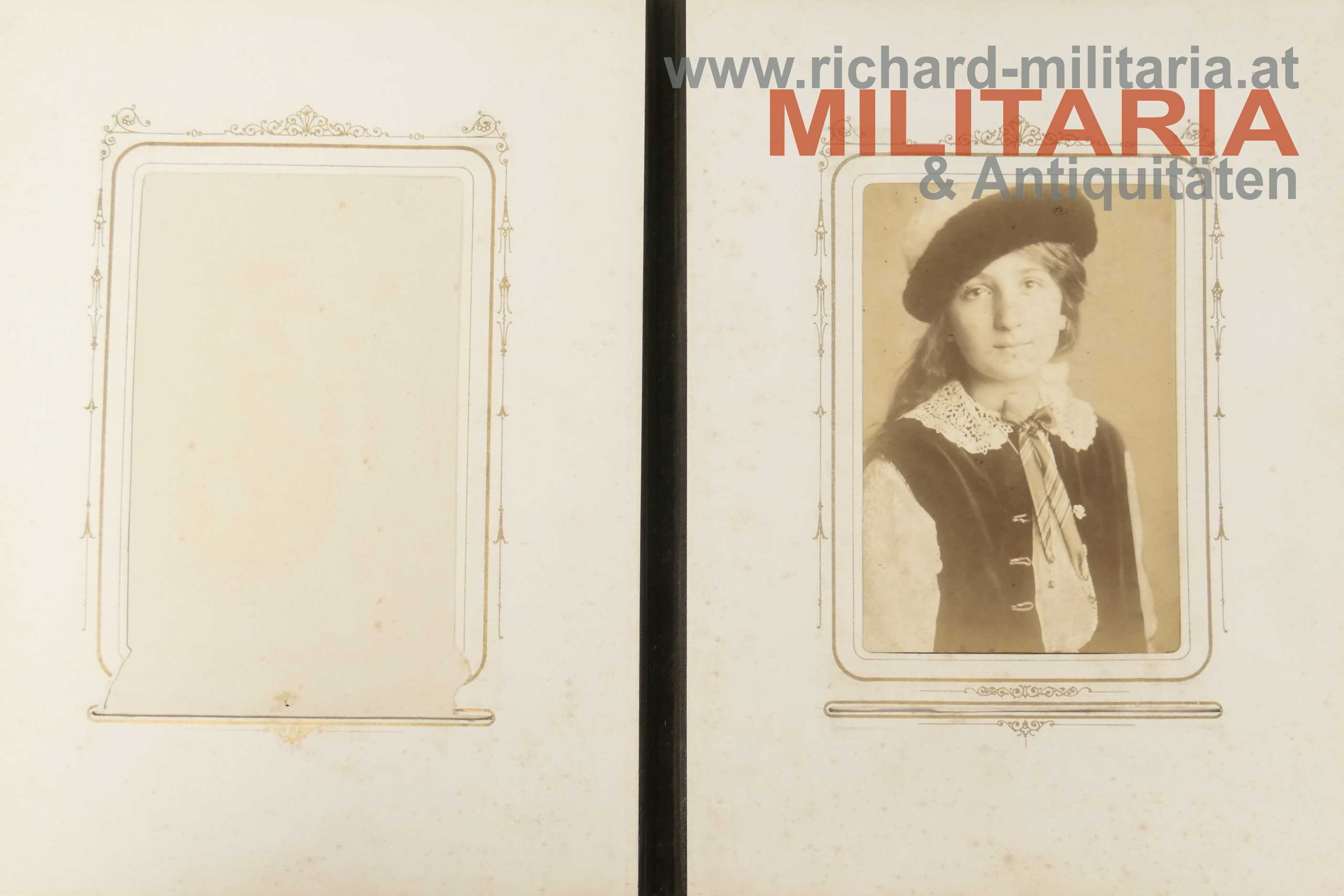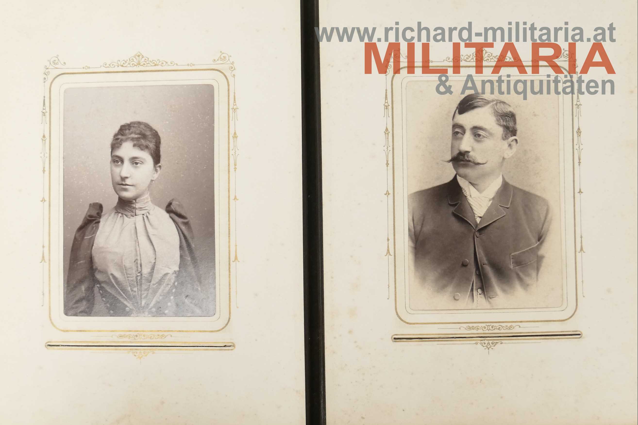 Prunkfamilienalbum - k.u.k. Generalkonsul 1. Klasse Richard Hickel; grüner dicker Samteinband mit Messingbeschlägen; frontseitig am Einband eine Auflage mit dem Monogramm "RH" (Richard Hickel); alle Seiten mit Goldschnitt; insgesamt 39 Hartkartonfotos; darunter ein Foto eines hohen Marine-Beamten mit Comtur des Gregorius-Orden; Orden der Eisernen Krone 3. Klasse; Franz-Joseph-Orden-Ritterkreuz, ... und Marine-Säbel; zwei weitere Hartkartonfotos einer hochdekorierten Persönlichkeit - vermutlich ebenfalls aus der Familie; abgebildet unter anderem mit einem kaiserlich österreichischen Leopold-Orden Ritterkreuz und einen Franz Josef-Orden Komtur sowie Comtur des Takovo-Orden; beiliegend ein Schreiben über die Rückstellung des Ordens der Eisernen Krone 3. Klasse vom 20. April 1911; am 22. Jänner 1911 wurde Generalkonsul Hickel mit gleichzeitiger Verleihung des Ordens der Eisernen Krone 2. Klasse in den bleibenden Ruhestand versetzt;