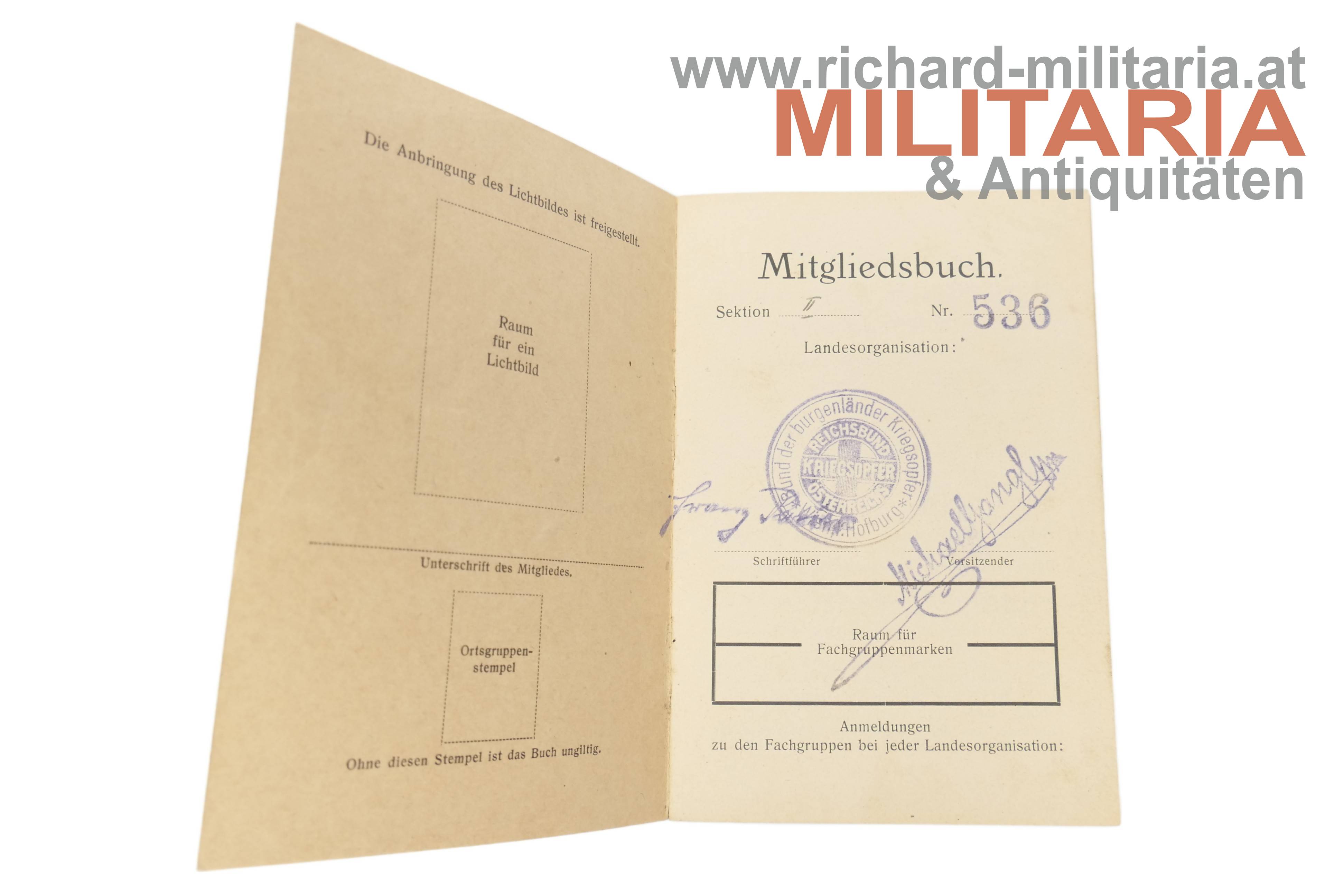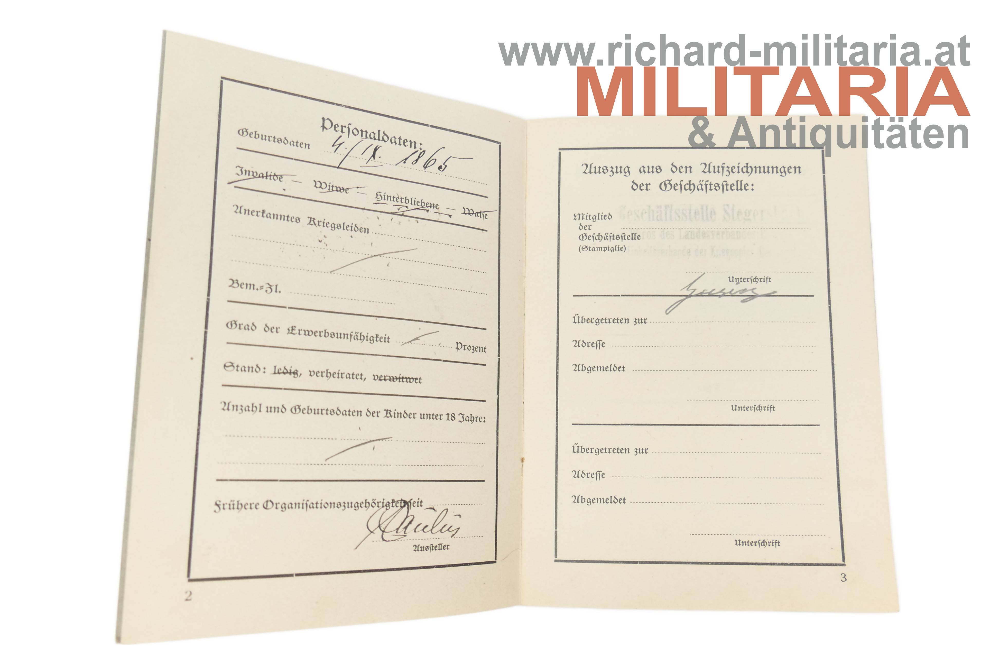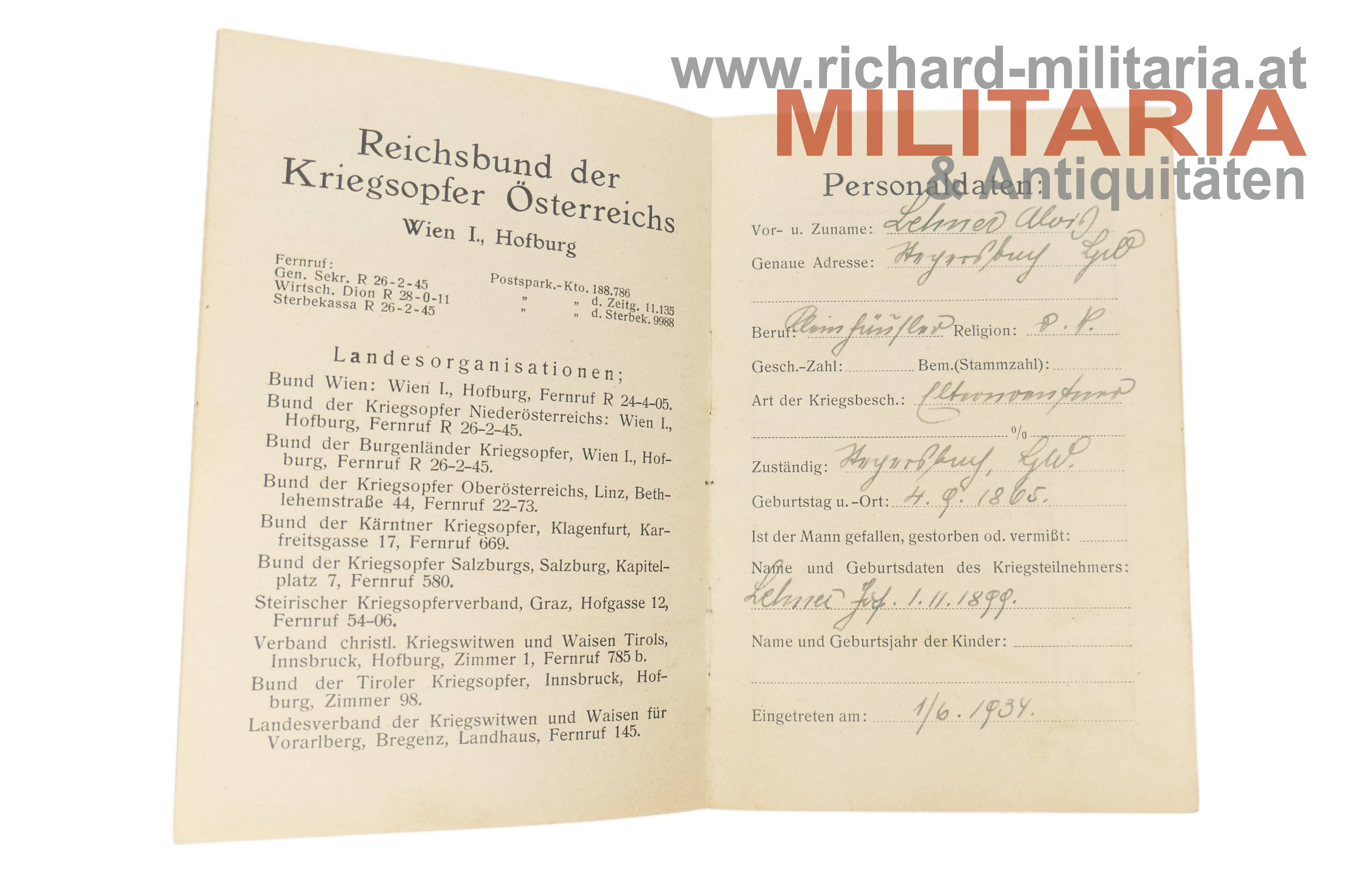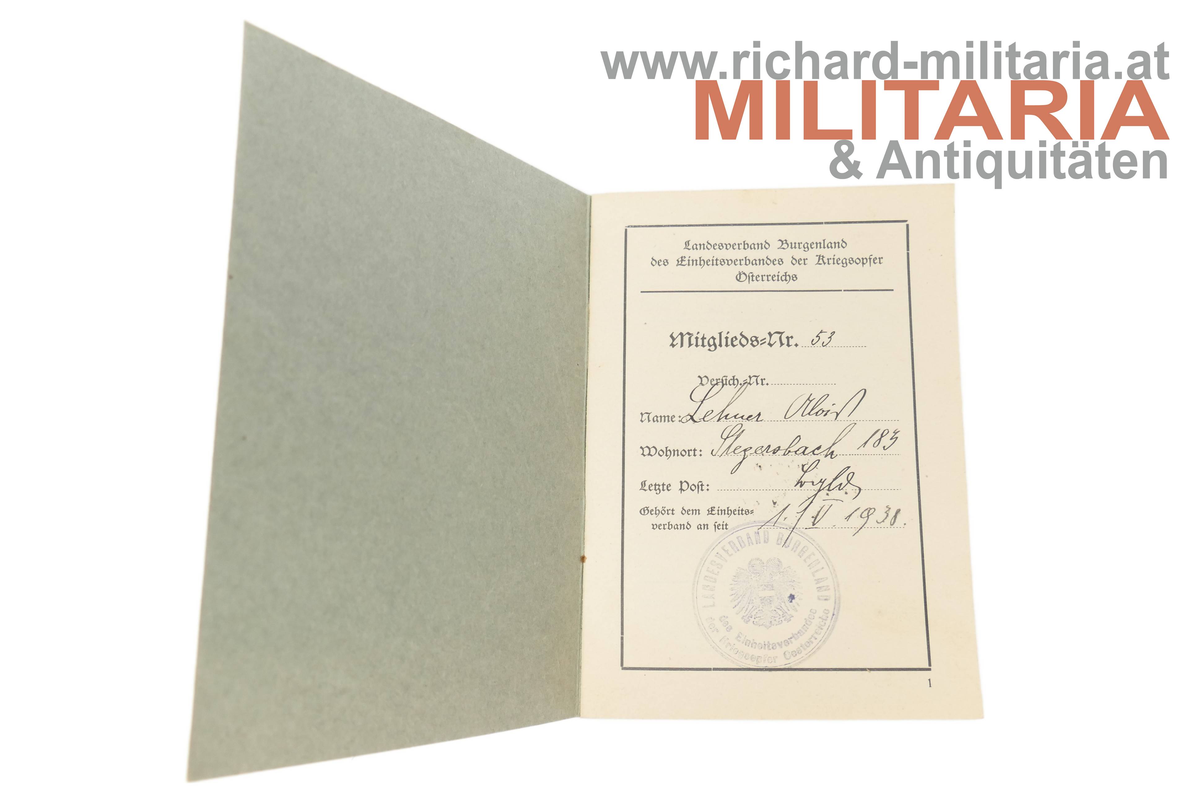 - Mitgliedsbuch Landesverband BURGENLAND des Einheitsverbandes der Kriegsopfer Österreichs; Nr. 53; für Alois Lechner; 1.5.1938
