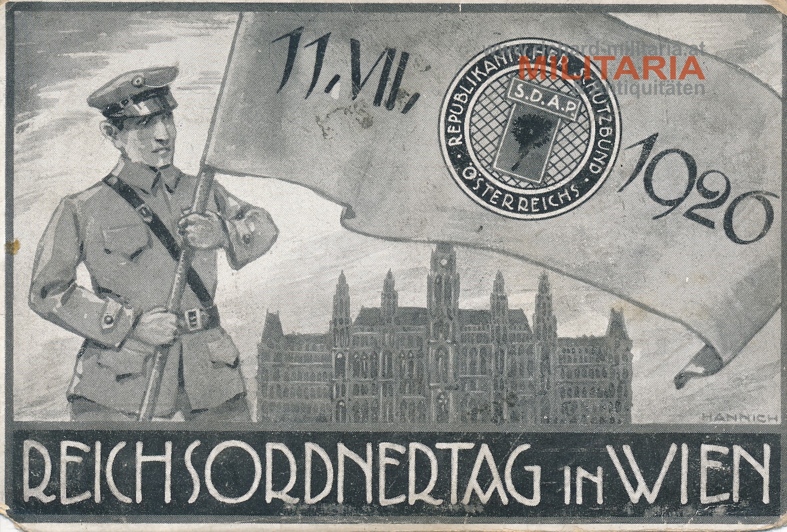 Postkarte "Reichsordnertag in Wien"; Republikanischer Schutzbund Österreich 1920; Rückseite beschriftet; kleine Eck- und Randschäden