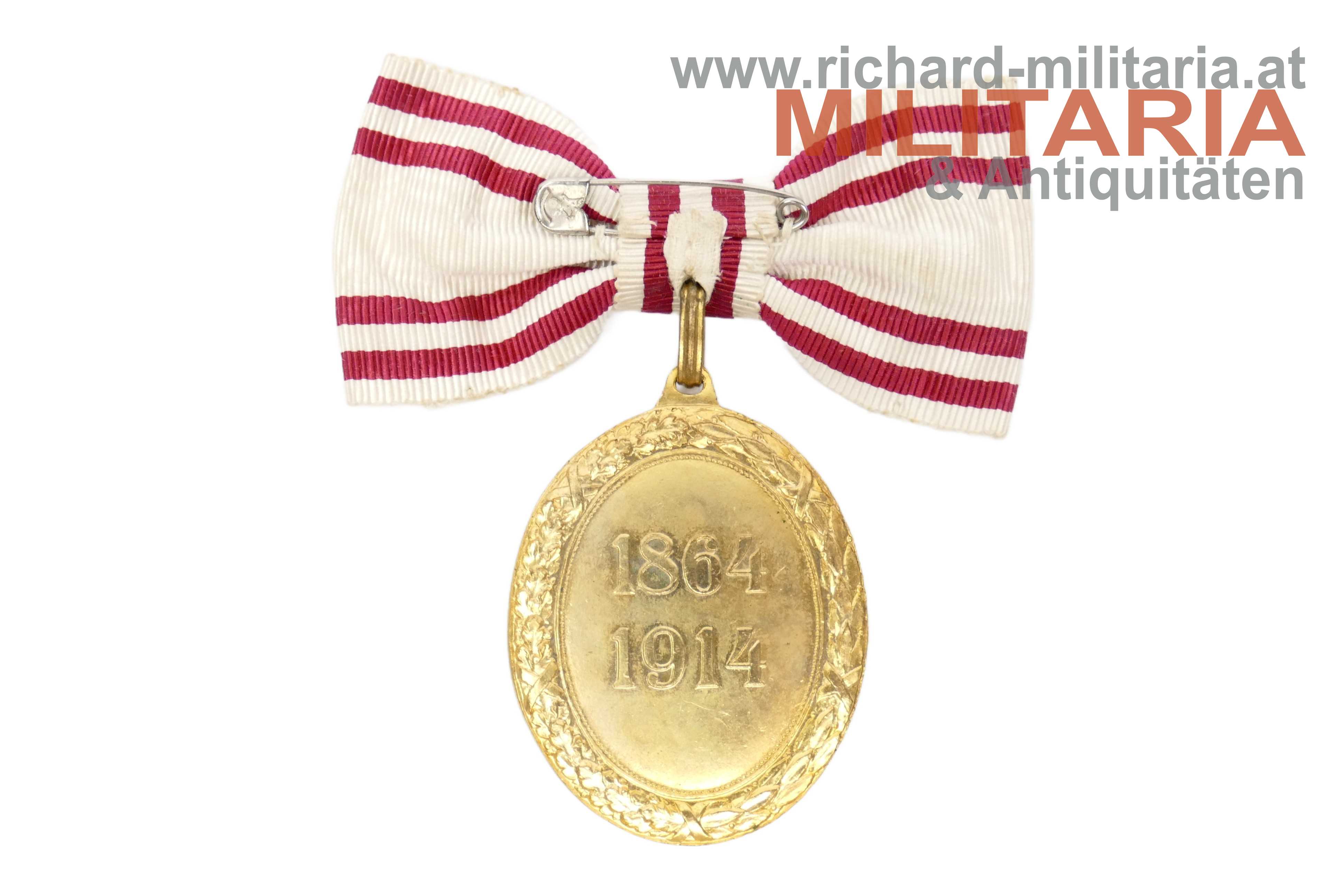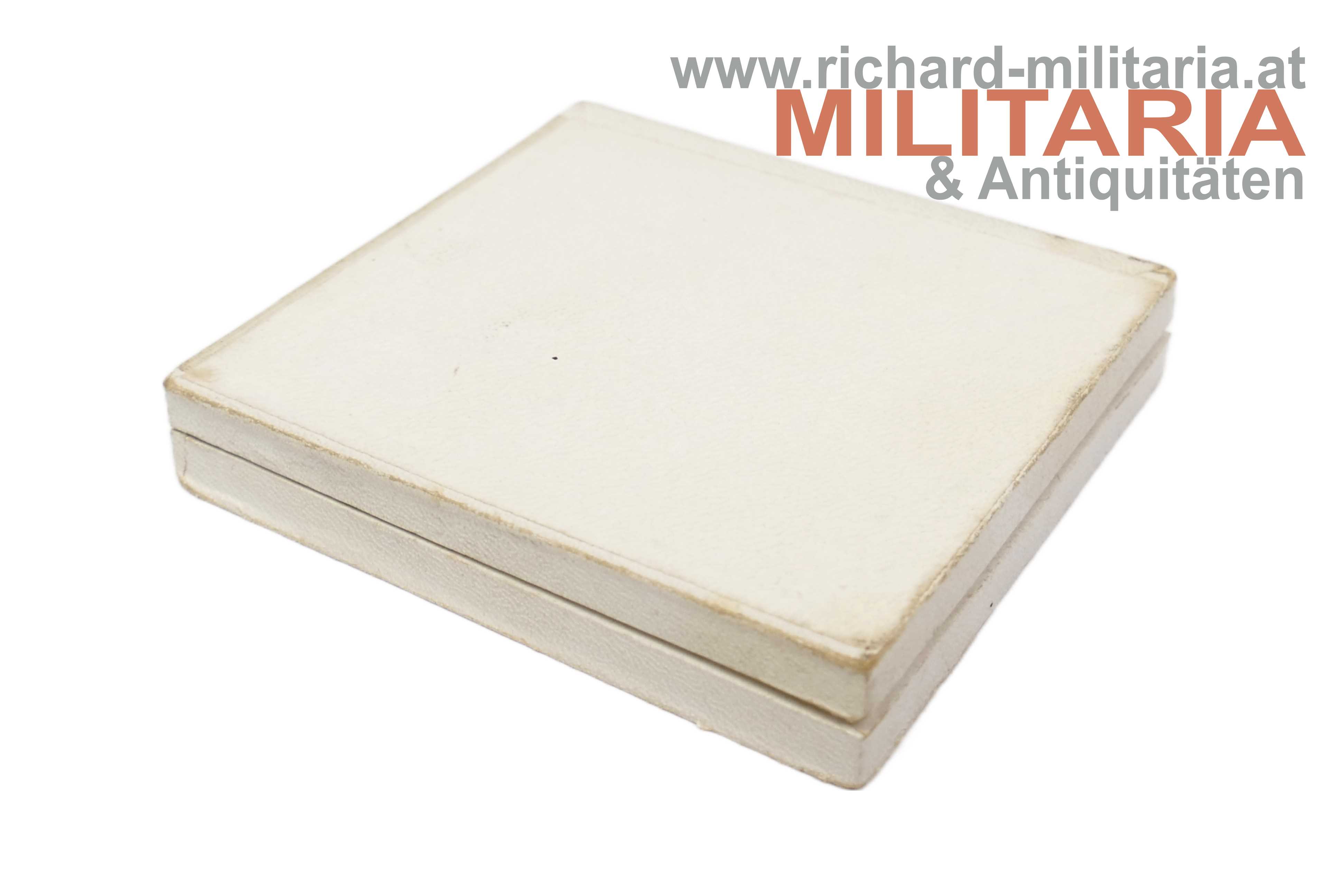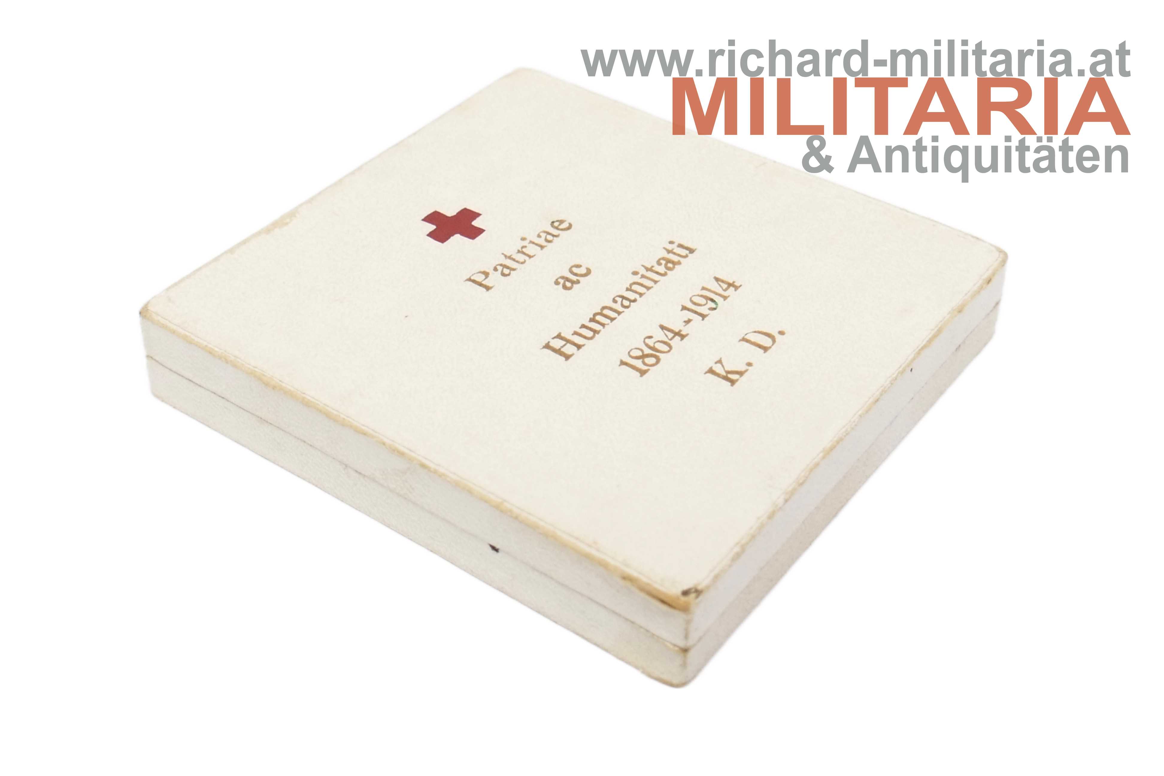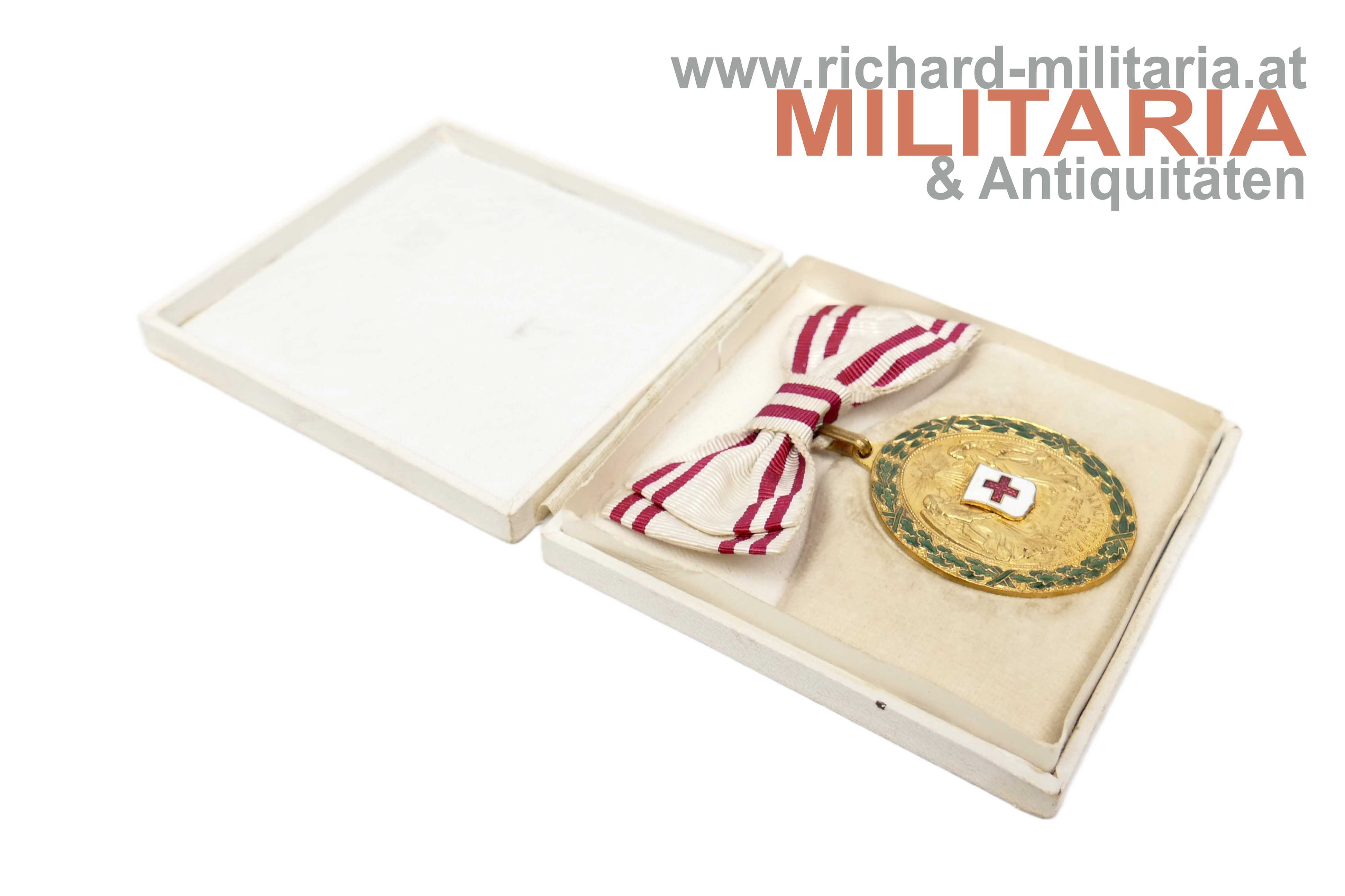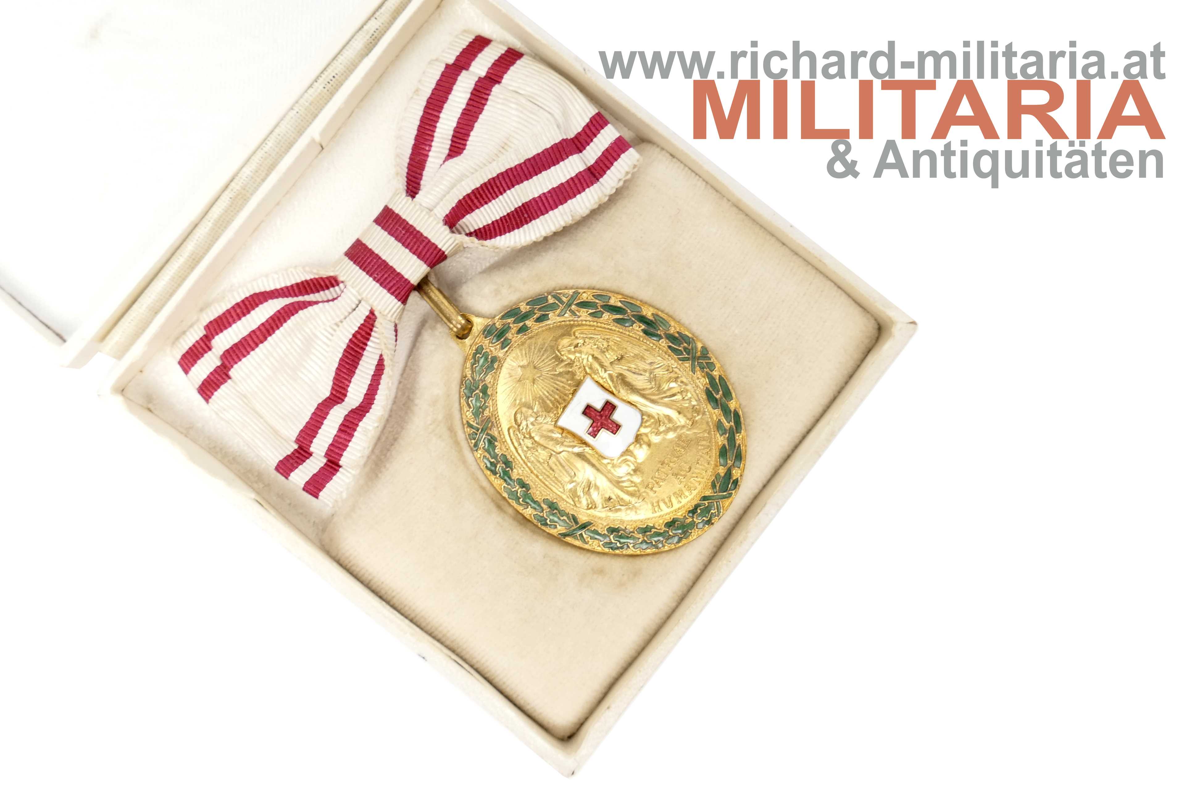 Rotes Kreuz - Bronzene Ehrenmedaille mit Kriegsdekoration und Damenmasche mit Etui; Bronze feuervergoldet; Emaillierung sehr gut erhalten; an der originalen Damenmasche; sehr farbfrisch (!); im zugehörigen weißen Etui in guter Erhaltung;