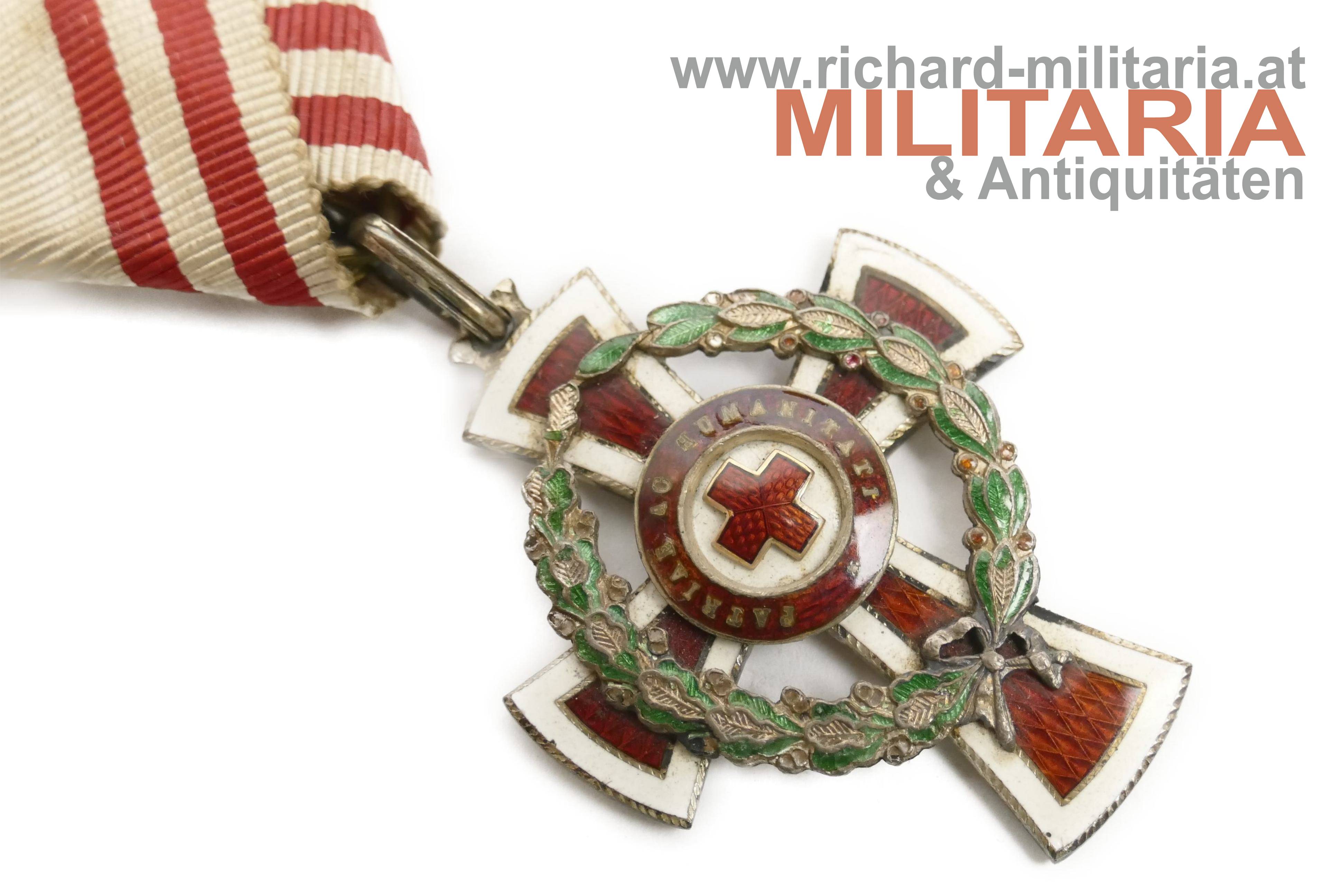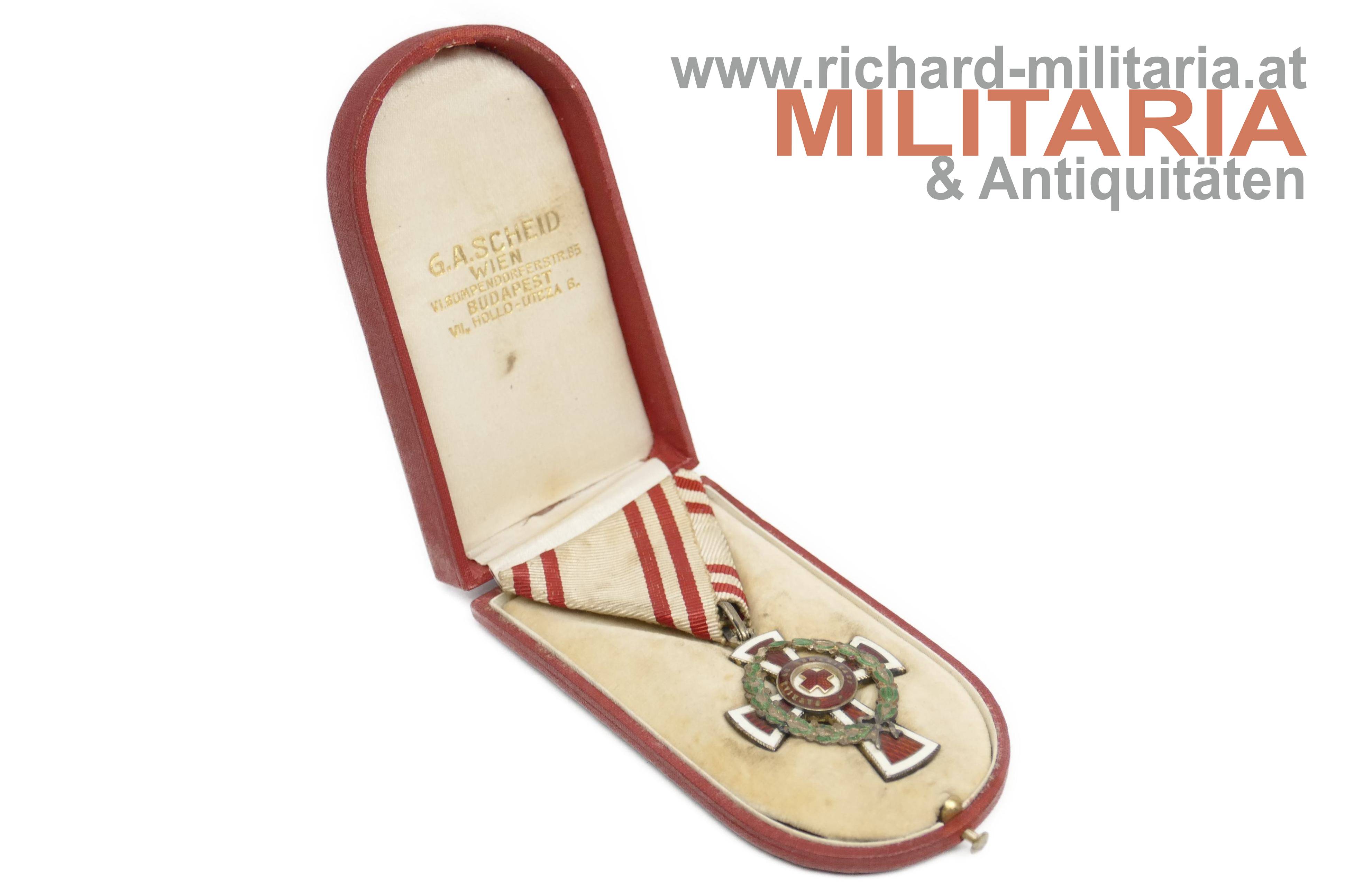 Rotes Kreuz - Ehrenzeichen 2. Klasse mit KD im Etui; Dianakopfpunze und Herstellerpunze "GAS" an der Öse; Emaillierung mit mehreren Beschädigungen; rückseitiges Mittelmedaillon fehlt; am originalen Band; zugehöriges farbfrisches Etui mit silberner Deckelprägung von G. A. Scheid;