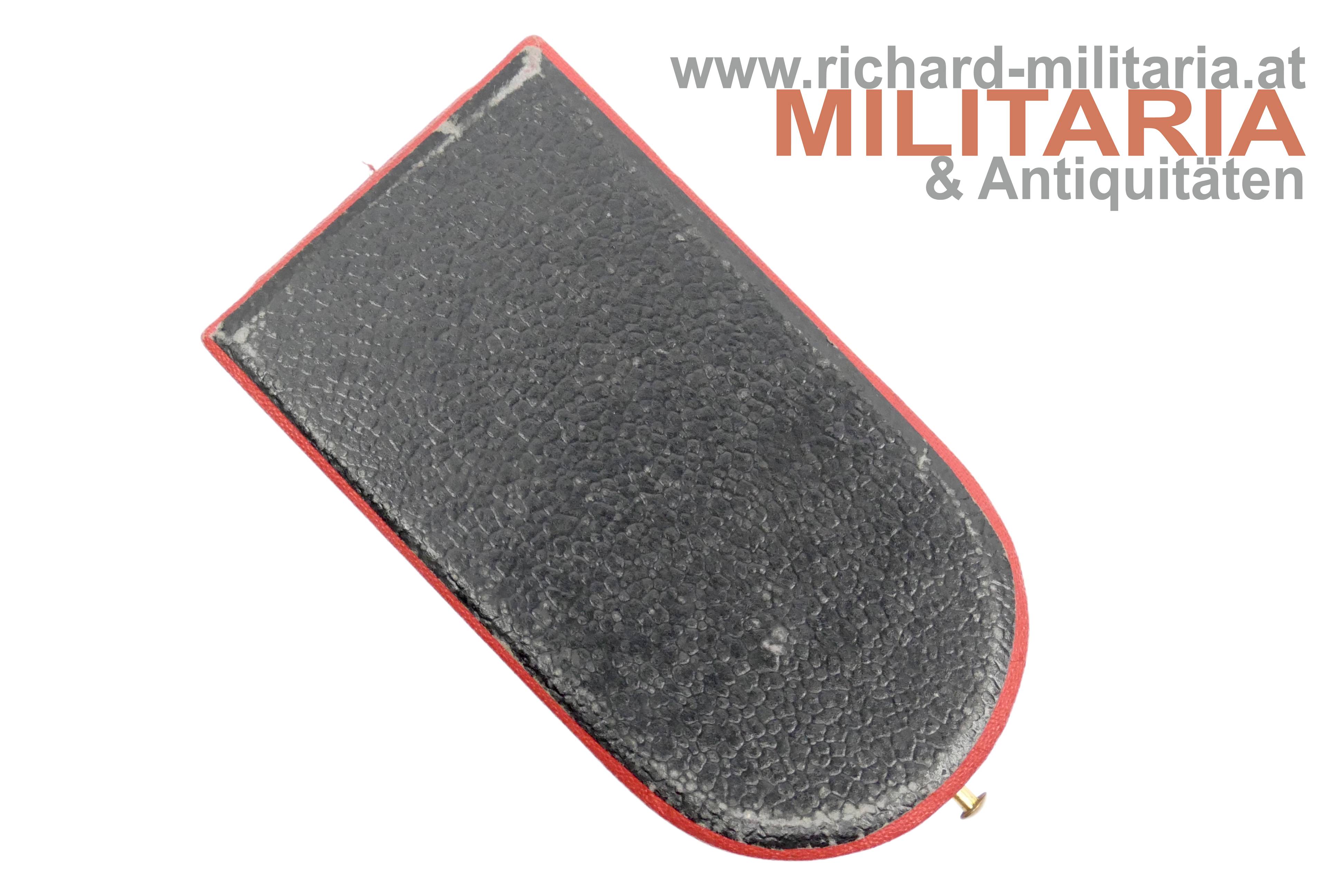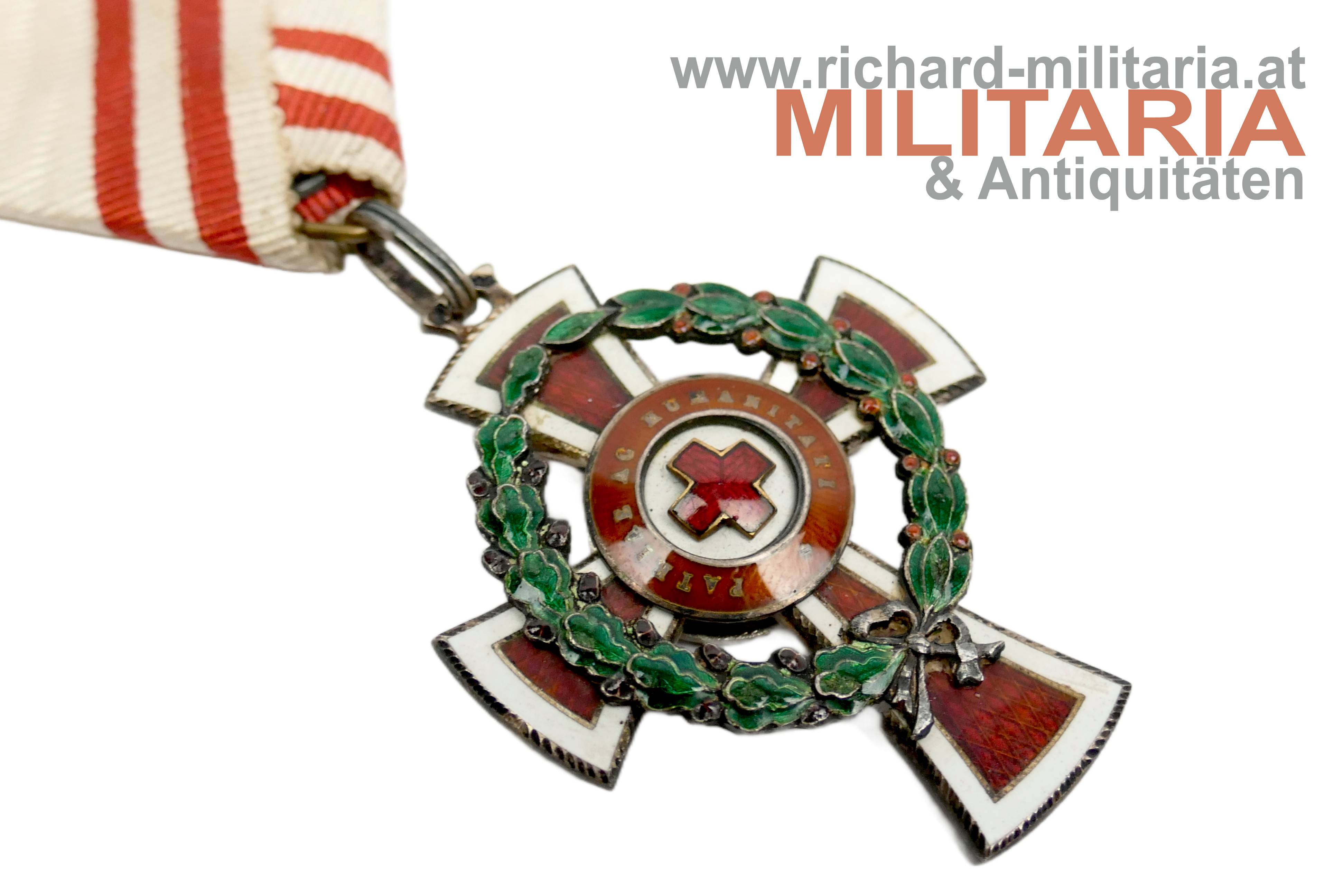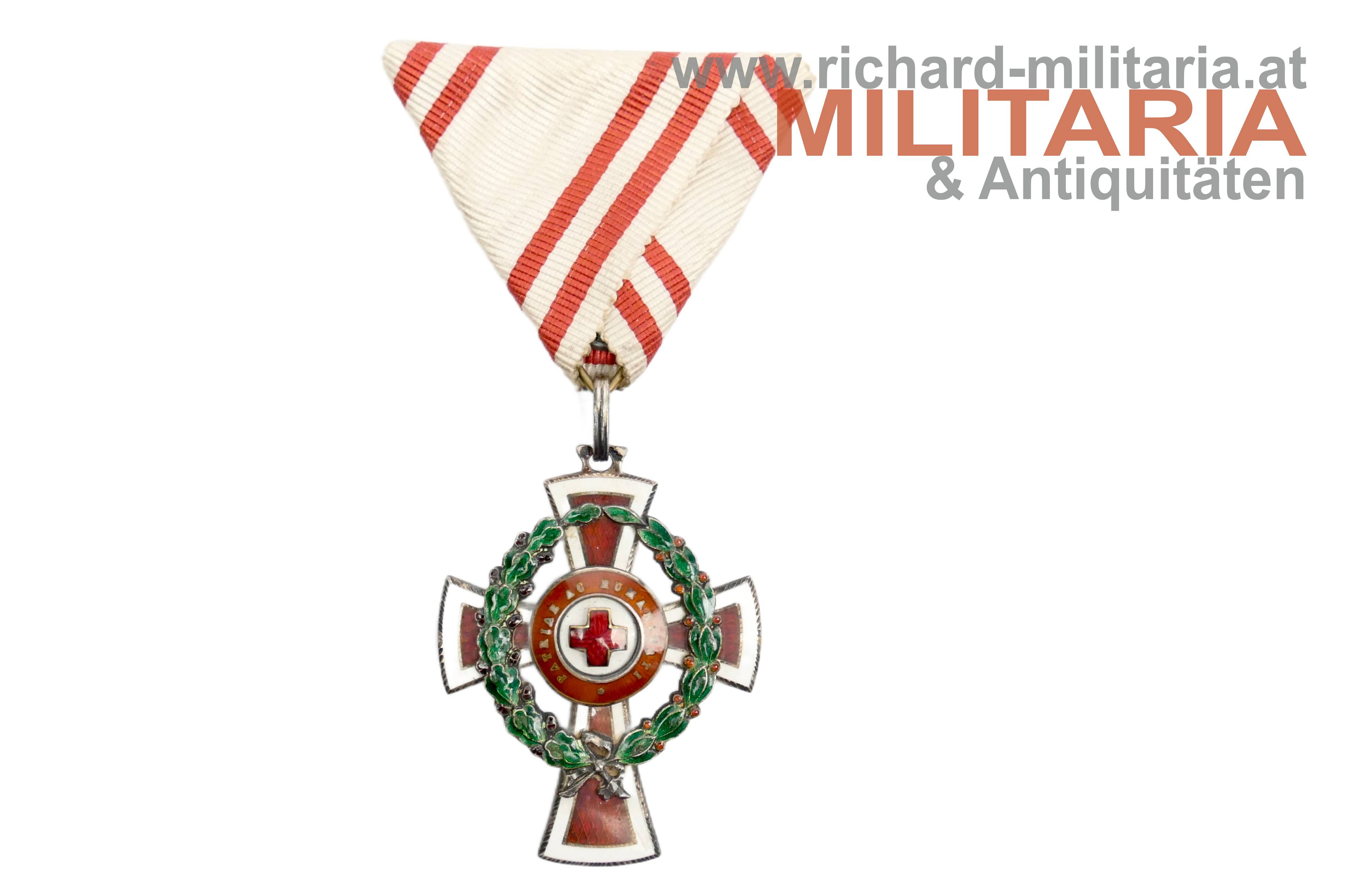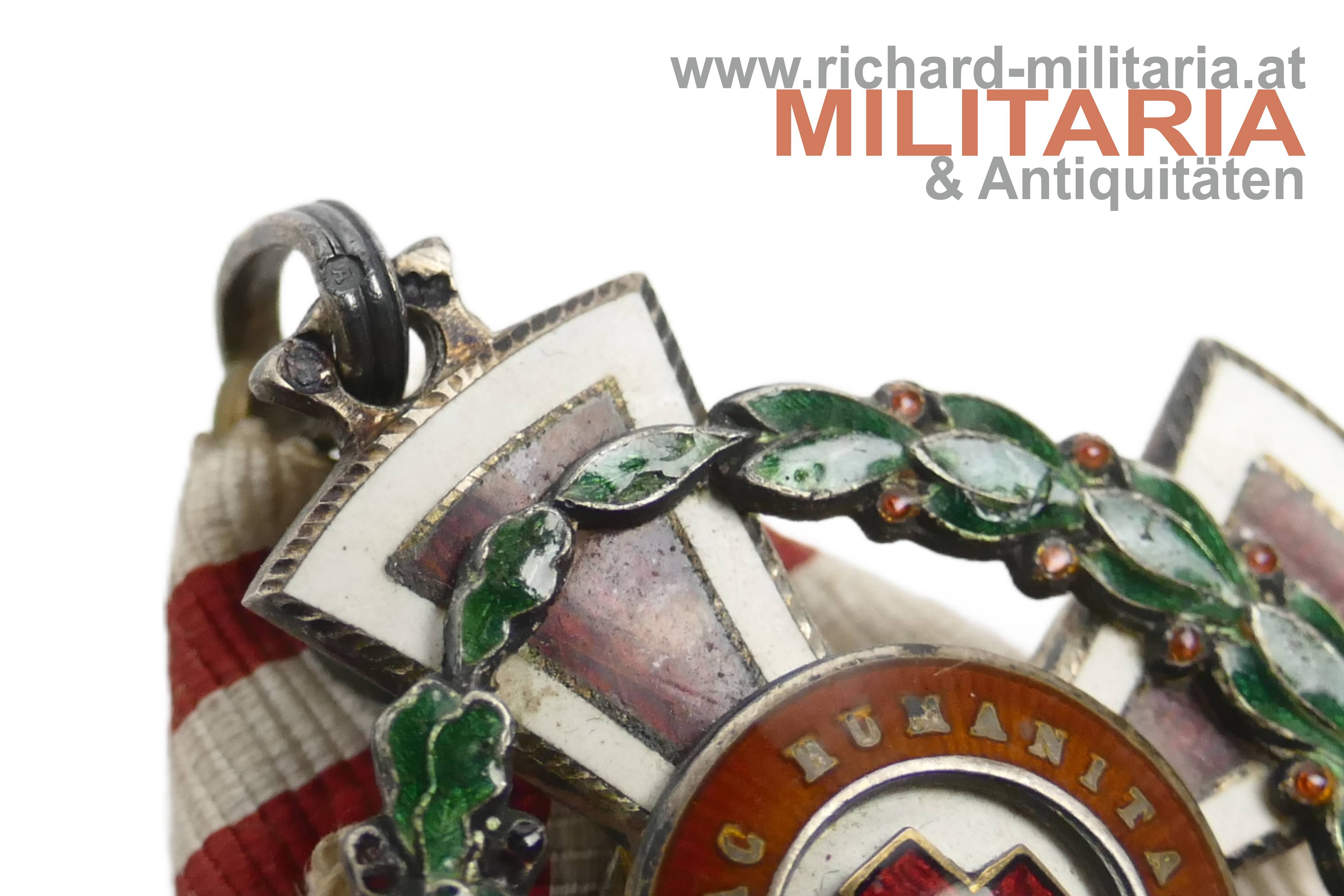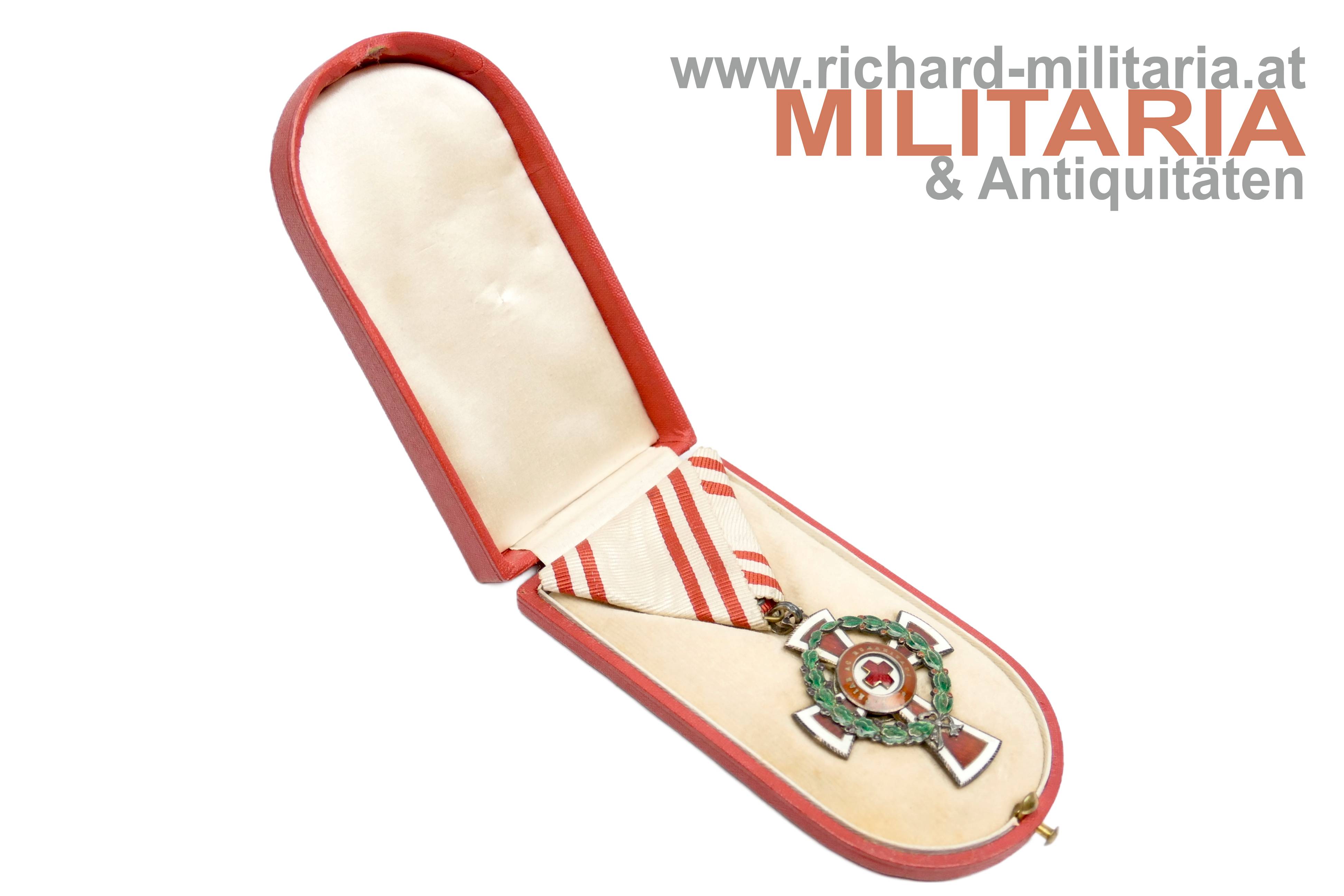 Rotes Kreuz - Ehrenzeichen 2. Klasse mit KD im Etui; Silber und emailliert; "GAS" und Dianakopfpunze an der Öse; Variante mit beidseitiger strahlenförmiger Flinkierung (!) am Mittelmedaillon; revers zwei Emailbeschädigungen; Bandring mit Kontrollamtspunze "A"; am originalen Band; passendes Etui mit farbfrischer silberner Deckelaufschrift; Deckelbezug minimalst aufgezogen;