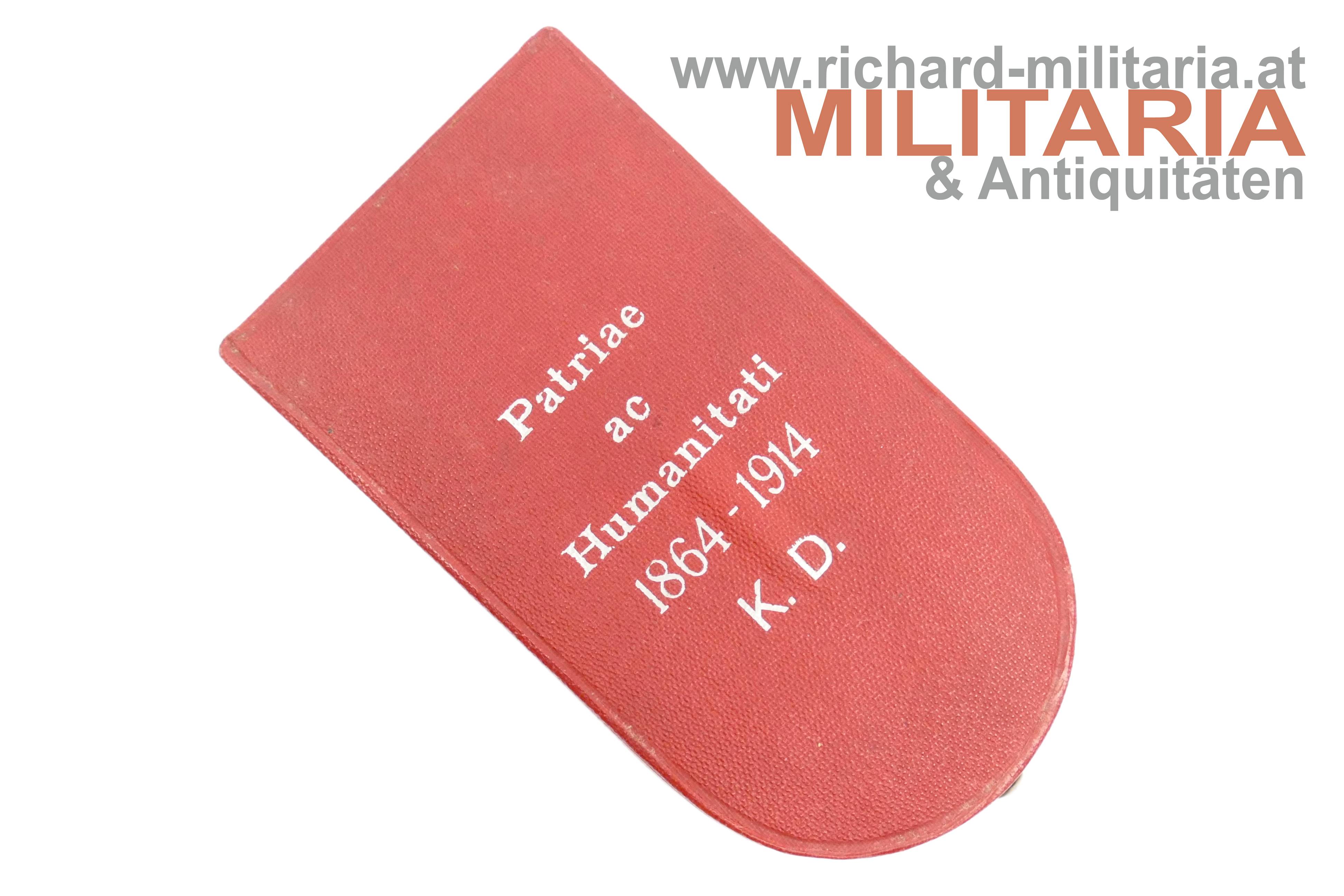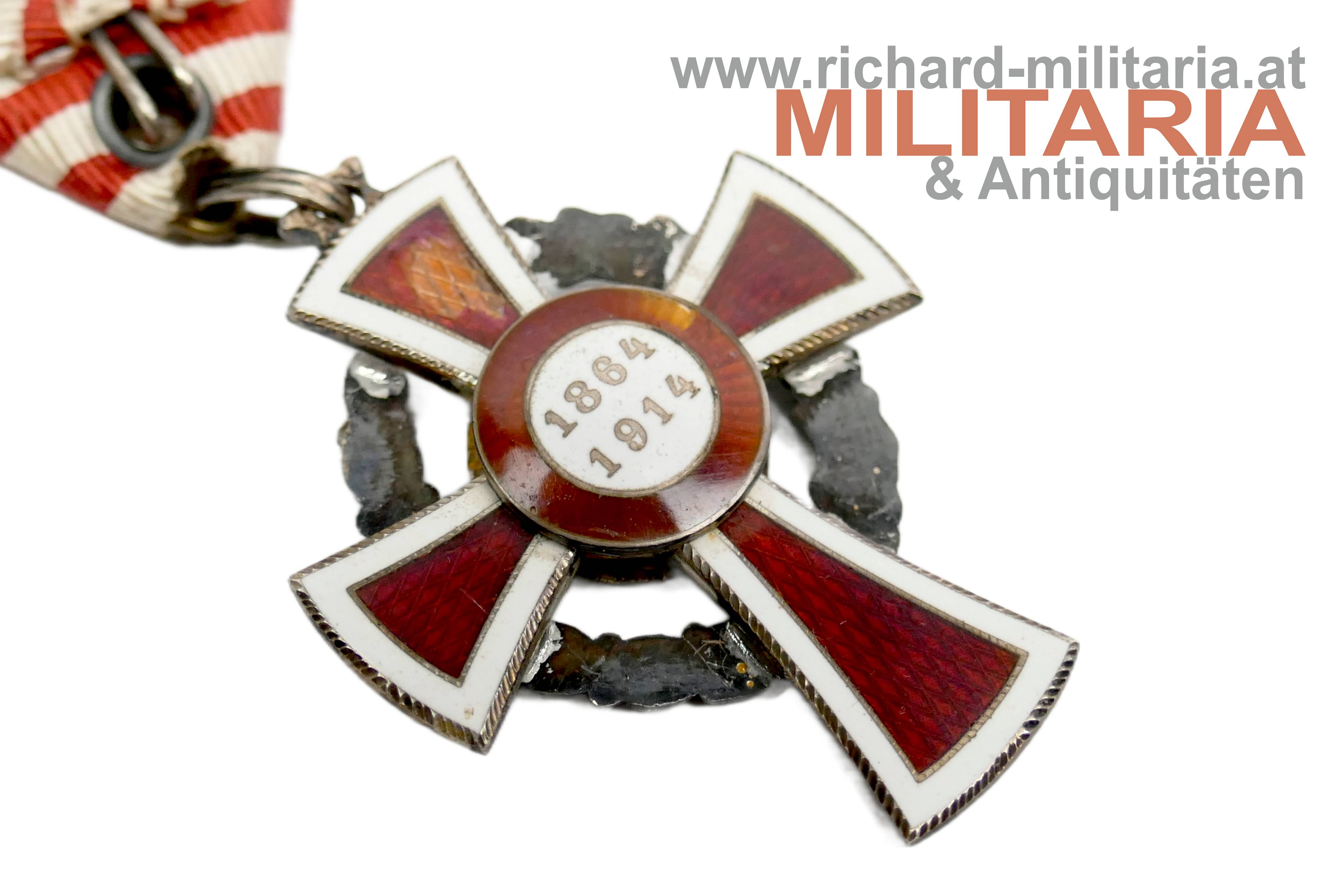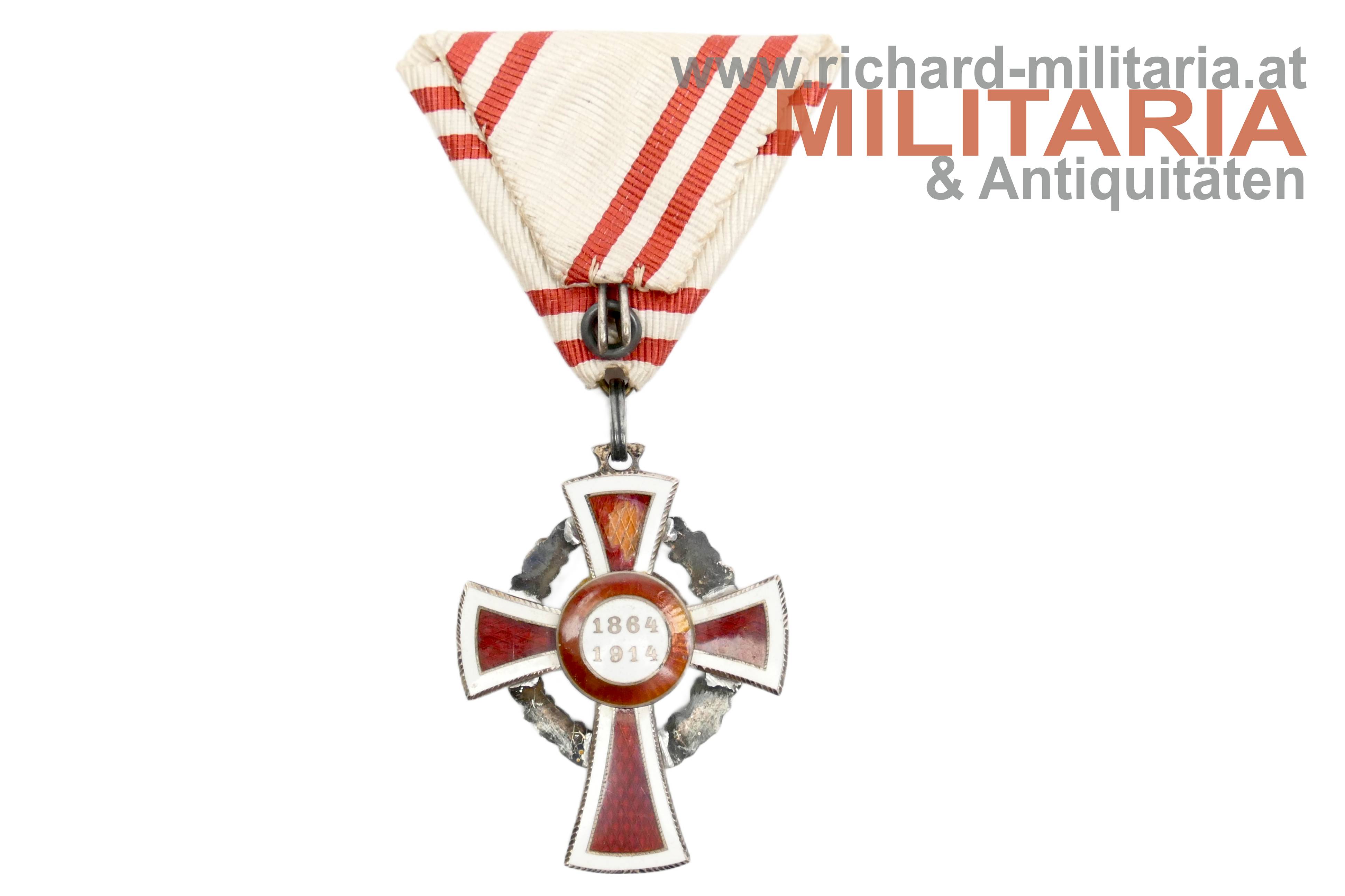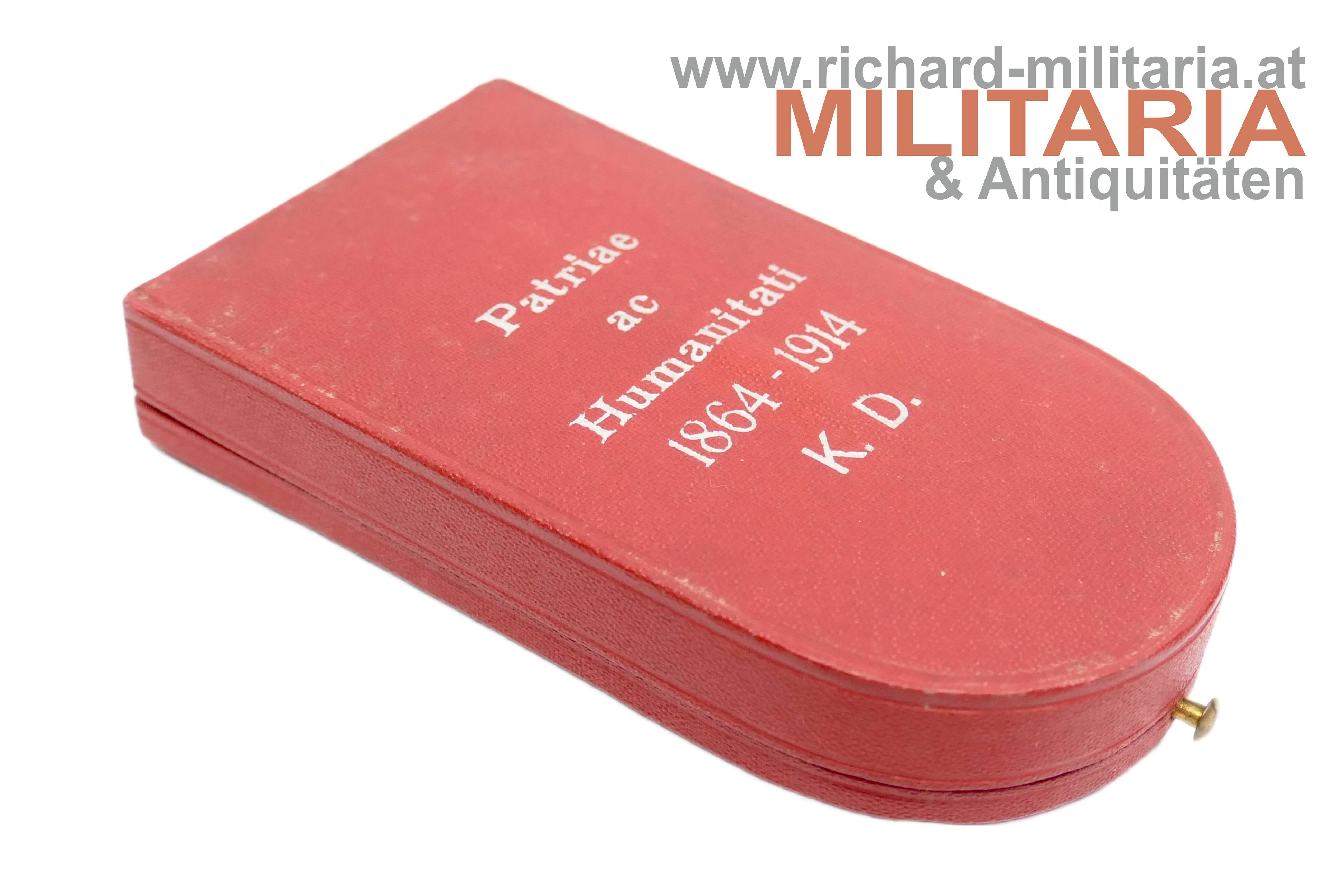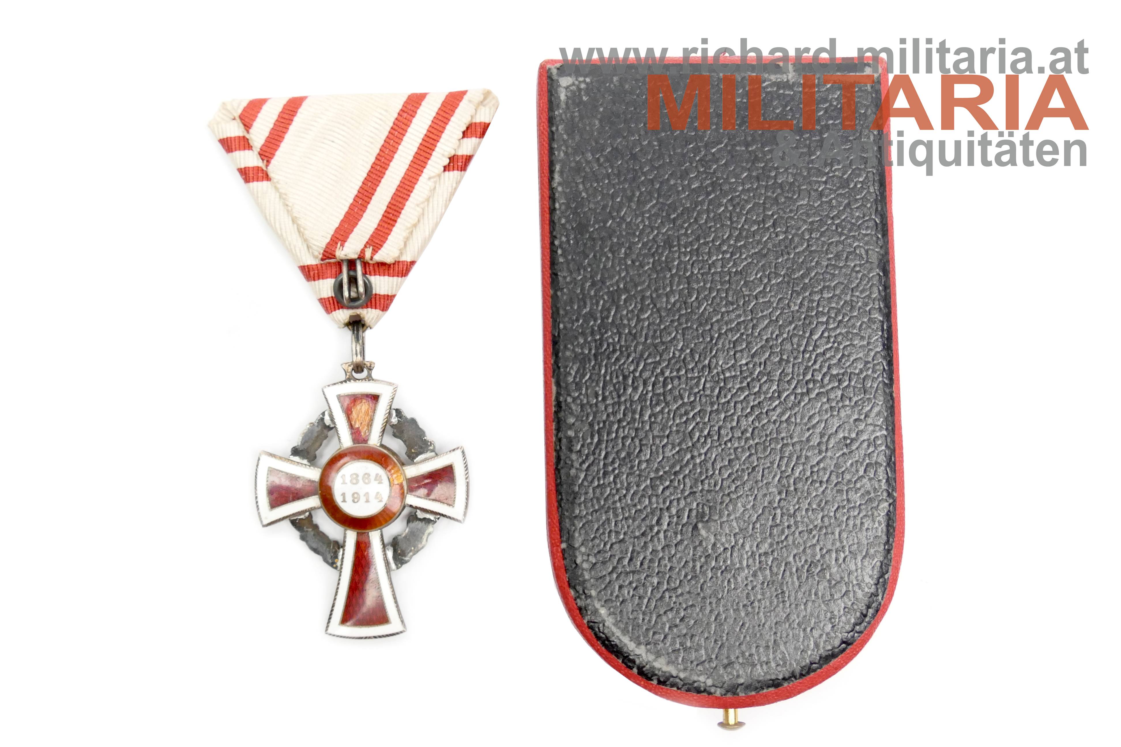 Rotes Kreuz - Ehrenzeichen 2. Klasse mit KD im Etui; Silber und emailliert; "GAS" und Dianakopfpunze an der Öse; Variante mit beidseitiger strahlenförmiger Flinkierung (!) am Mittelmedaillon; revers zwei Emailbeschädigungen; Bandring mit Kontrollamtspunze "A"; am originalen Band; passendes Etui mit farbfrischer silberner Deckelaufschrift; Deckelbezug minimalst aufgezogen;