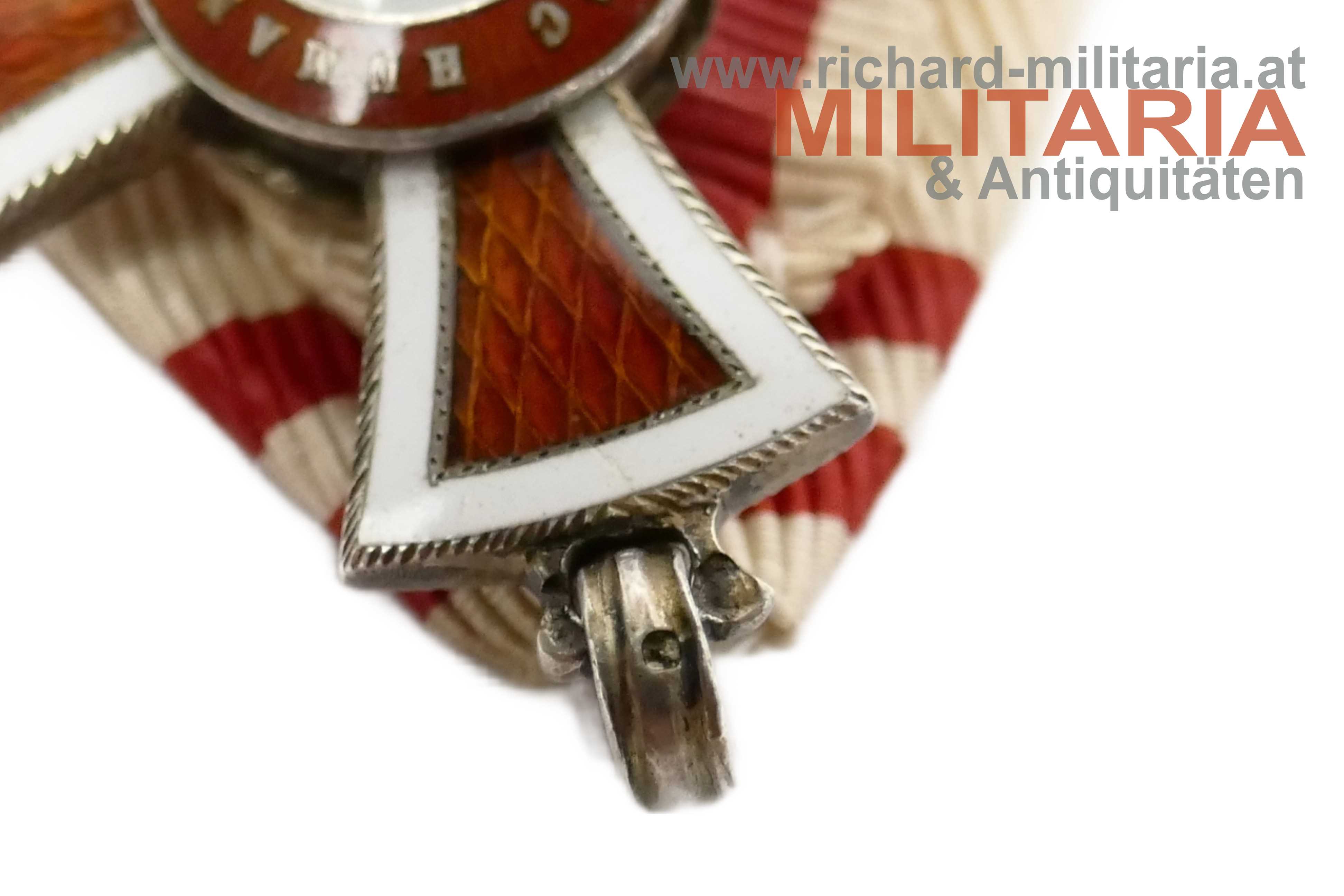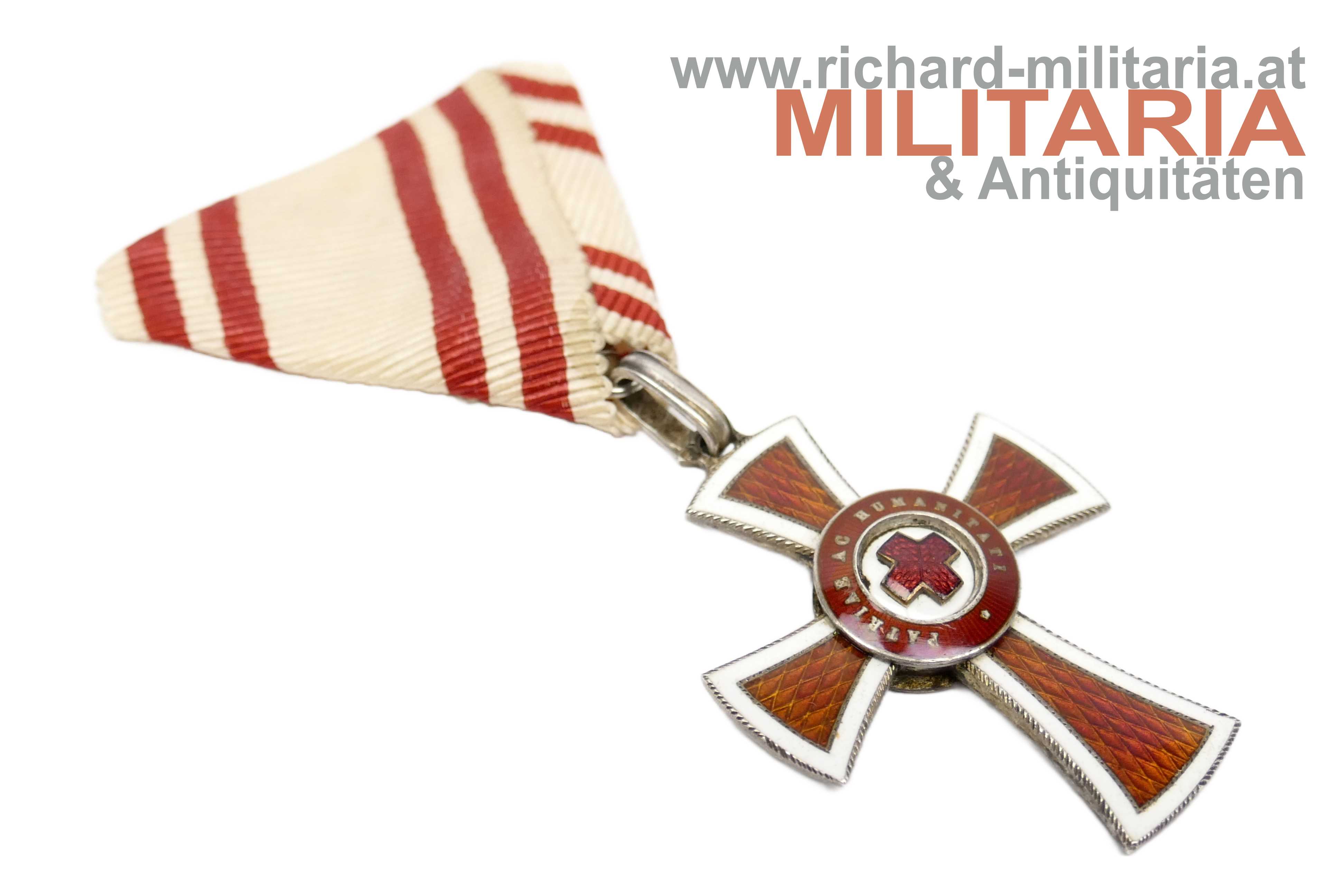 Rotes Kreuz - Ehrenzeichen 2. Klasse ohne Kriegsdekoration; Silber emailliert; Dianakopfpunzierung und undeutliche Herstellerpunzierung an der Öse; Bandring mit Kontrollamtspunzierung "A"; Emaillierung unbeschädigt; am originalen Band;