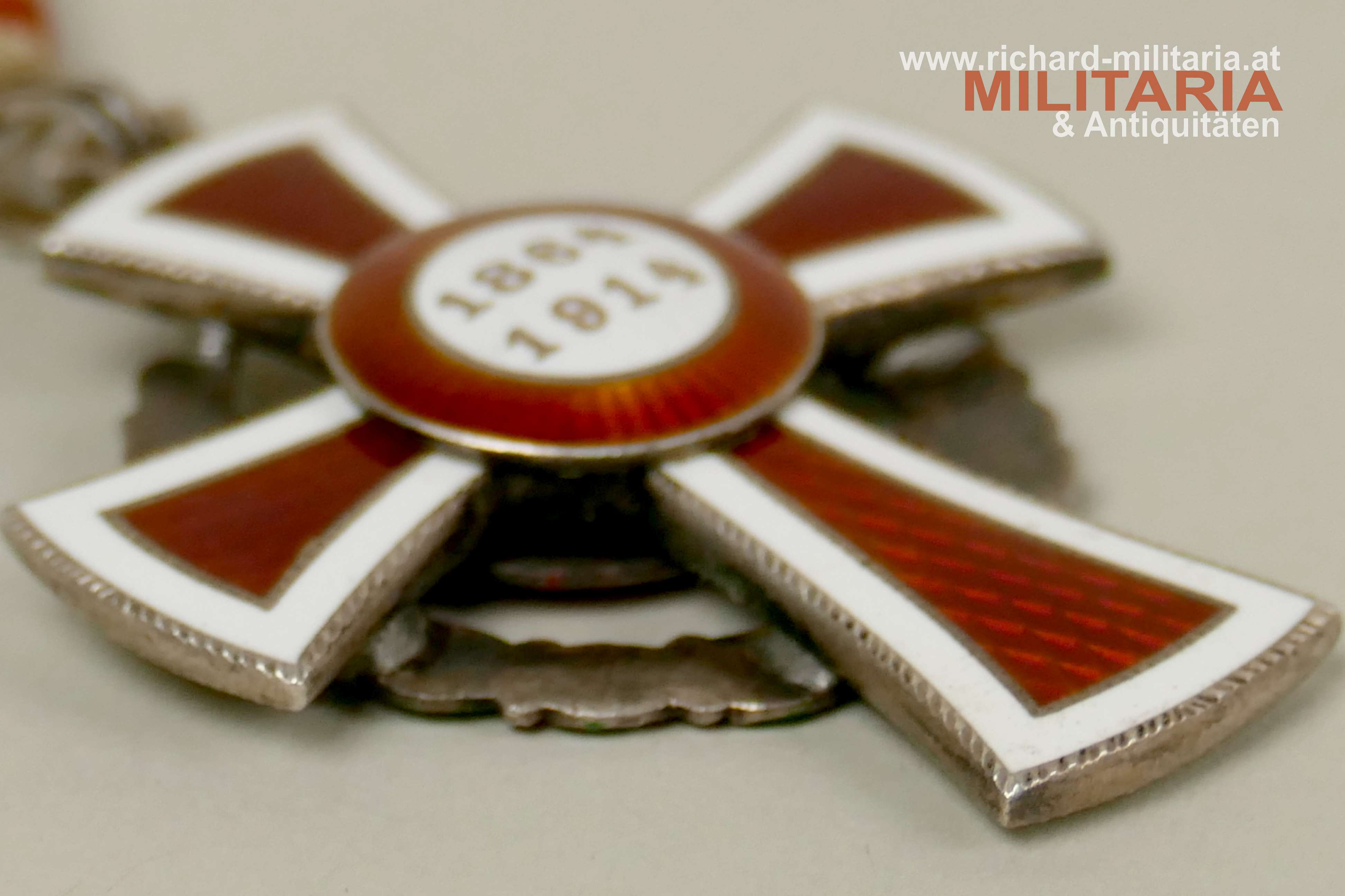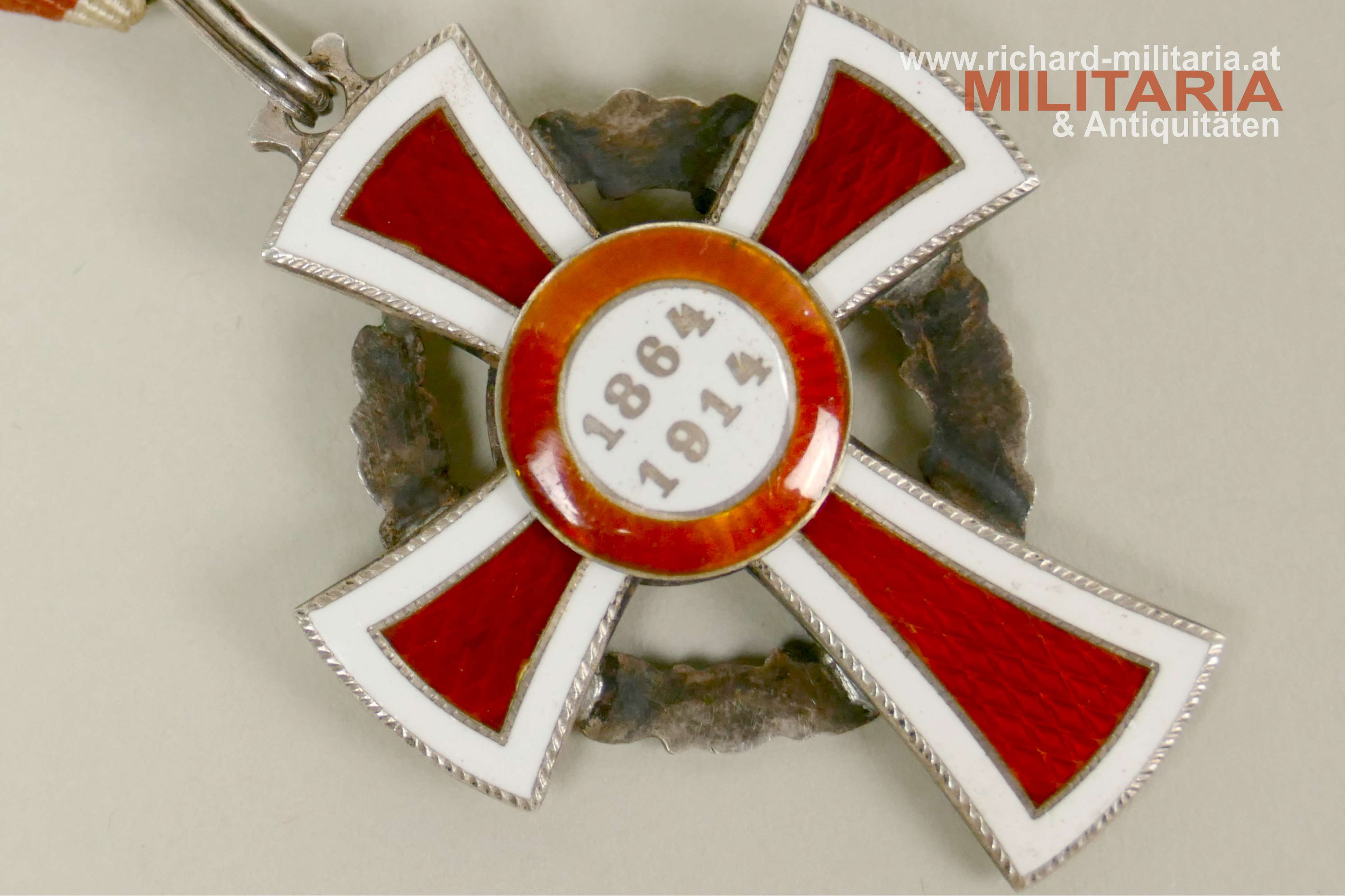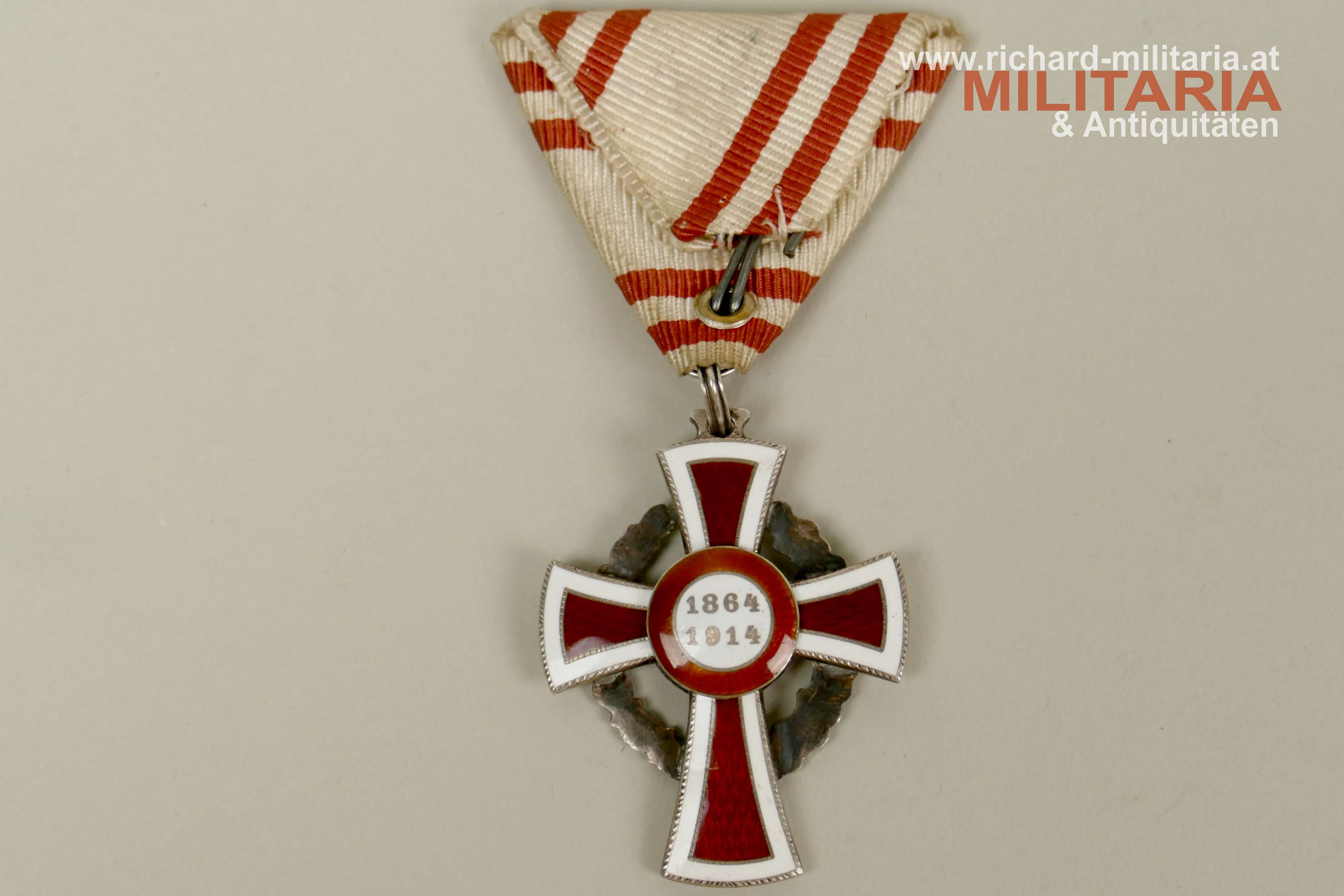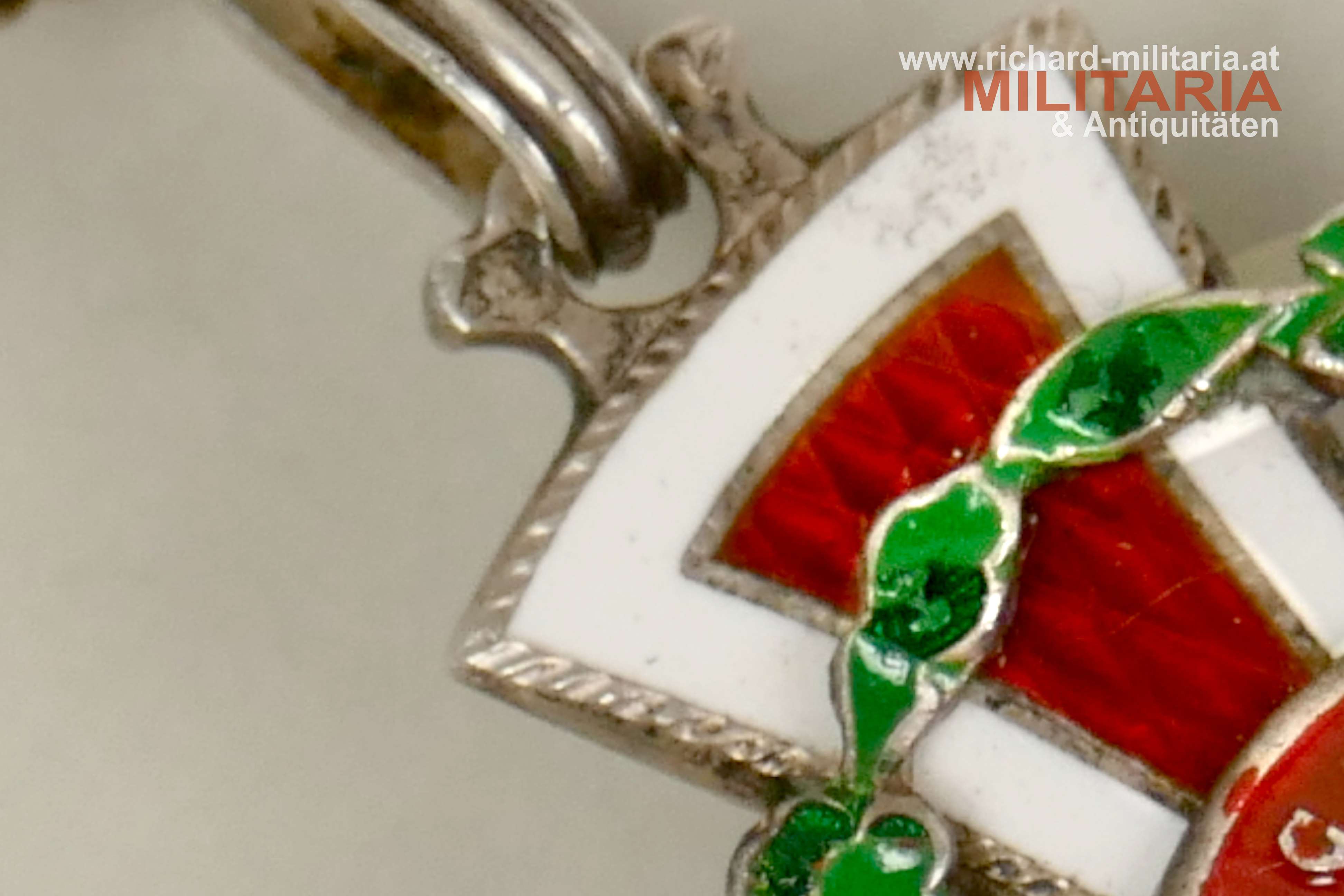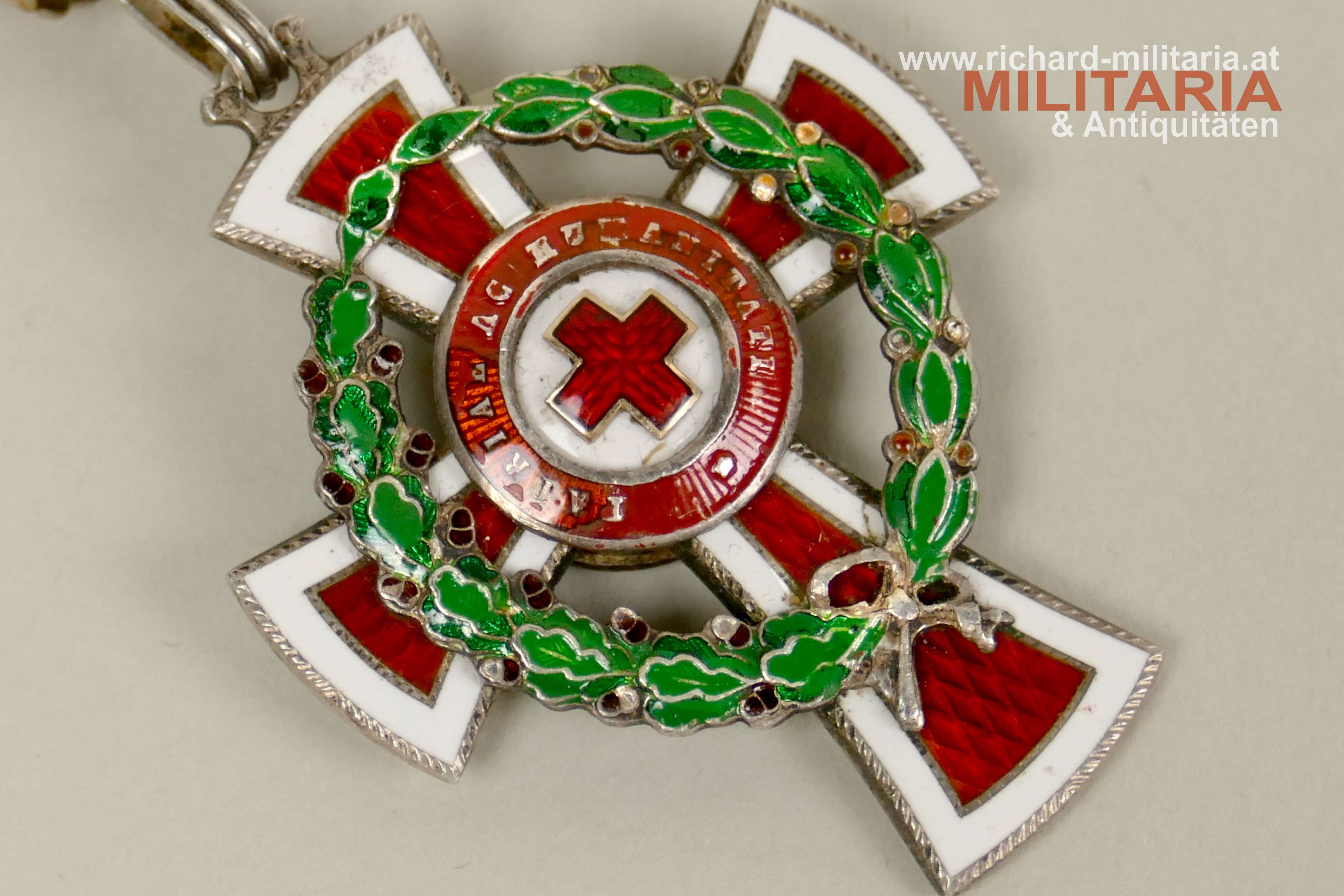 Rotes Kreuz - Ehrenzeichen II. Klasse mit Kriegsdekoration; mit Silberpunzierung und undeutlicher Herstellerpunzierung; am ovalen Bandring eine Kontrollamtspunzierung "A"; Emaillierung der Kriegsdekoration mit kleinen Beschädigungen; Emaillierung am roten Rand des Mittelmedaillons avers stärker beschädigt und restauriert (lackiert); am originalen Band;