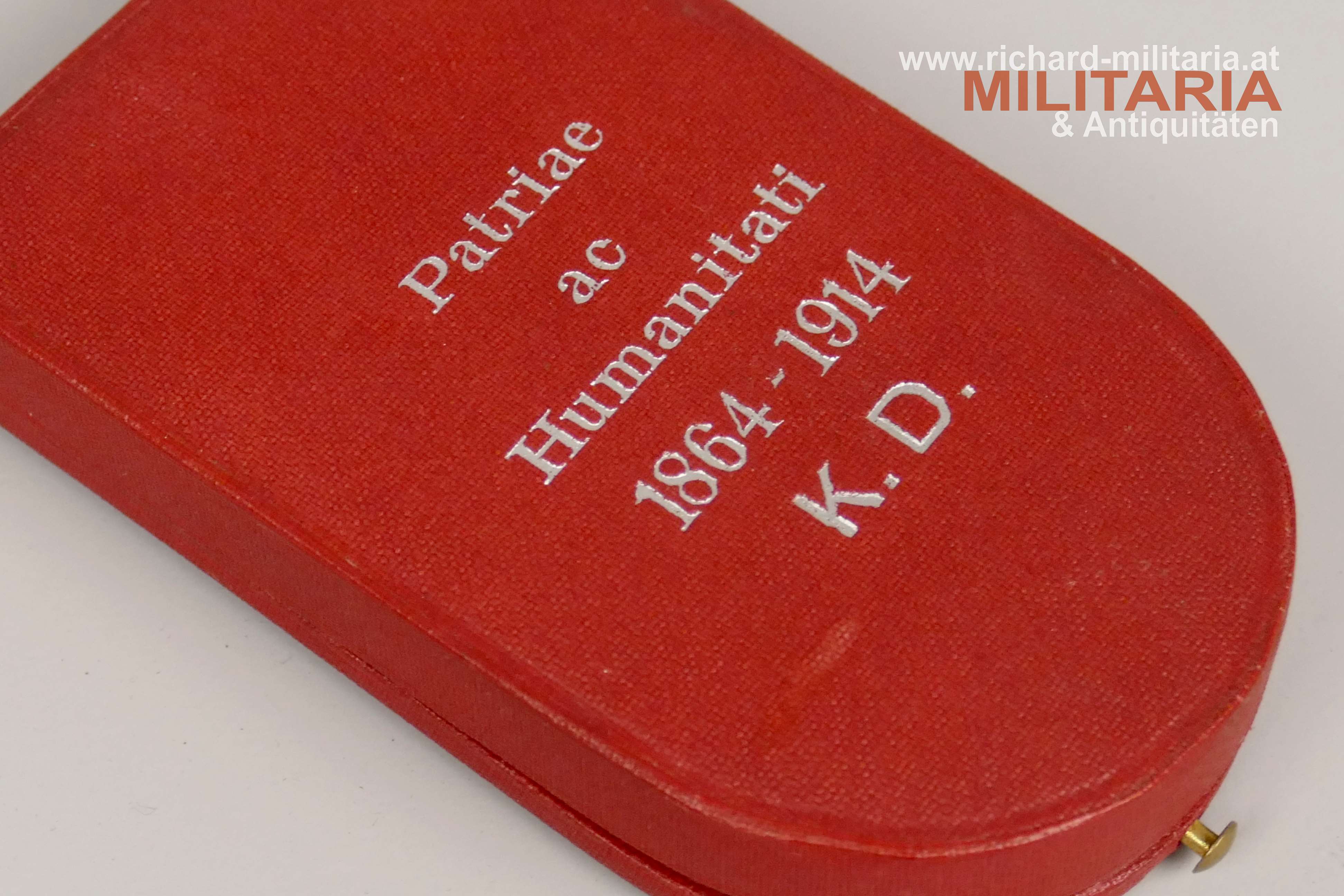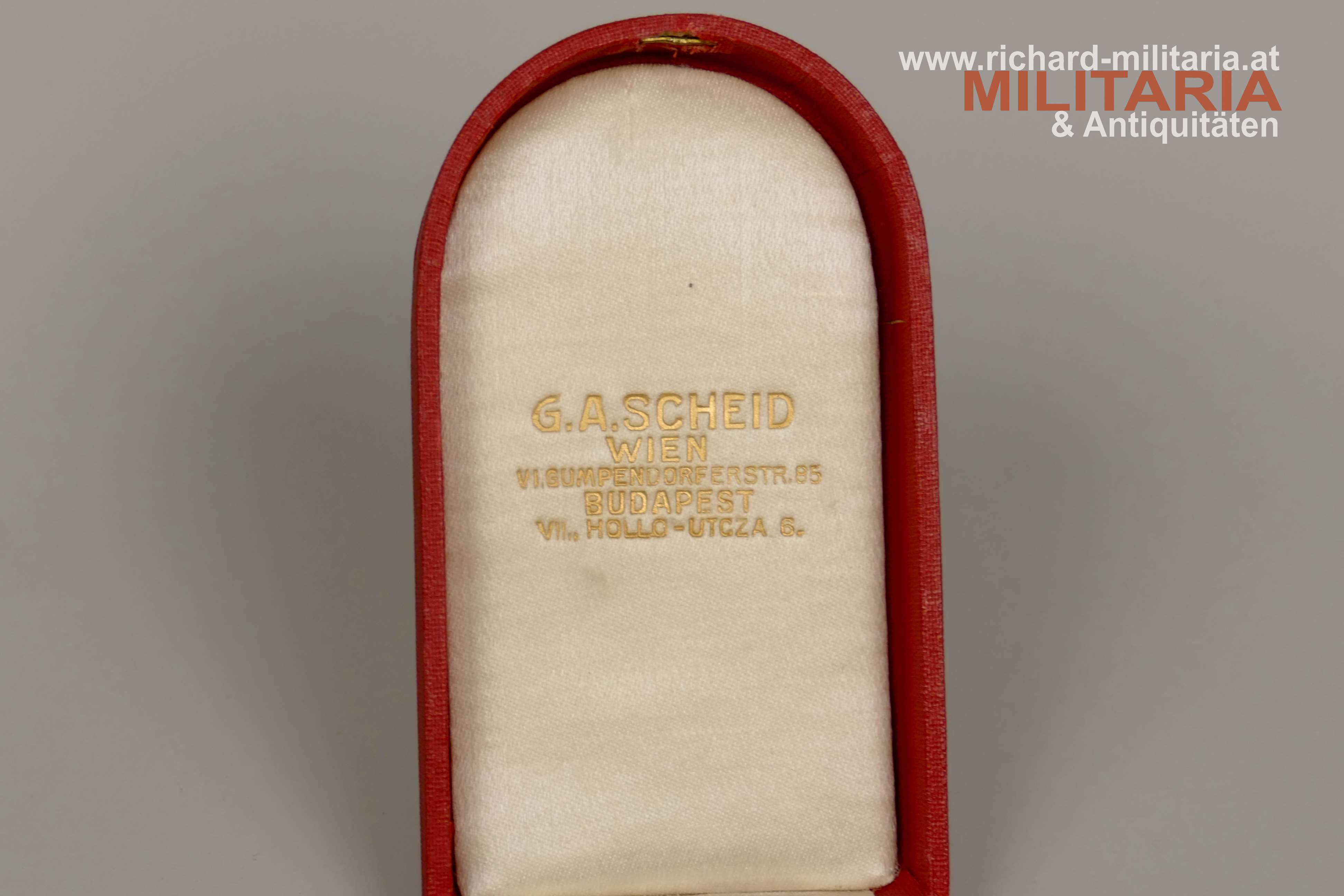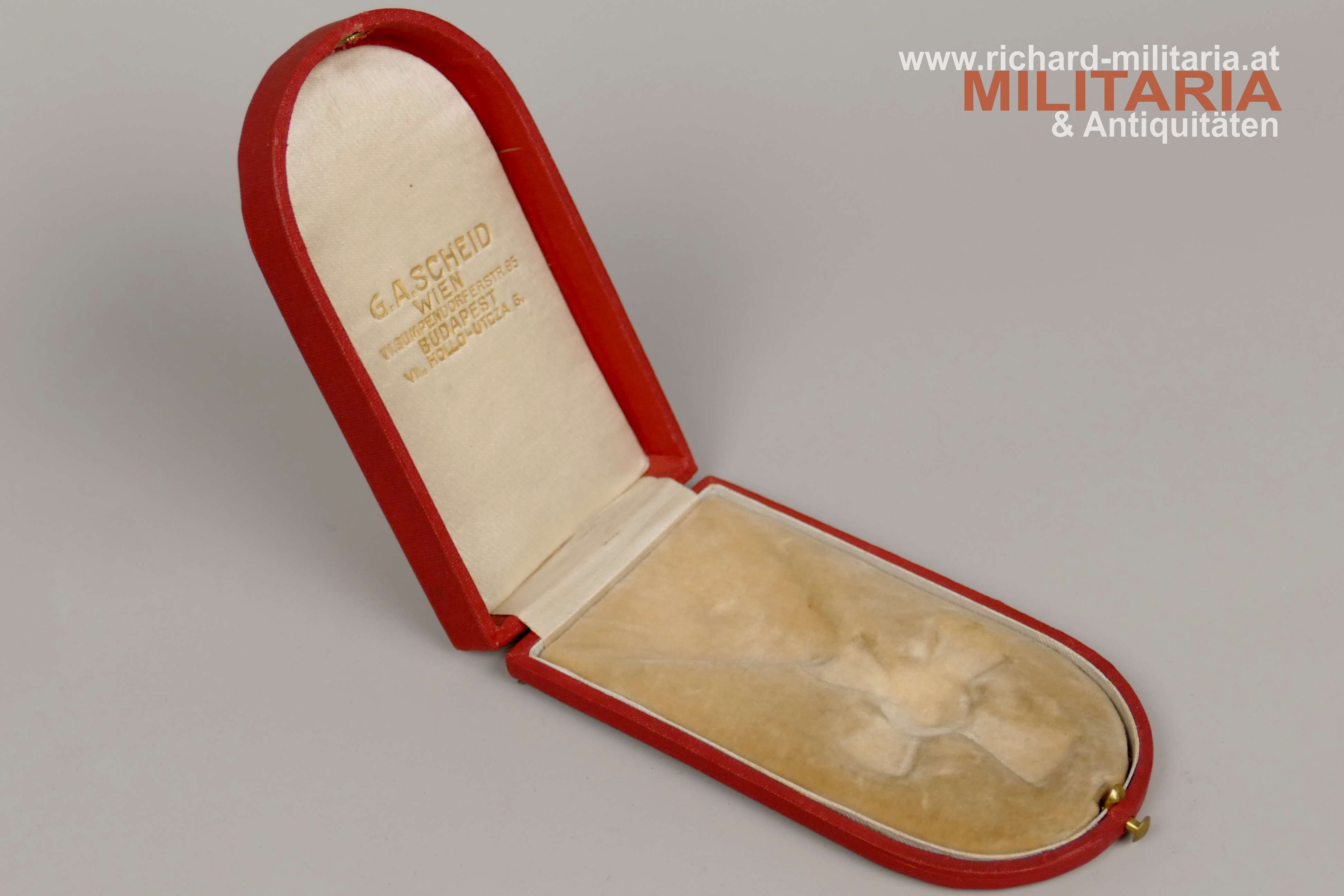 Rotes Kreuz - Etui für das Ehrenzeichen 2. Klasse mit Kriegsdekoration; rotes Etui mit silbernem Deckelaufdruck; innen am Deckel der Hersteller "G.A.Scheid";