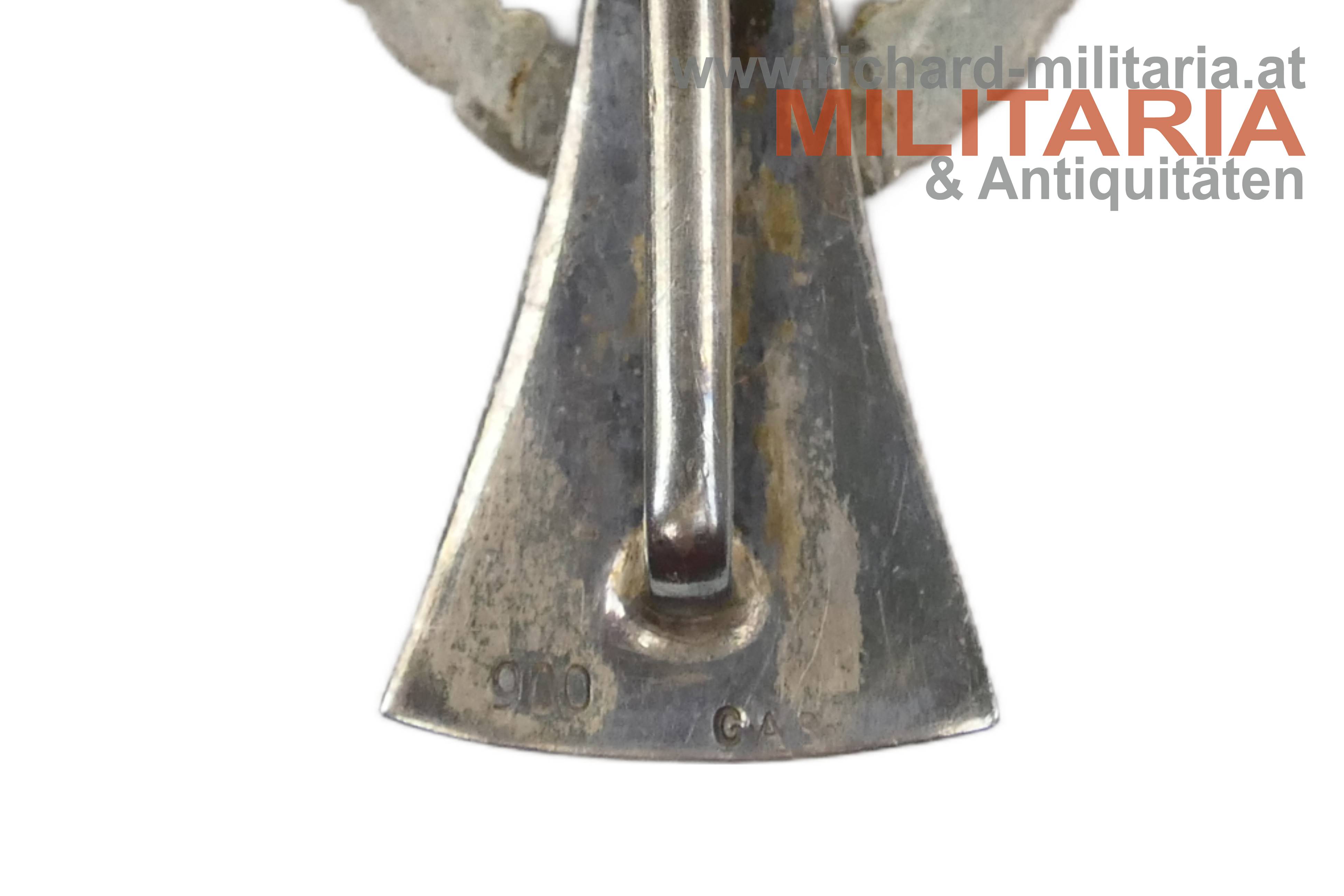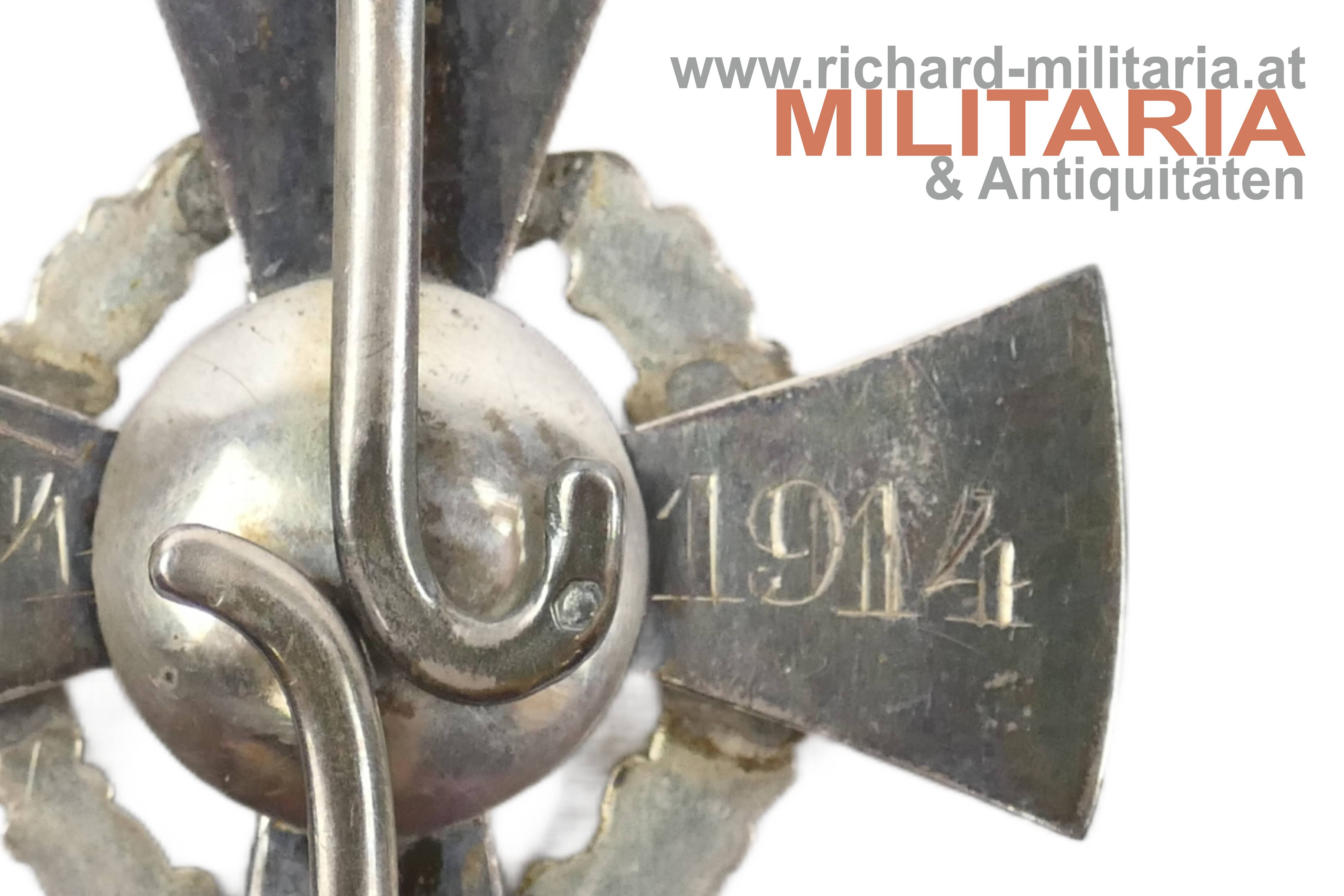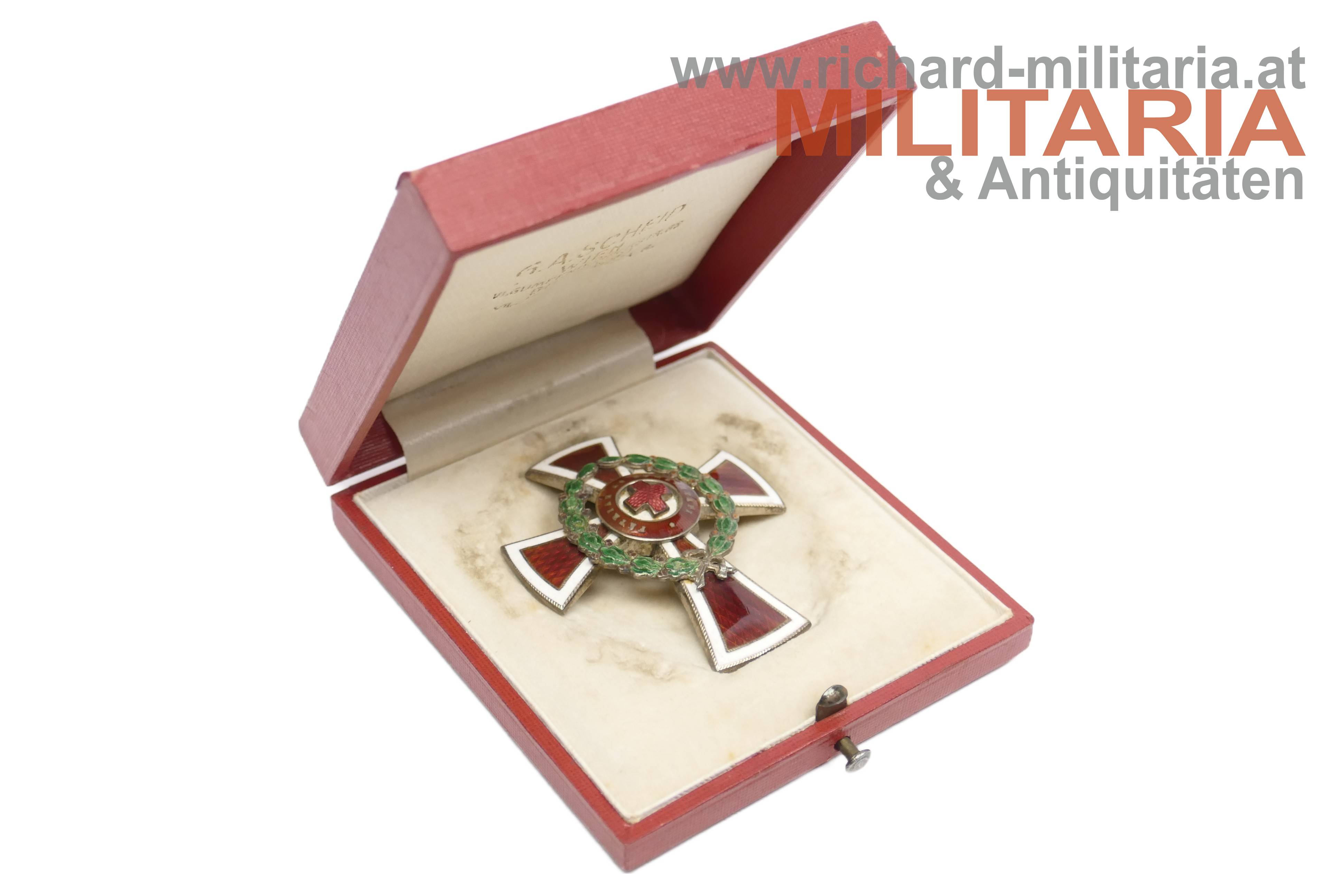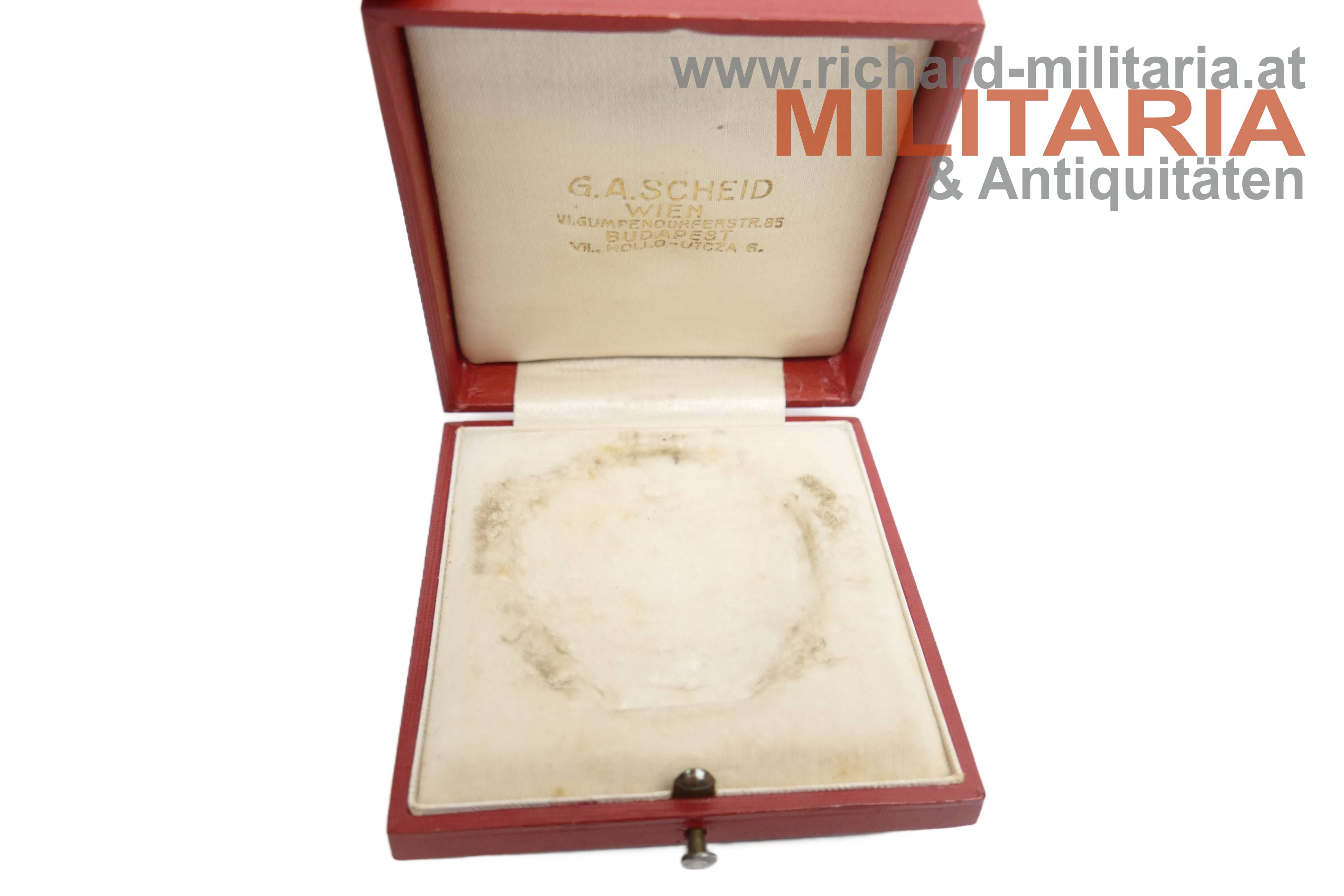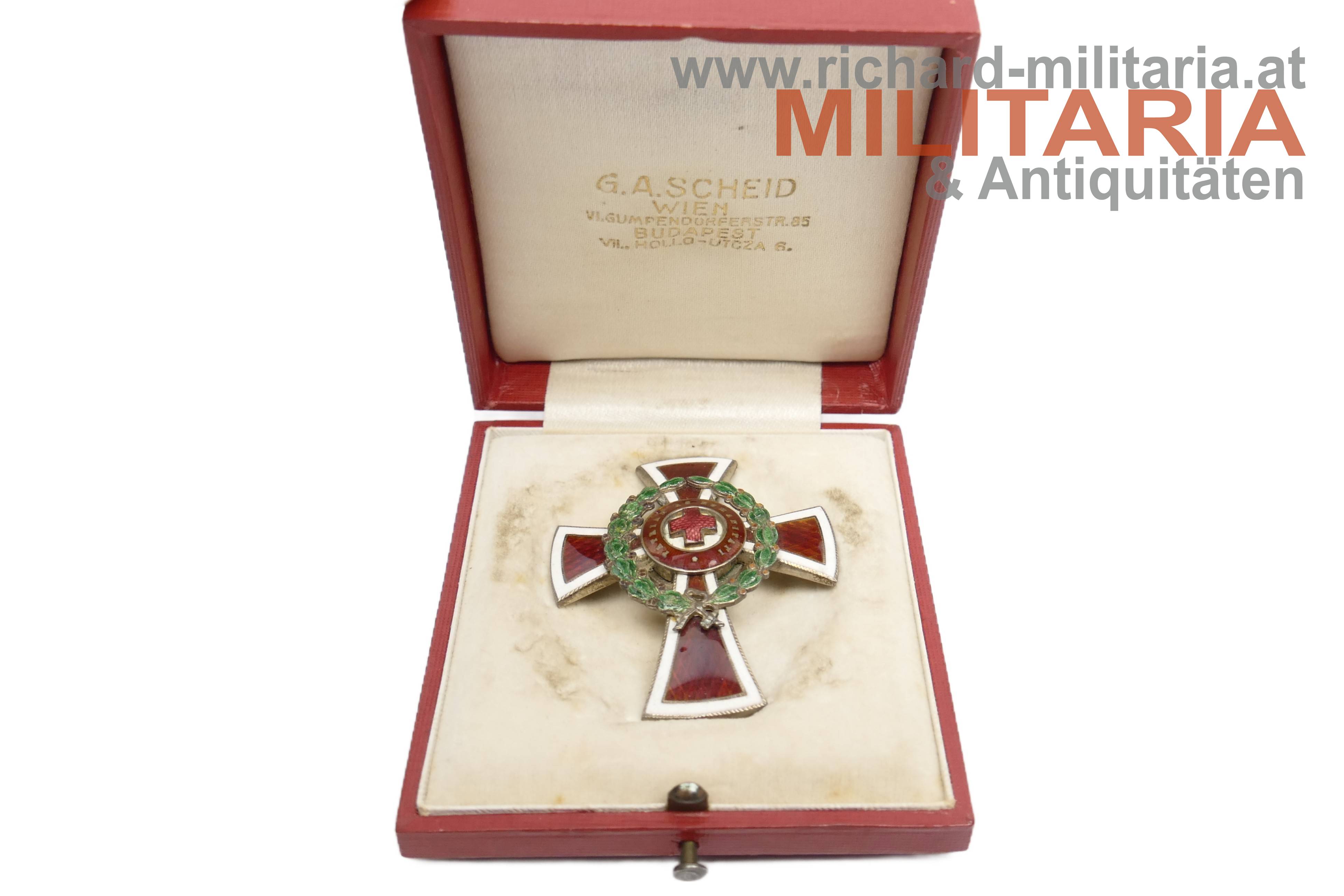 Rotes Kreuz - Offizierskreuz mit Kriegsdekoration im Etui; Silber und emailliert; revers Herstellerpunze "GAS" und Silberpunze "900" sowie eine Dianakopfpunze; oberflächlicher Emailschaden am roten Rand des Mittelmedaillons; ansonsten sehr gute Erhaltung; Etui mit silberner Deckelprägung; innen am Deckel der Hersteller "G. A. Scheid Wien"; Etui in sehr guter farbfrischer Erhaltung;