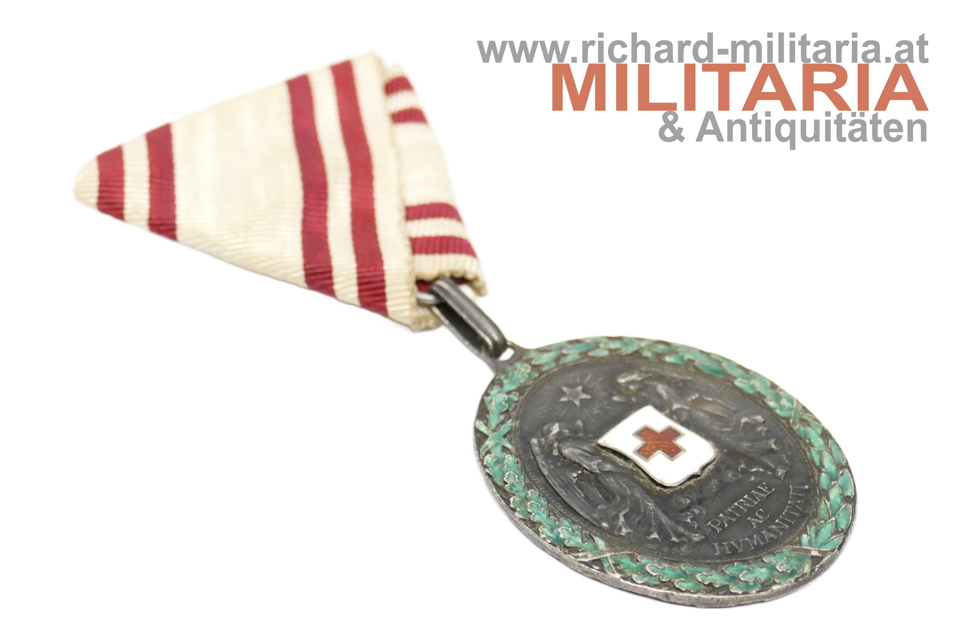 Rotes Kreuz - Silberne Ehrenmedaille mit Kriegsdekoration; Silber unpunziert; Emaillierung der KD in ordentlicher Erhaltung; kleine Beschädigung oben links am weißen Wappenschild; am originalen gut erhaltenen Band mit Druckknopfverschluss;