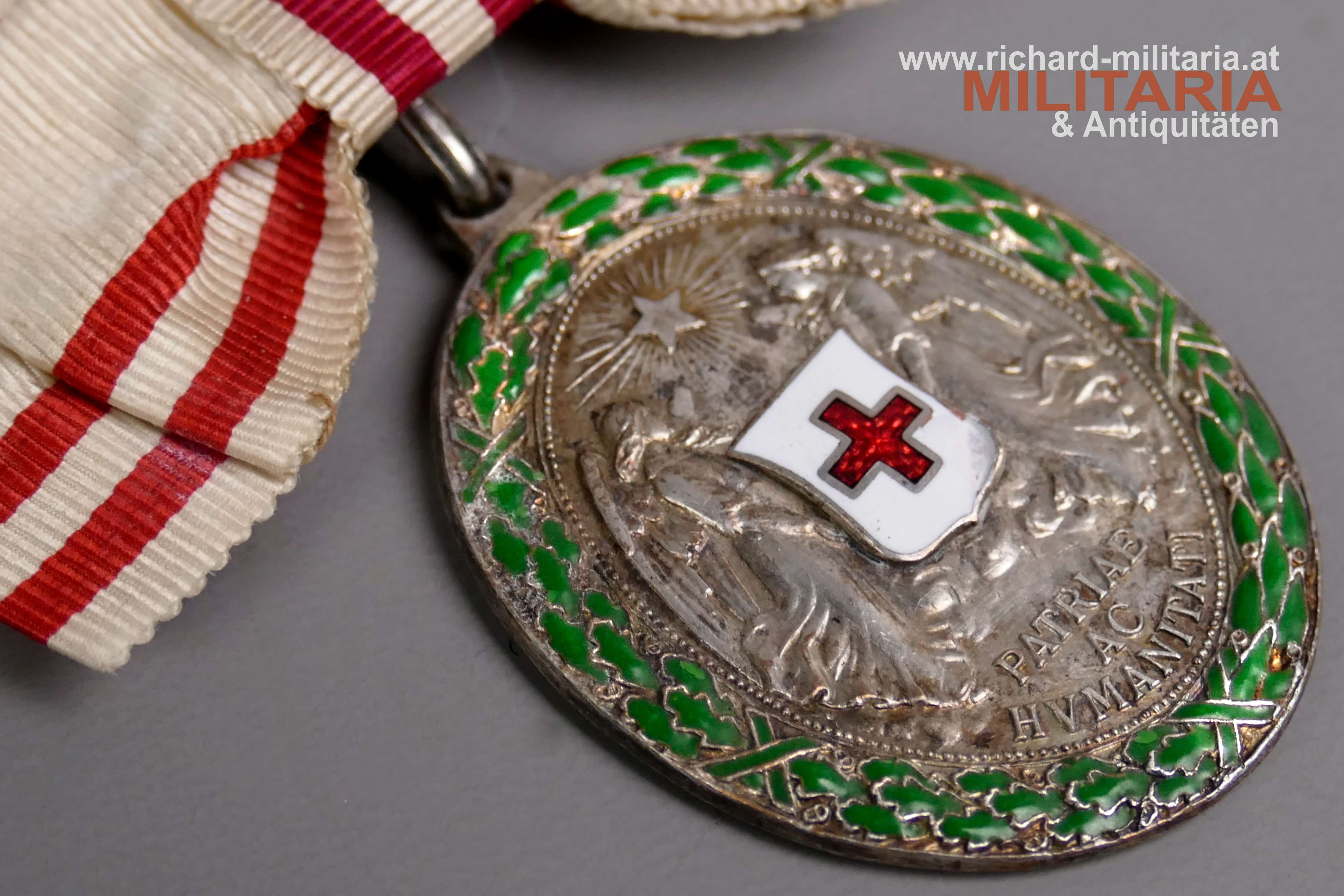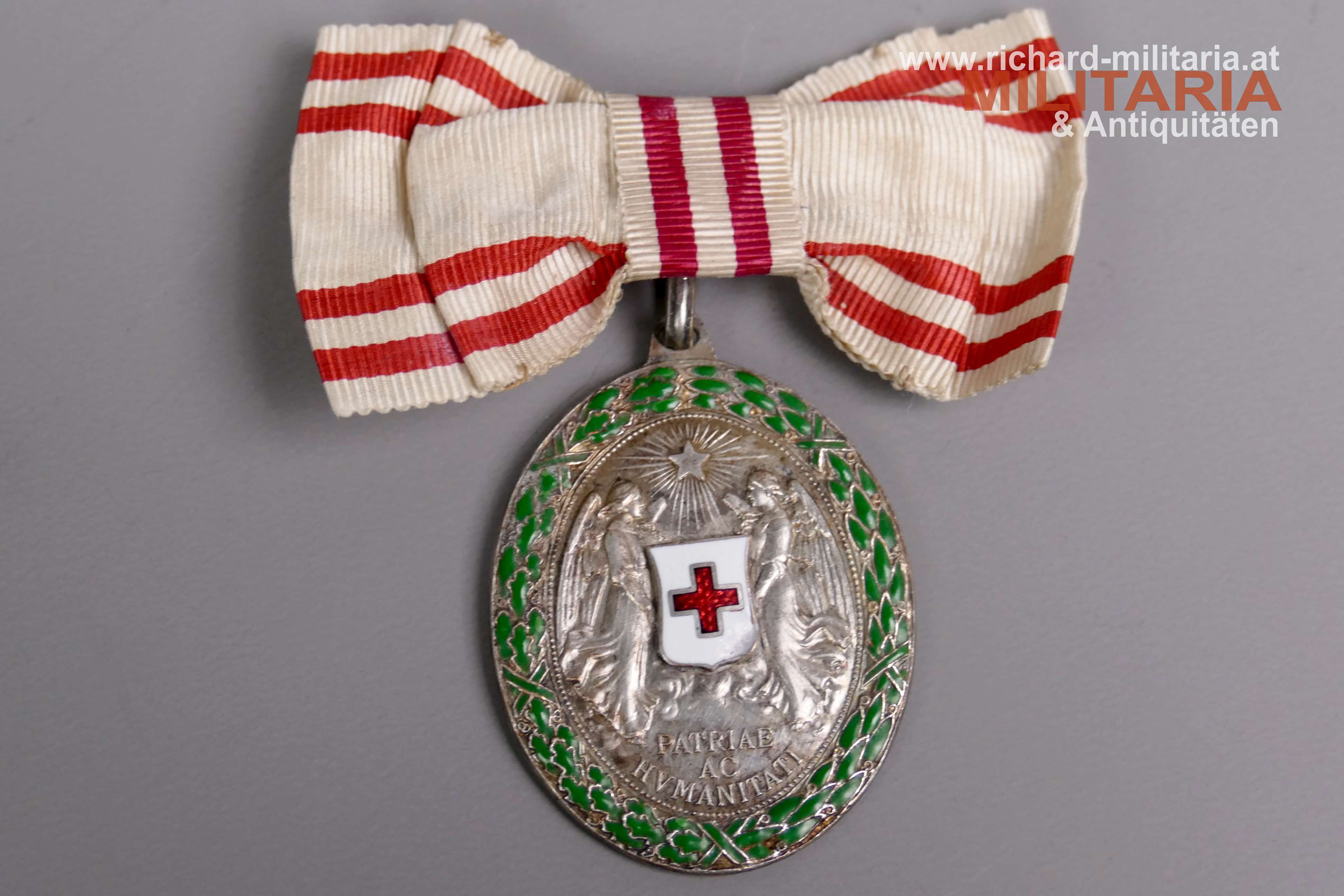 Rotes Kreuz - Silberne Ehrenmedaille mit Kriegsdekoration und Damenmasche; Tombak versilber und emailliert; Emaillierung der KD einwandfrei; Emailchip am weißen Mittelmedaillon; Damenmasche original mit dem Bandring vernäht (!);