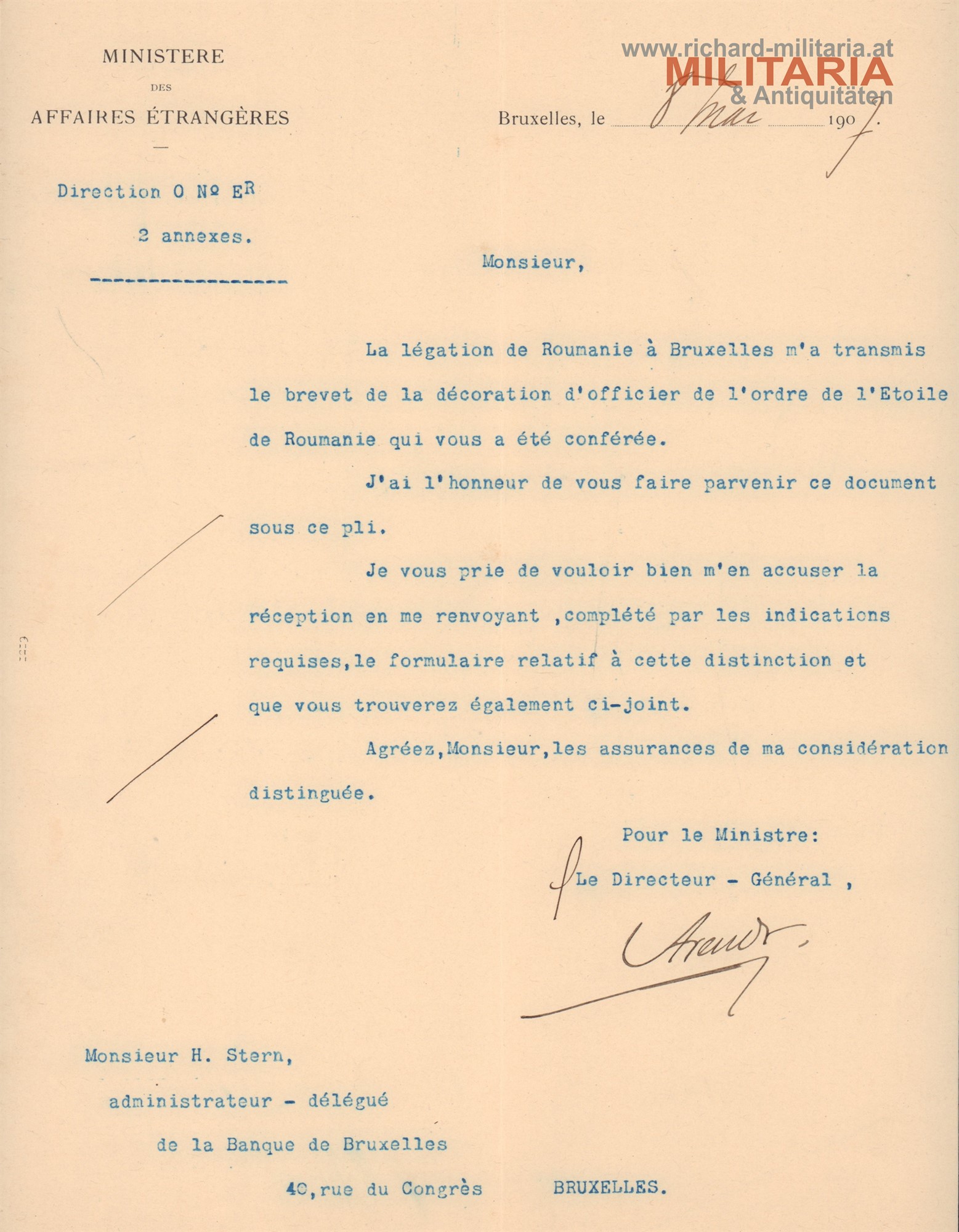 Rumänien - Verleihungsurkunde zum Offizierskreuz des Stern von Rumänien; Dokumentenkonvolut Dr. Herman Stern; Ernennungsurkunde zum Offizier des Ordens Stern von Rumänien; 1909; dazu 3 Schreiben des französischen Außenministeriums über Verleihung und Annahme.