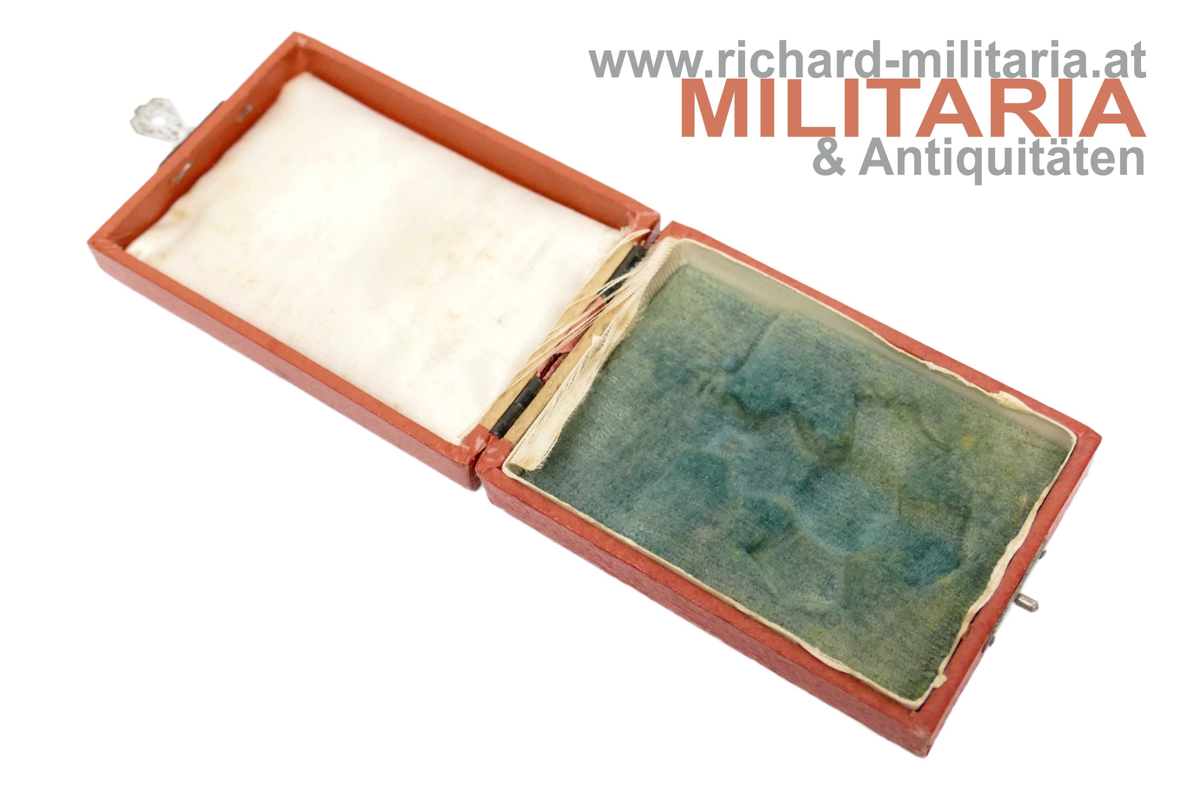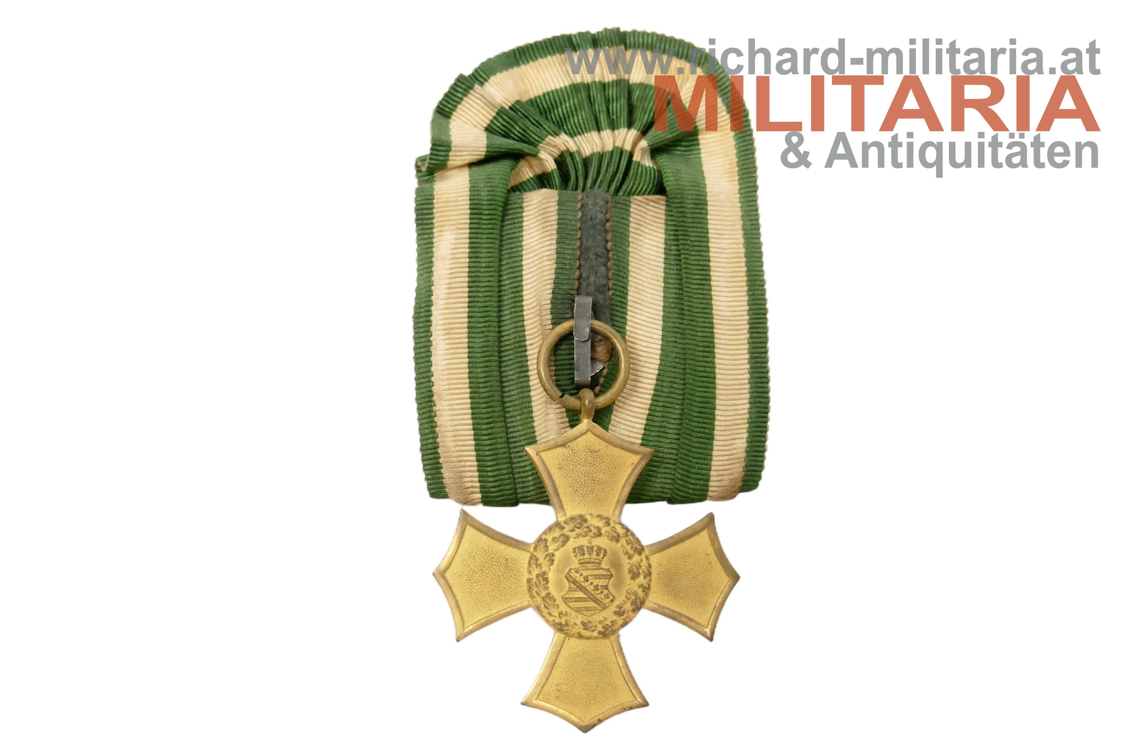 Sachsen - Ehrenkreuz (Allgemeines Ehrenzeichen) mit Etui; Bronze vergoldet; für das Etui unpassende jedoch zugehörige Einzelbandspange; rotes Etui in Lederoptik mit goldener Deckelprägung "E.K."; am Etuiboden mit zwei Herstelleretiketten;