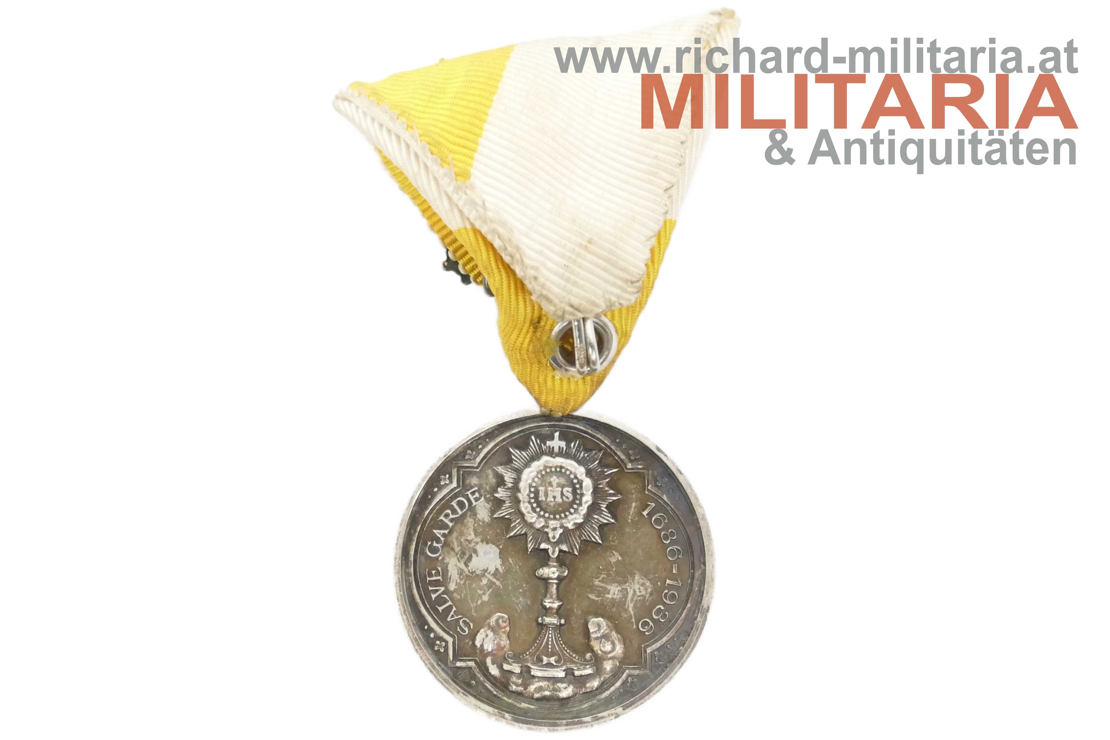 Medaille der Salva Guardia zum Jubiläum 1686-1936; VS: Abbildung von Papst Pius XI Pontifex Maximus - RS "Salve Garde 1686-1936 mit einer Monstranz; Silber (?) unpunziert; am originalen Band mit Auflage in Form von gekreuzten päpstlichen Schlüsseln unter der Papstkrone