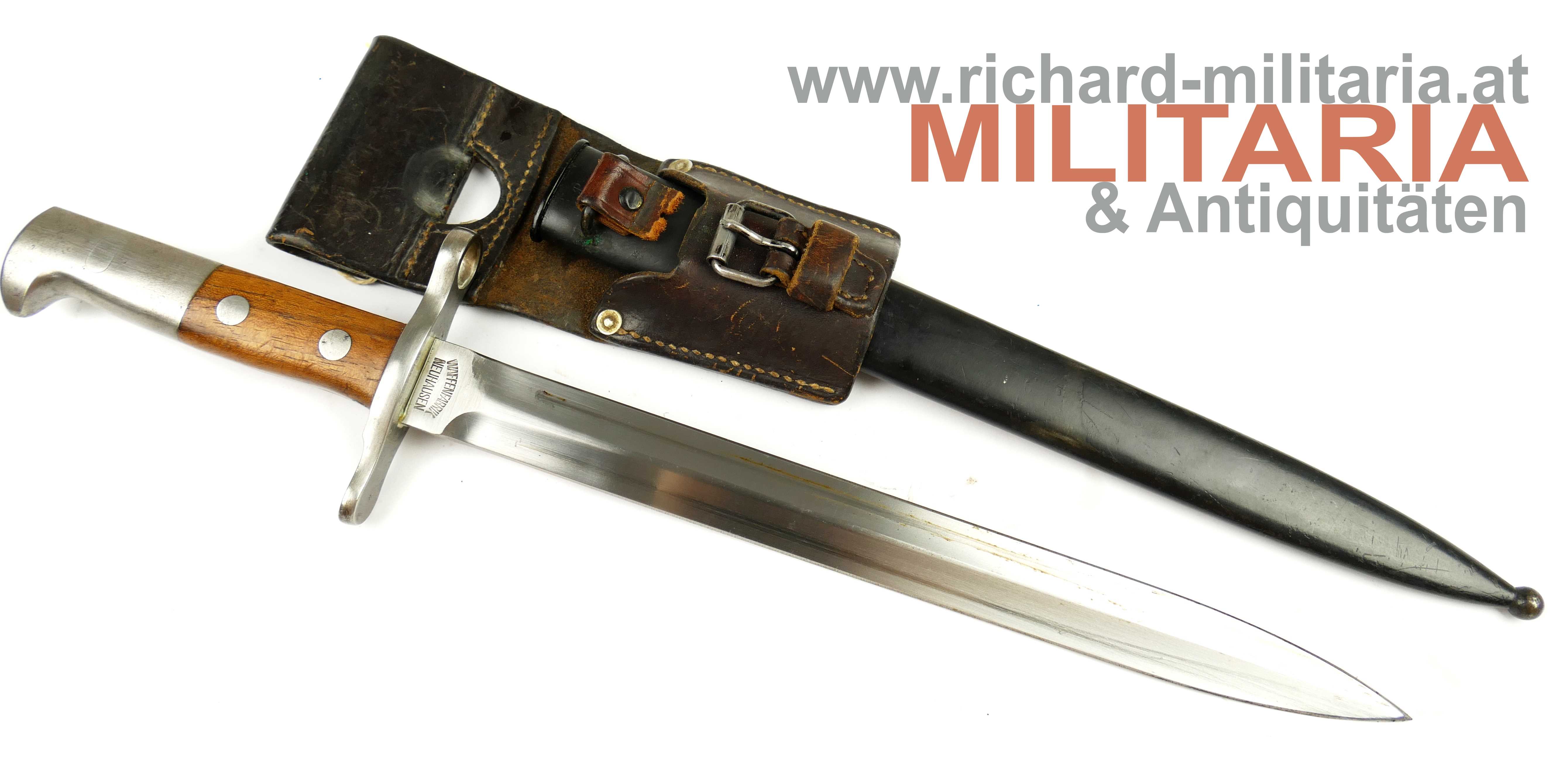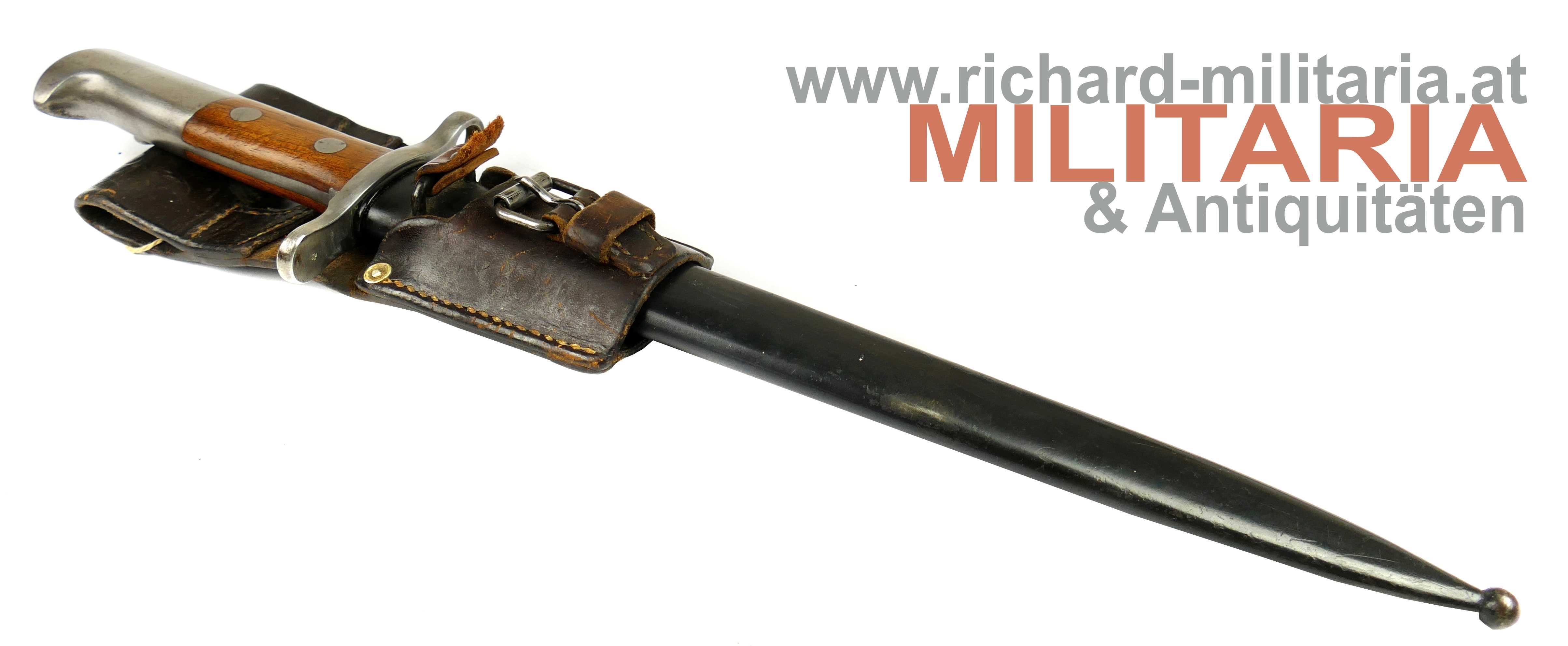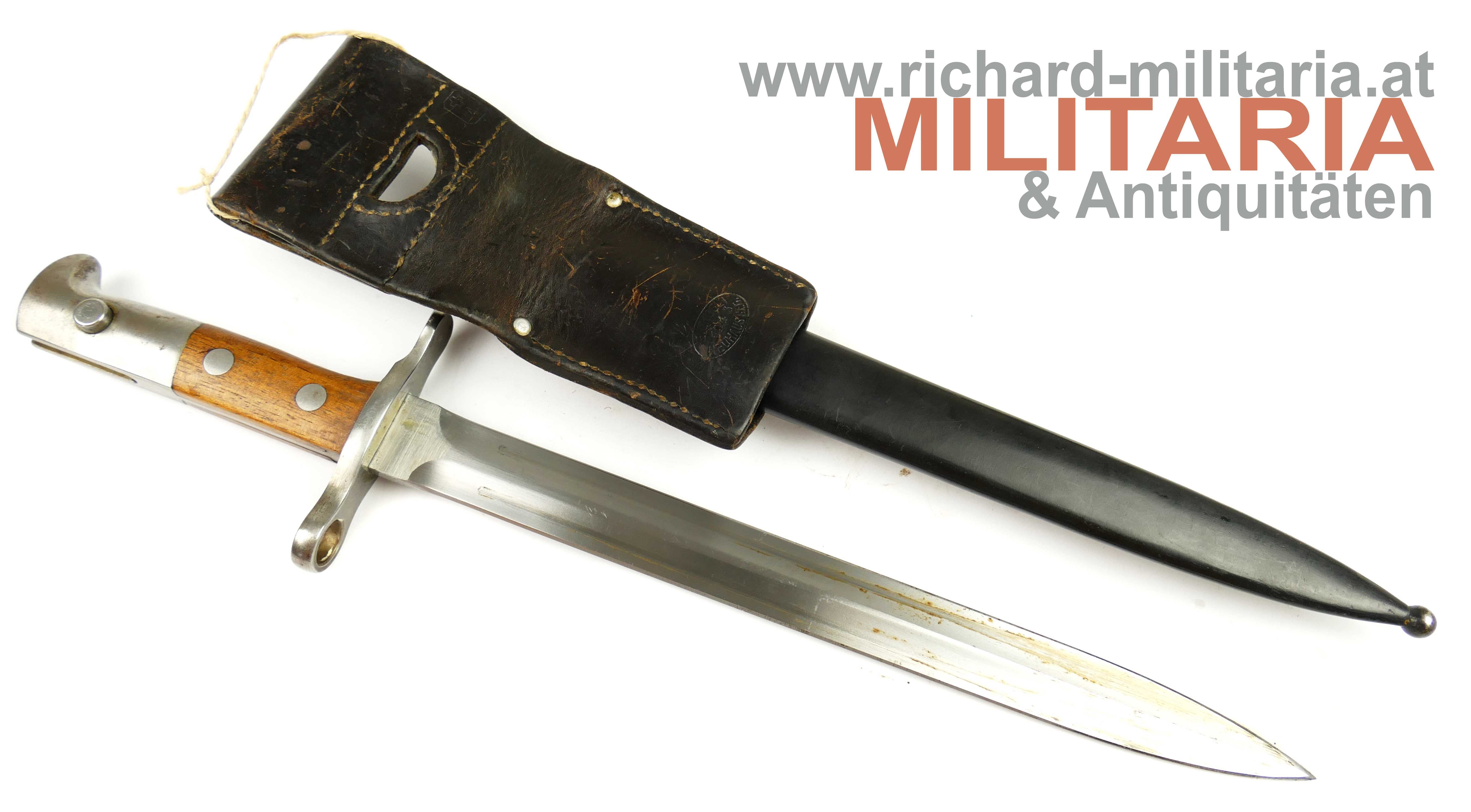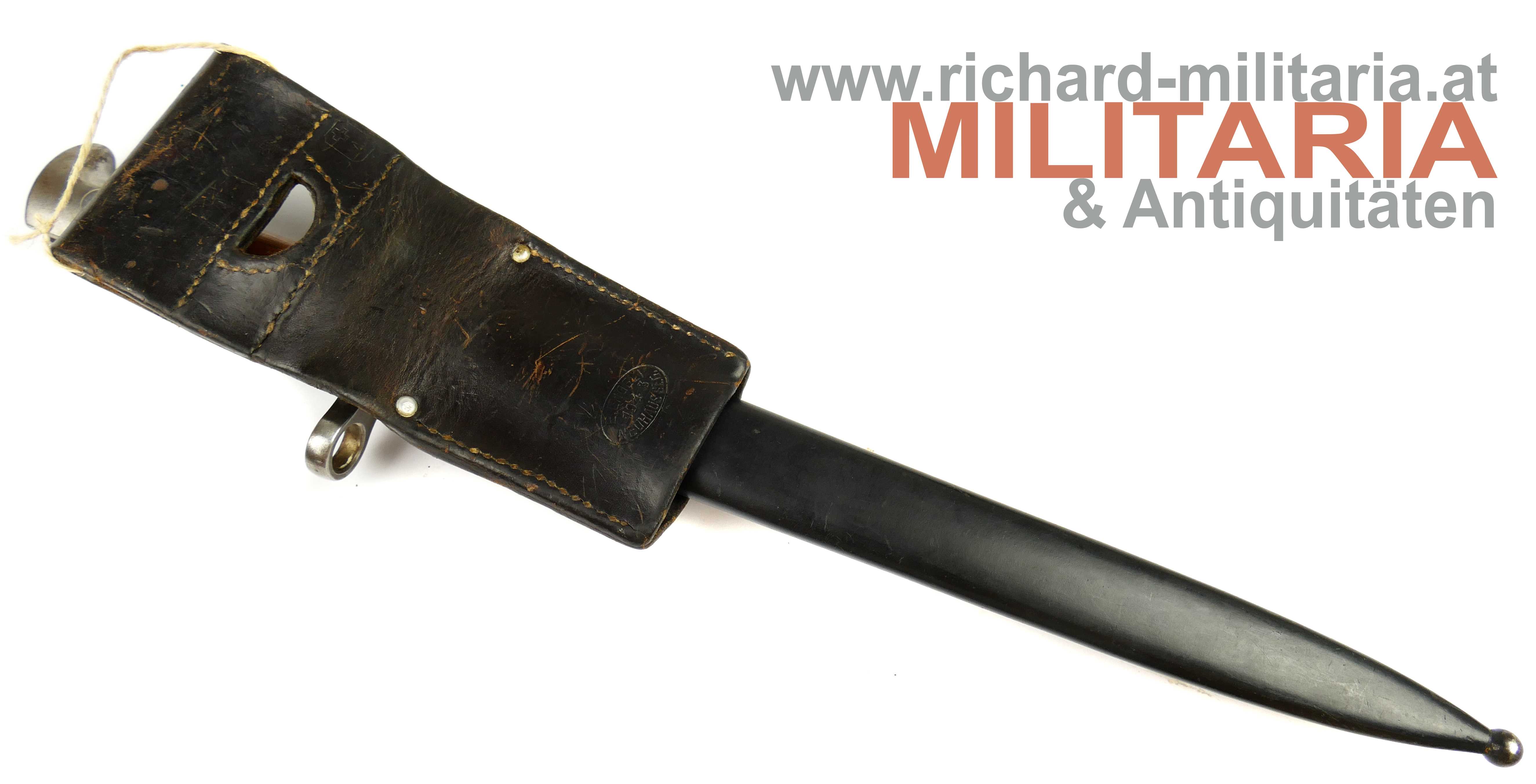 Schweiz Bajonett Modell 1918 komplett mit Scheide und Lederhänger; Hersteller: "Waffenfabrik Neuhausen" auf der dolchartigen zweischneidigen Klinge; original vernietete Holzgriffschalen; ohne Waffennummer und Schweizer Kreuz in der Parierstange; Markierung an der Scheide; mit Koppeltrageschuh - Lederschlaufe zur Befestigung am Koppelschuh ist gebrochen; Koppelschuh mit Hersteller und Baujahr (1943) gestempelt;