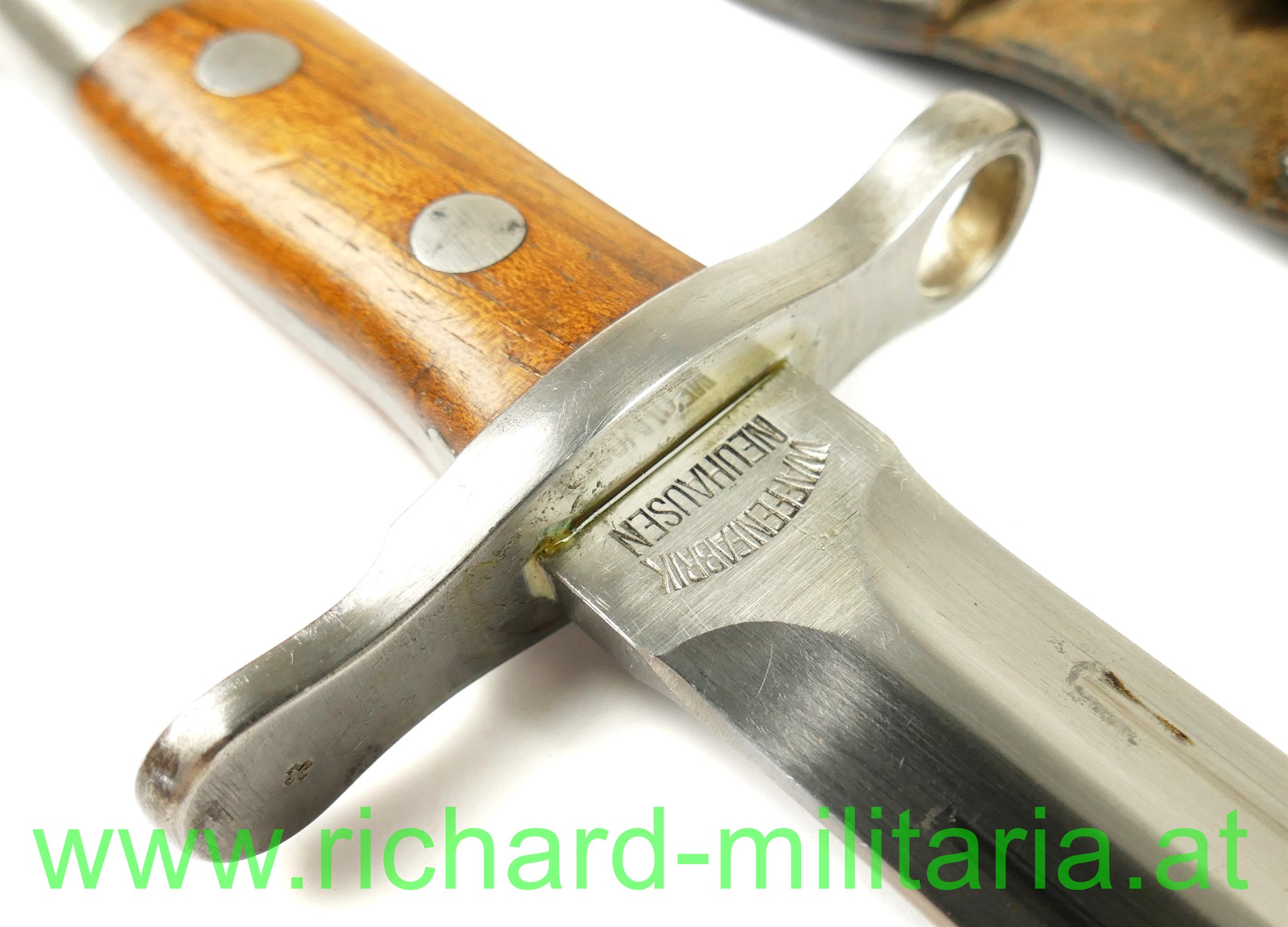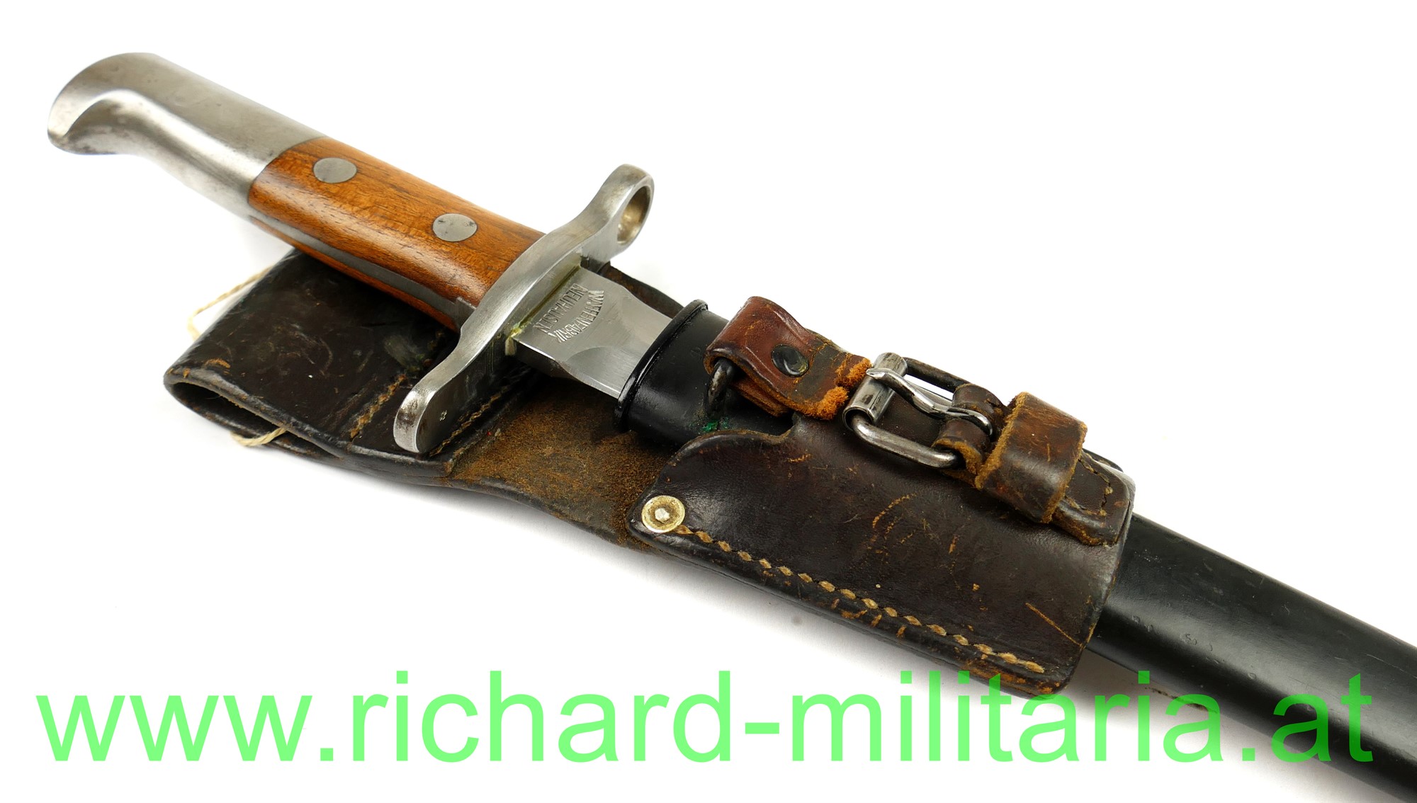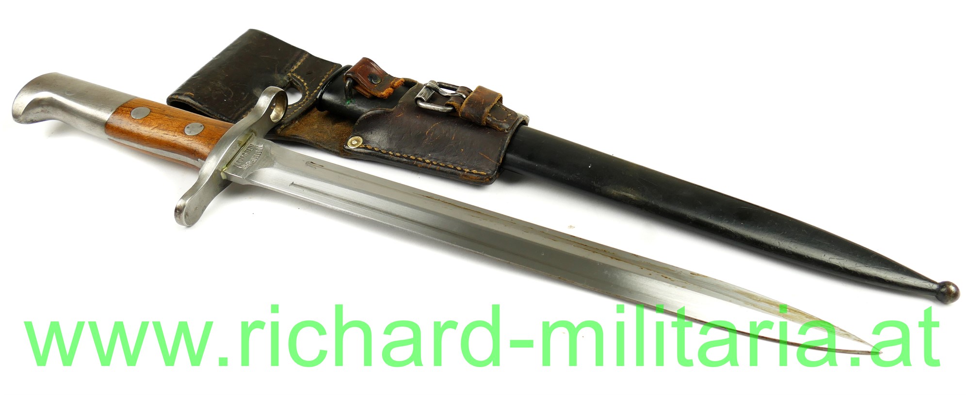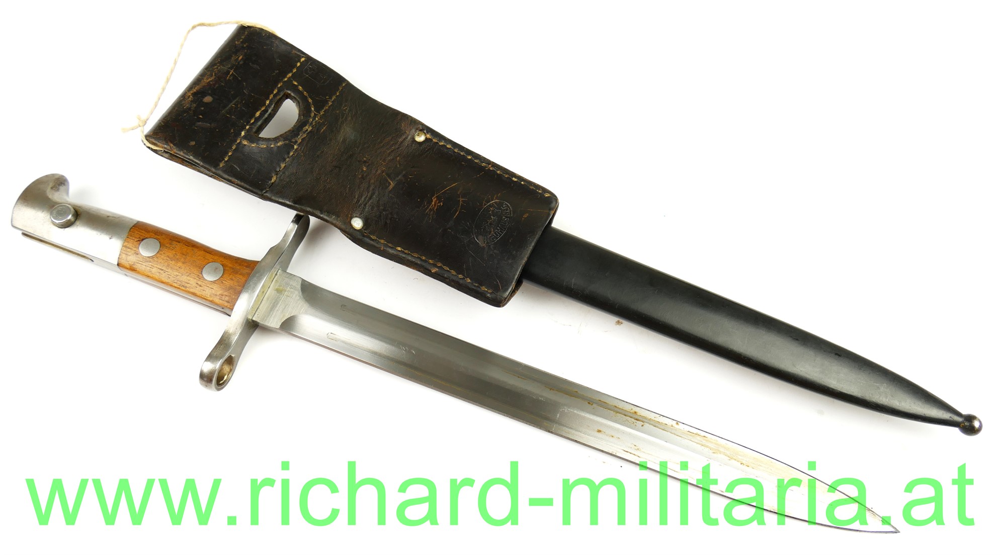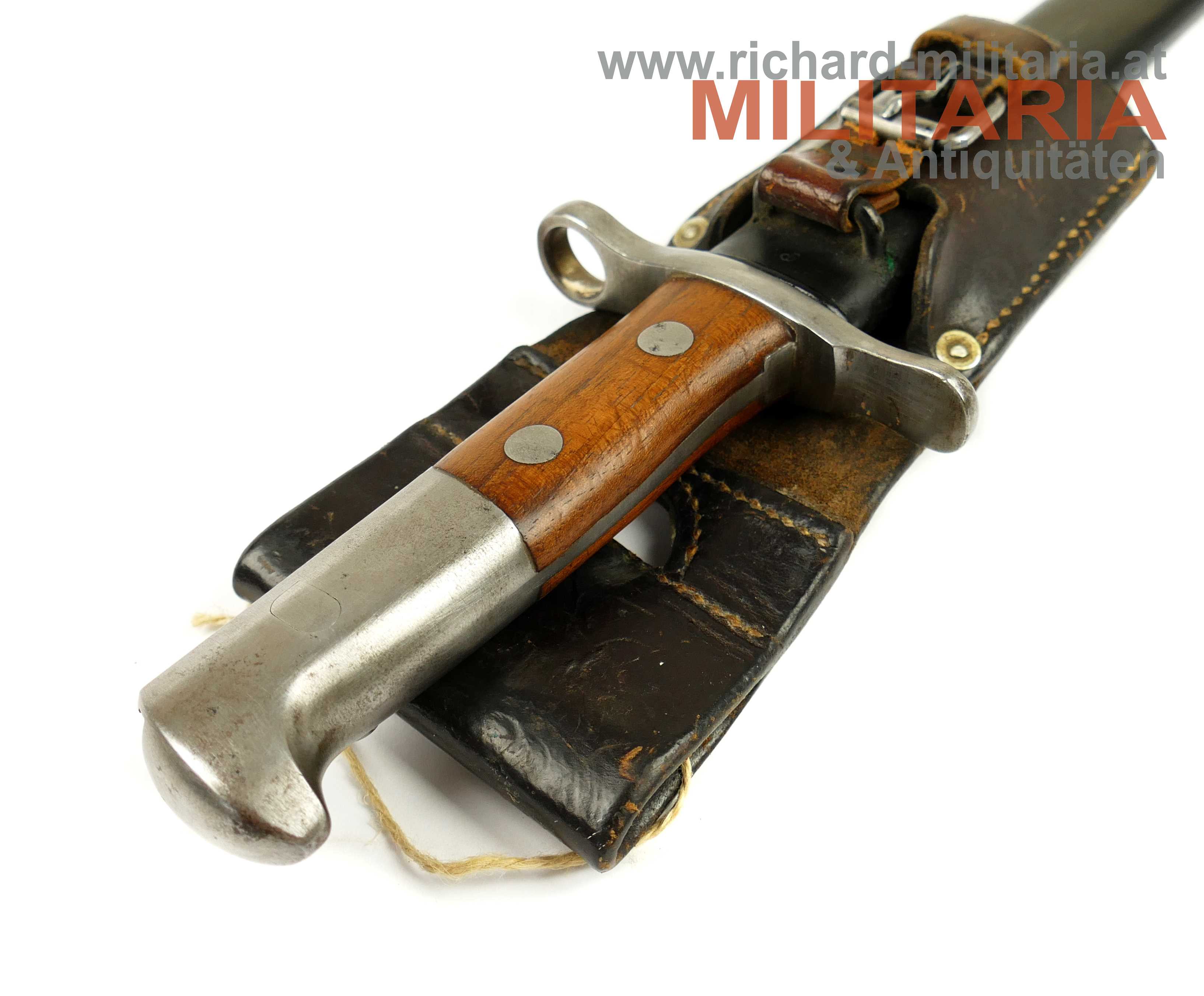 Schweiz Bajonett Modell 1918 komplett mit Scheide und Lederhänger; Hersteller: "Waffenfabrik Neuhausen" auf der dolchartigen zweischneidigen Klinge; original vernietete Holzgriffschalen; ohne Waffennummer und Schweizer Kreuz in der Parierstange; Markierung an der Scheide; mit Koppeltrageschuh - Lederschlaufe zur Befestigung am Koppelschuh ist gebrochen; Koppelschuh mit Hersteller und Baujahr (1943) gestempelt;