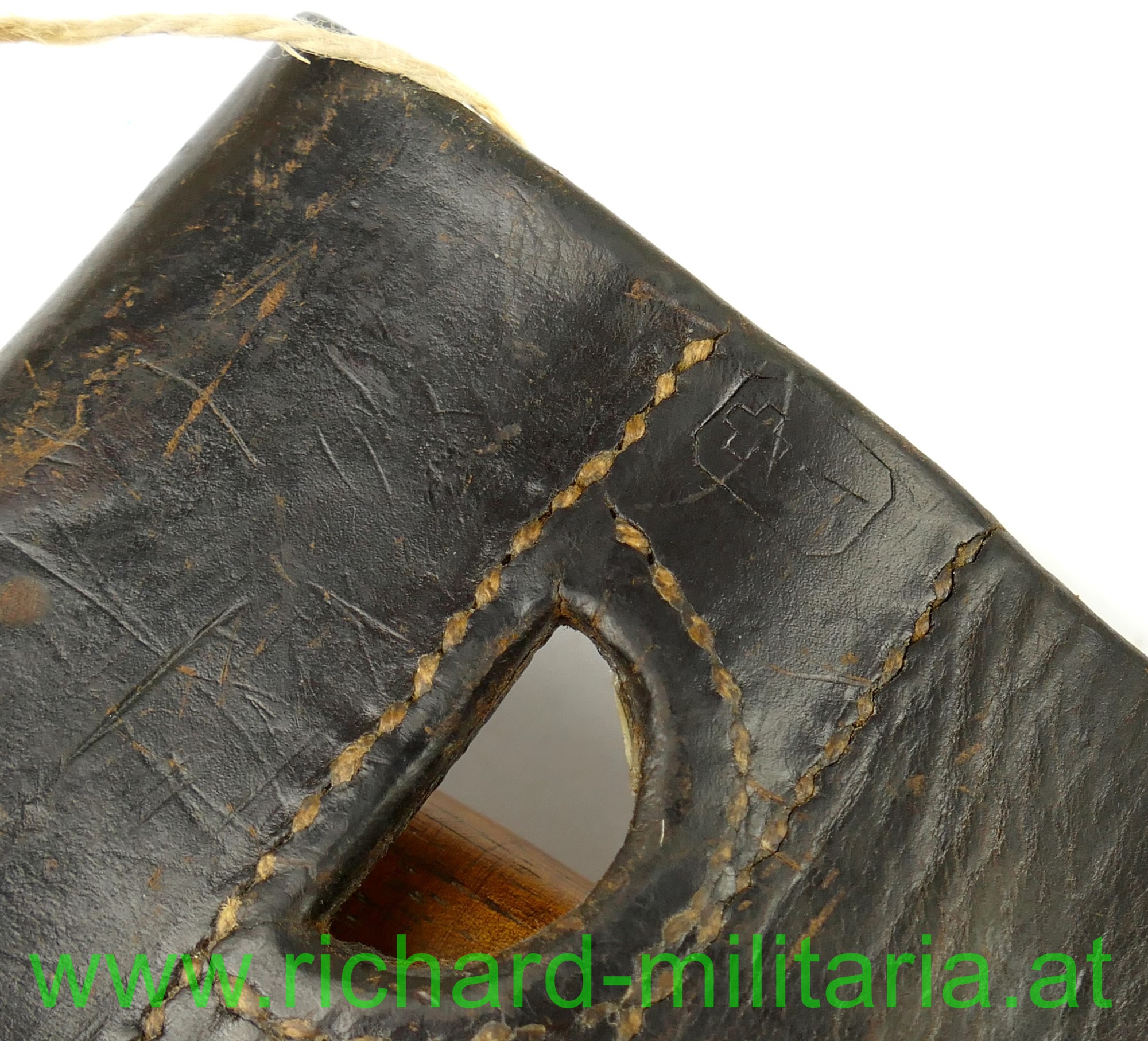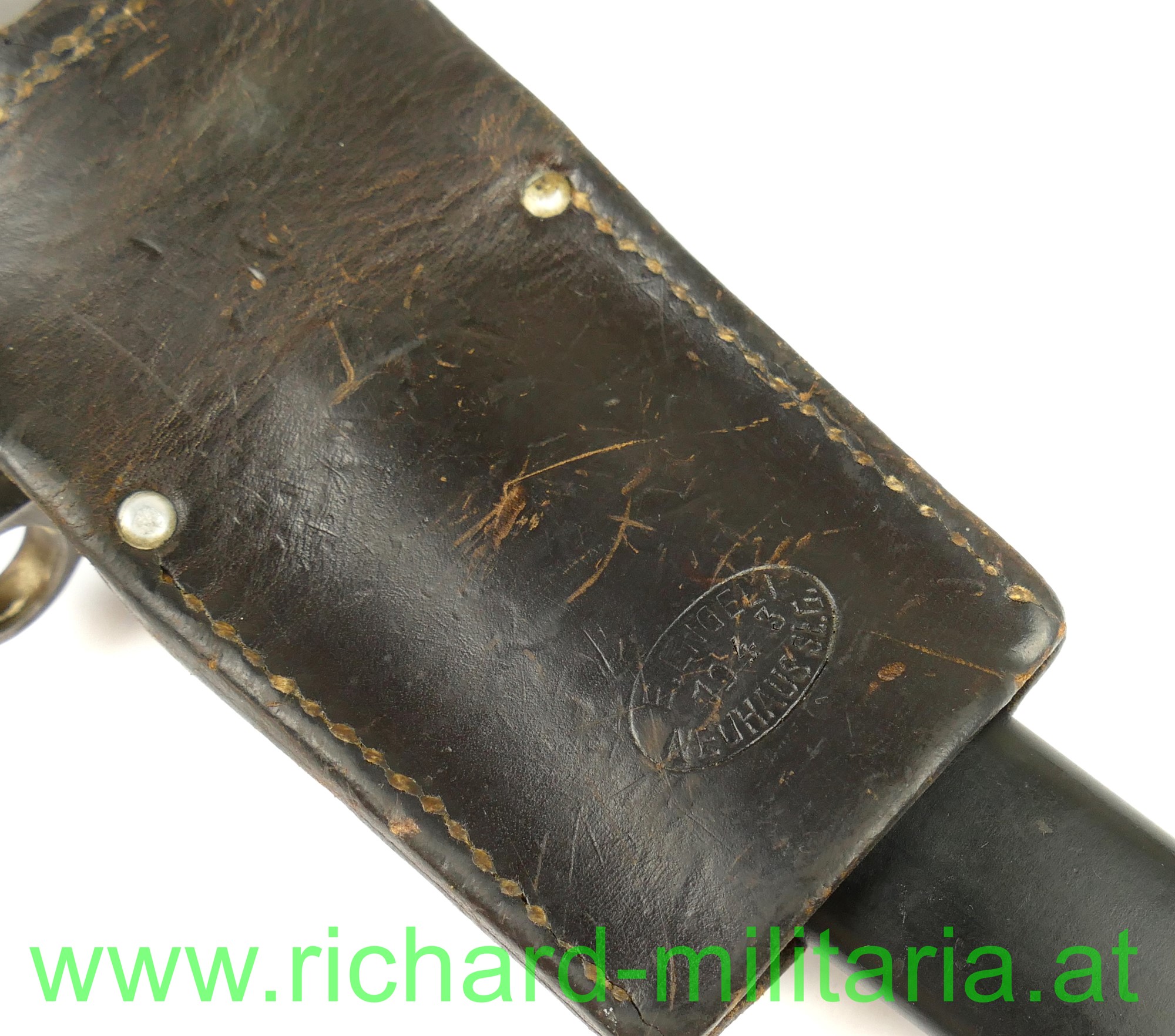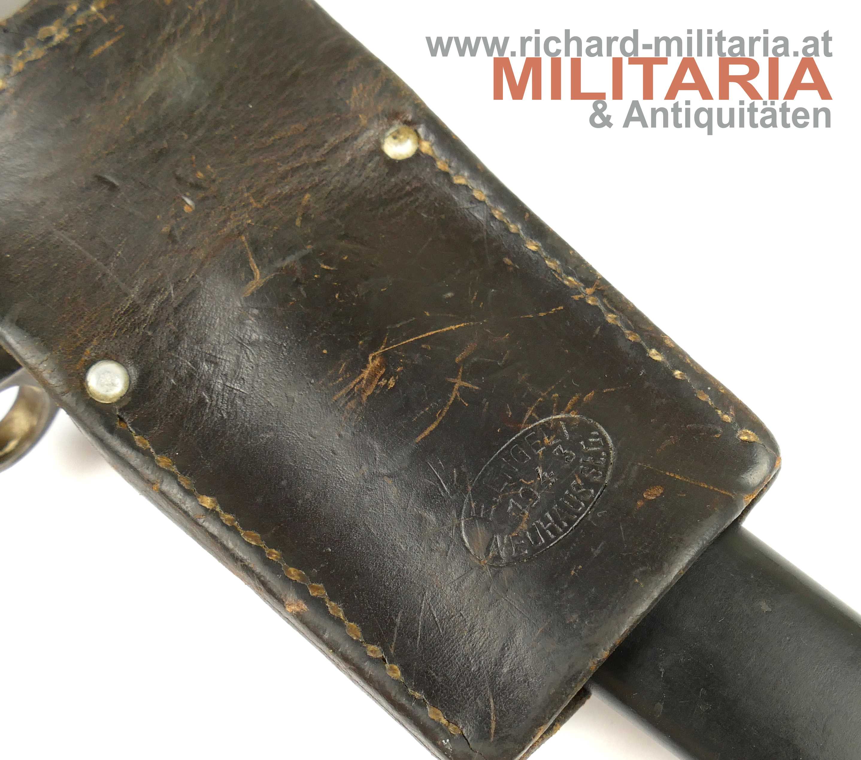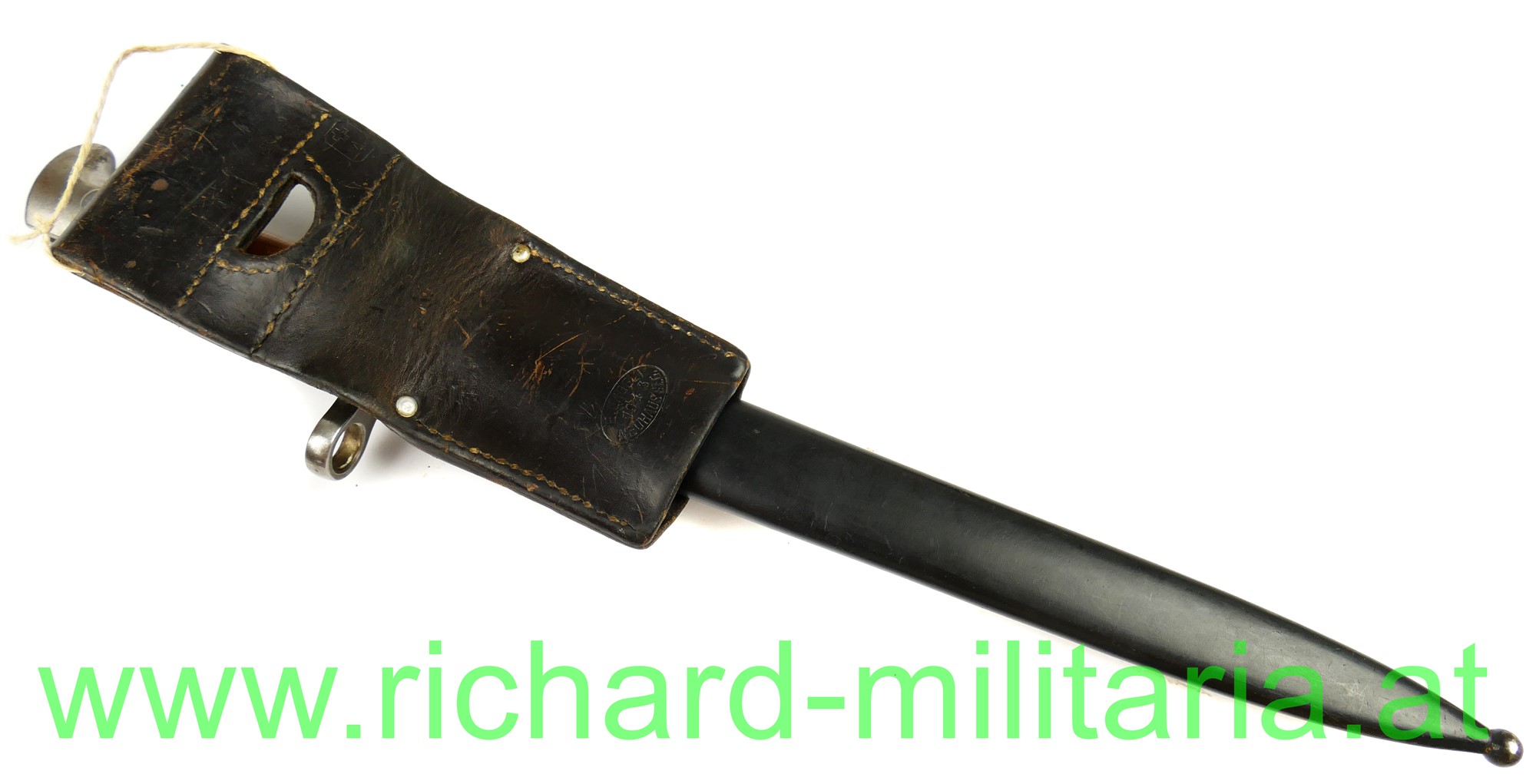 Schweiz Bajonett Modell 1918 komplett mit Scheide und Lederhänger; Hersteller: "Waffenfabrik Neuhausen" auf der dolchartigen zweischneidigen Klinge; original vernietete Holzgriffschalen; ohne Waffennummer und Schweizer Kreuz in der Parierstange; Markierung an der Scheide; mit Koppeltrageschuh - Lederschlaufe zur Befestigung am Koppelschuh ist gebrochen; Koppelschuh mit Hersteller und Baujahr (1943) gestempelt;