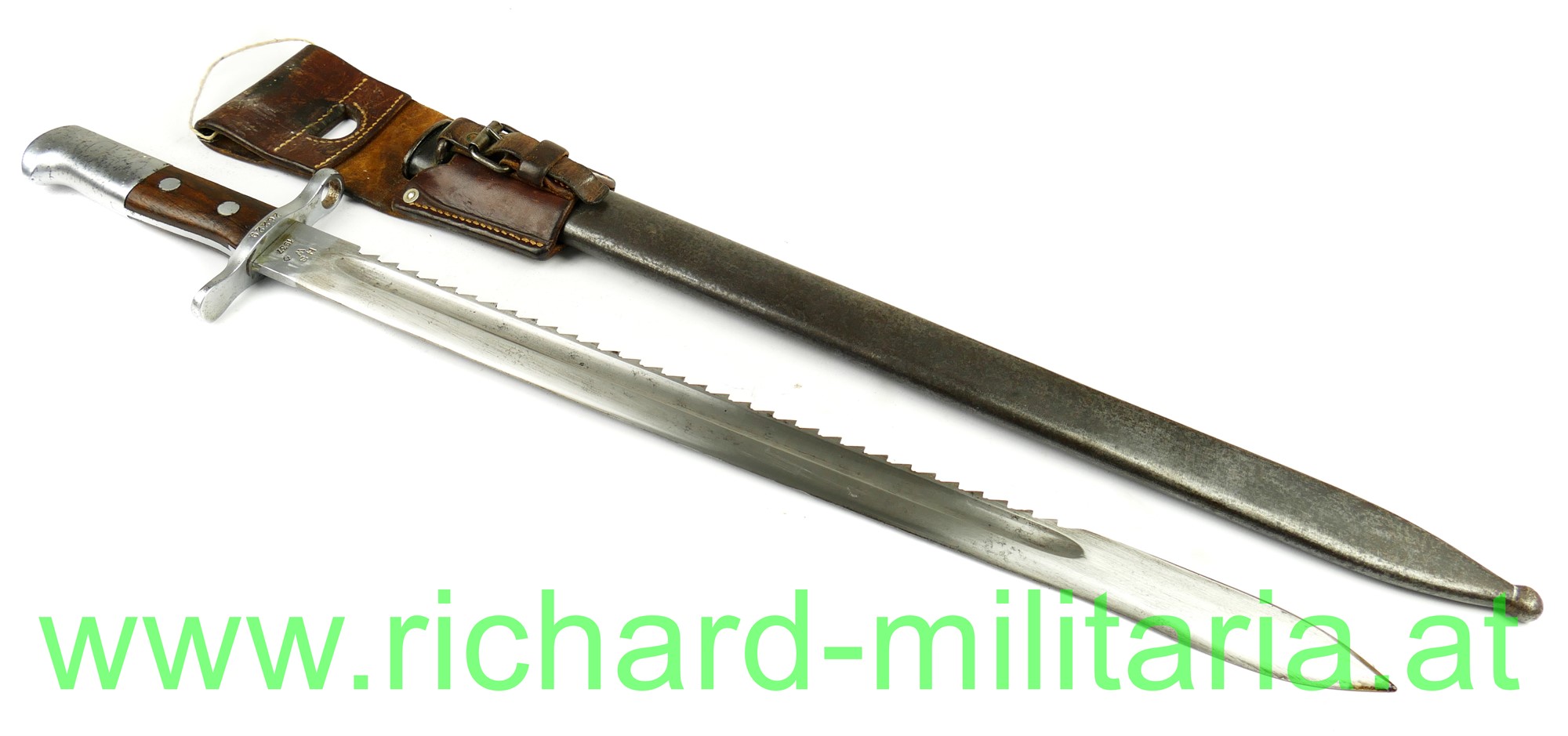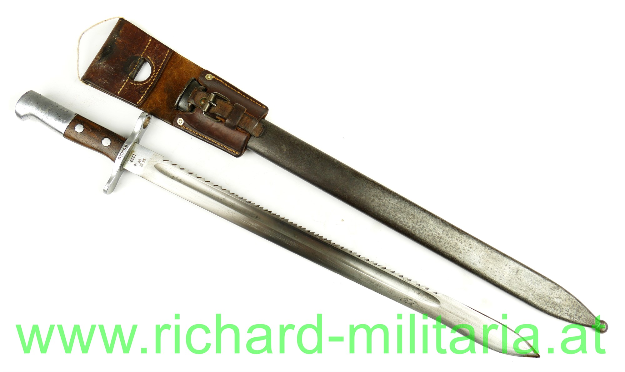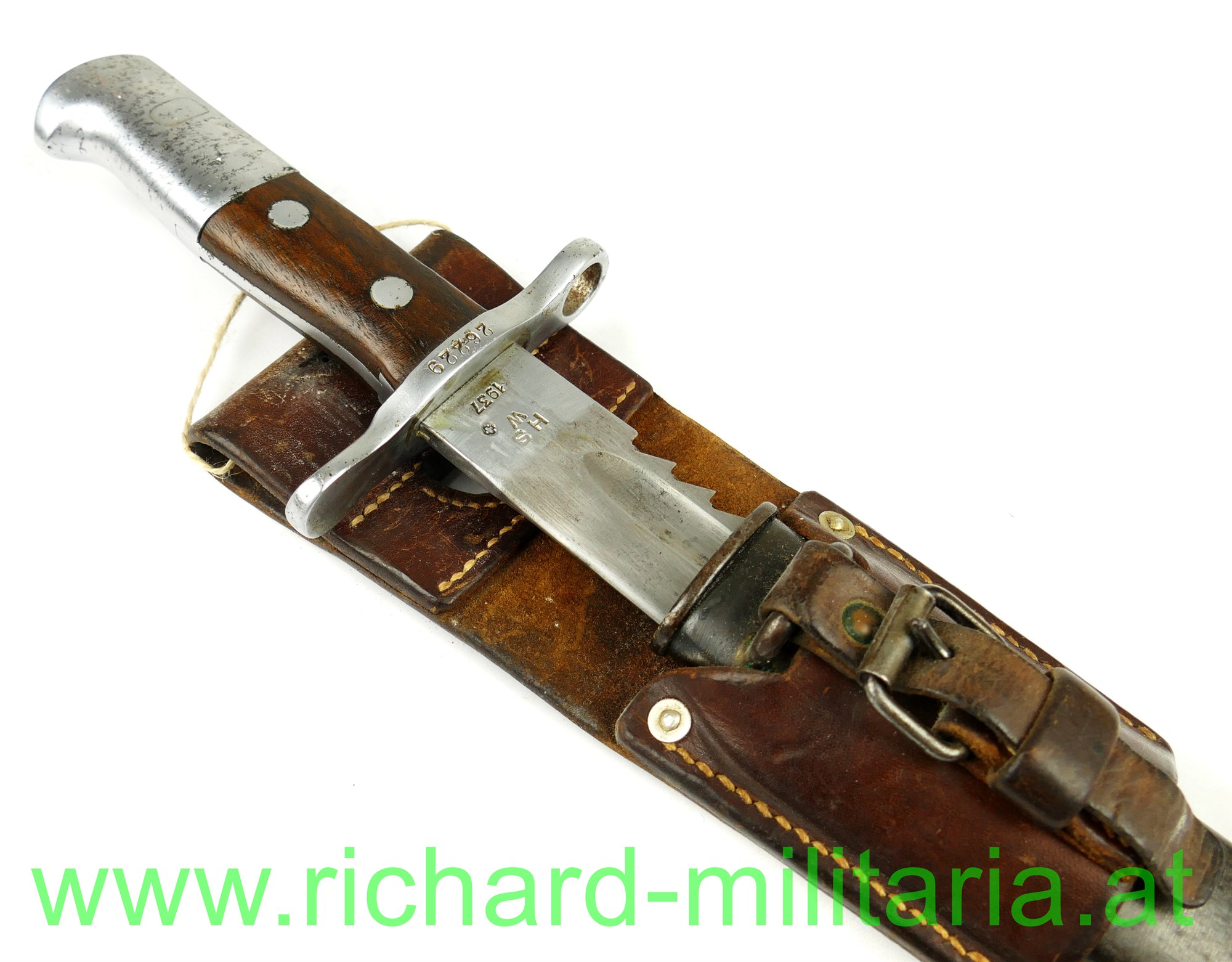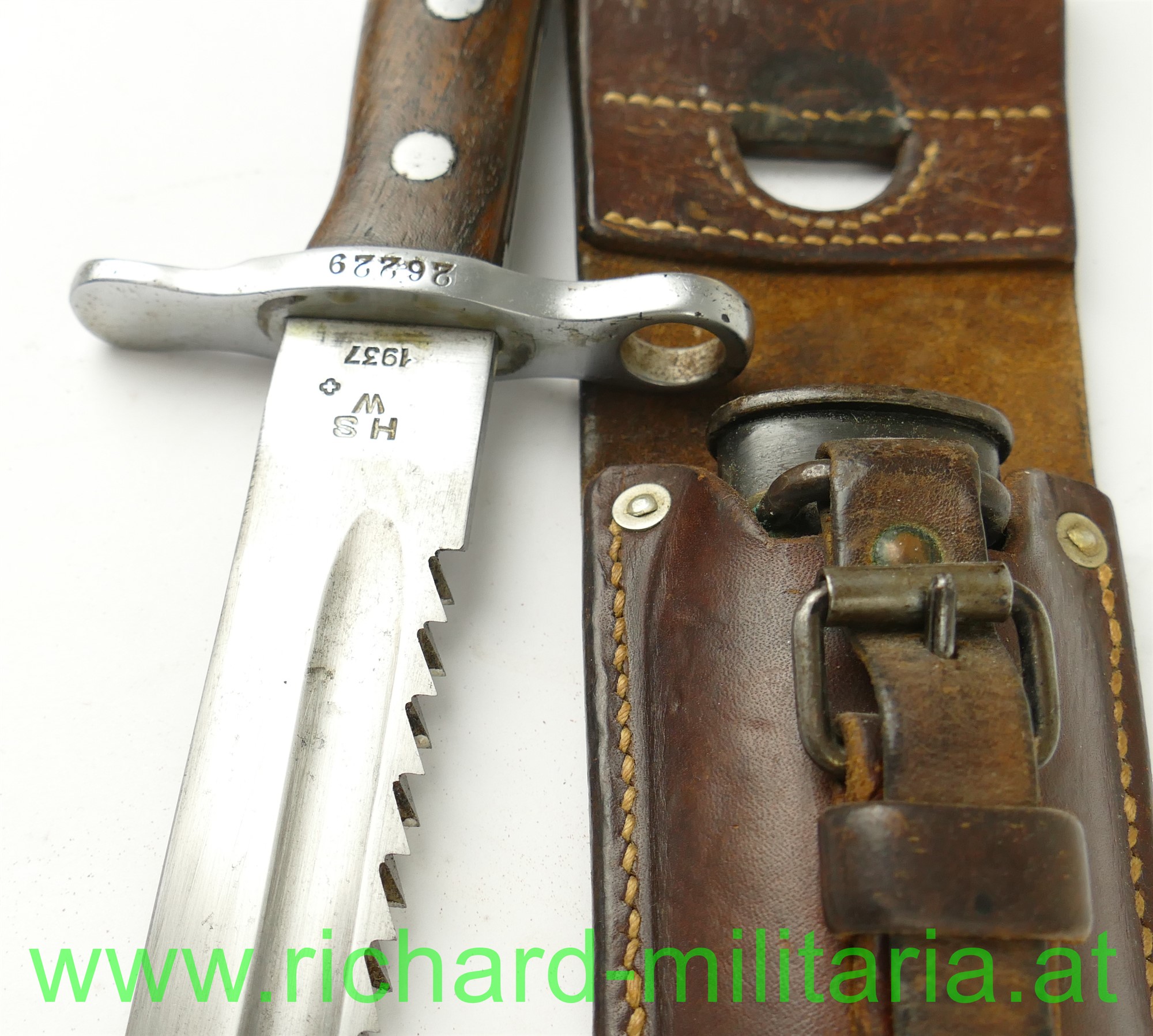 Schweiz Pionier-Bajonett Modell 1914 komplett mit Scheide und Lederhänger, Hersteller: "HSW - 1937" auf der einseitig gekehlten Klinge, original vernietete Holzgriffschalen, Waffennummer "26229" und Schweizer Kreuz in der Parierstange, Markierung an der Scheide, Koppeltrageschuh mit Hersteller und Baujahr (39) gestempelt;