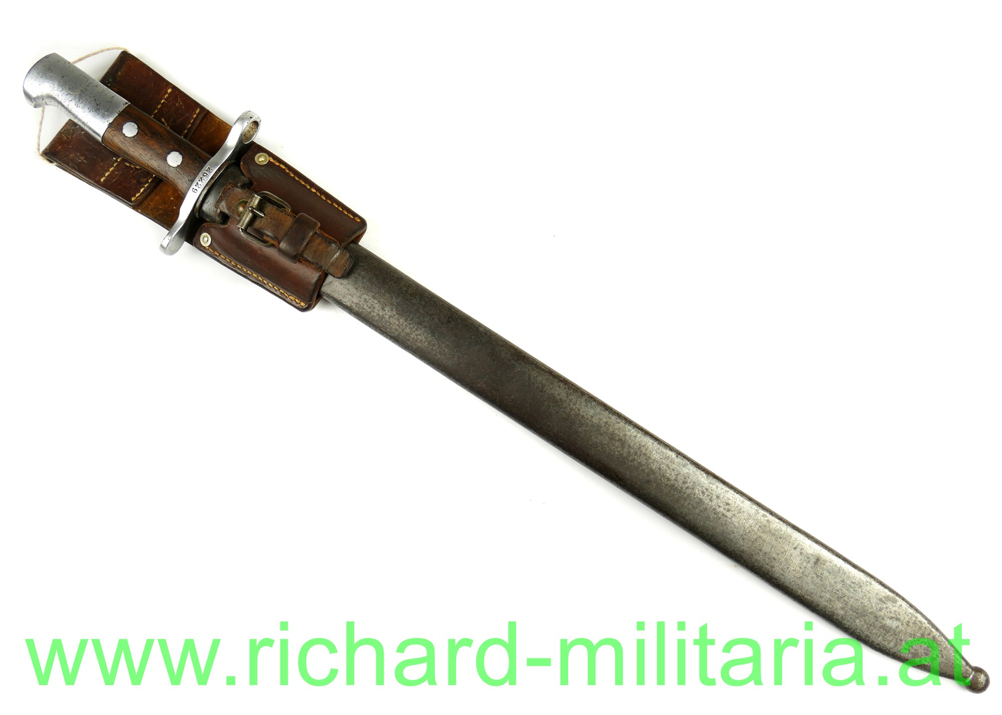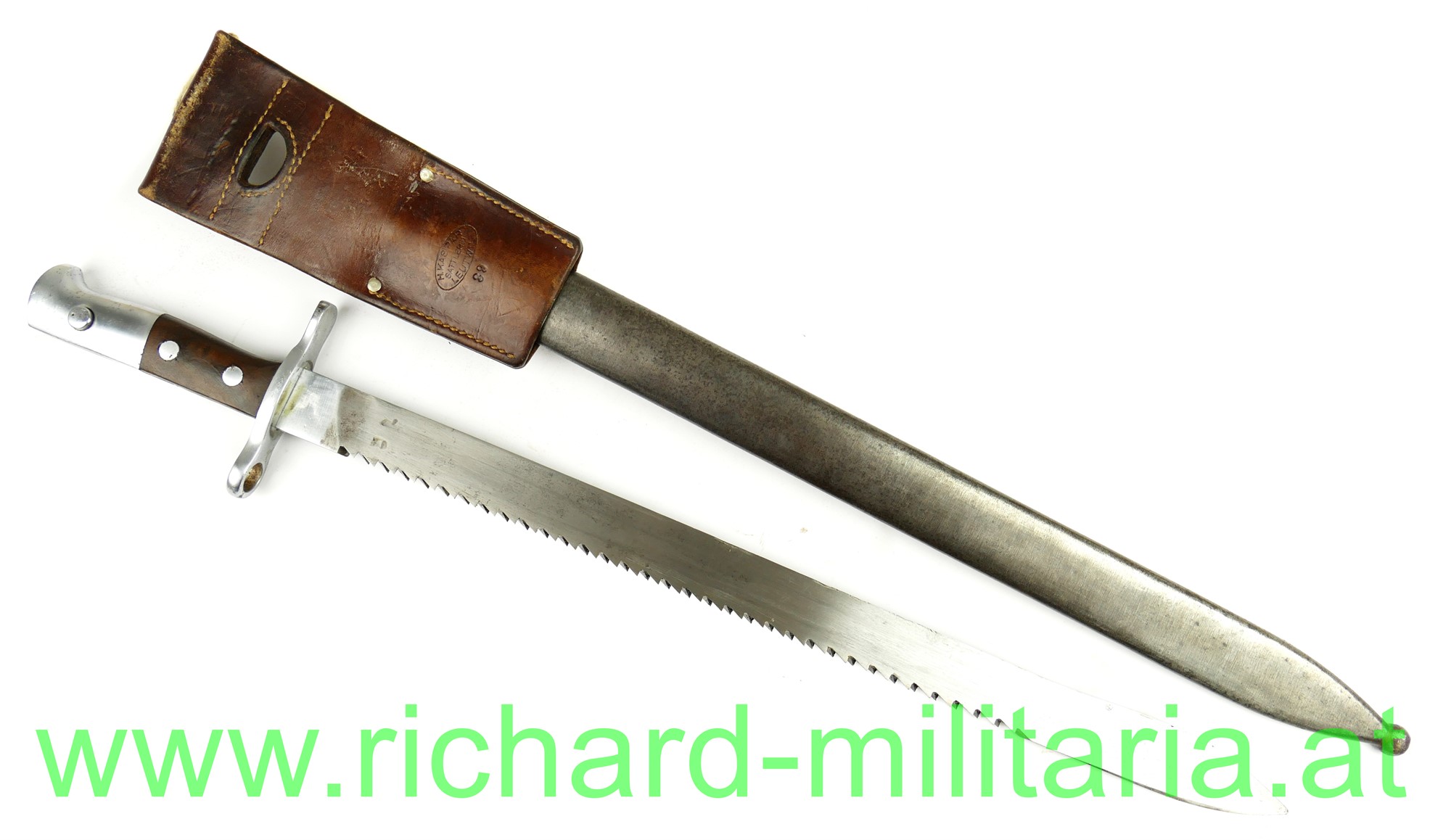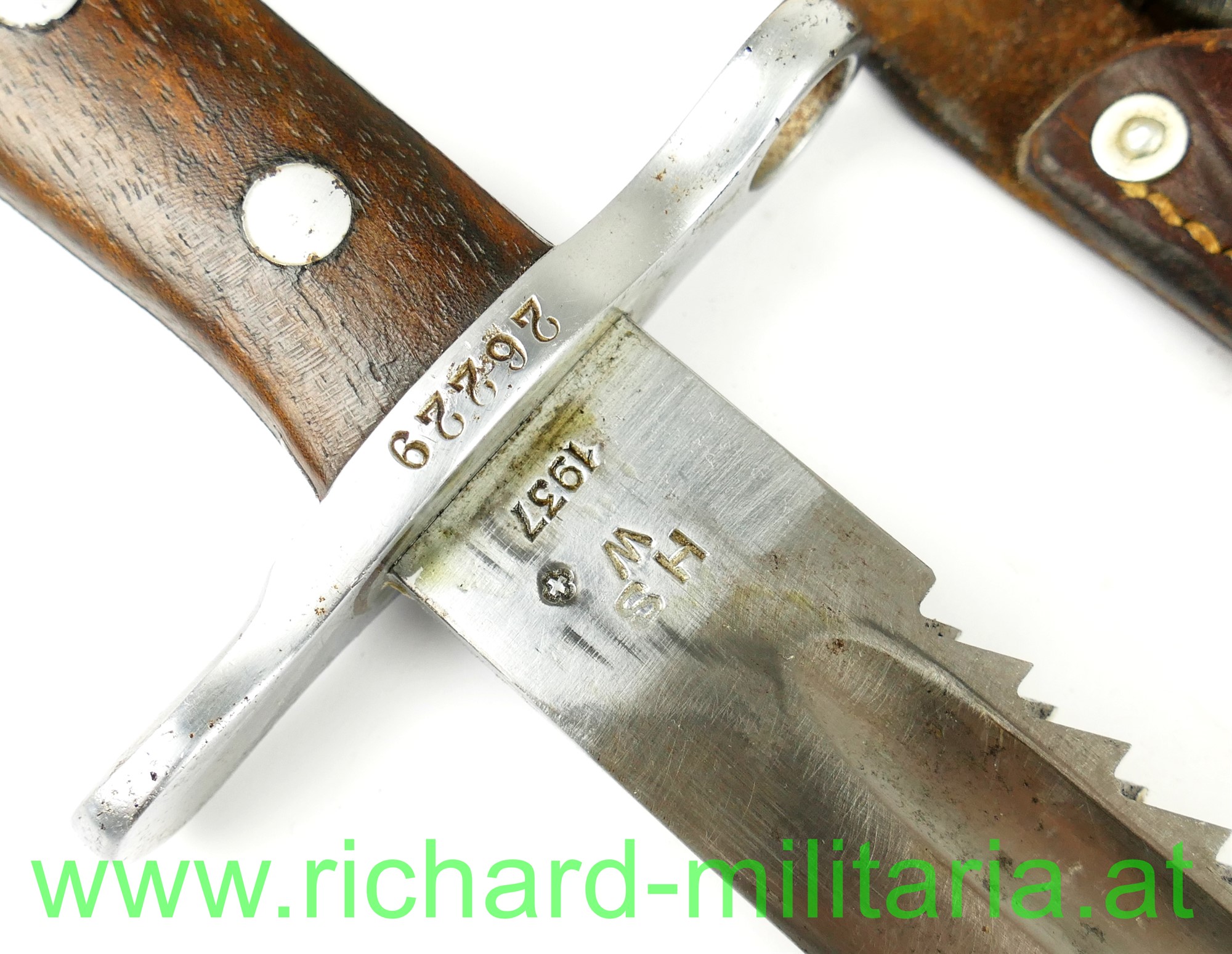 Schweiz Pionier-Bajonett Modell 1914 komplett mit Scheide und Lederhänger, Hersteller: "HSW - 1937" auf der einseitig gekehlten Klinge, original vernietete Holzgriffschalen, Waffennummer "26229" und Schweizer Kreuz in der Parierstange, Markierung an der Scheide, Koppeltrageschuh mit Hersteller und Baujahr (39) gestempelt;