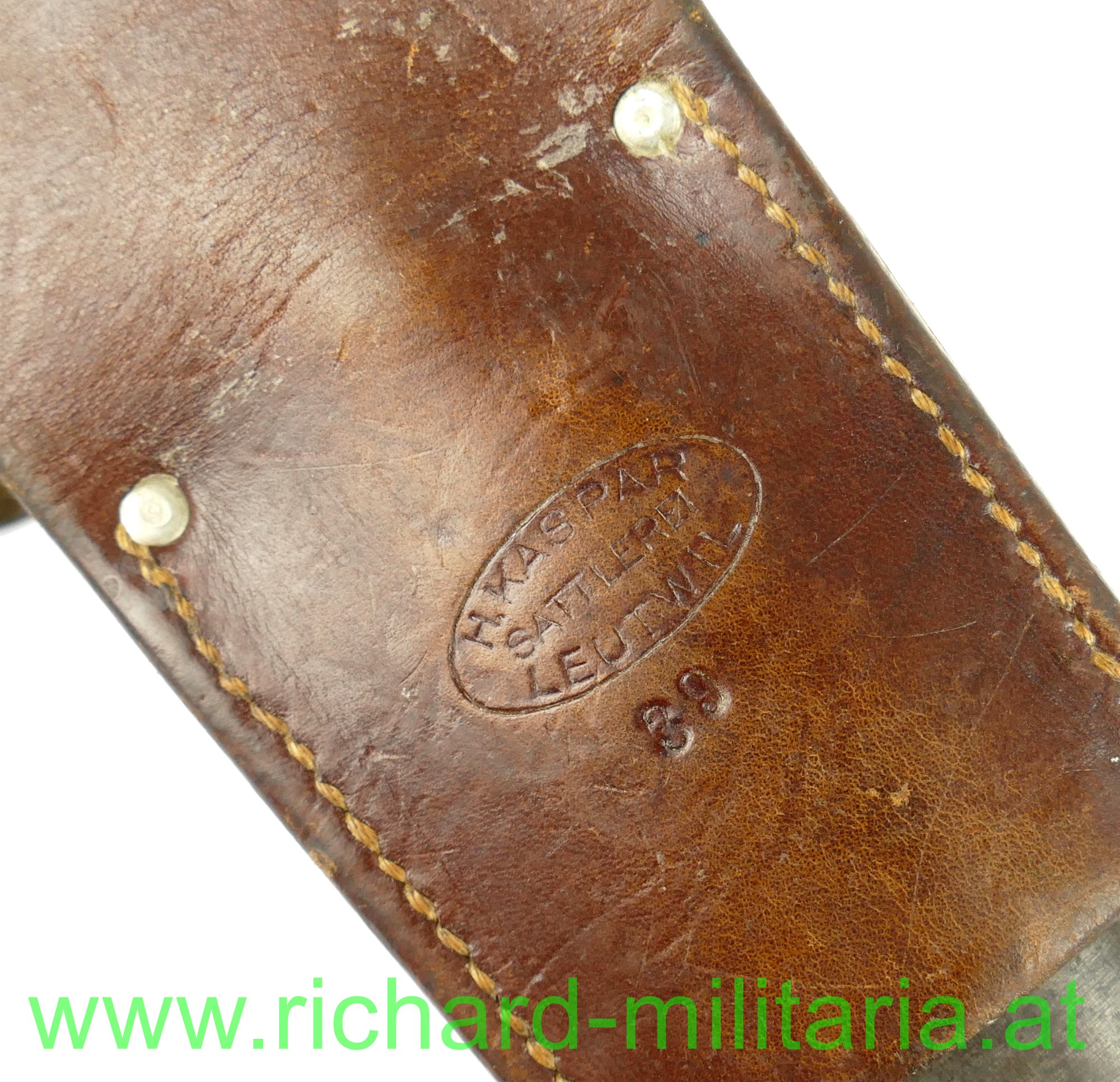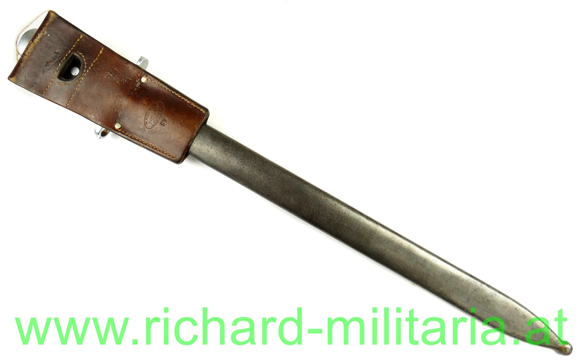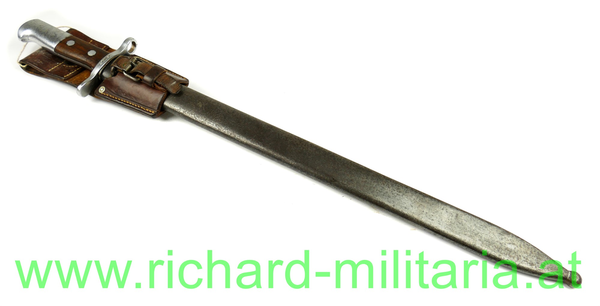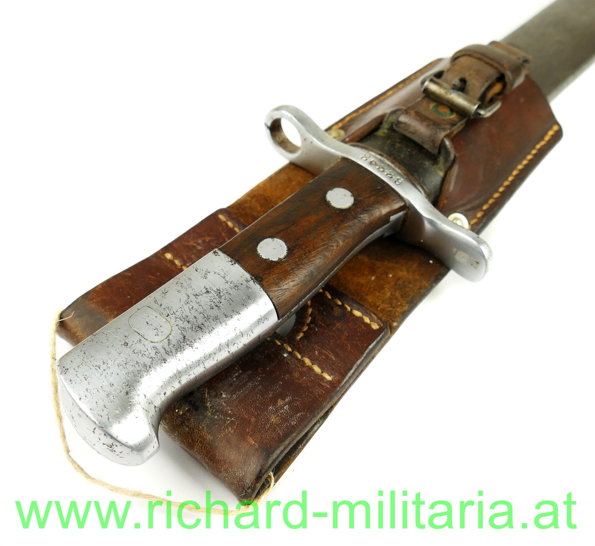 Schweiz Pionier-Bajonett Modell 1914 komplett mit Scheide und Lederhänger, Hersteller: "HSW - 1937" auf der einseitig gekehlten Klinge, original vernietete Holzgriffschalen, Waffennummer "26229" und Schweizer Kreuz in der Parierstange, Markierung an der Scheide, Koppeltrageschuh mit Hersteller und Baujahr (39) gestempelt;