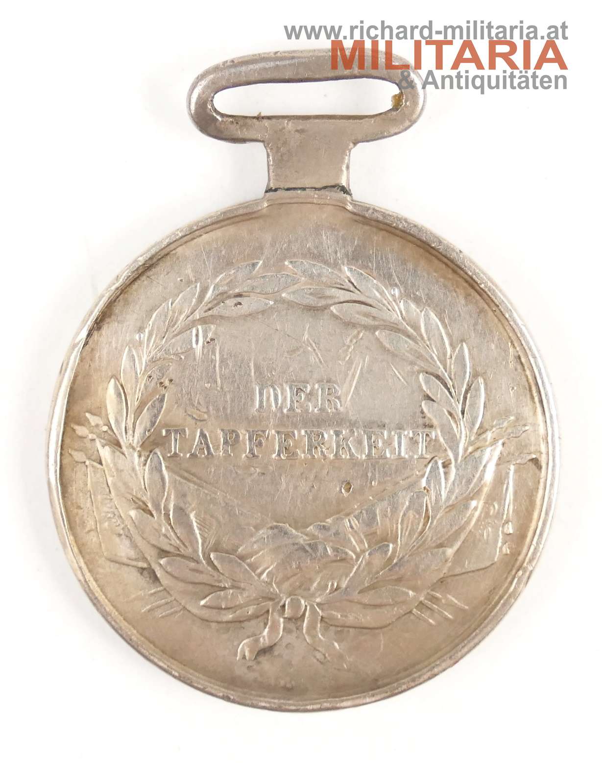 Silberne Tapferkeitsmedaille II. Klasse, Modell Kaiser Ferdinand I (1839-1848), Silber unpunziert, originaler Henkel - dieser alt repariert (Farbunterschied in einem erkennbaren Sprung am Henkel-Ansatz - kaum sichtbar); guter Zustand mit Tragespuren, leicht verputzt