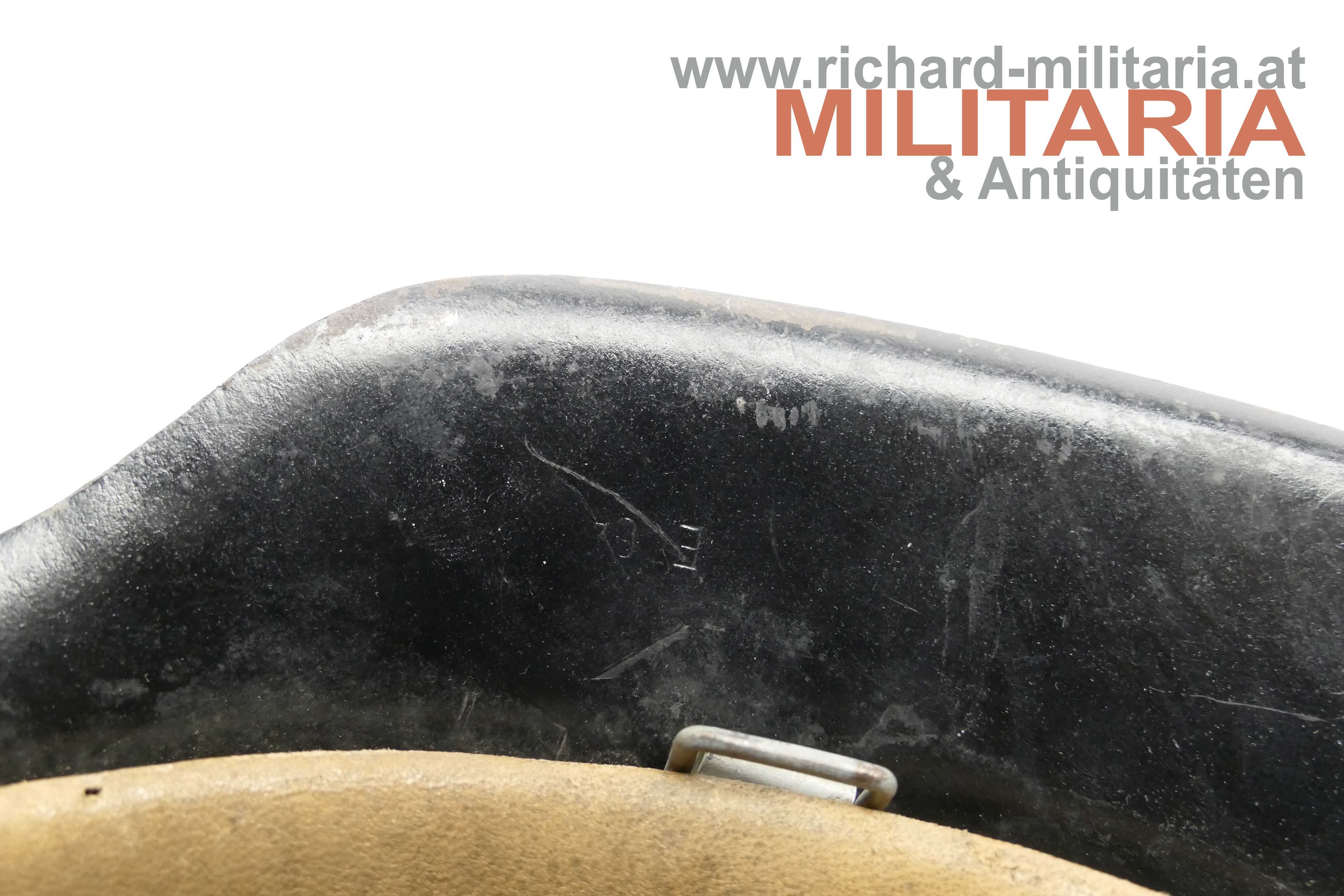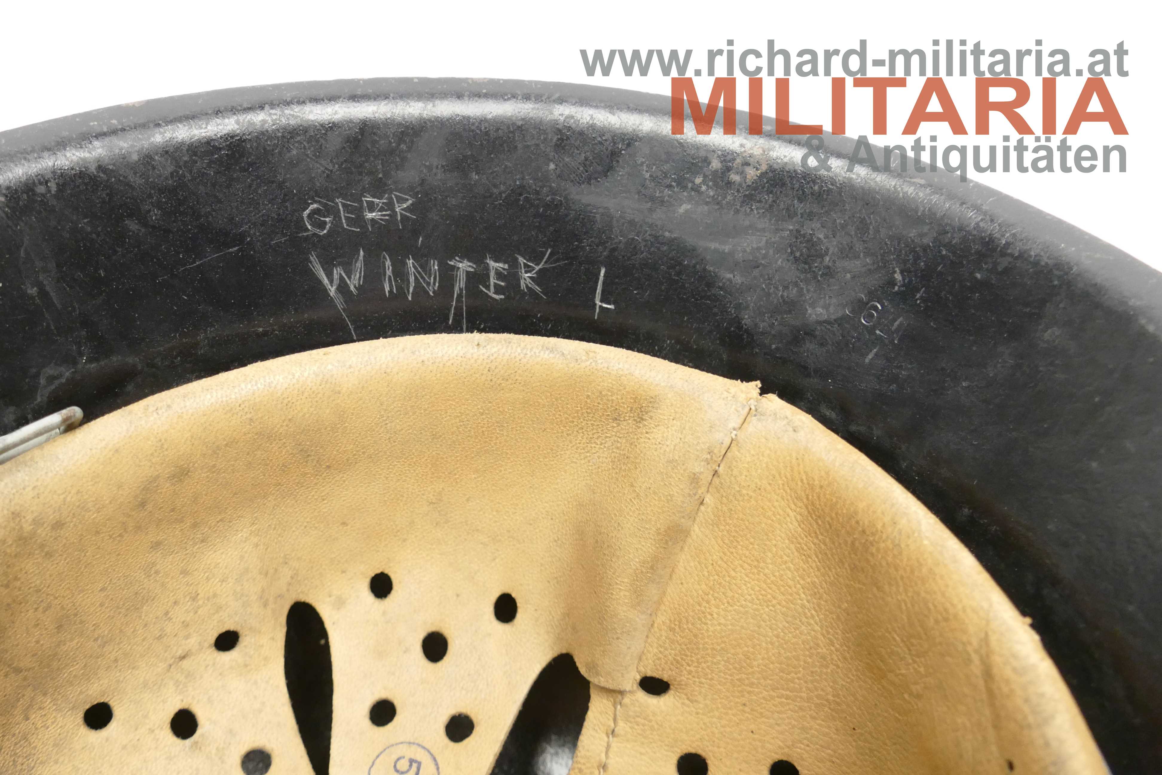 Stahlhelm M42 - Nachkriegsverwendung; originale Glocke - schwarz überlackiert; innen seitlich Kennung "E64" und im Nacken "179.."; händisch eingekratzt "Gefr. Winter L"; originaler Innenhelme; Leder auf der Rückseite gestempelt.