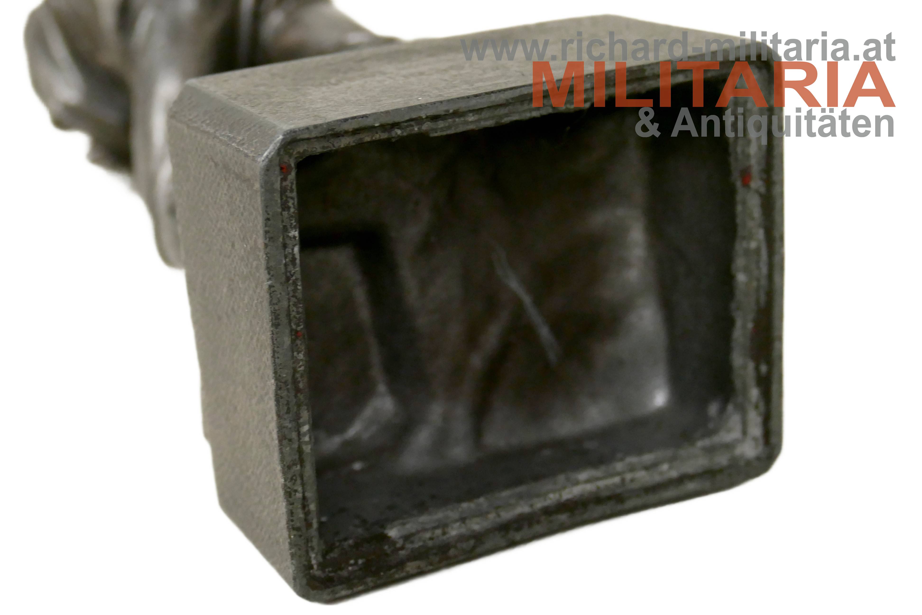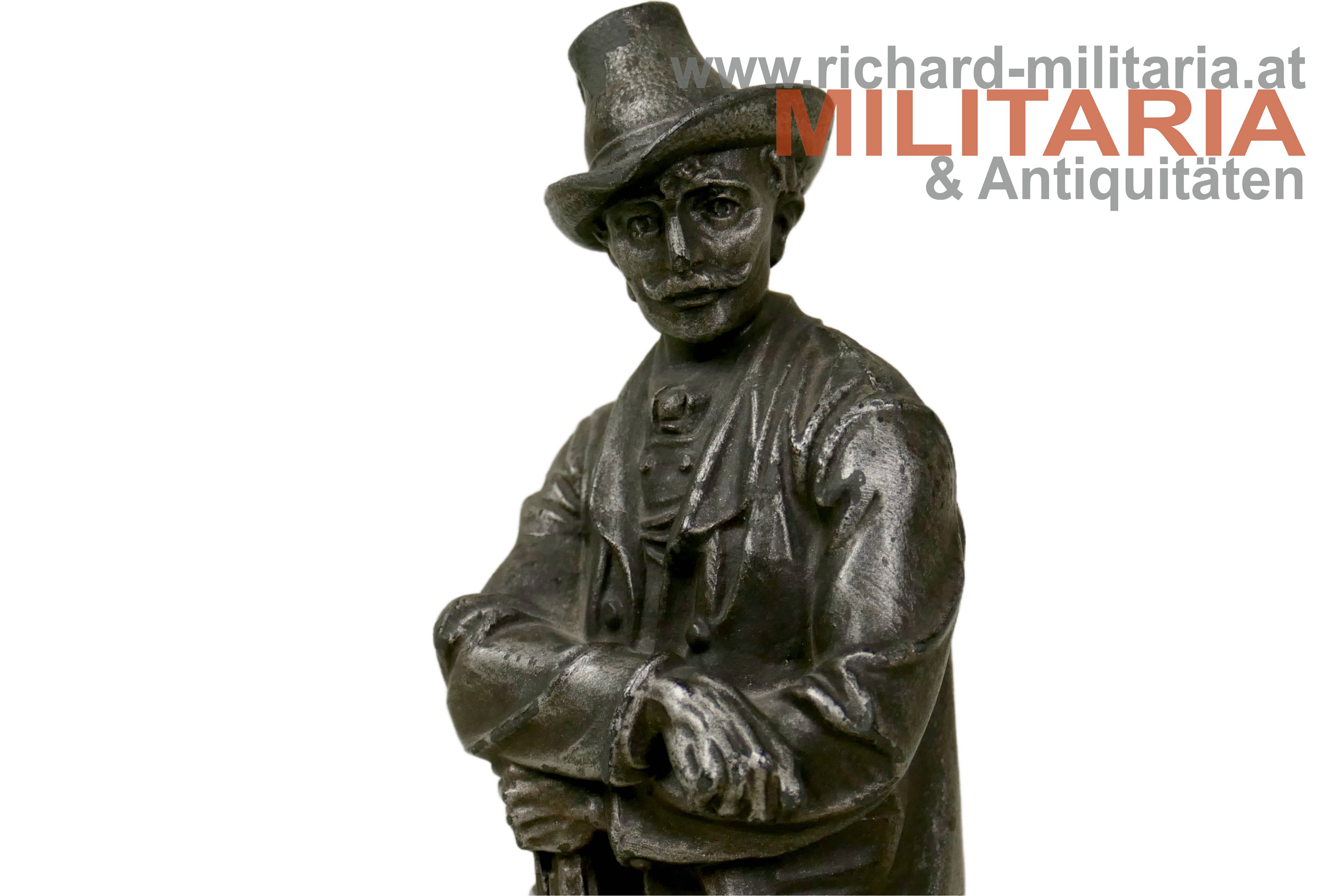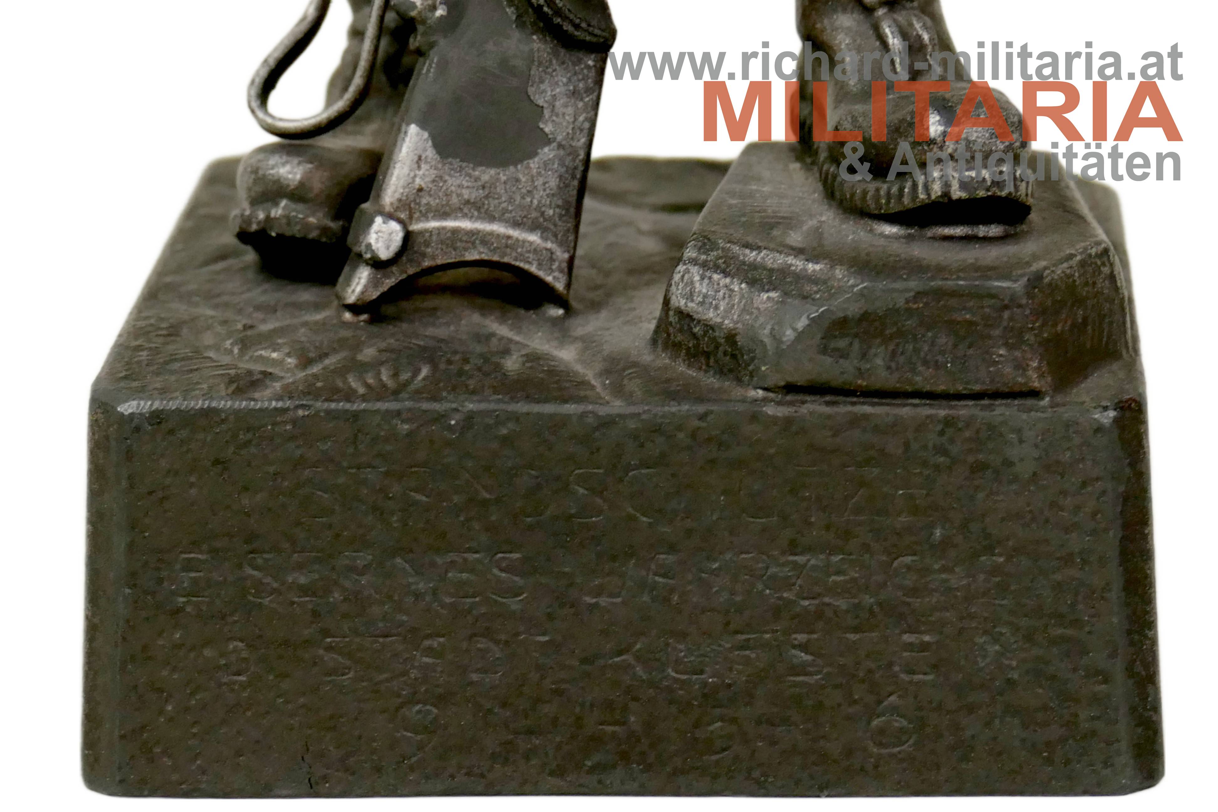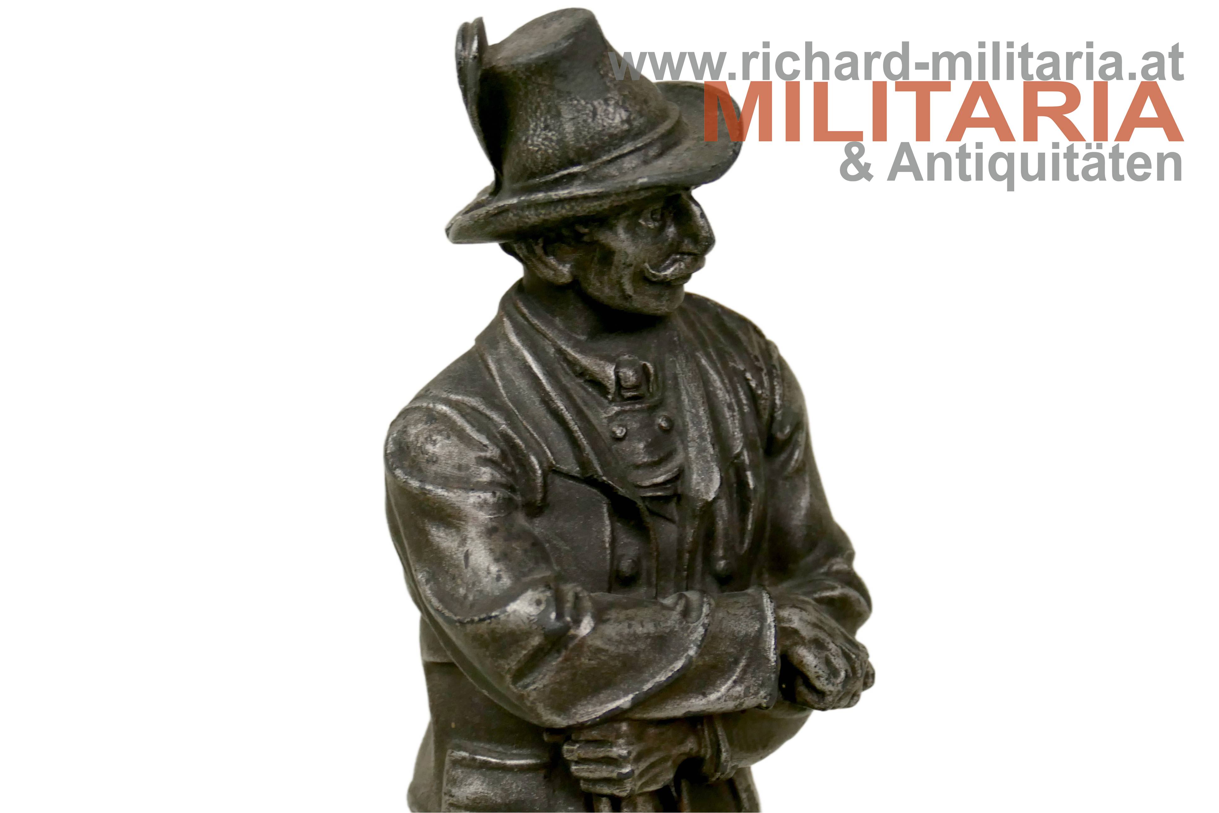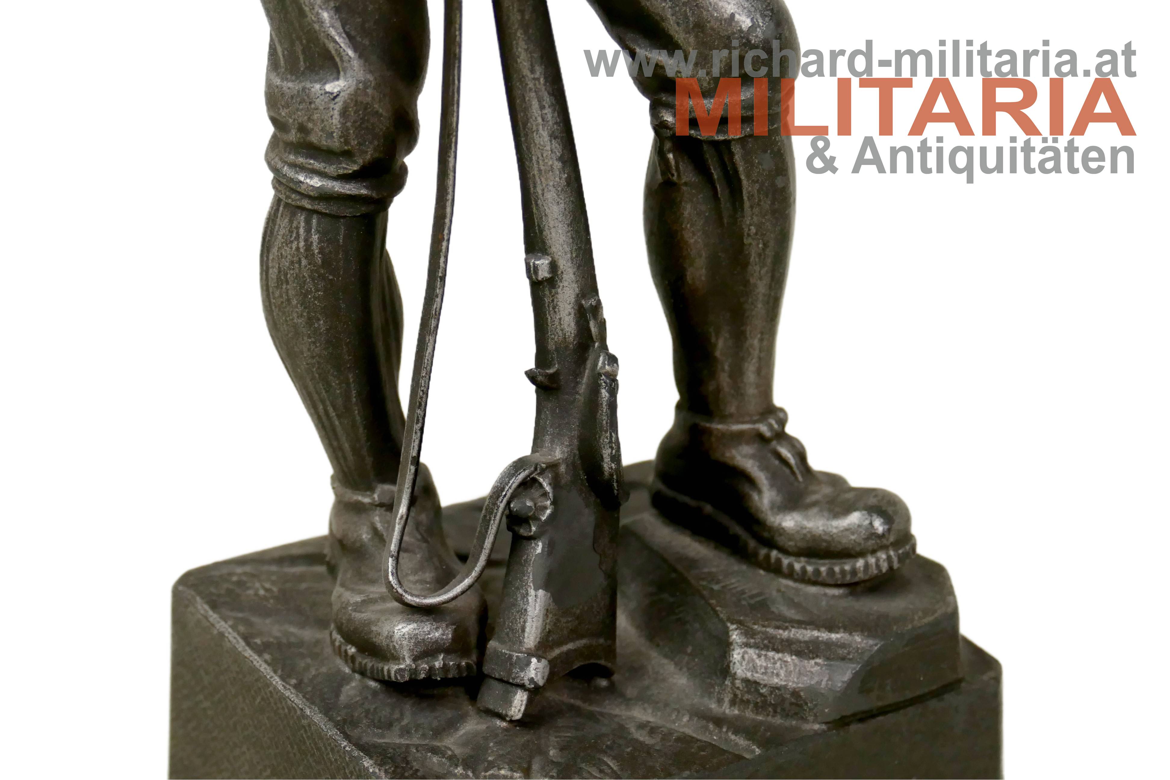 Figur "Standschütze Eisernes Wahrzeichen d. Stadt Kufstein 1914-15-16", Zinkguss, am Sockel auf der Rückseite Aufschrift "Zu Gunsten d. kufst. Kriegsschatzes z. Fürsorge f. W.W. u. Invalide." und Meistermarke "Joh. Enrich", Darstellung eines Tiroler Standschützen in Volkstracht auf sein altes Vorderladergewehr gestützt; Höhe ca. 24 cm