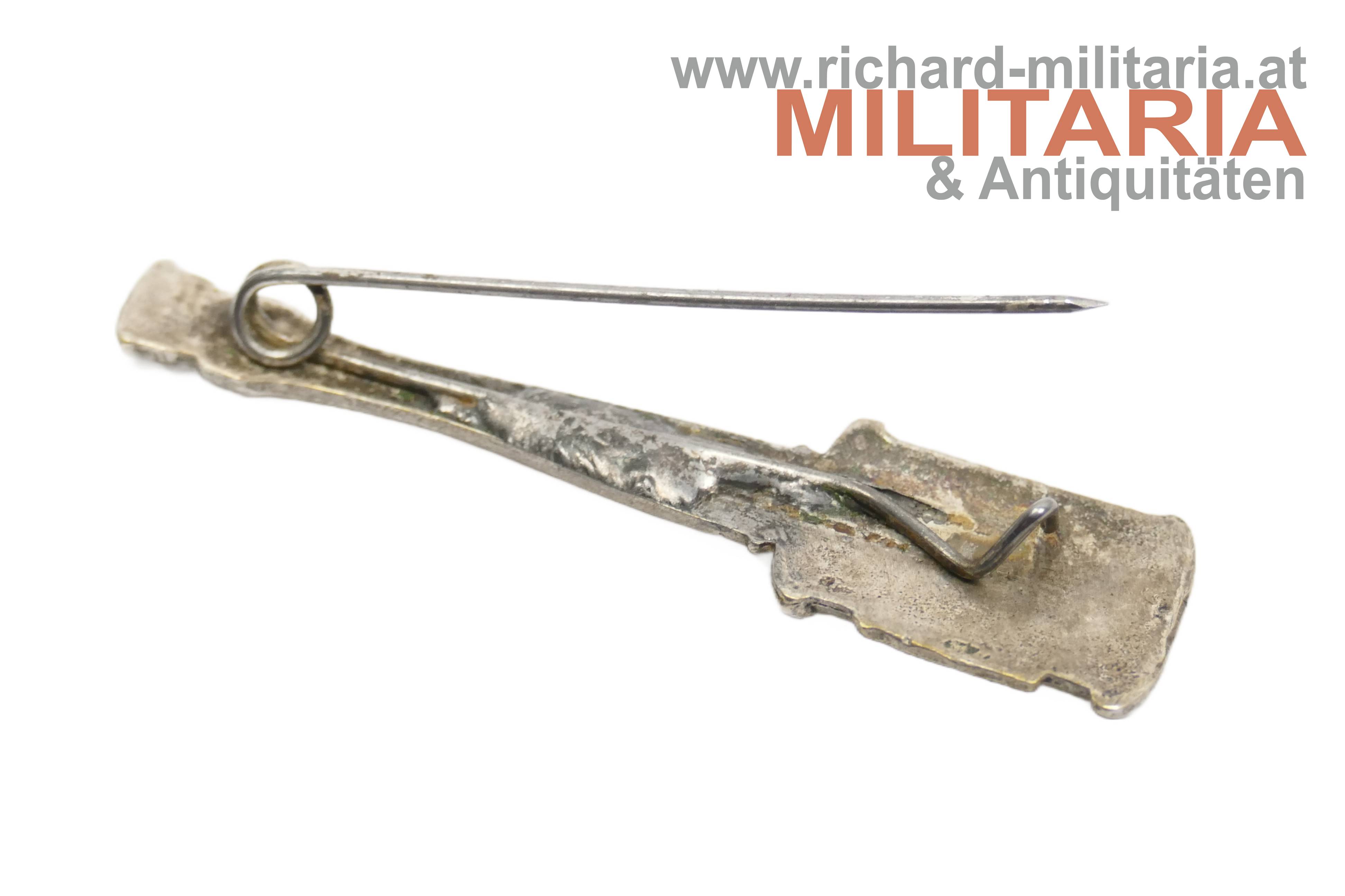Stielhandgranaten-Abzeichen - kyrillisch beschrieben und datiert 1915; Tombak versilbert; mit angelötetem Nadelsystem;