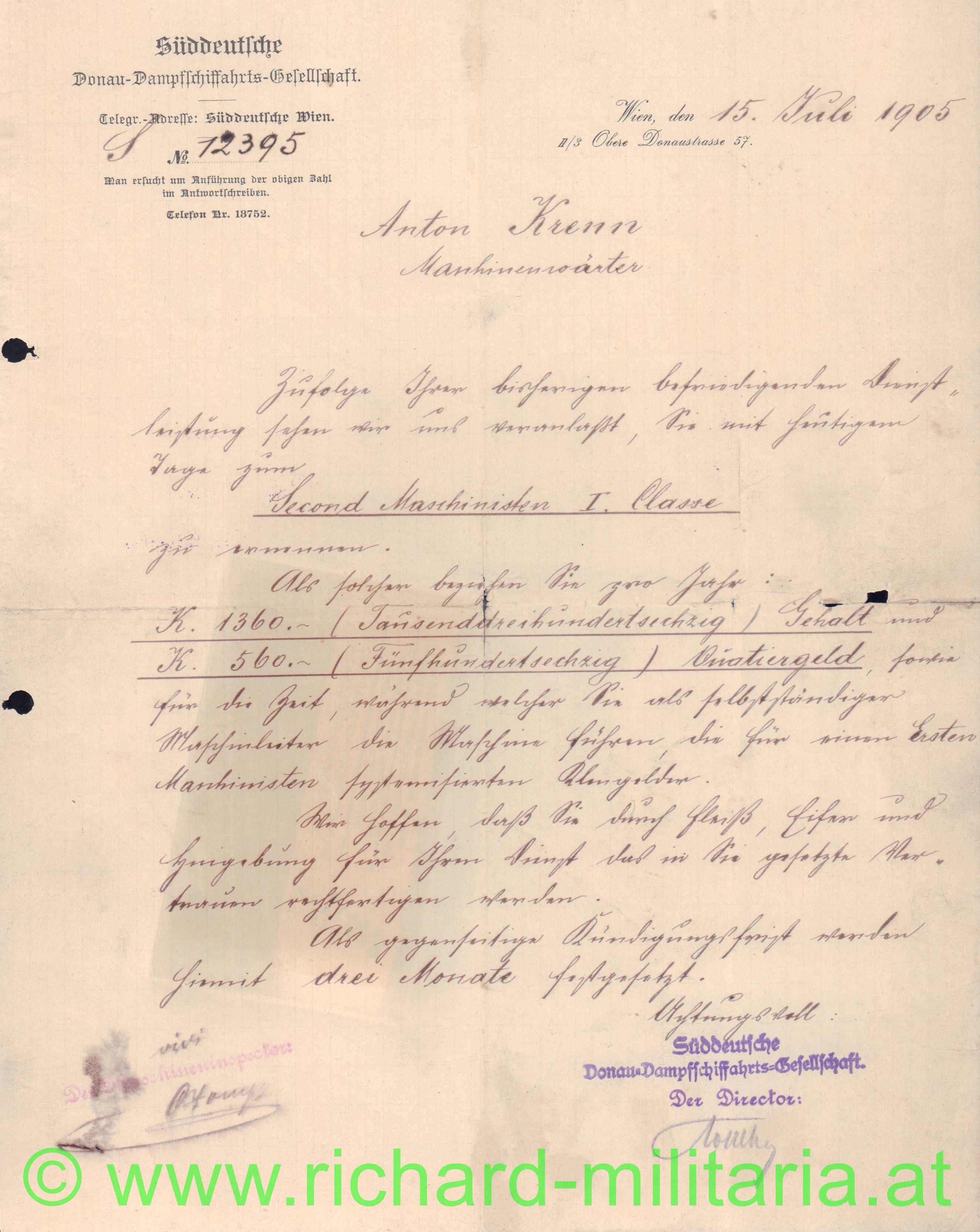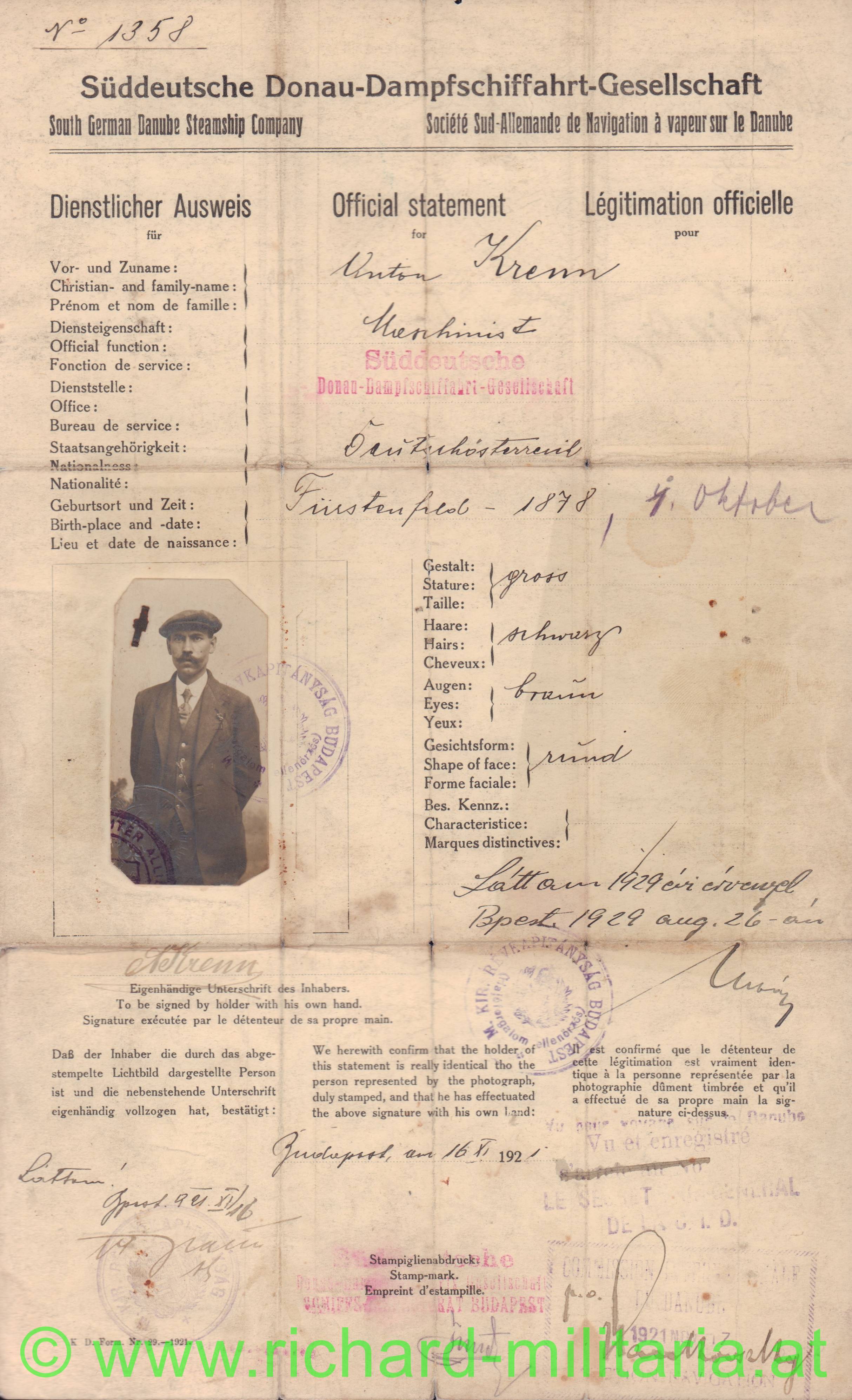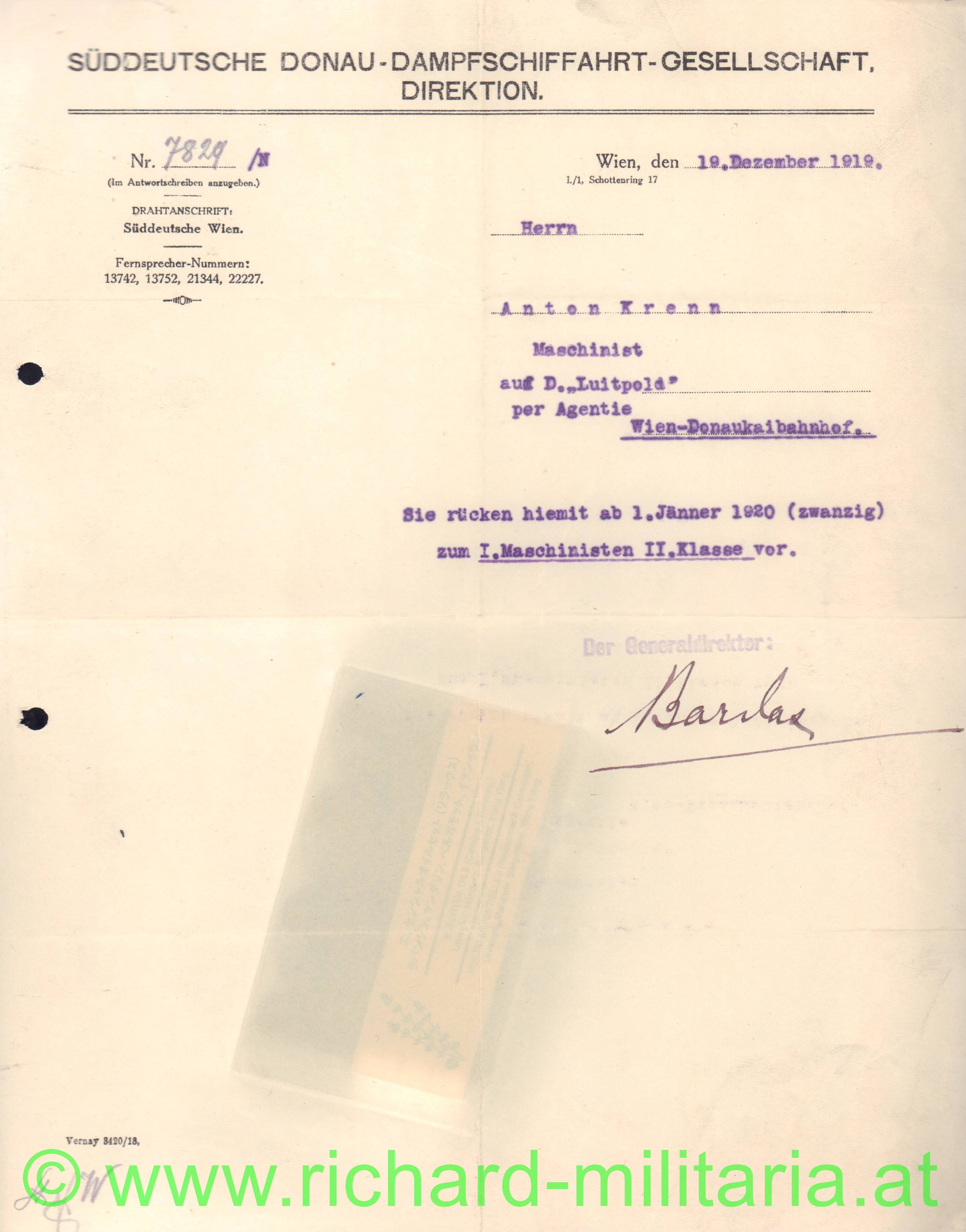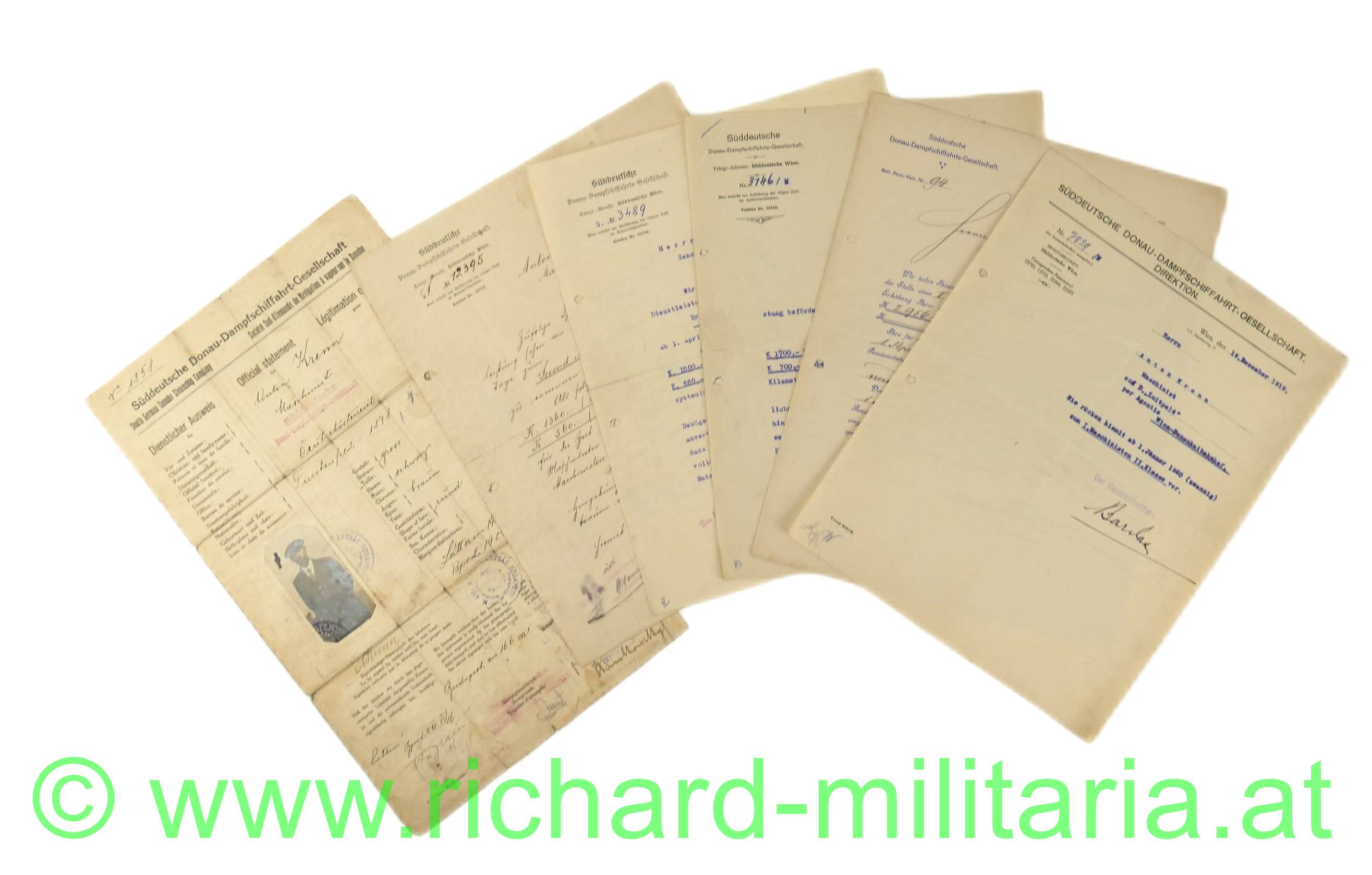 Dokumentenkonvolut des Maschinisten Anton Krenn bei der "Süddeutschen Donau Dampfschiffahrt-Gesellschaft"