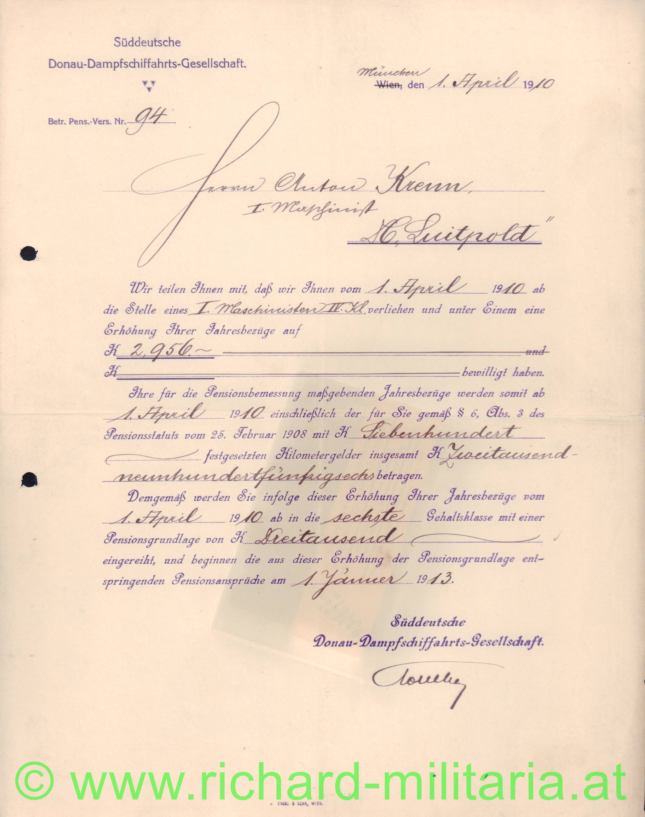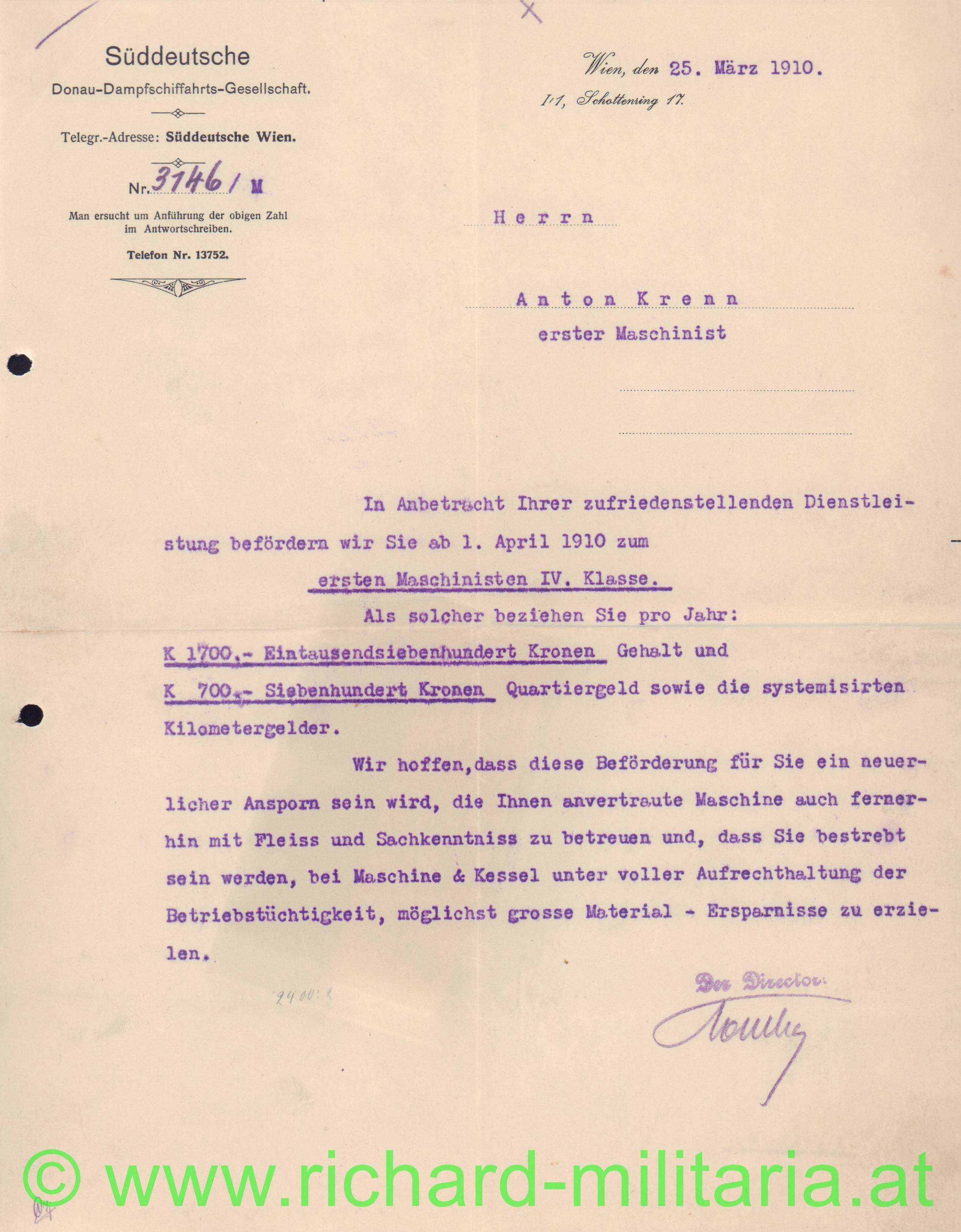 - Beförderungsbrief zum Ersten Maschinisten IV. Klasse vom 25.3.1910