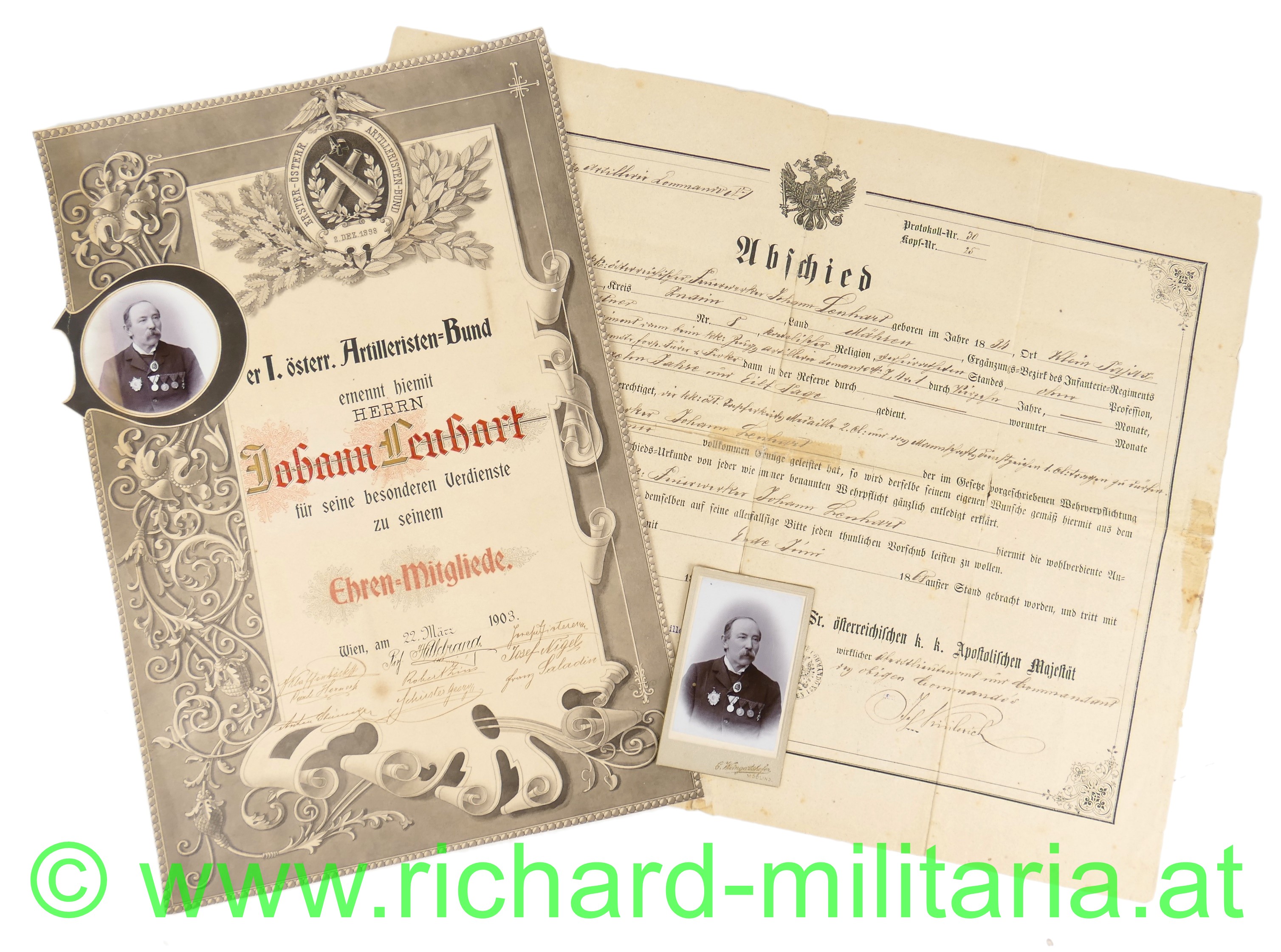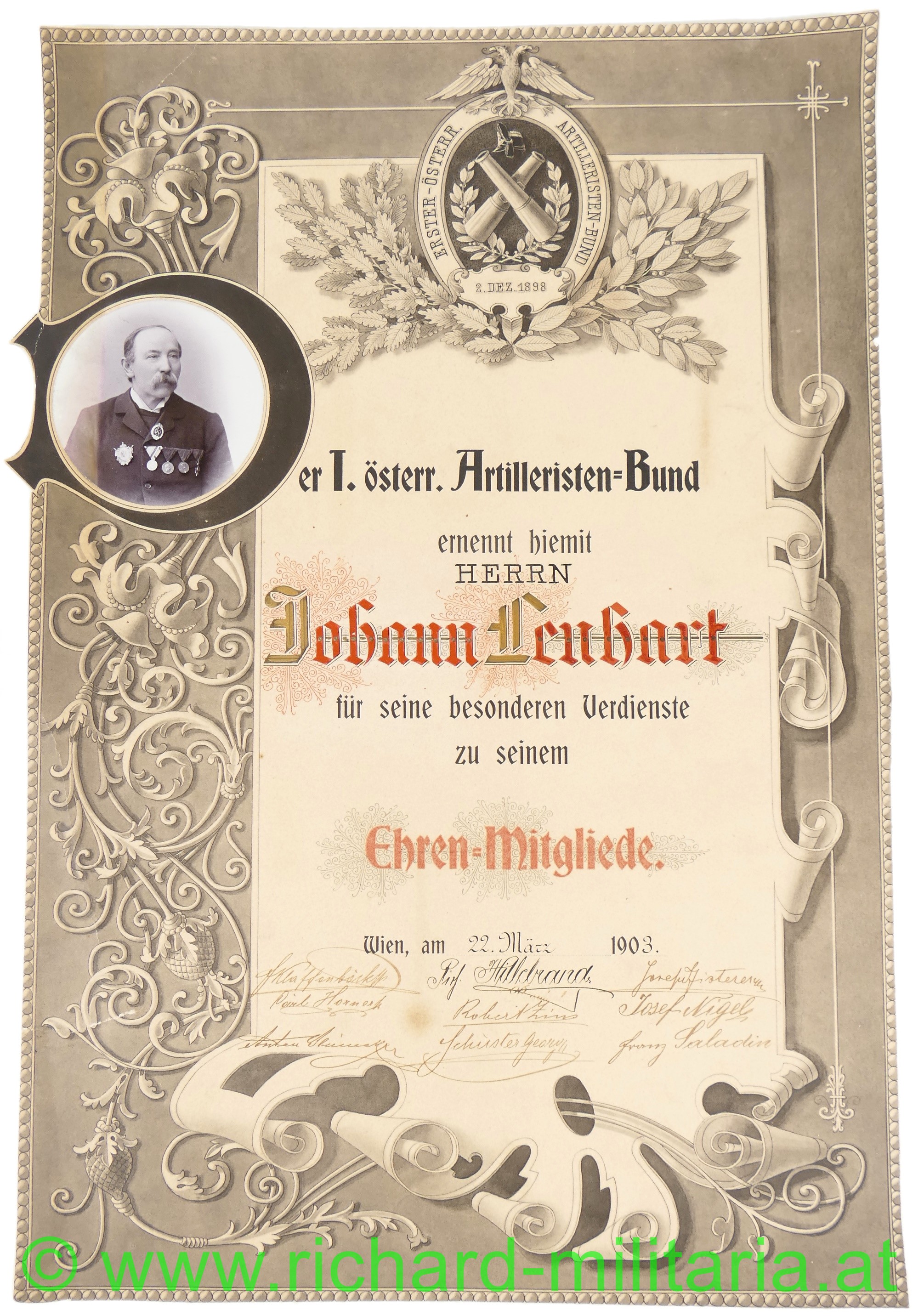 - große Urkunde des ersten österr. Artilleristen-Bundes mit Ernennung zum Ehrenmitglied, ausgestellt 1903; Kartonpapier mit eingesetztem Foto; kleiner Randeinriss links; Überformat A4