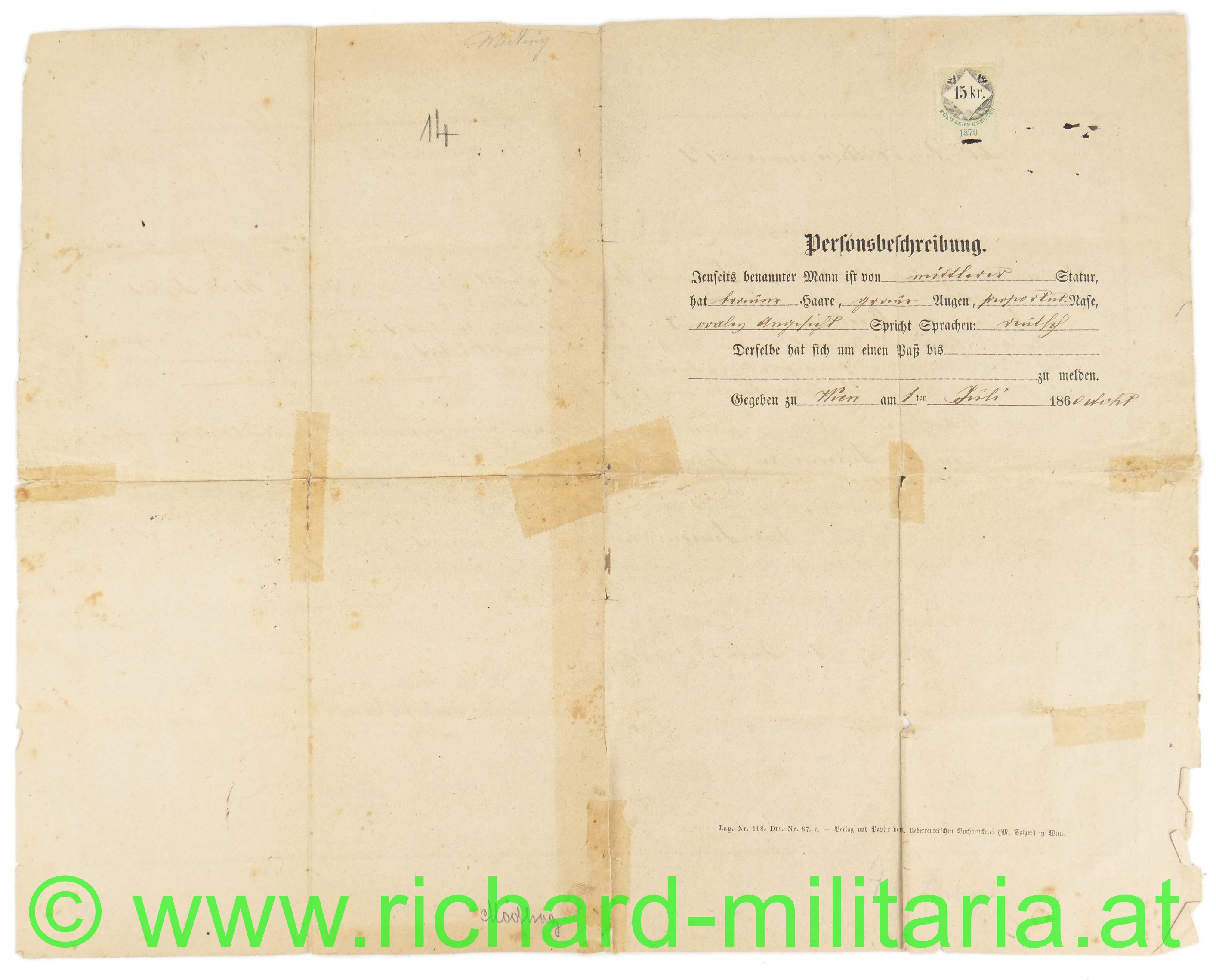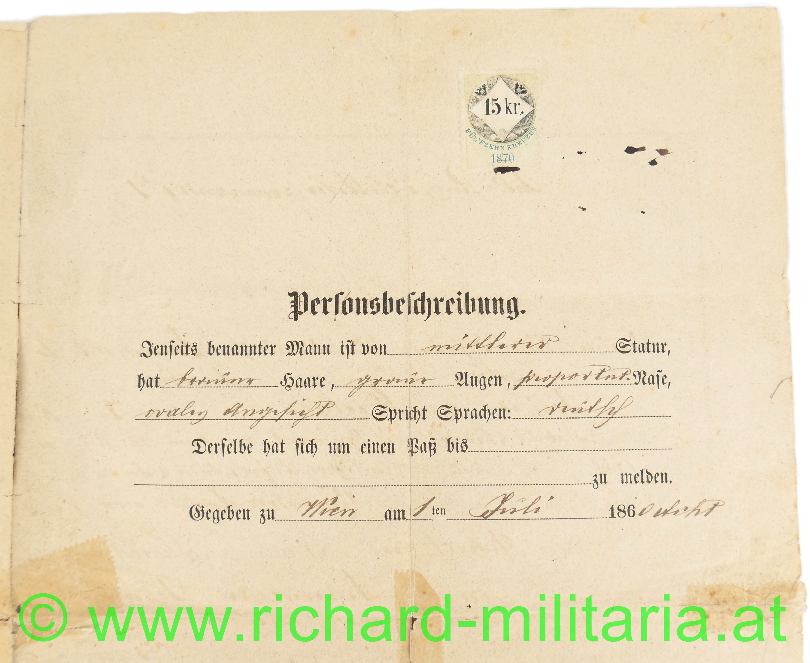 - Abschied ausgestellt am 1. Juli 1868 mit Trageberechtigung der k.k. österreichischen Tapferkeitsmedaille 2. Cl. und der Mannschafts-Dienstauszeichnung 1. Cl.; dazu Stempelung "Die Jubiläums-Medaille zuerkannt und erfolgt. 1898"; gefaltet und alte Klebestelle