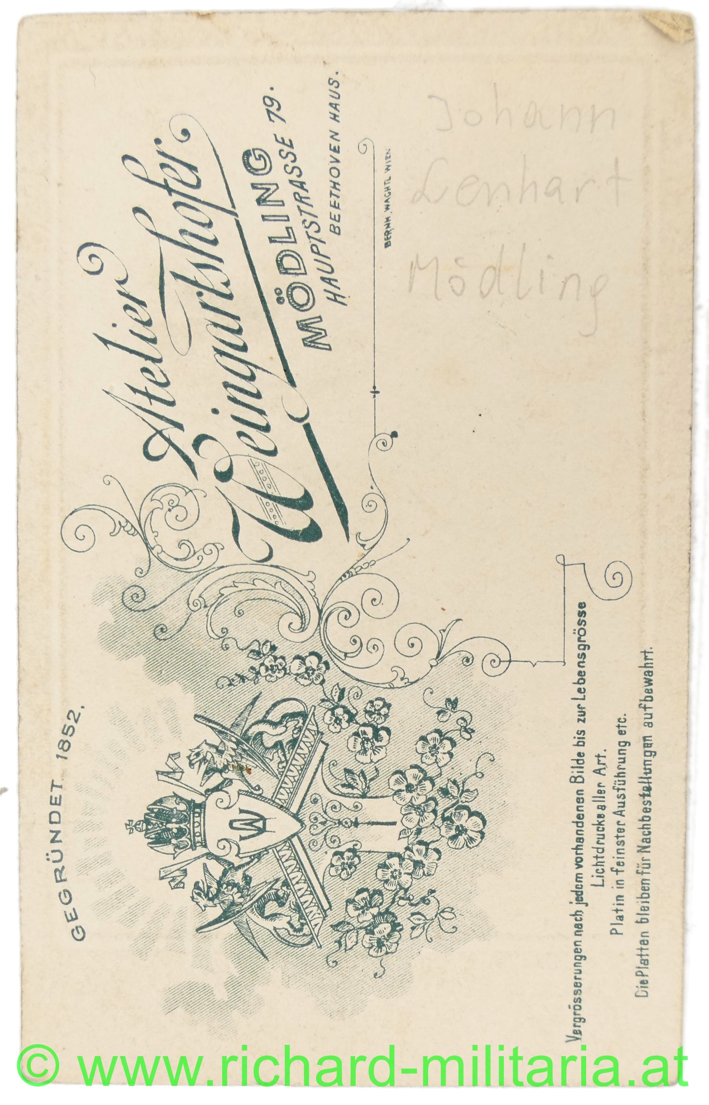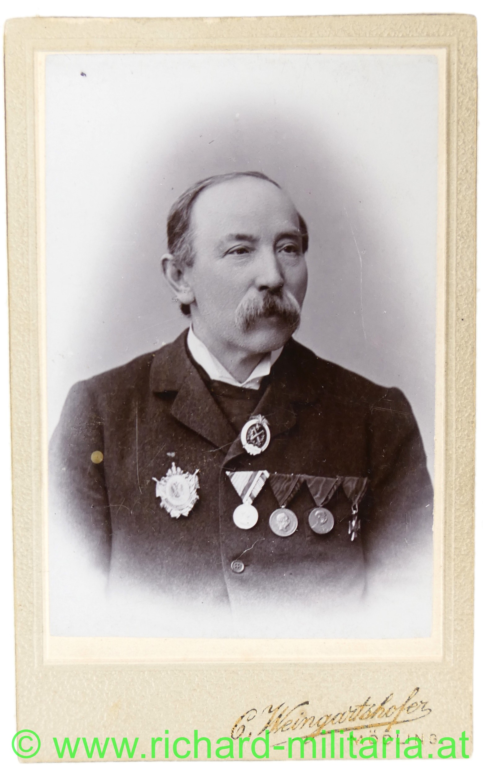 - Trägerfoto als Veteran mit Tapferkeitsmedaille, Medaille für 40 Jahre Treue Dienste; Jubiläums-Medaille 1898 und Mannschafts-Dienstauszeichnung; dazu Mitgliedsabzeichen des erst. österr. Artilleristen-Bundes und Veteranen-Abzeichen; Hartkarton CvD