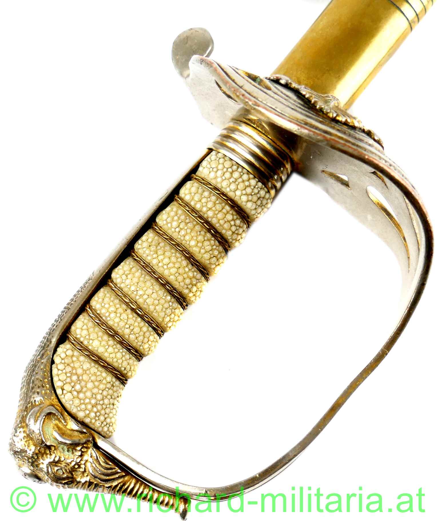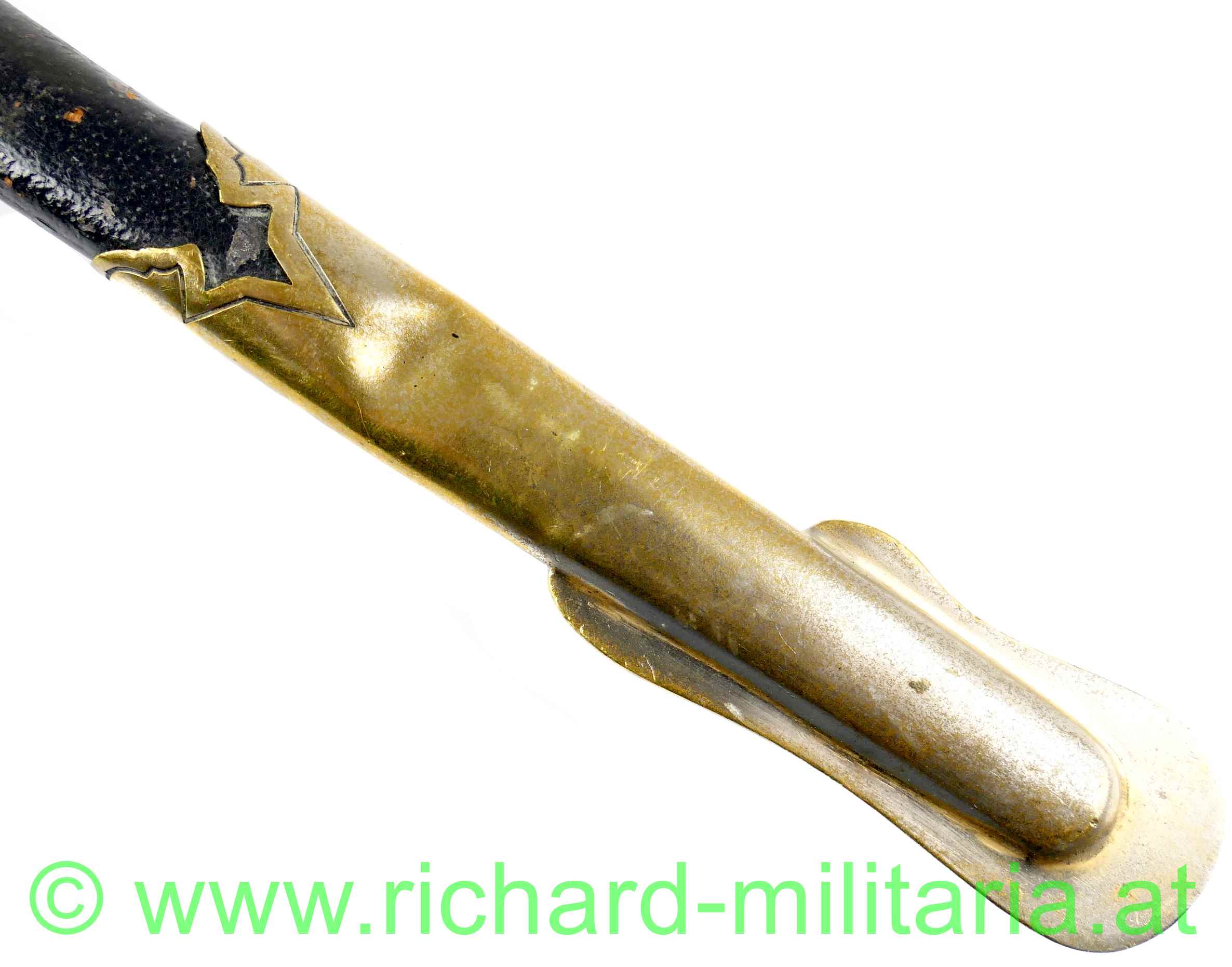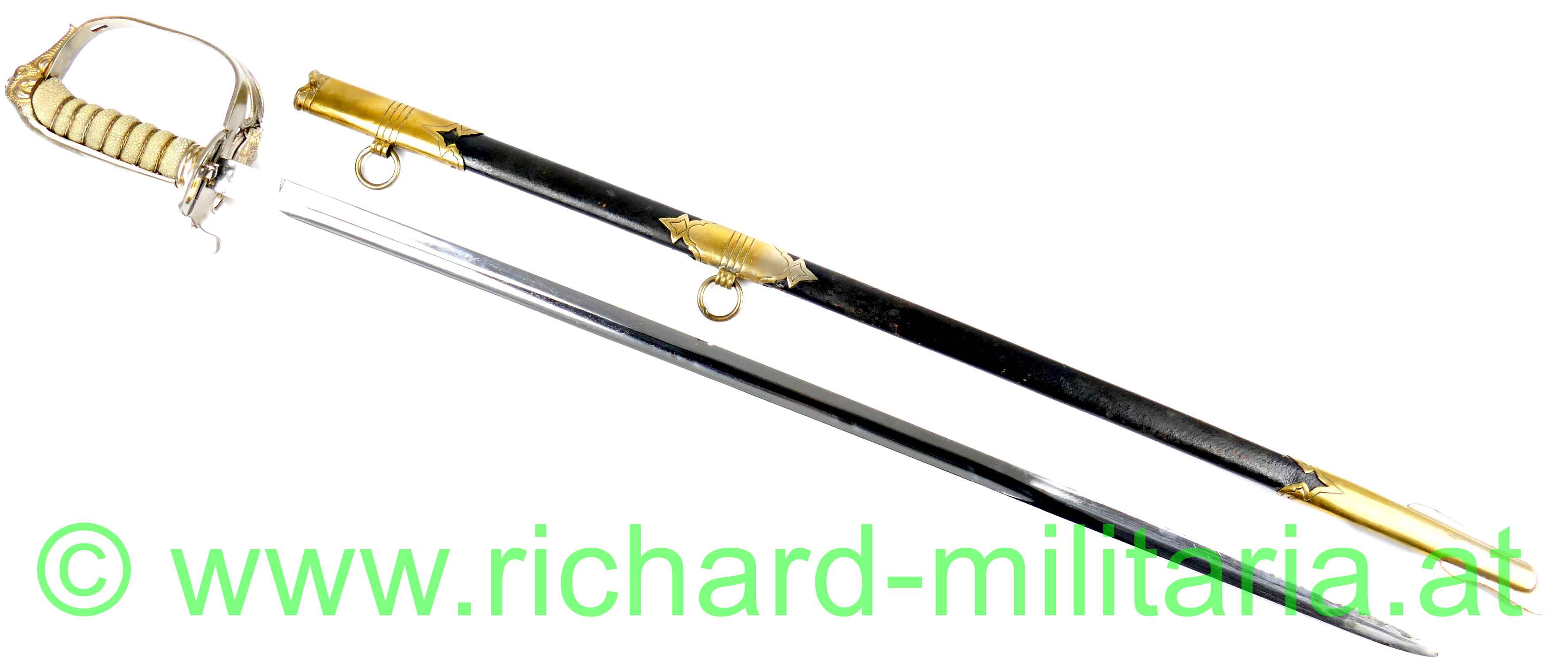 Thailand - Offizierssäbel; verzierter und versilberter Messinggriff; Griffkopf in der Form eines vergoldeten Elefantenkopfes mit ausgestrecktem Rüssel; am Stichblatt das vergoldete Wappen von Thailand; Griff mit weißer grober Fischhaut und Drahtwicklung; gerade beidseitig gekehlte und vernickelte Klinge mit undeutlichem Hersteller; schwarze Lederscheide mit Messingbeschlägen; auf der Rückseite des Griffes herunterklappbares Sicherung mit Gegenkopf auf der Scheide; Scheide im unteren Bereich mit einer Delle im Messingbeschlag
