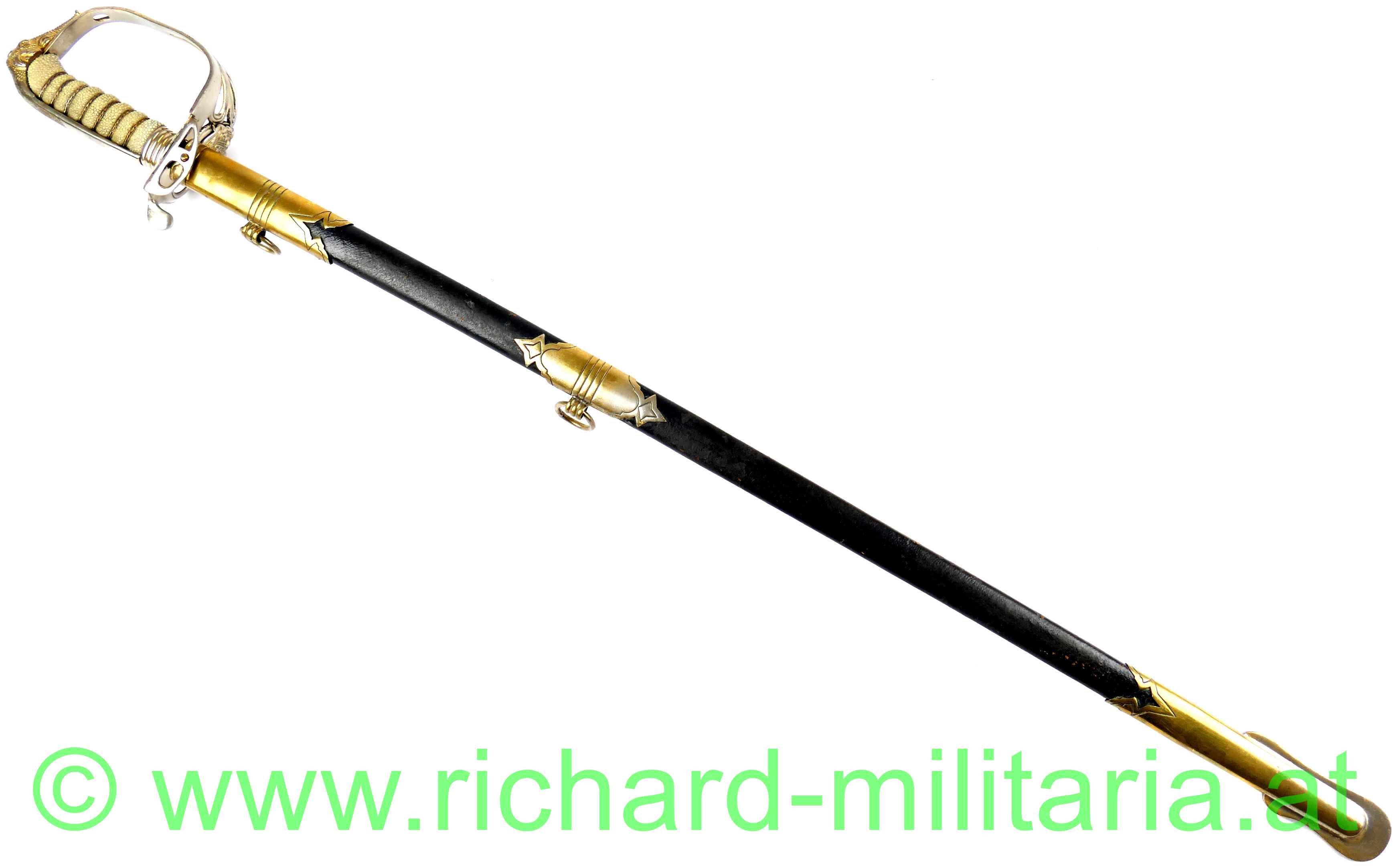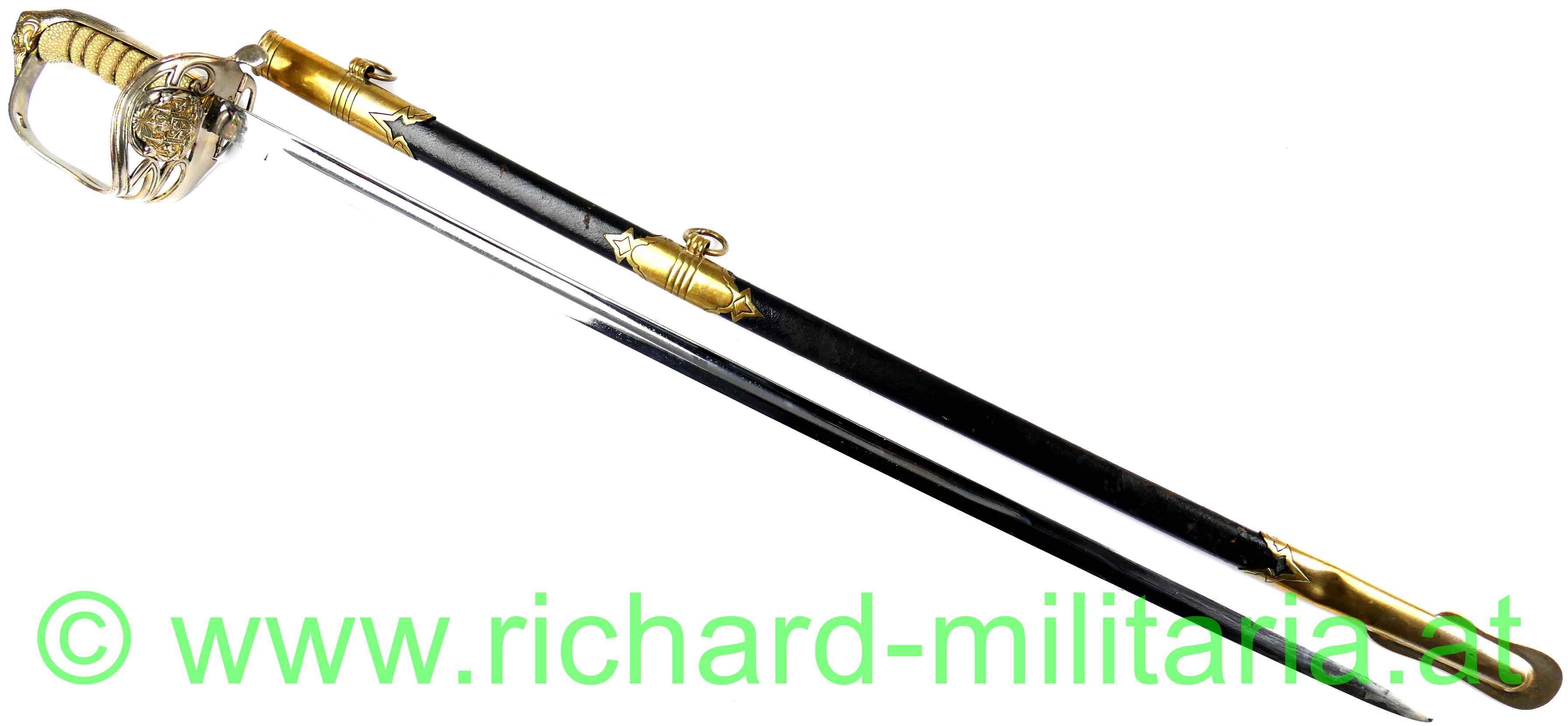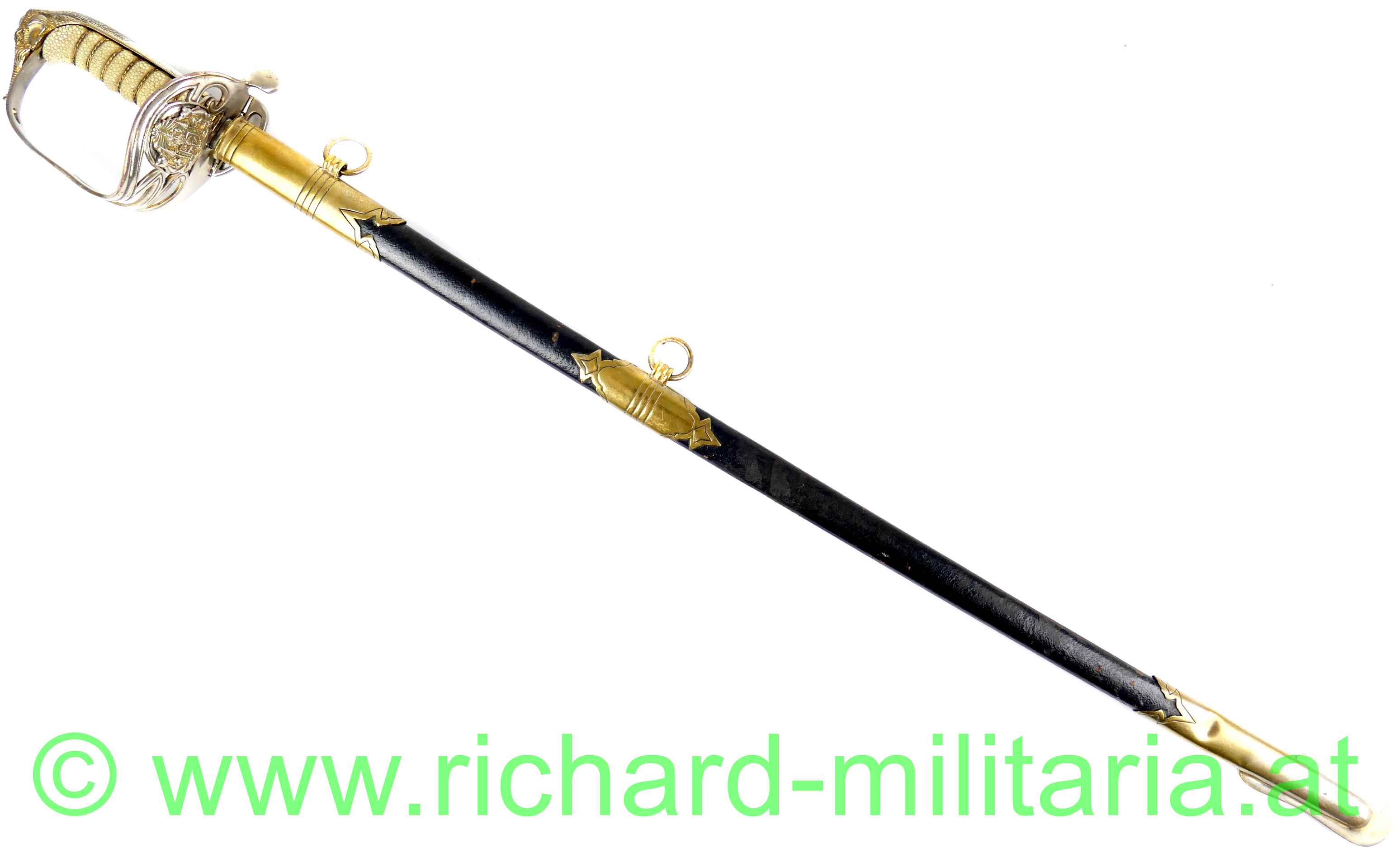 Thailand - Offizierssäbel; verzierter und versilberter Messinggriff; Griffkopf in der Form eines vergoldeten Elefantenkopfes mit ausgestrecktem Rüssel; am Stichblatt das vergoldete Wappen von Thailand; Griff mit weißer grober Fischhaut und Drahtwicklung; gerade beidseitig gekehlte und vernickelte Klinge mit undeutlichem Hersteller; schwarze Lederscheide mit Messingbeschlägen; auf der Rückseite des Griffes herunterklappbares Sicherung mit Gegenkopf auf der Scheide; Scheide im unteren Bereich mit einer Delle im Messingbeschlag