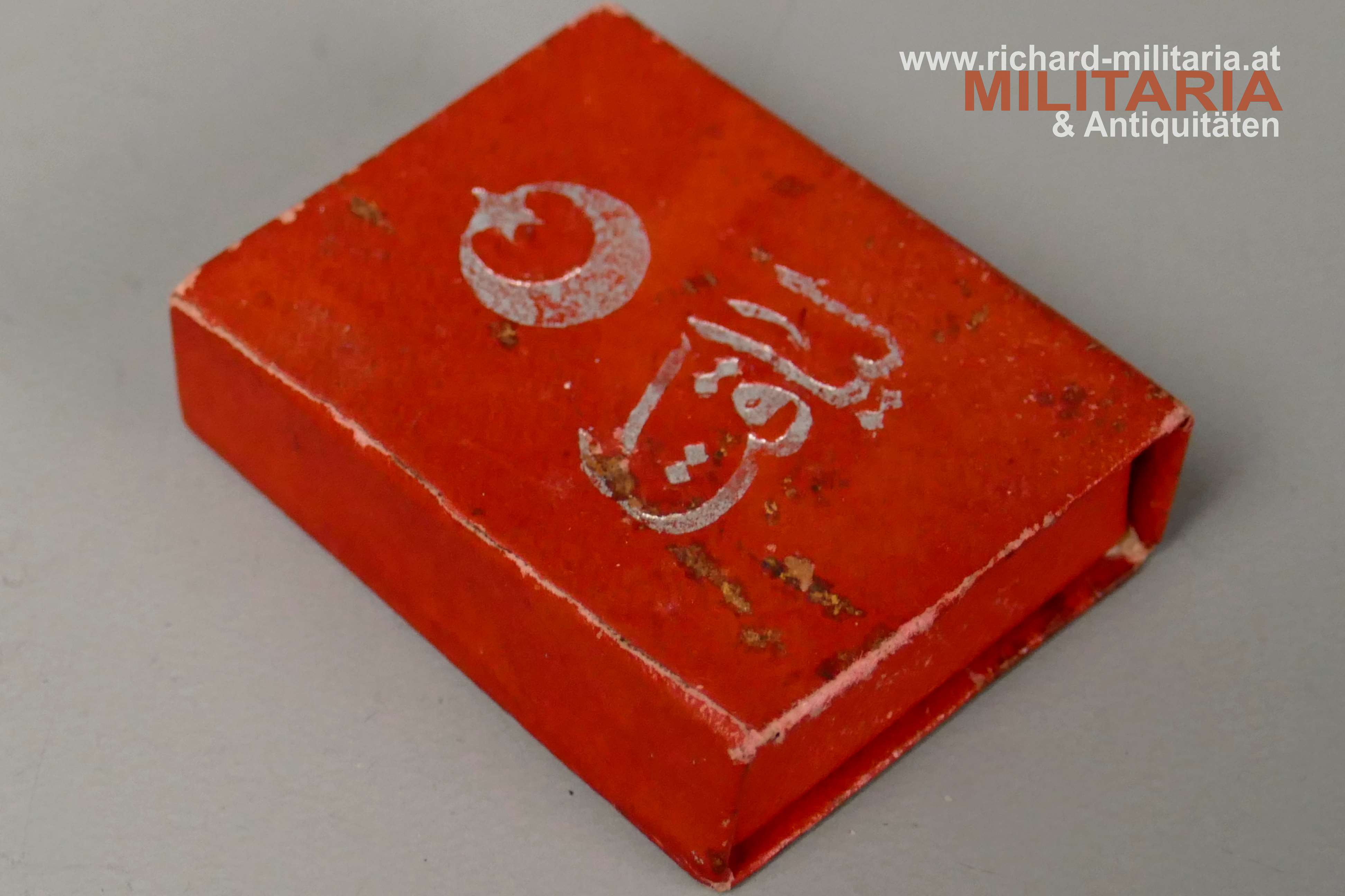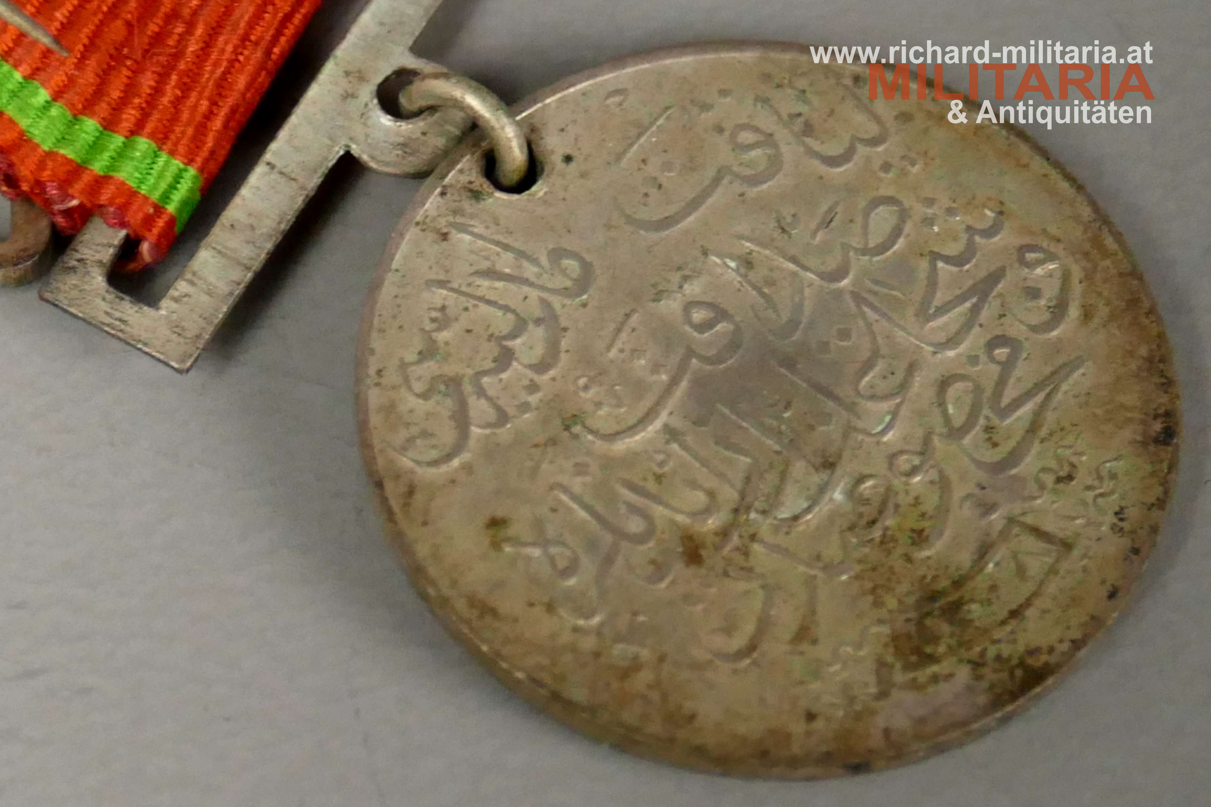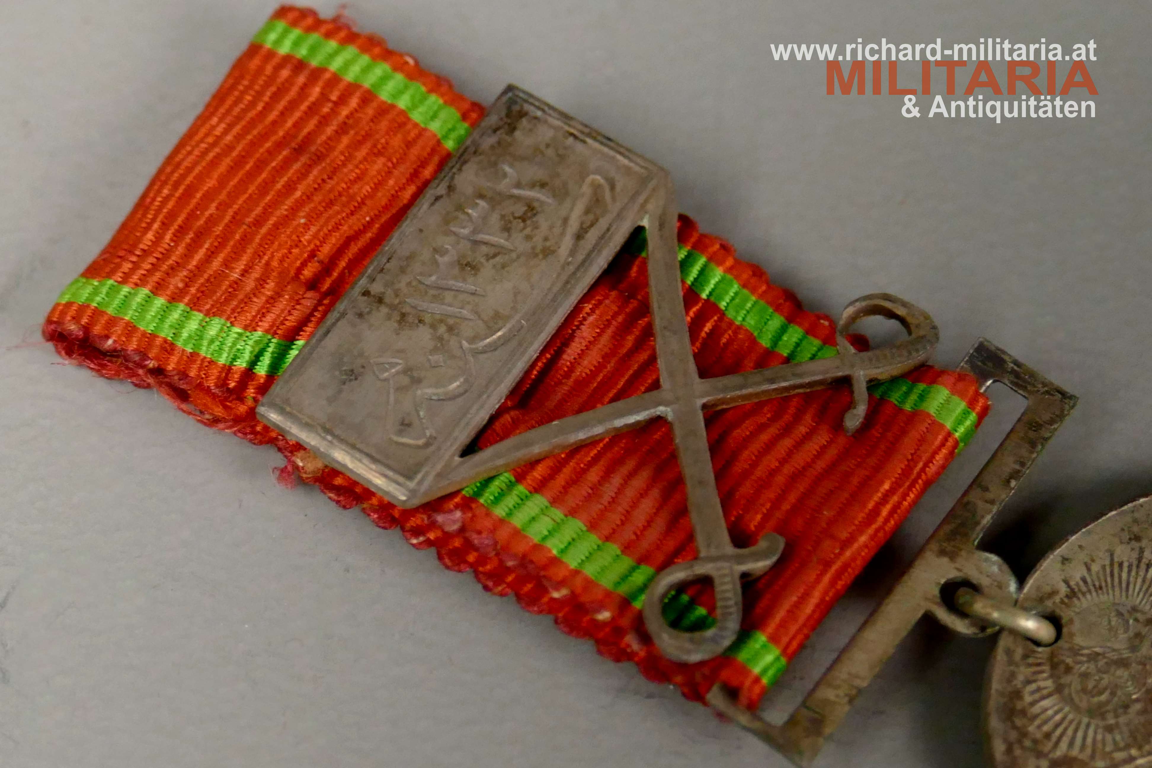 Türkei, Osmanisches Reich (bis 1923) Liyakat-Medaille für Tapferkeit und Treue (Liyakat Madalyast) mit Etui - Türkei, Silberne Medaille, Silber, Band mit Säbelspange mit Durchzugs-Bandspange "sene 1332" (Jahr 1914) im originalen bedruckten Kartonetui;