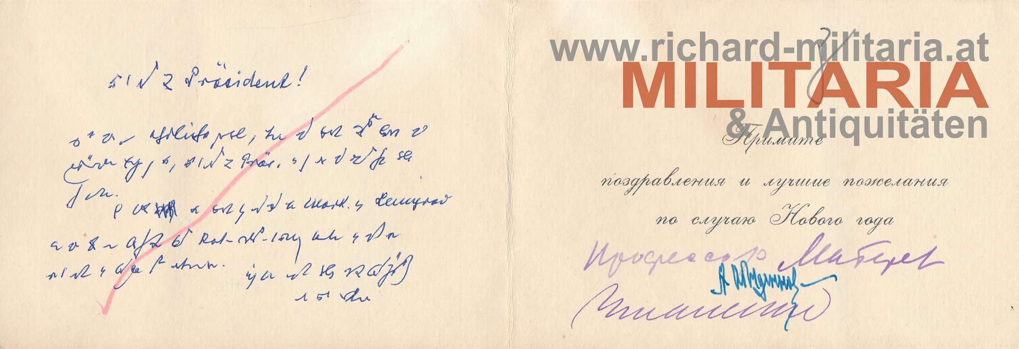 Dies bedeutet übersetzt: „Empfangen Sie Glückwünsche und beste Wünsche zum Neuen Jahr. Prosekretär Materew.“