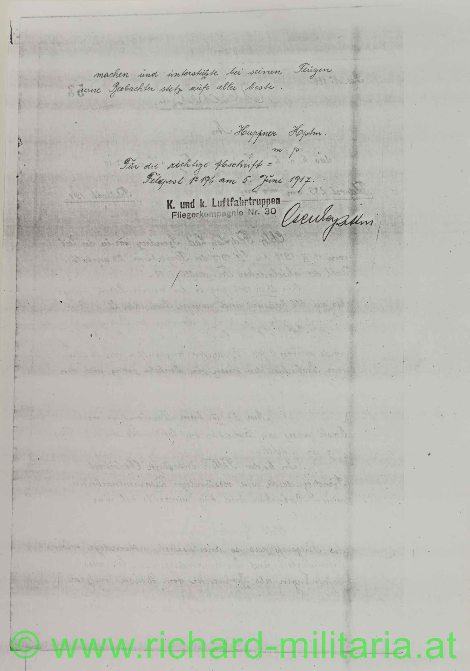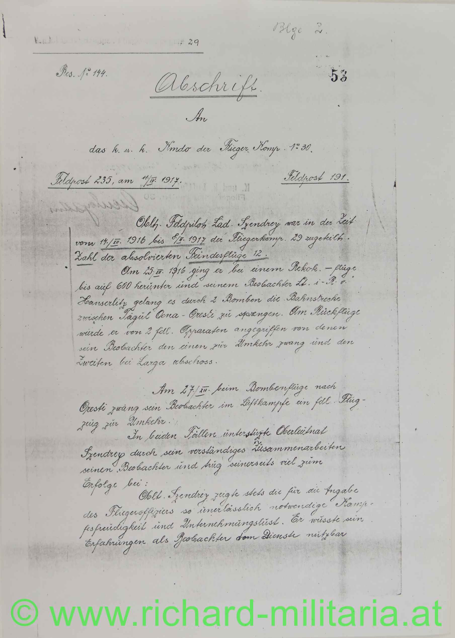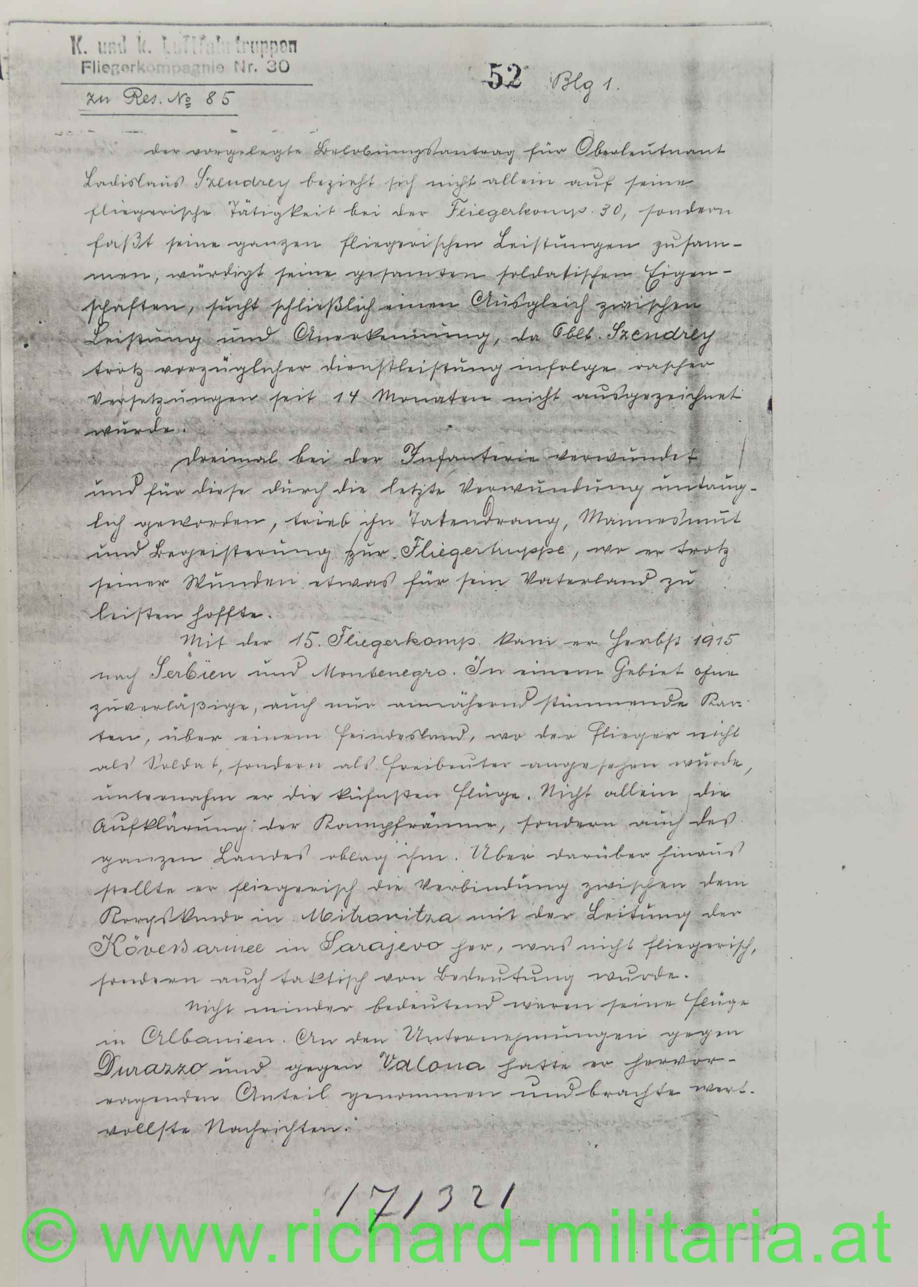 Oberlt. Szendrey wird als Feldpilot vom 5.2.1917 bei der FLIK 30 (Zugang von FLIK 29) geführt. Mit 22.1.1918 wurde er zur FLIK 38 versetzt;