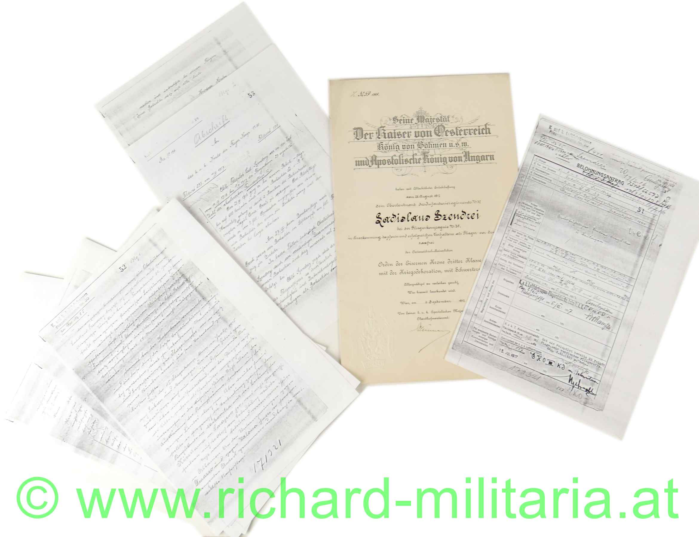 Urkunde zur Verleihung des Orden der Eisernen Krone 3. Klasse mit KD und Schwertern an den Olt. Ladislaus Szendrei; Feldpilot bei der Fliegerkomp.- No. 30 (Stand beim IR 37), Verleihungsdatum: 6. September 1917; Doppelblatt in perfekter Erhaltung; dazu die Kopien des Verleihungsantrages und Begründung;